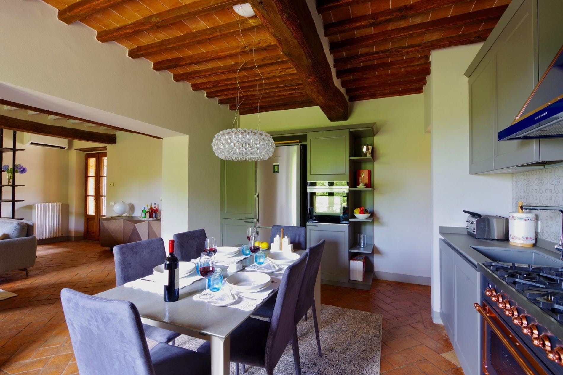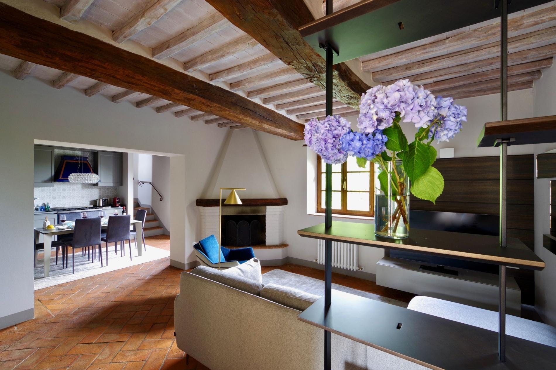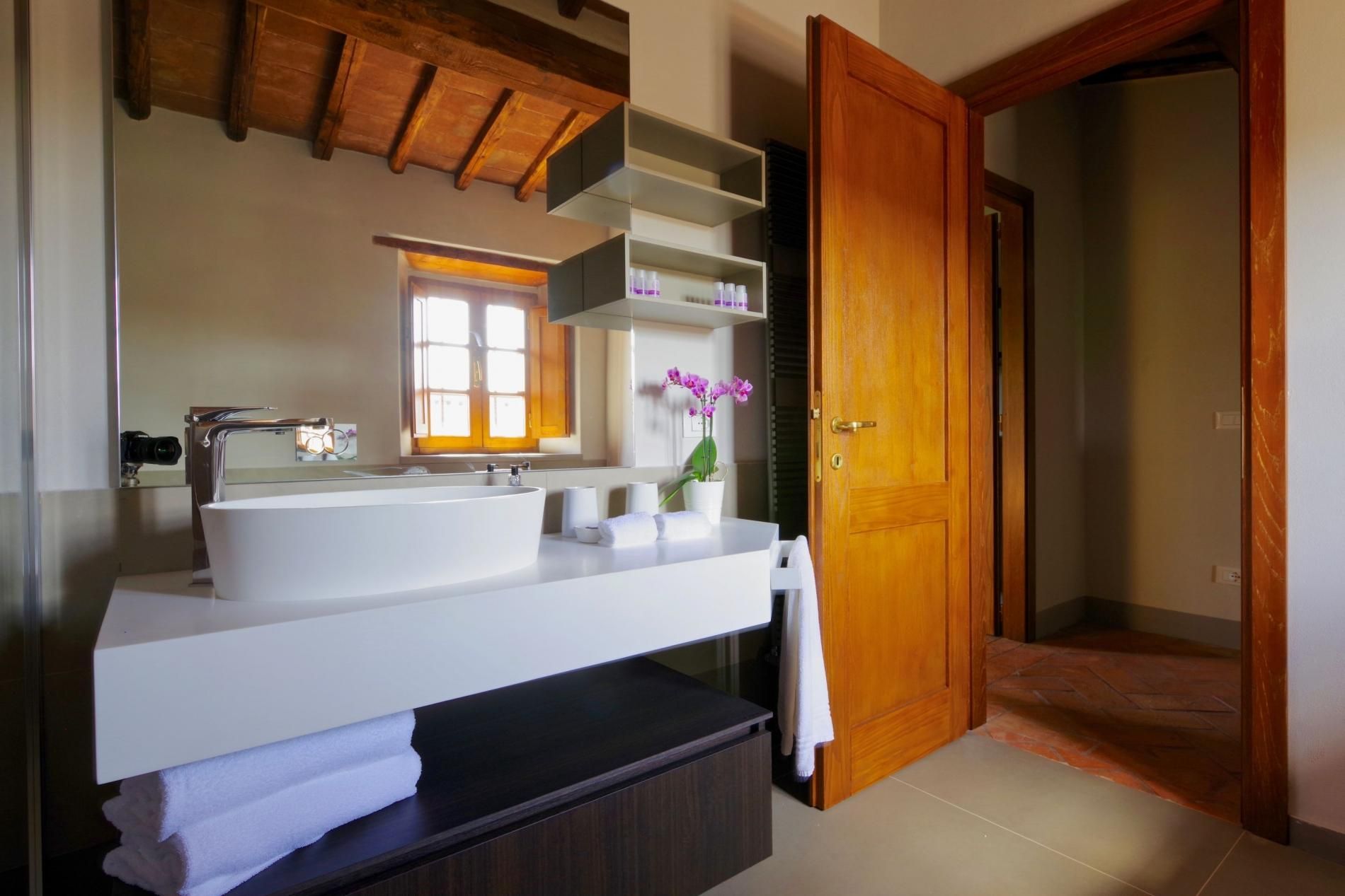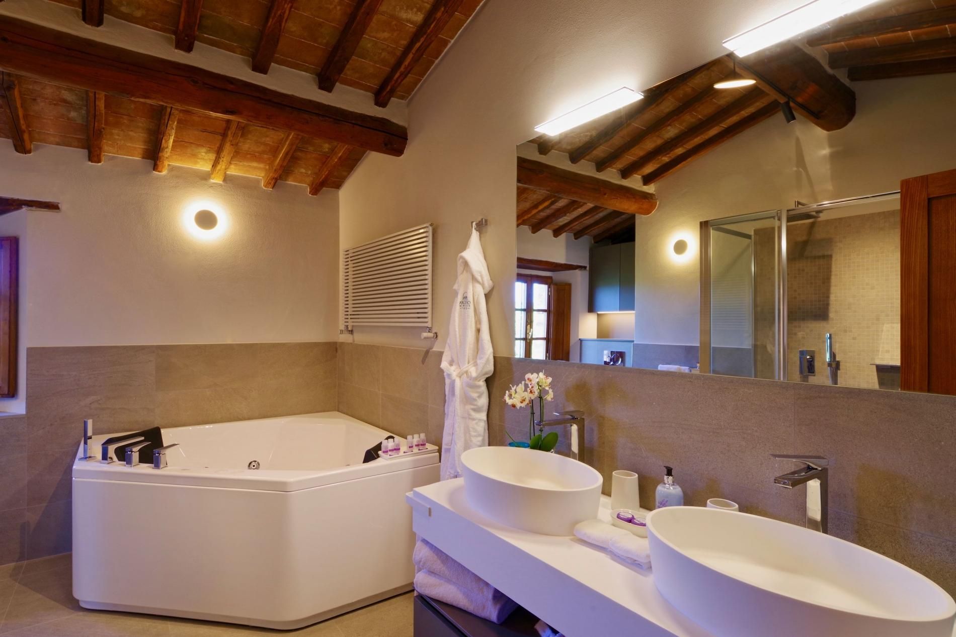 Amidst the rolling hills and long stretches of vineyards, you'll be captivated by the peace and serenity of this place from the moment you arrive. Stone clad brickwork and cobbled paths set the scene with a backdrop of the surrounding countryside – painting a picture-perfect view of blissful Tuscan serenity. Inside exposed wooden beams and traditional tiled flooring bring charm to the otherwise modern interiors, and you'll have the choice of eating alfresco or at cooler temperatures from the indoor dining area, when it comes to meal times. Take a dip in the outdoor shared pool, or embark on the day's adventures in and around Tuscany. With golfing, horseback riding, cycle paths and walking trails on offer, if you're the. outdoorsy type – this is the place for you. After a day of exploring feel rest assured in knowing that the bubbling jacuzzi awaits your return – but don't forget to pour yourself a glass of wine before getting in.