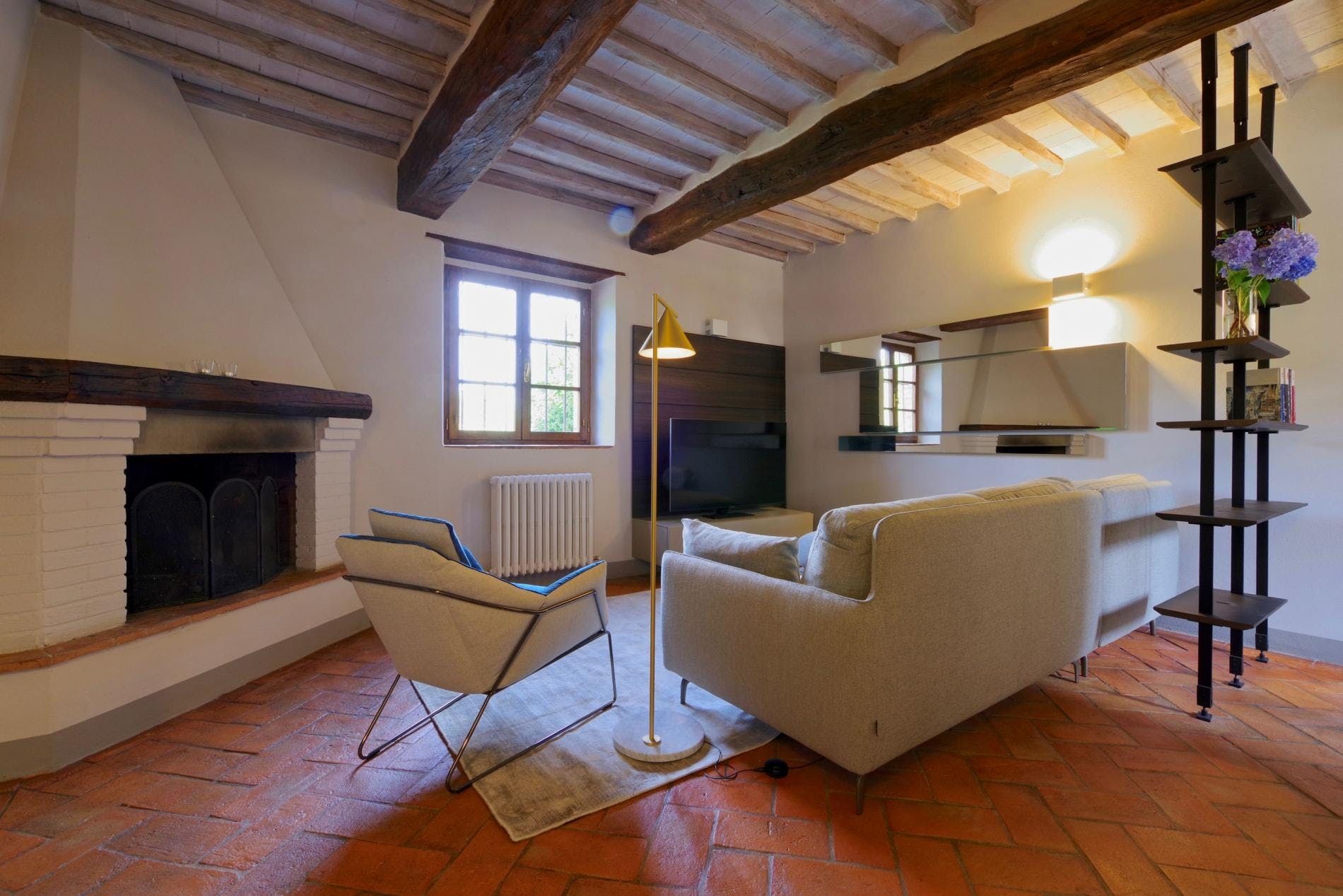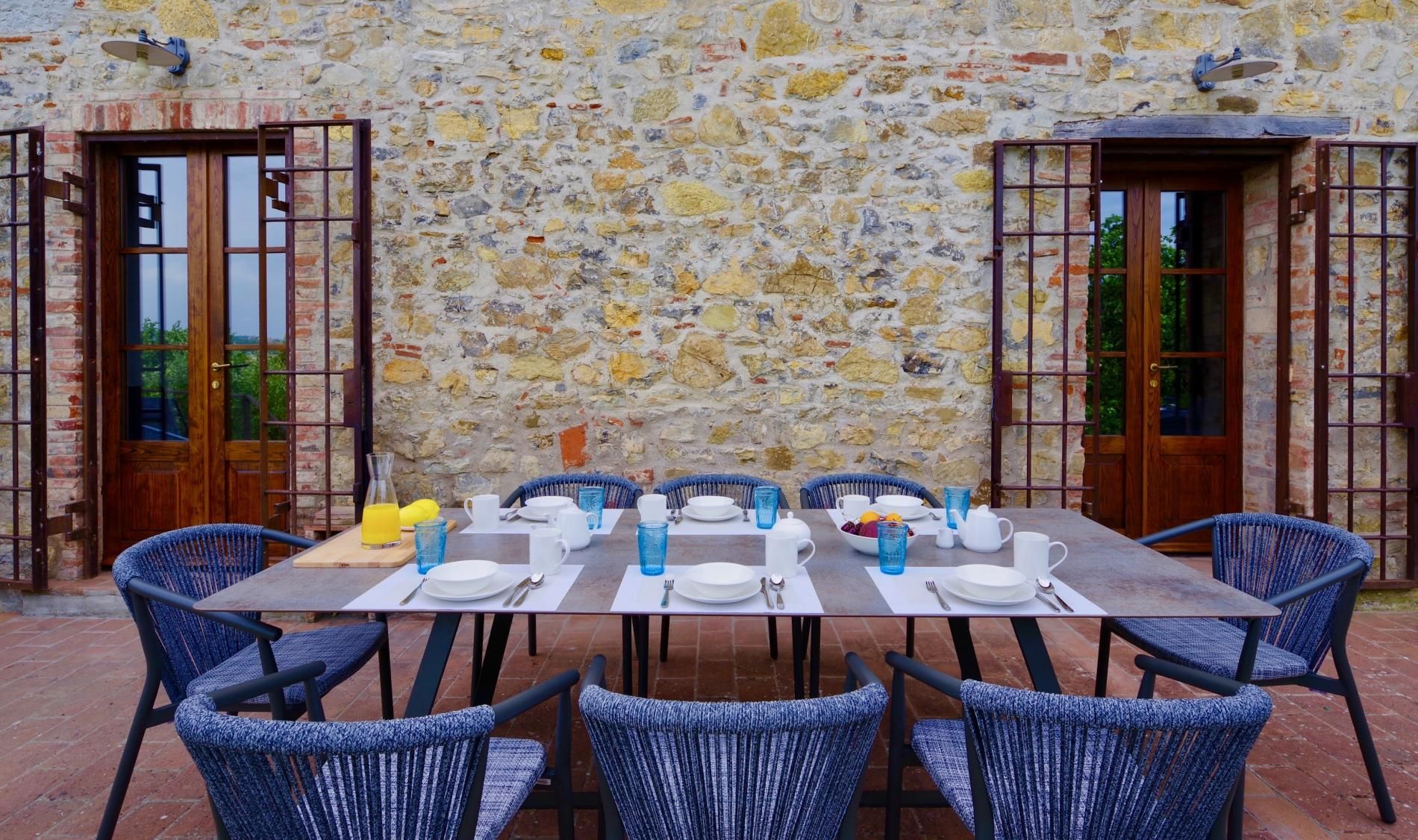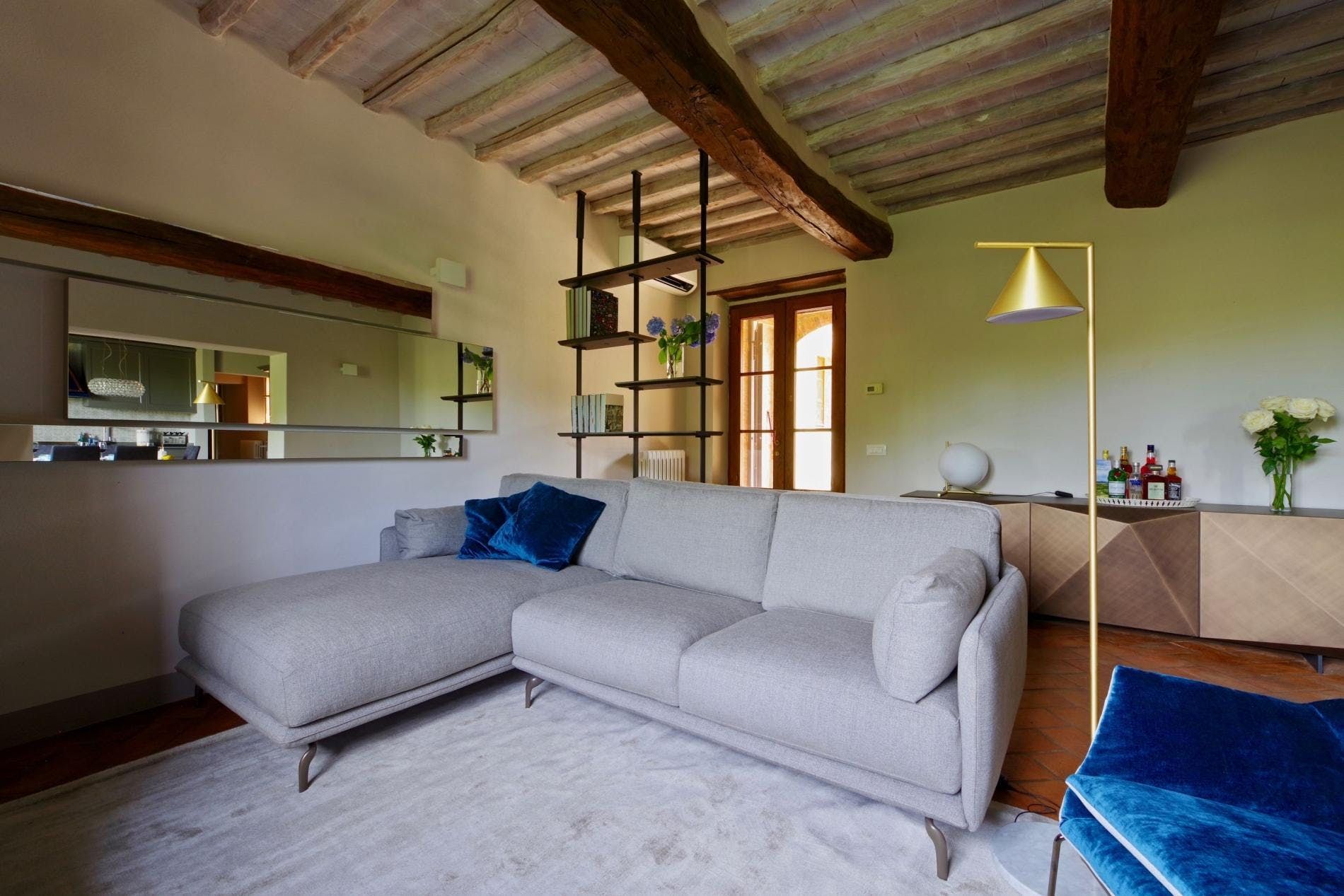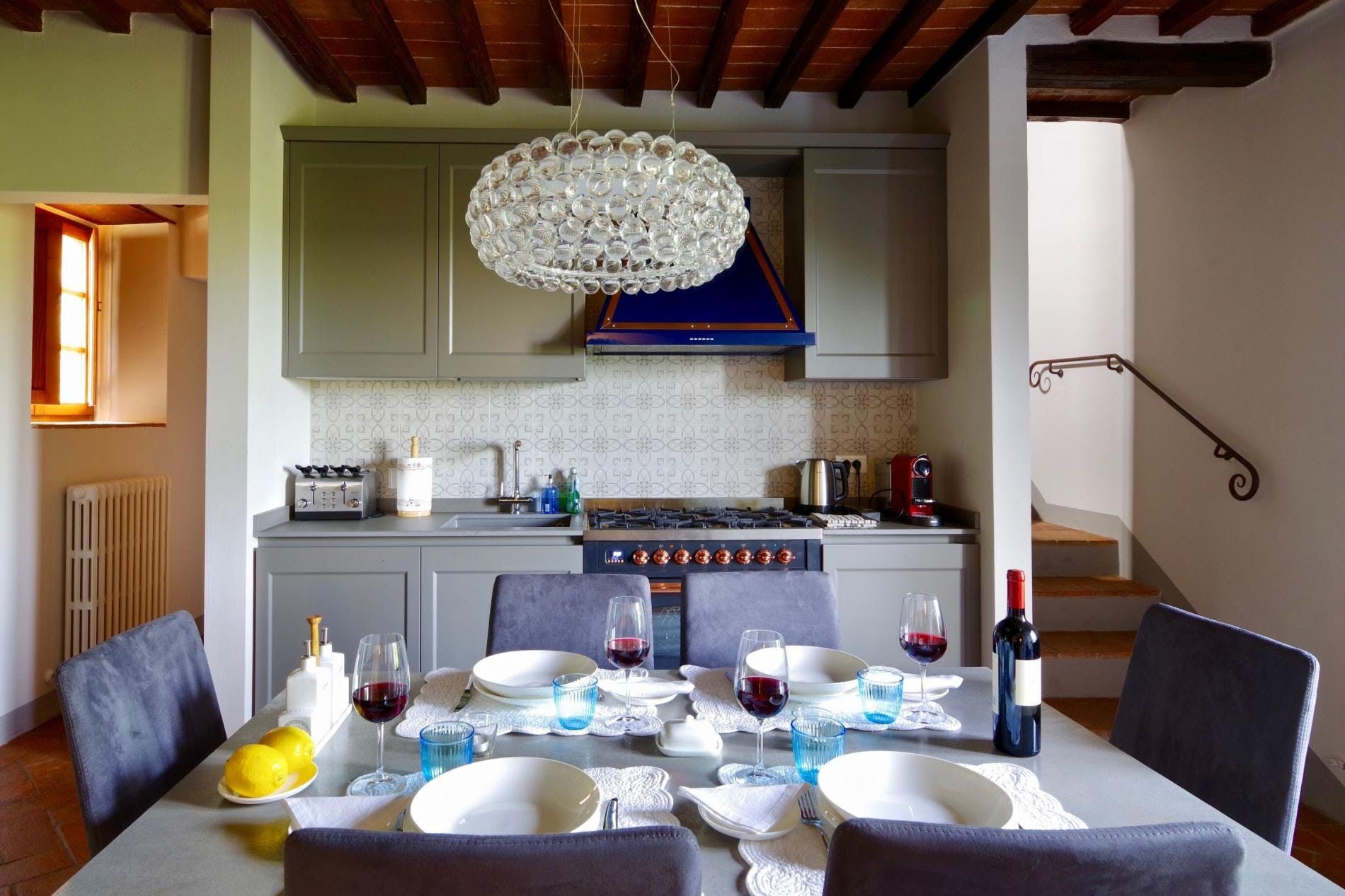 Amidst the rolling hills and long stretches of vineyards, you'll be captivated by the peace and serenity of this place from the moment you arrive. Stone clad brickwork and cobbled paths set the scene with a backdrop of the surrounding countryside – painting a picture-perfect view of blissful Tuscan serenity. Inside exposed wooden beams and traditional tiled flooring bring charm to the otherwise modern interiors, and you'll have the choice of eating alfresco or at cooler temperatures from the indoor dining area, when it comes to meal times. Take a dip in the outdoor shared pool, or embark on the day's adventures in and around Tuscany. With golfing, horseback riding, cycle paths and walking trails on offer, if you're the. outdoorsy type – this is the place for you. After a day of exploring feel rest assured in knowing that the bubbling jacuzzi awaits your return – but don't forget to pour yourself a glass of wine before getting in.