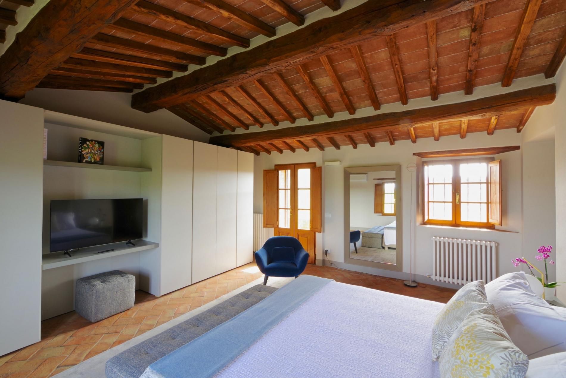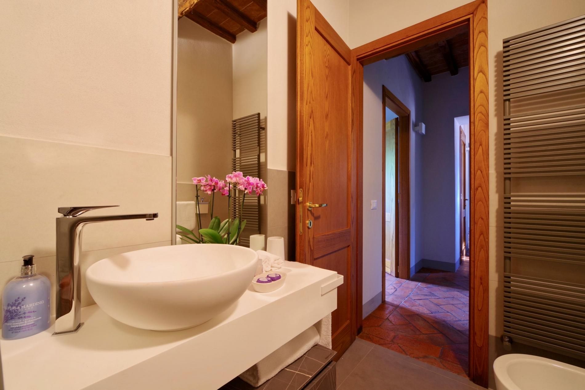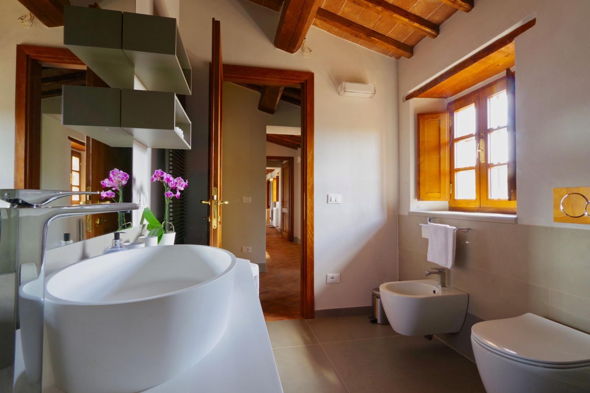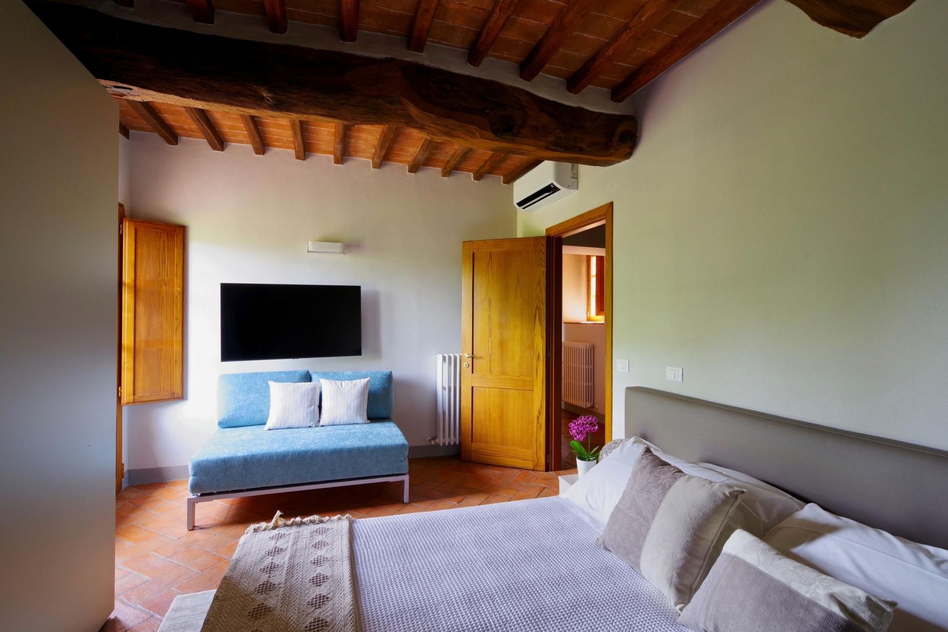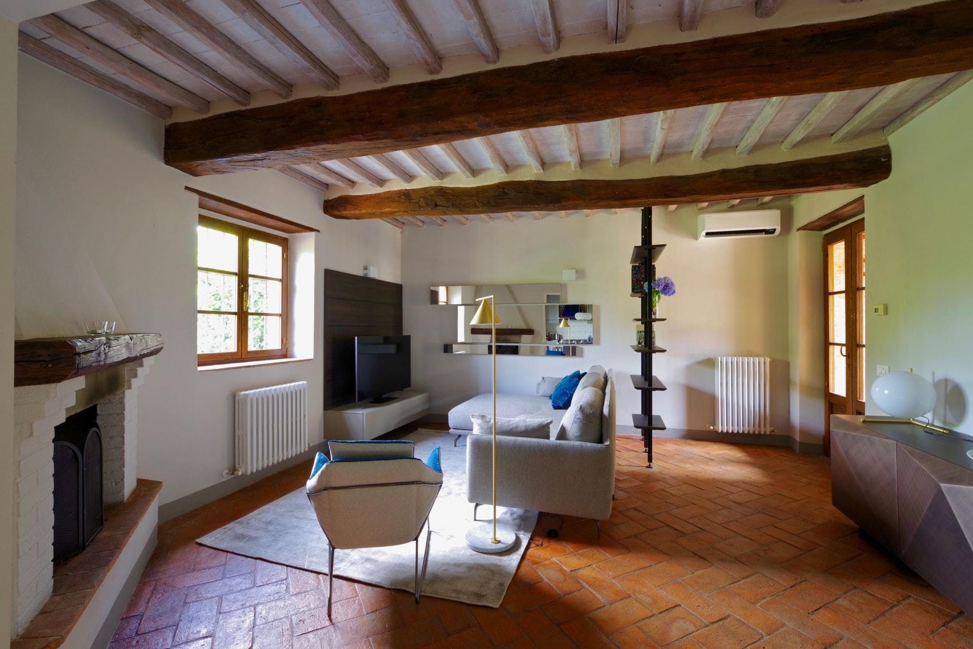 Amidst the rolling hills and long stretches of vineyards, you'll be captivated by the peace and serenity of this place from the moment you arrive. Stone clad brickwork and cobbled paths set the scene with a backdrop of the surrounding countryside – painting a picture-perfect view of blissful Tuscan serenity. Inside exposed wooden beams and traditional tiled flooring bring charm to the otherwise modern interiors, and you'll have the choice of eating alfresco or at cooler temperatures from the indoor dining area, when it comes to meal times. Take a dip in the outdoor shared pool, or embark on the day's adventures in and around Tuscany. With golfing, horseback riding, cycle paths and walking trails on offer, if you're the. outdoorsy type – this is the place for you. After a day of exploring feel rest assured in knowing that the bubbling jacuzzi awaits your return – but don't forget to pour yourself a glass of wine before getting in.