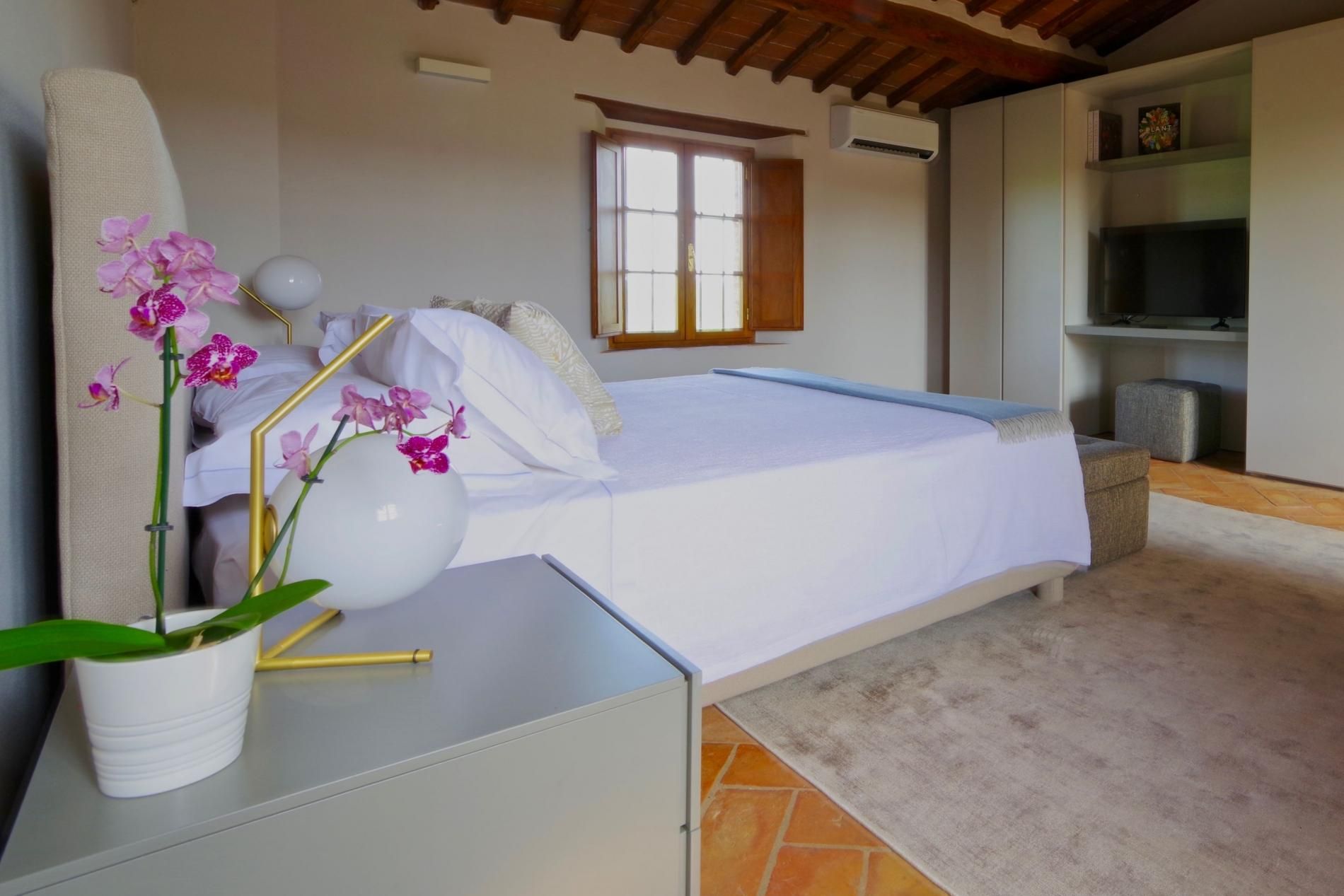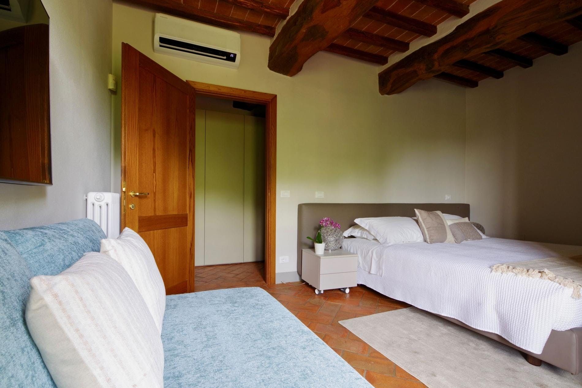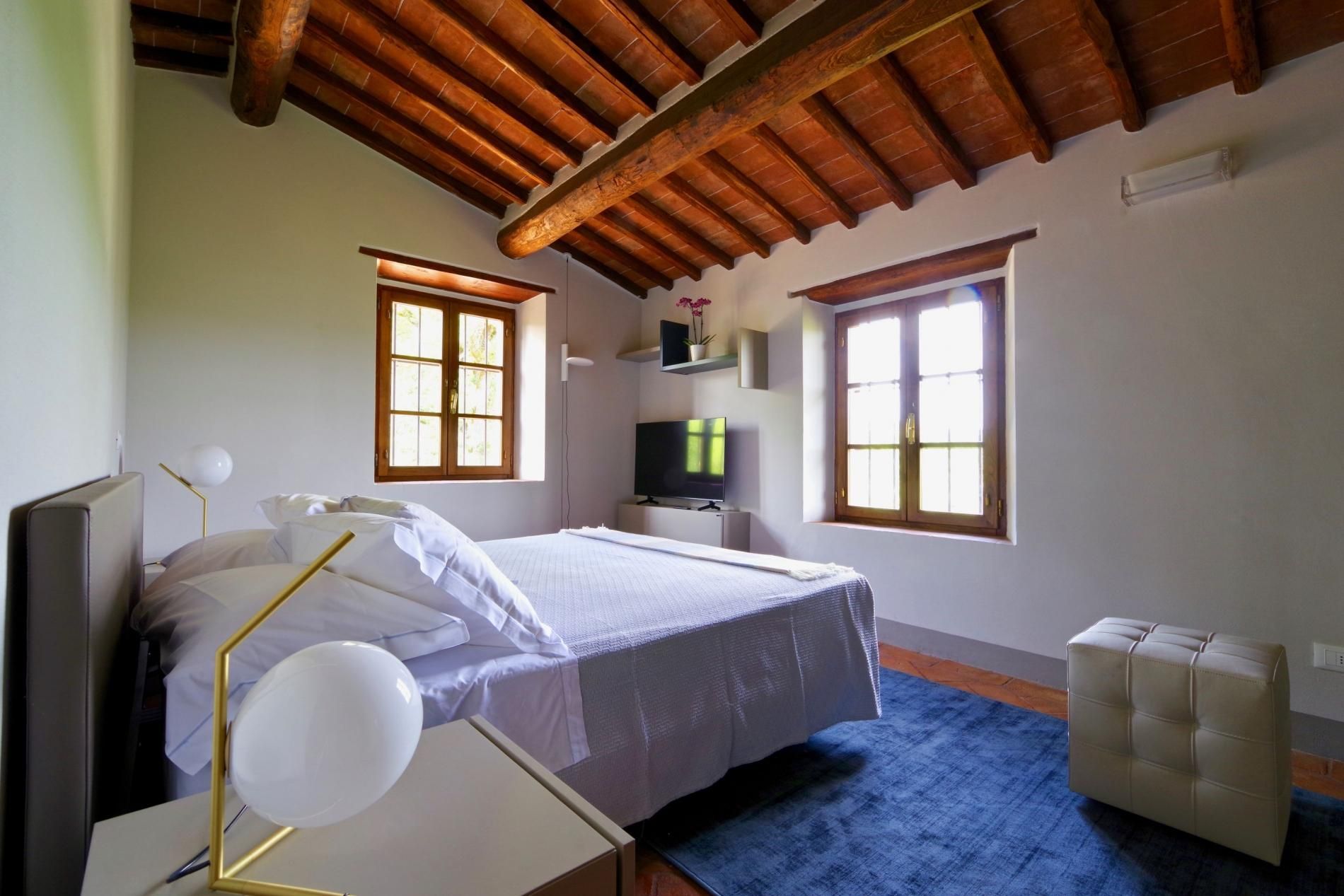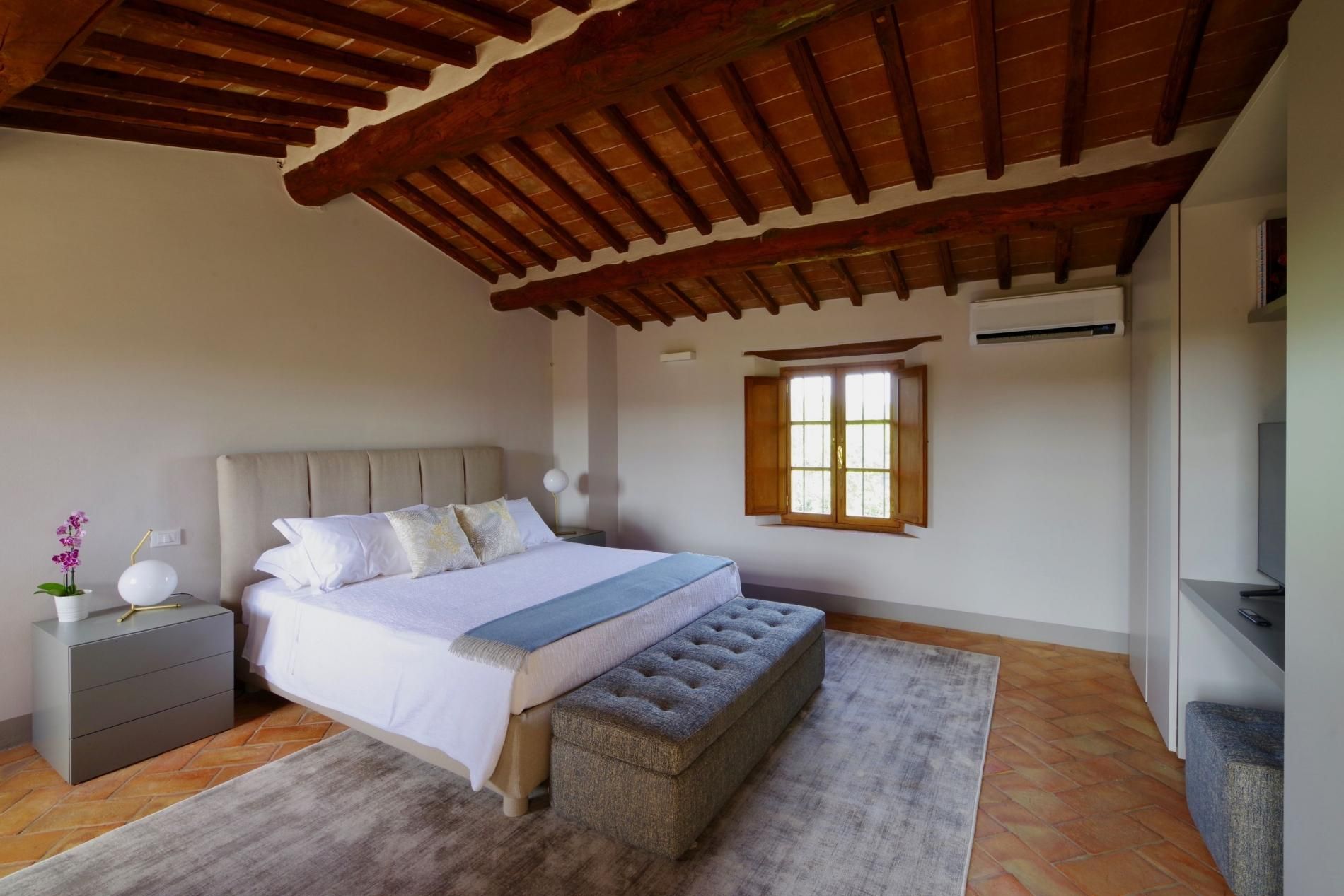 Amidst the rolling hills and long stretches of vineyards, you'll be captivated by the peace and serenity of this place from the moment you arrive. Stone clad brickwork and cobbled paths set the scene with a backdrop of the surrounding countryside – painting a picture-perfect view of blissful Tuscan serenity. Inside exposed wooden beams and traditional tiled flooring bring charm to the otherwise modern interiors, and you'll have the choice of eating alfresco or at cooler temperatures from the indoor dining area, when it comes to meal times. Take a dip in the outdoor shared pool, or embark on the day's adventures in and around Tuscany. With golfing, horseback riding, cycle paths and walking trails on offer, if you're the. outdoorsy type – this is the place for you. After a day of exploring feel rest assured in knowing that the bubbling jacuzzi awaits your return – but don't forget to pour yourself a glass of wine before getting in.