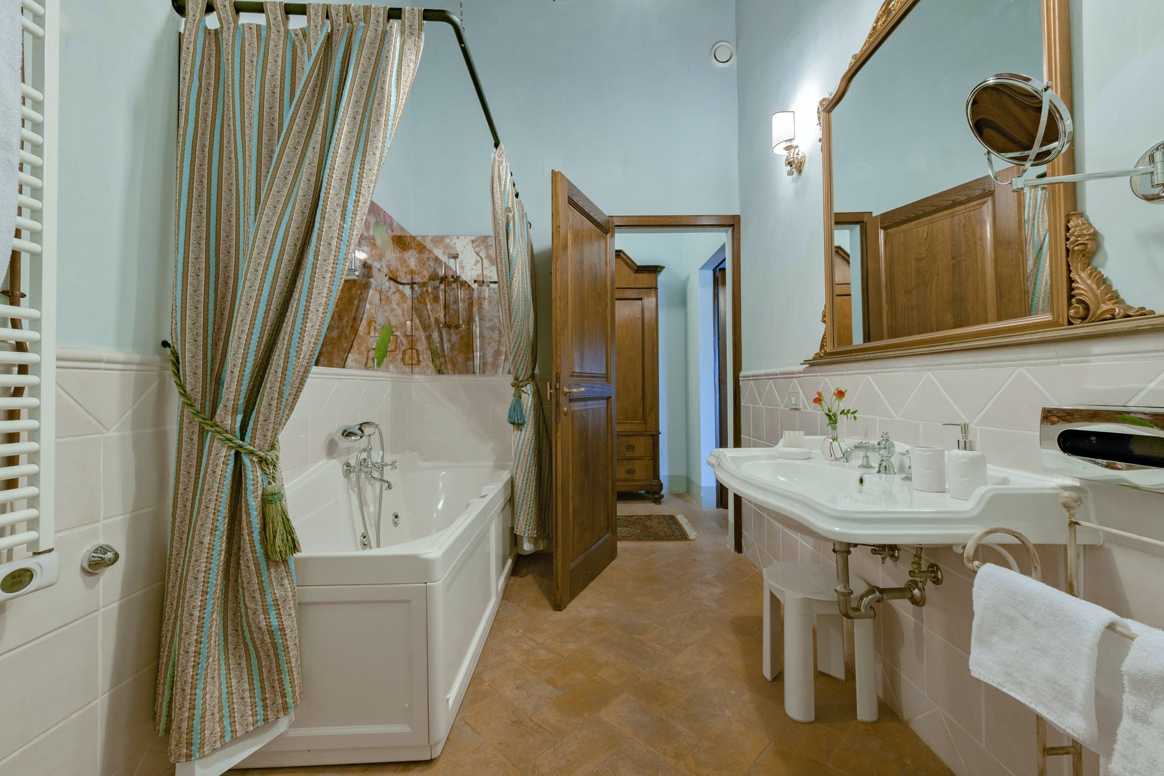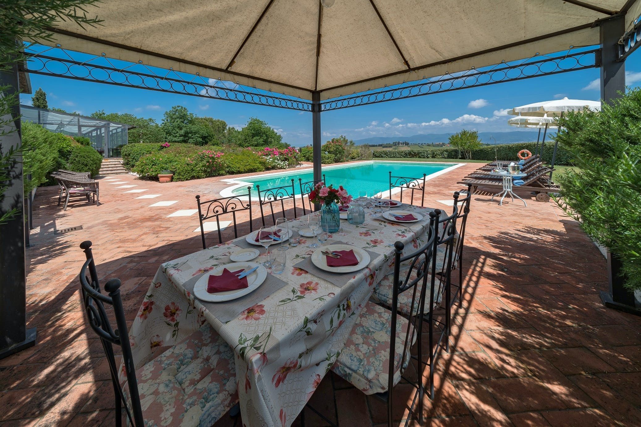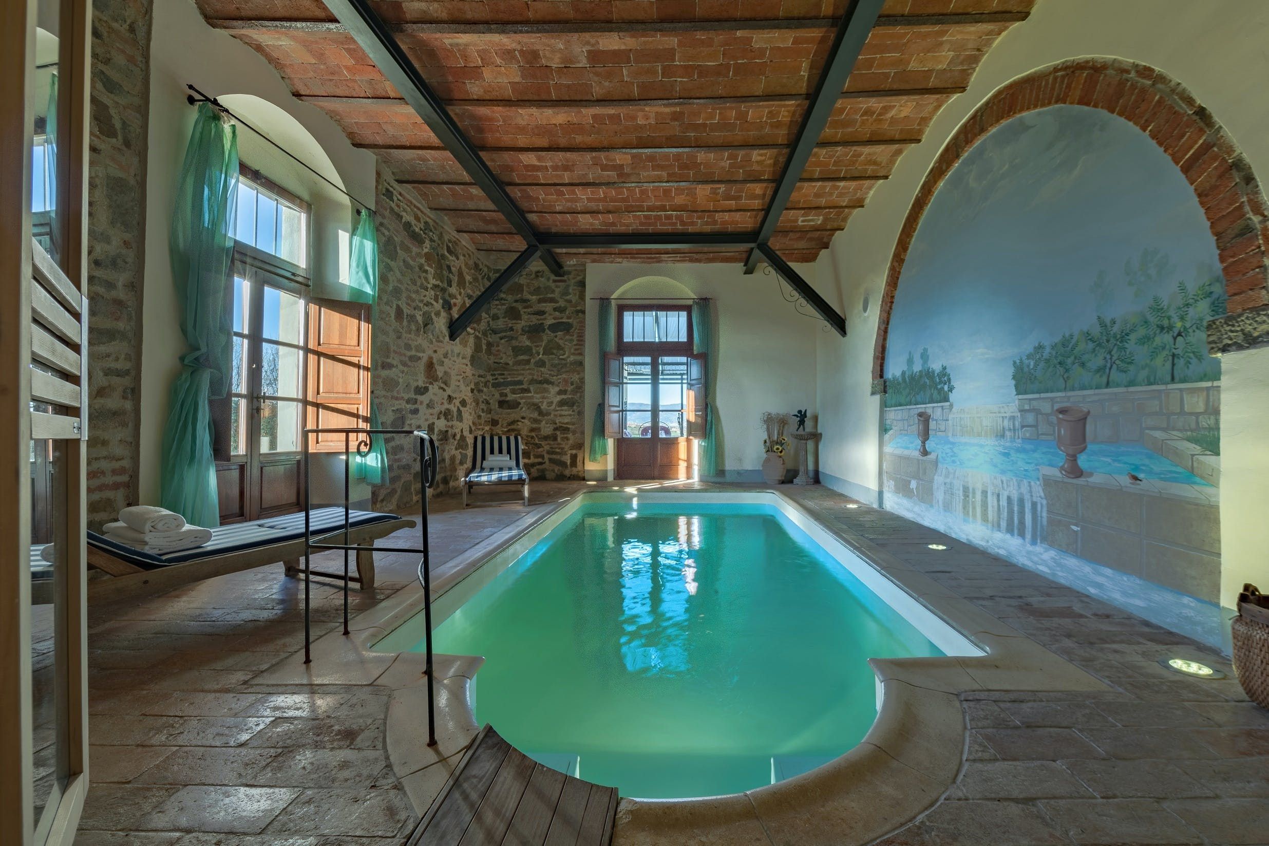 This Tuscan villa was once a hotel, so it’s well set up for large groups. All of the bedrooms are en-suite, there’s an industrial kitchen, and the huge lounge has plenty of sofas. With an indoor and outdoor pool, you can swim in every season here. Plus there’s a sauna and two of the en-suites have Jacuzzi bathtubs. The decor feels a little dated – particularly the bathrooms – but we love the formal dining room and the conservatory overlooking the Tuscan countryside. Located in the centre of Valdichiana, there are plenty of opportunities for hiking in the area. Or you can jump in the car for a day trip to the hilltop town of Cortona or the Medieval city of Arezzo.