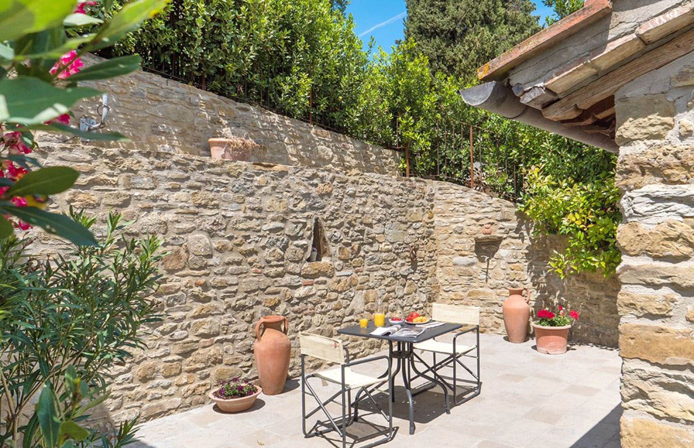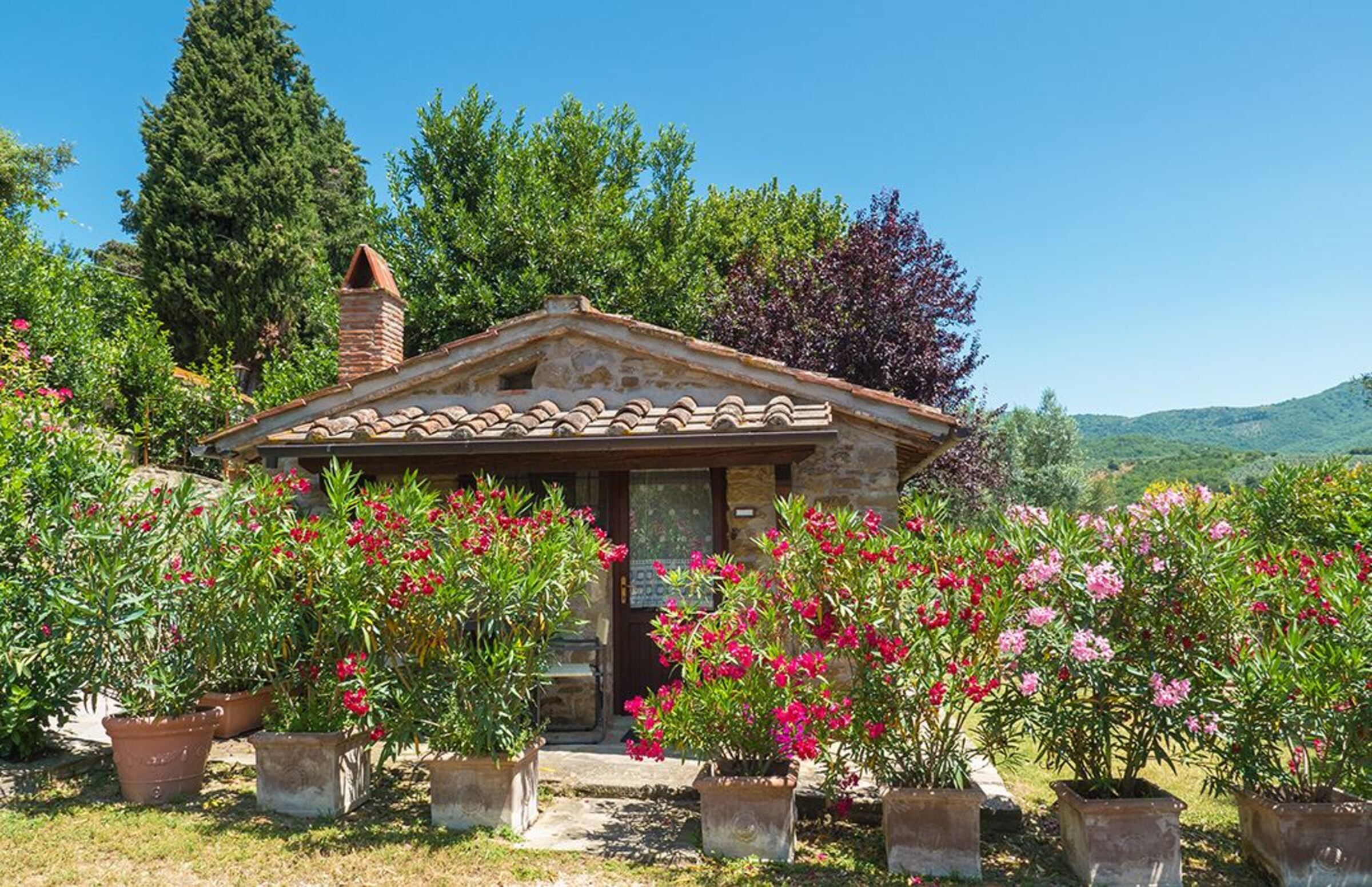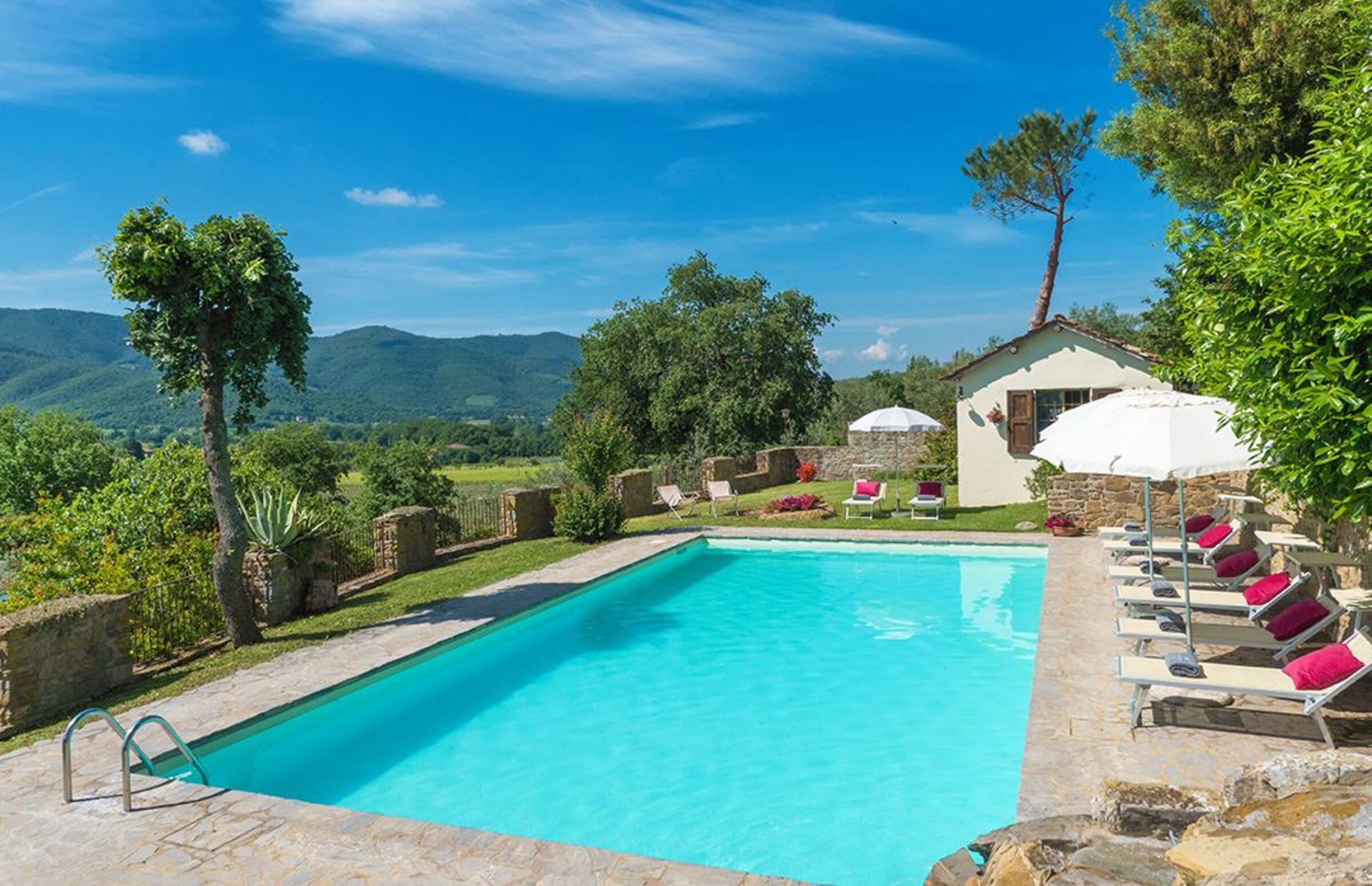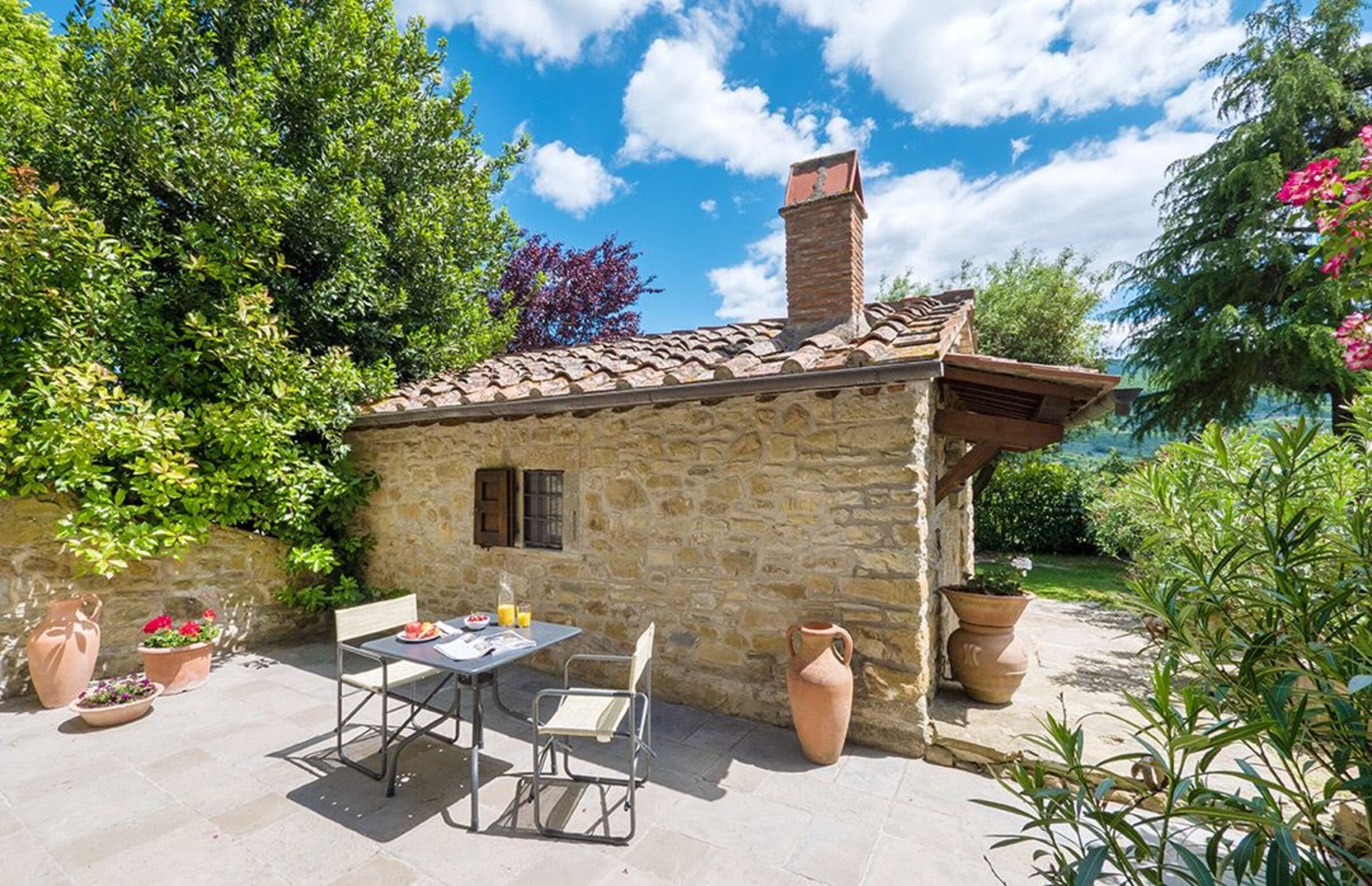 A truly idyllic escape to rural Tuscany requires rolling hills, a rustic farmhouse and panoramic views across olive groves and vineyards. And you'll have all of this and more at this beautiful home deep in the countryside between Arezzo and Cortona. Surrounded by its own lush, terraced gardens, it's a stone-built gem with flexible accommodation to suit a large group. Packed with character features, you'll be welcomed by tiled floors, ancient wooden beams and traditional shuttered windows. The main house is divided into two apartments, each boasting its own kitchen and cosy living room, and with two bedrooms on each of the two floors. Allowing for as much or as little socialising as you require, there's also a stunning dining room with a table big enough to seat up to ten guests. And it has its own kitchenette to make life easier. Elsewhere in the garden, you'll find an additional one-bed guesthouse with its own bathroom – perfect if you really value your privacy. Spend your days swimming in the private pool on a lower level of the garden and eating outside on the huge terrace, pouring local wine and admiring the incredible views. If you want to do some shopping, Arezzo is just half an hour away by car, with Cortona and the Valdichiana Outlet Village around the same.