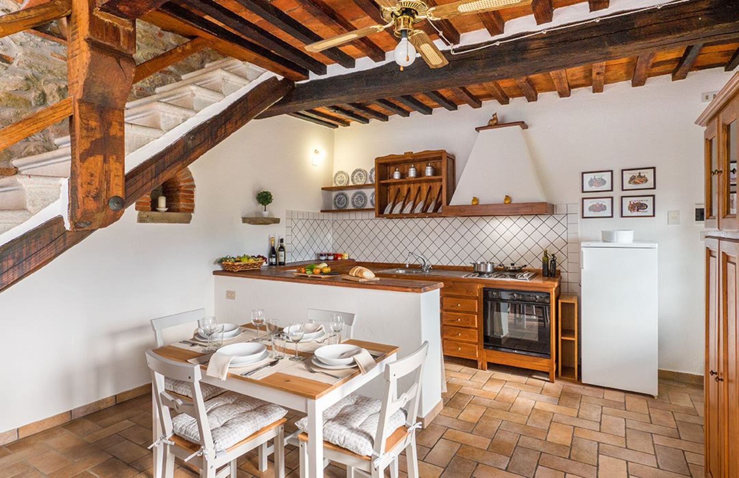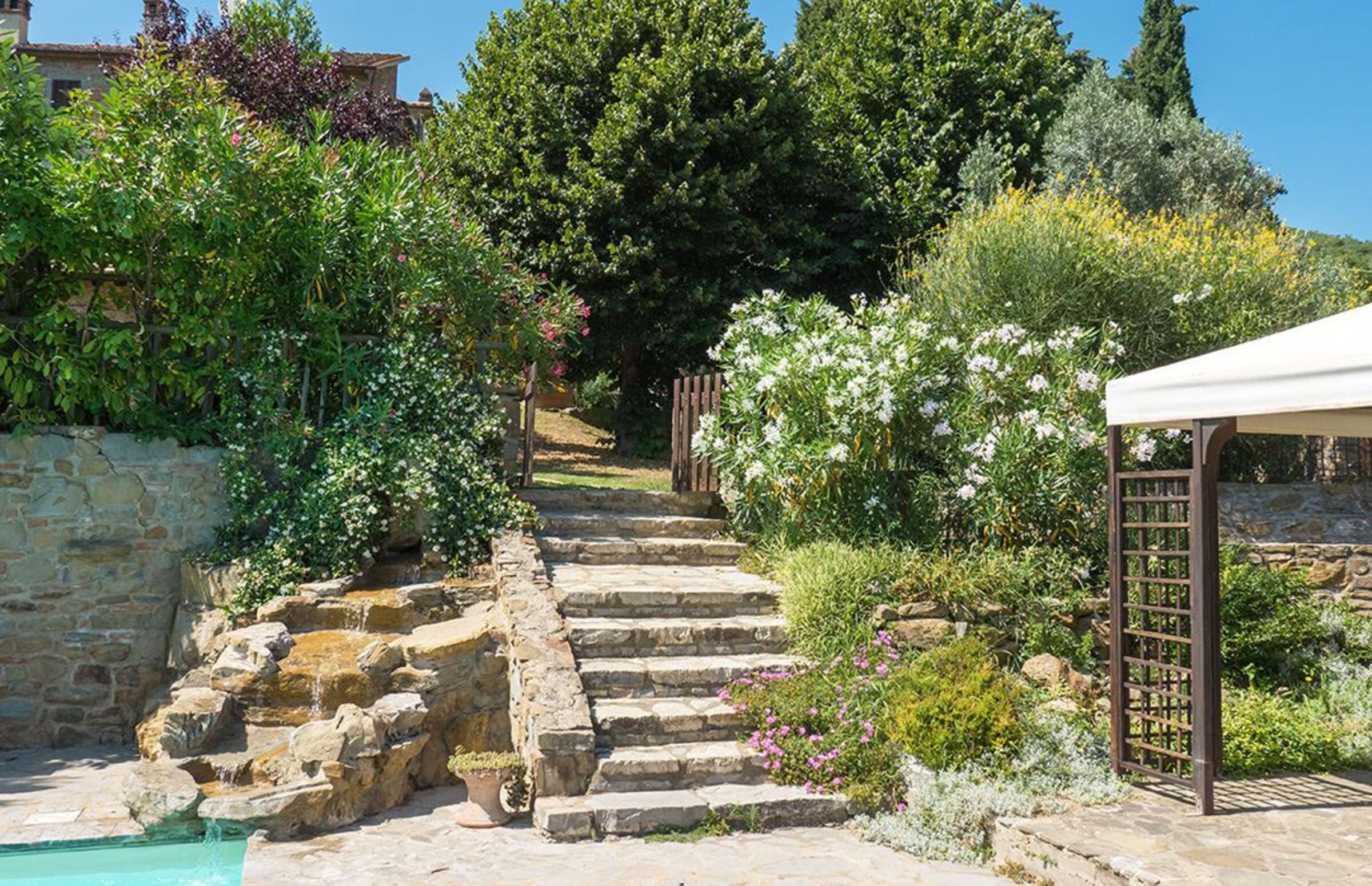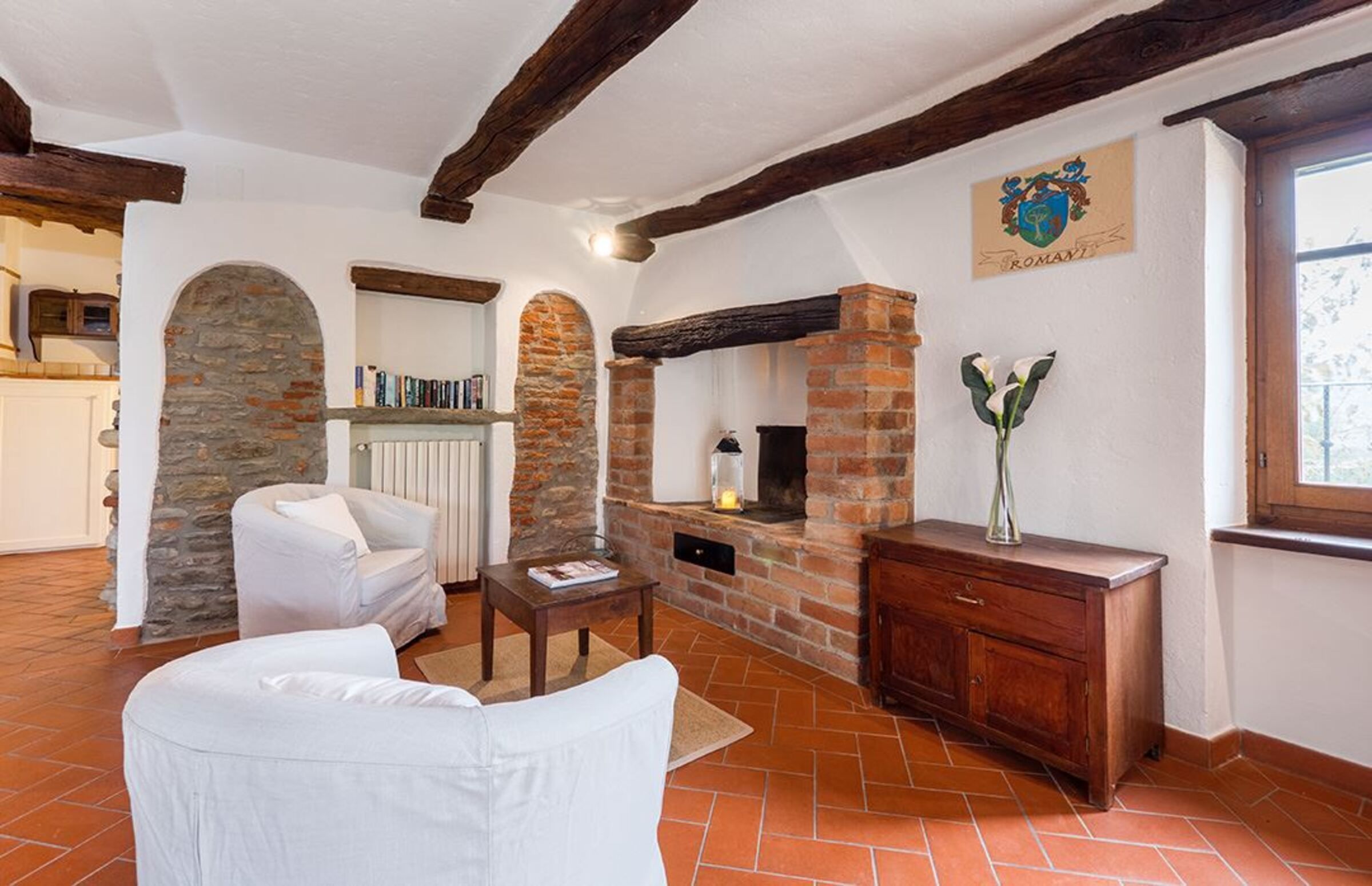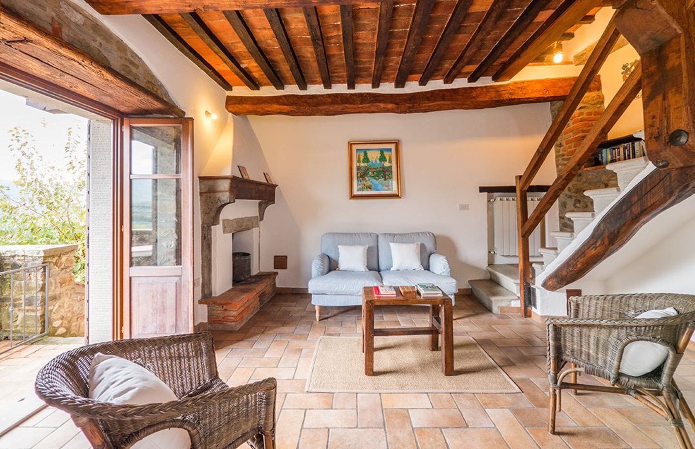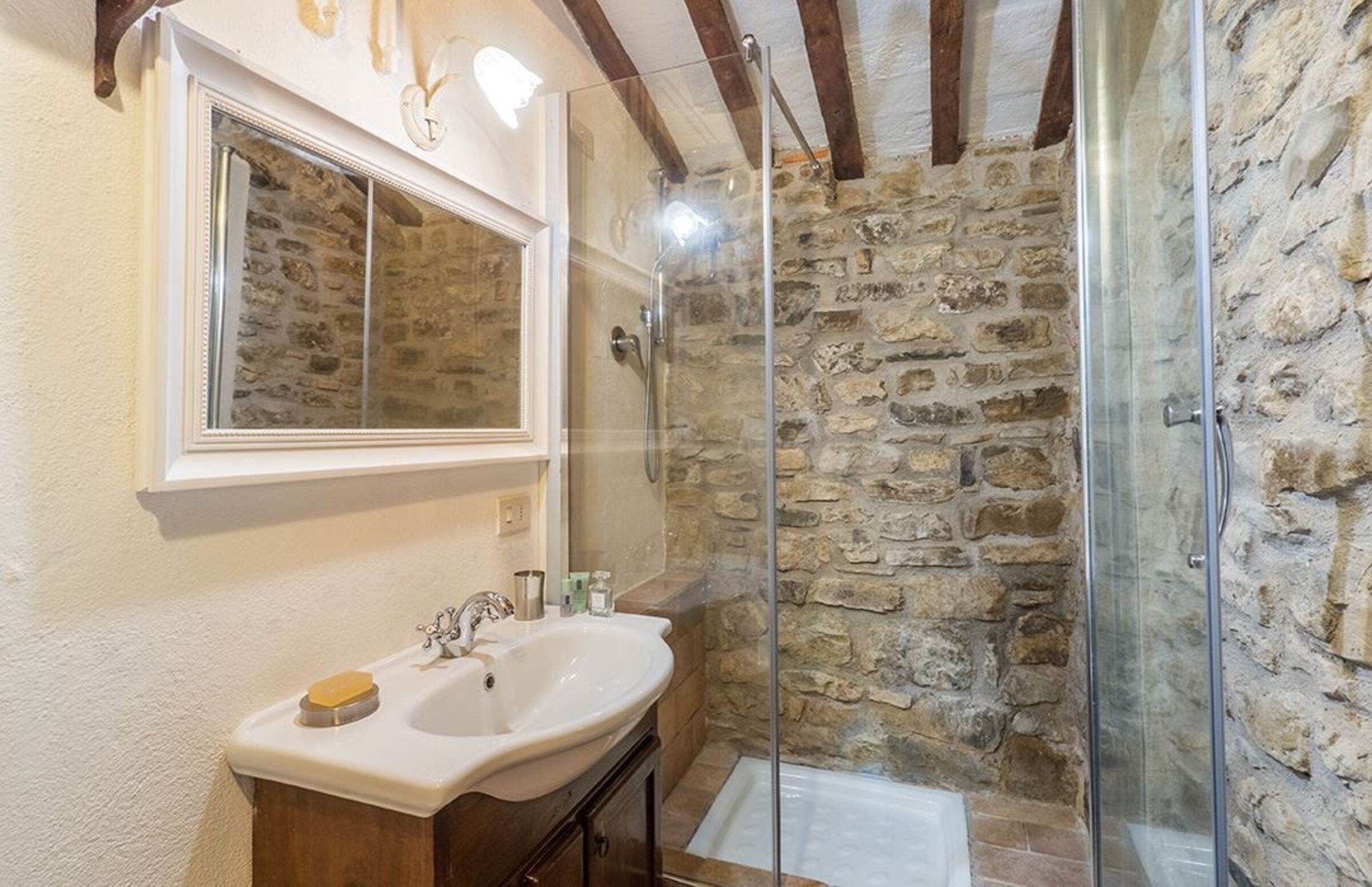A truly idyllic escape to rural Tuscany requires rolling hills, a rustic farmhouse and panoramic views across olive groves and vineyards. And you'll have all of this and more at this beautiful home deep in the countryside between Arezzo and Cortona. Surrounded by its own lush, terraced gardens, it's a stone-built gem with flexible accommodation to suit a large group. Packed with character features, you'll be welcomed by tiled floors, ancient wooden beams and traditional shuttered windows. The main house is divided into two apartments, each boasting its own kitchen and cosy living room, and with two bedrooms on each of the two floors. Allowing for as much or as little socialising as you require, there's also a stunning dining room with a table big enough to seat up to ten guests. And it has its own kitchenette to make life easier. Elsewhere in the garden, you'll find an additional one-bed guesthouse with its own bathroom – perfect if you really value your privacy. Spend your days swimming in the private pool on a lower level of the garden and eating outside on the huge terrace, pouring local wine and admiring the incredible views. If you want to do some shopping, Arezzo is just half an hour away by car, with Cortona and the Valdichiana Outlet Village around the same.