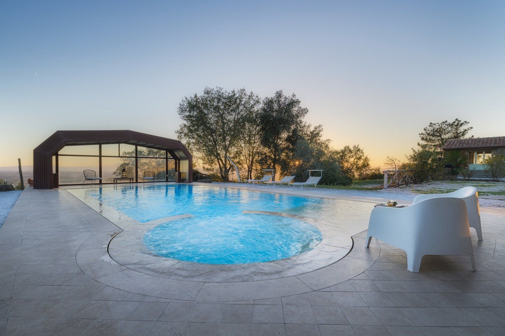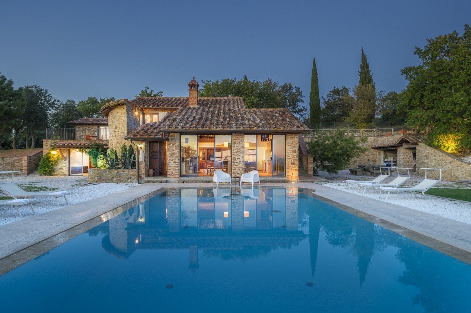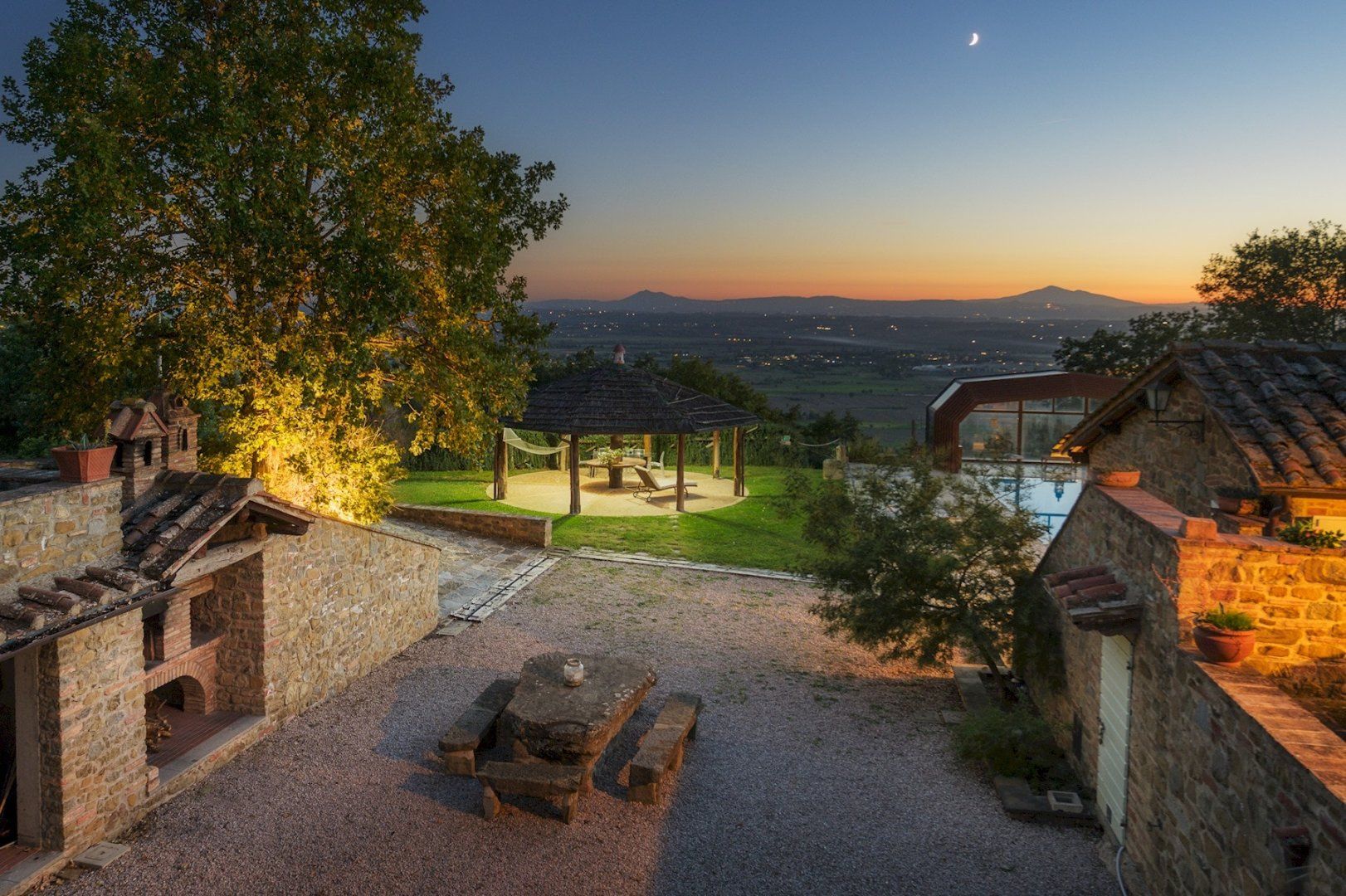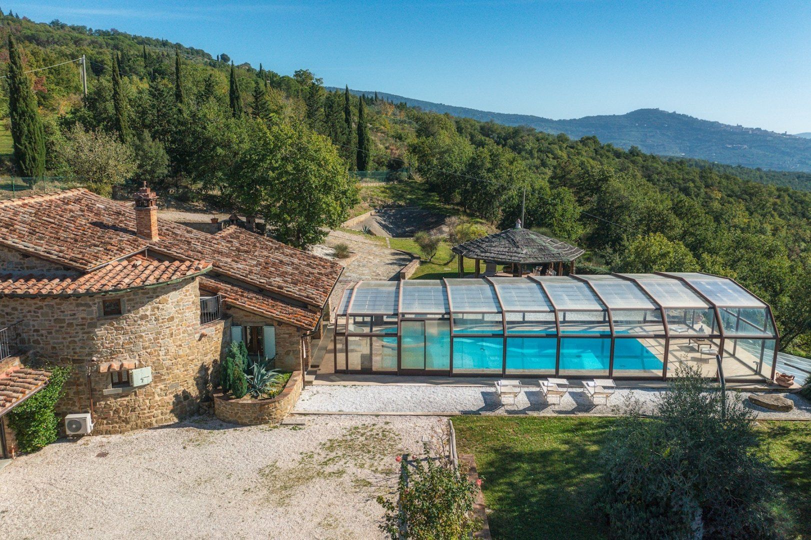 Nestled quietly in the countryside, this beautiful home will enchant you from the moment you first set eyes on it. With views over the Val di Chiana and Cortona, this home has it all – stunning stonework, exposed beams, comfortable furnishings and rich gardens. Spend your days swimming in the panoramic infinity pool which is unique, thanks to its telescopic closure system – close the walls and roof and you can access the pool directly from the living room.