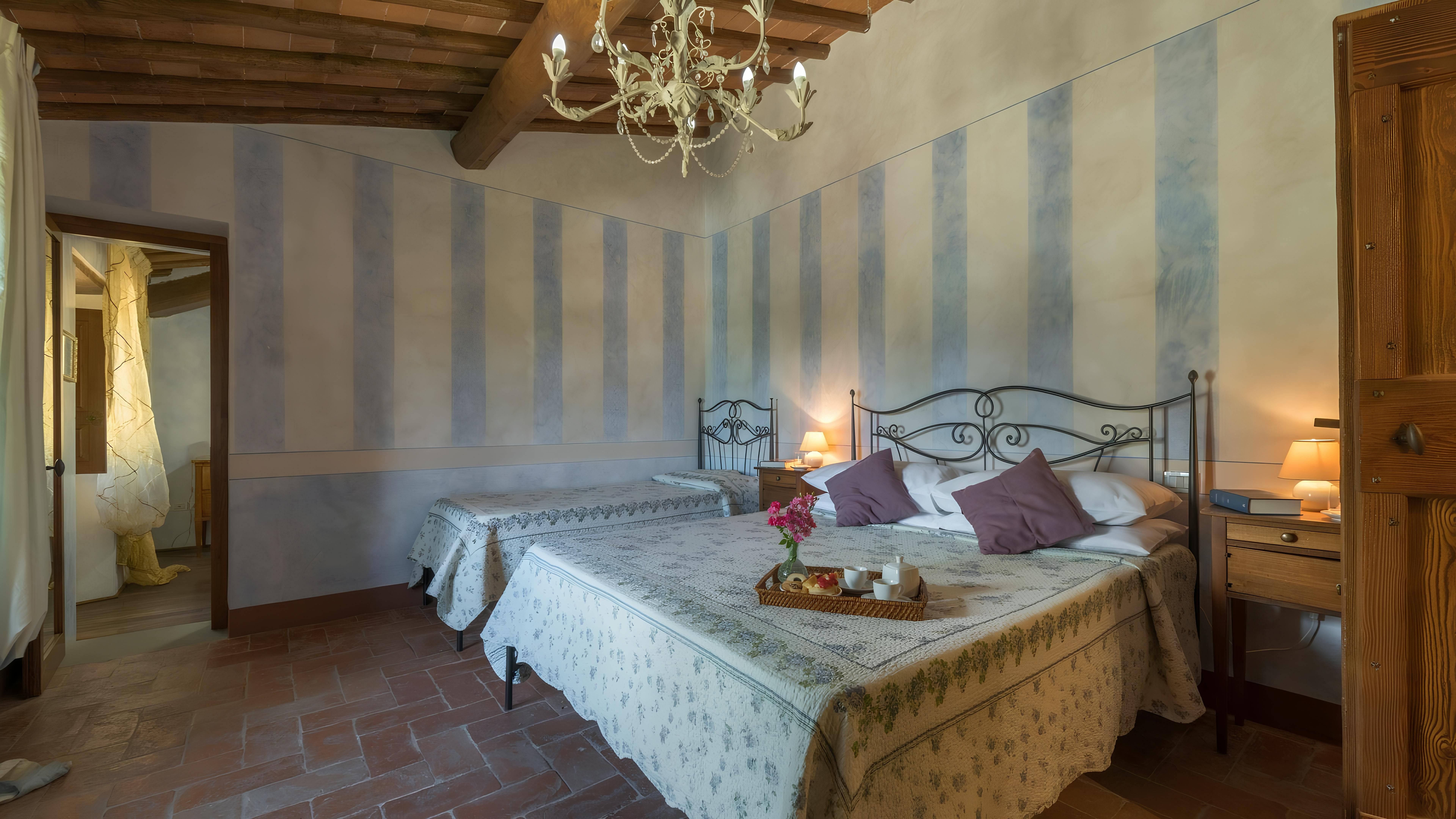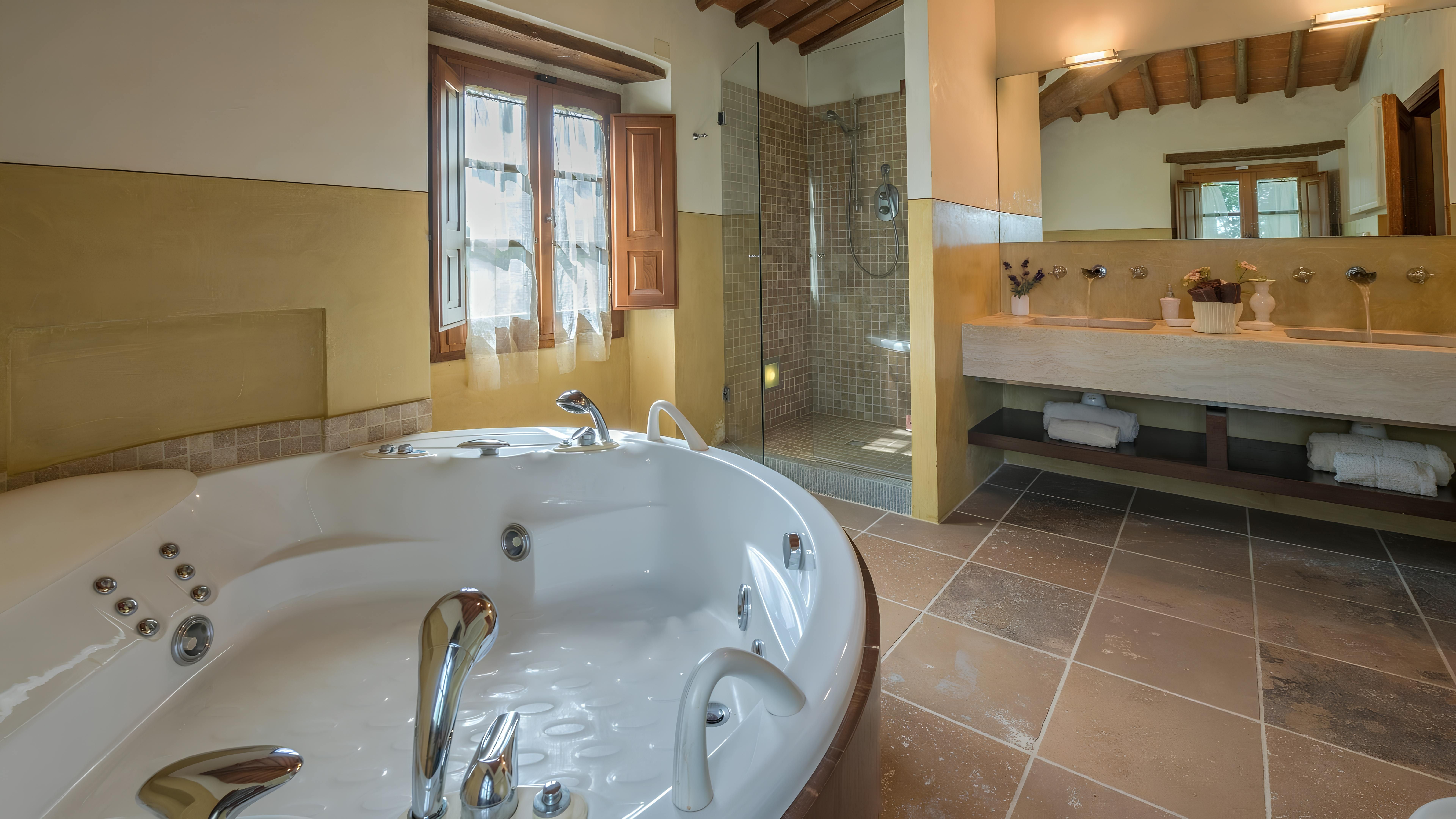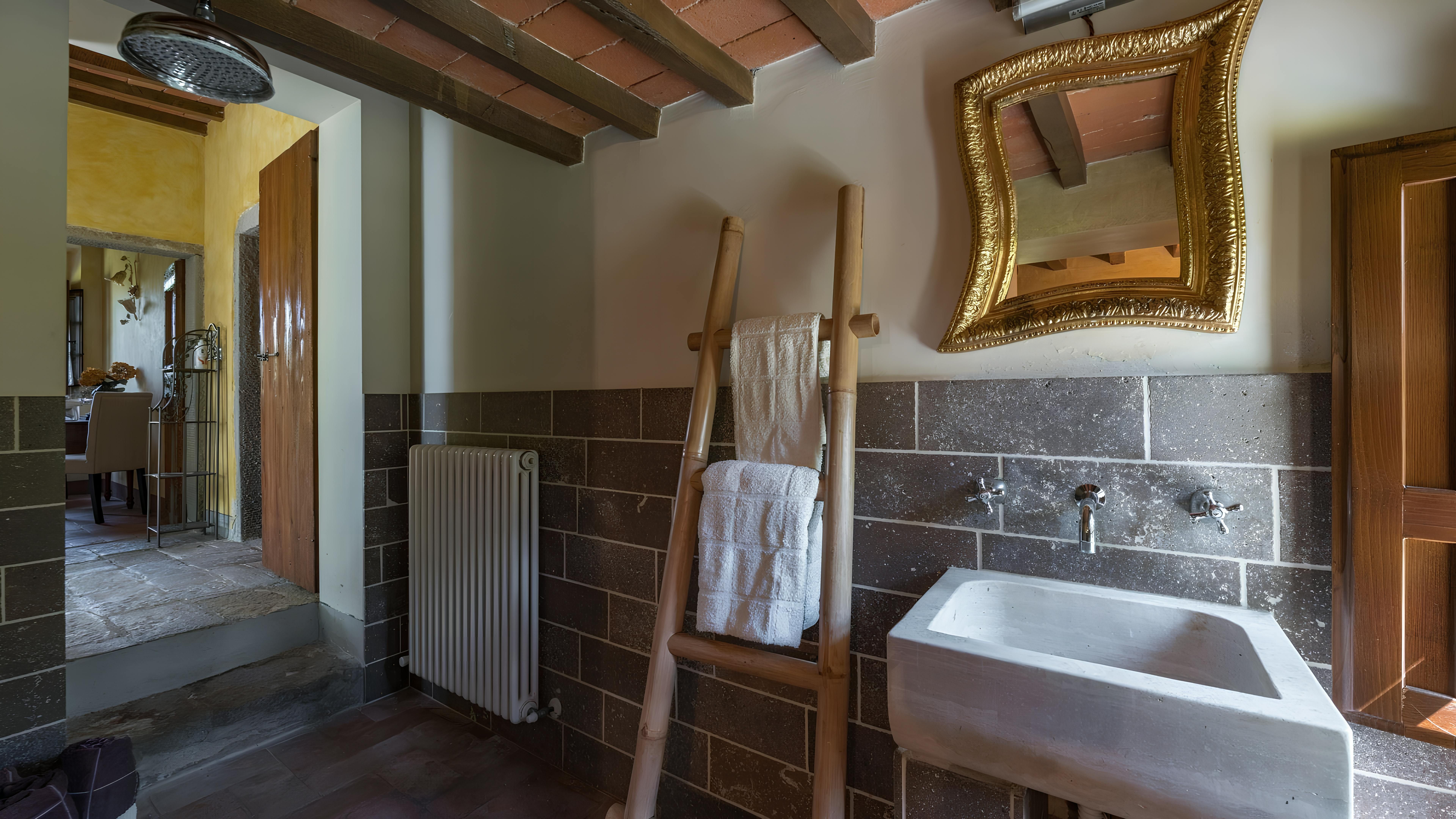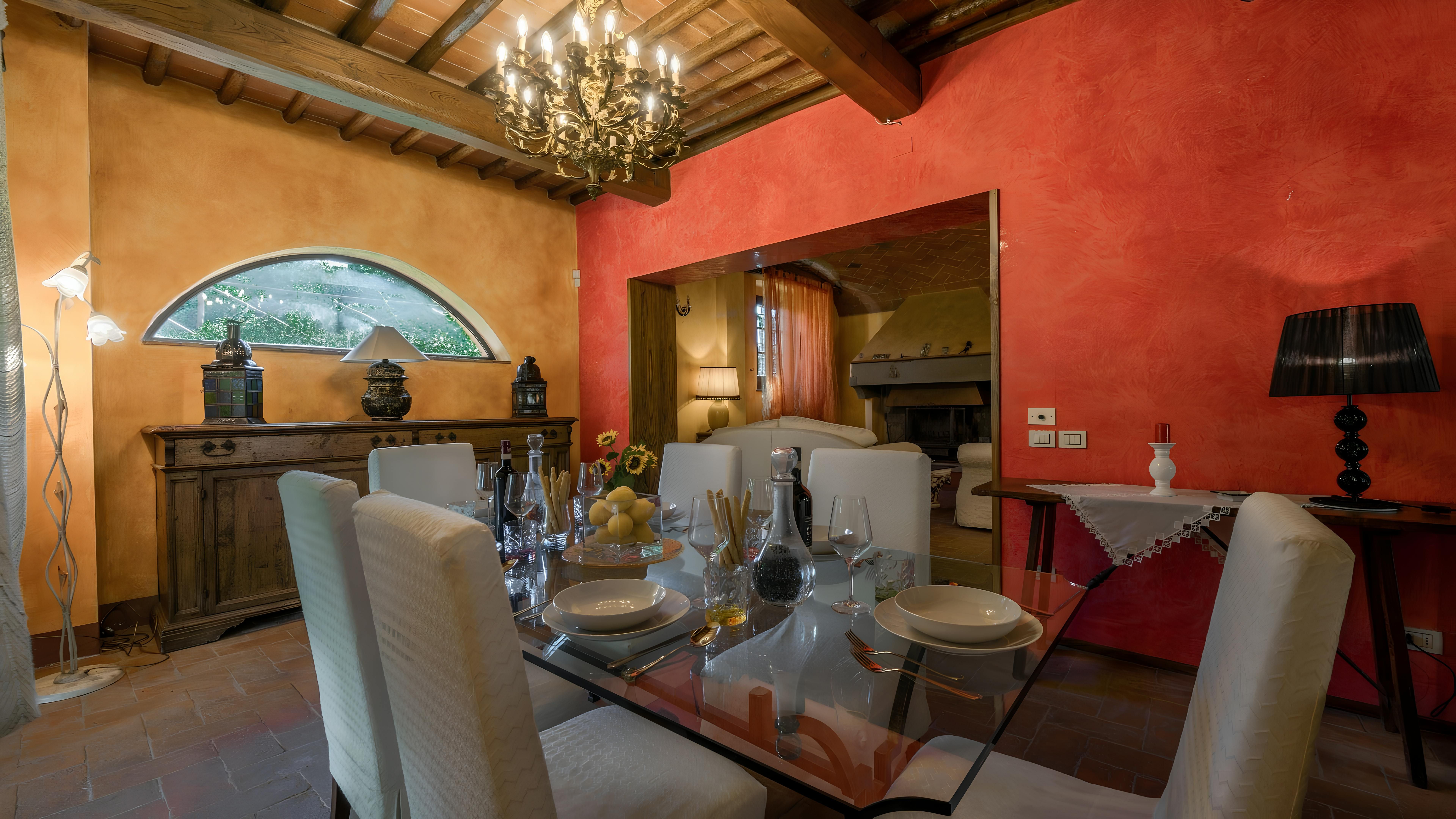 This beautiful Tuscan home caught our attention due to its inspiring views and ample outside living space. Consisting of a farmhouse and a cottage, you'll have access to the well-kept gardens and lovely terraces to help you soak up the rural setting. We think it's a perfect fit for families, due to the abundance of space and fully-fenced swimming pool (complete with a diving board) – plus you've got a table tennis area, sun loungers, a pergola with deck chairs and a covered patio for alfresco suppers. Though you will need a car to explore the region, you'll find the beautiful town of Levane nearby for local amenities.