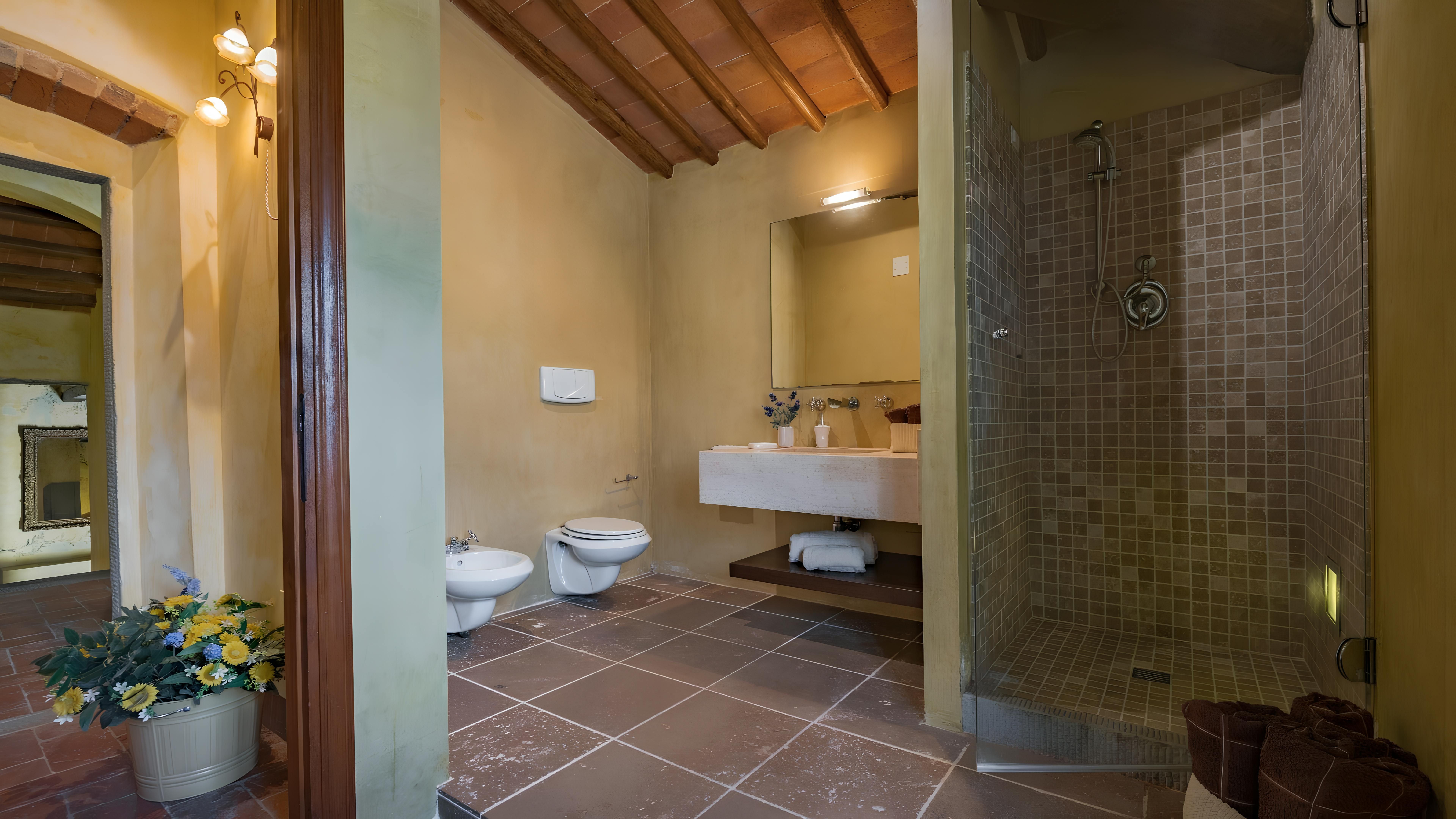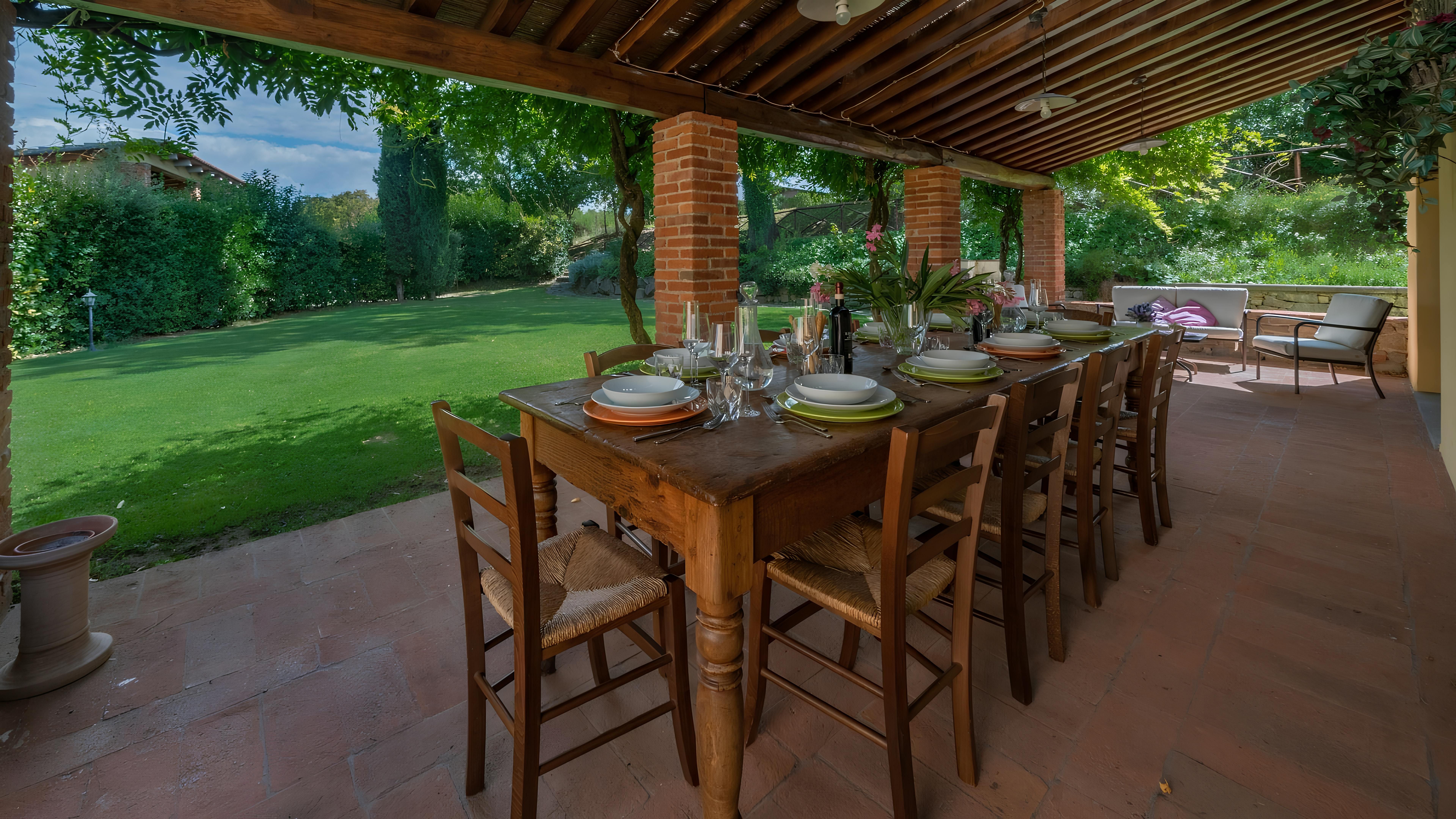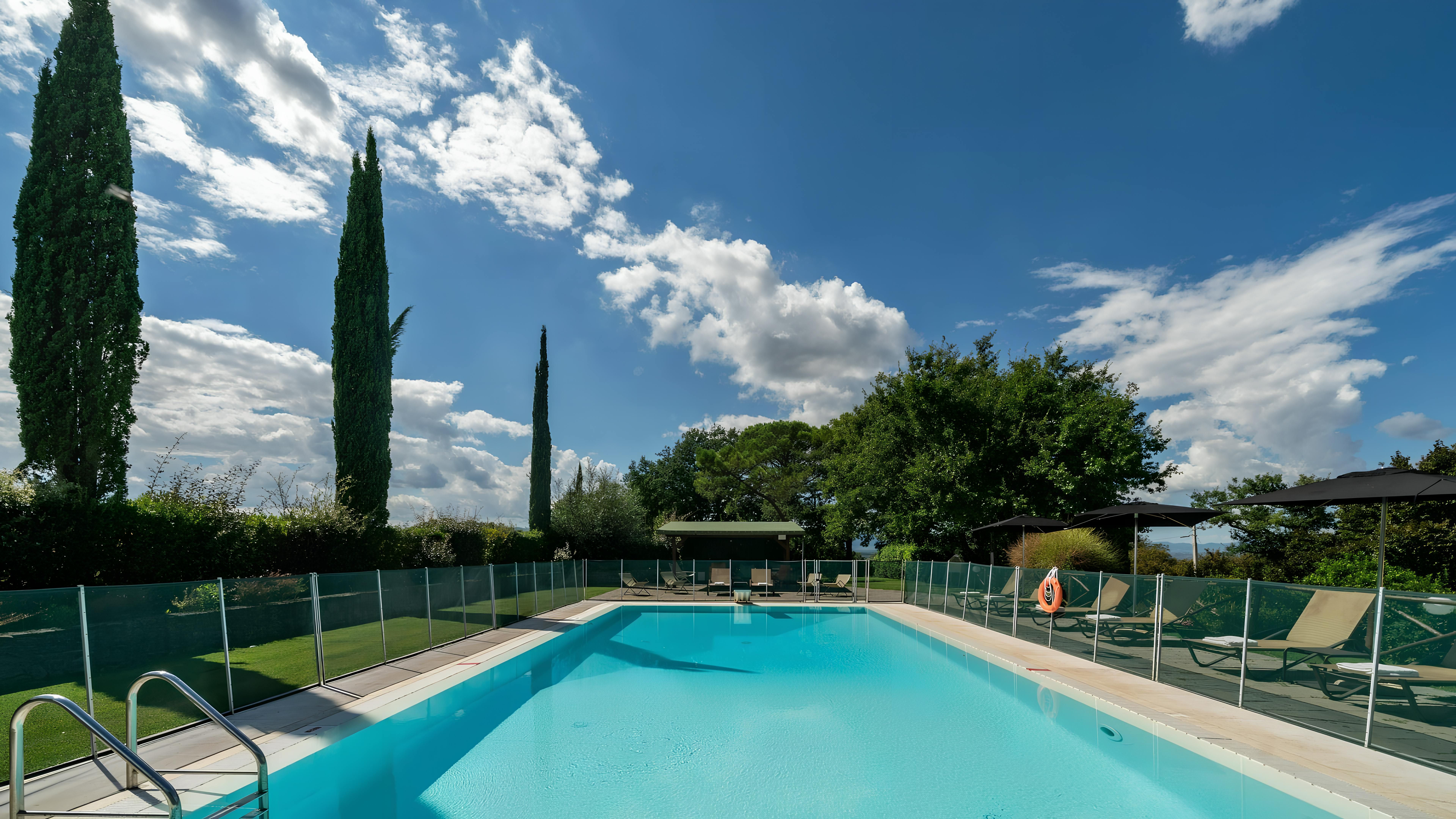 This beautiful Tuscan home caught our attention due to its inspiring views and ample outside living space. Consisting of a farmhouse and a cottage, you'll have access to the well-kept gardens and lovely terraces to help you soak up the rural setting. We think it's a perfect fit for families, due to the abundance of space and fully-fenced swimming pool (complete with a diving board) – plus you've got a table tennis area, sun loungers, a pergola with deck chairs and a covered patio for alfresco suppers. Though you will need a car to explore the region, you'll find the beautiful town of Levane nearby for local amenities.