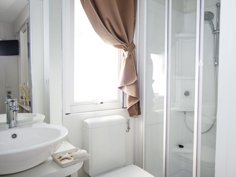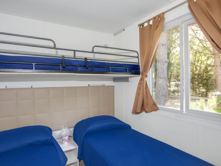"Bungalow Trendy", 3-room mobile home 30 m2. Object suitable for 4 adults + 1 child. Practical and modern furnishings: living/dining room with kitchen corner and TV. Exit to the veranda. 1 double bedroom with separate WC. 1 small room with 3 beds. Shower/WC. Air-conditioning. Terrace 14 m2, garden.