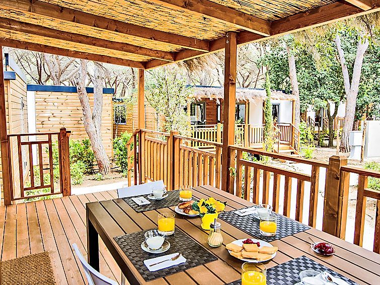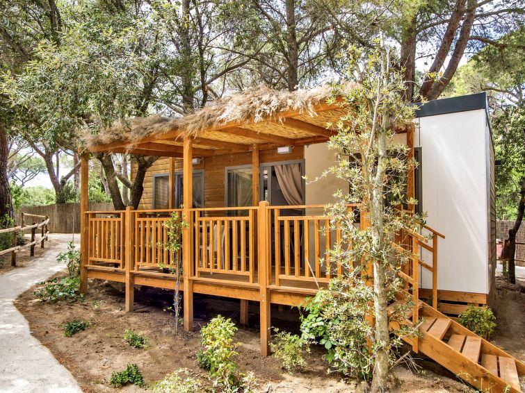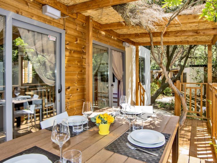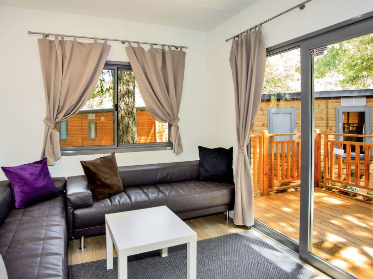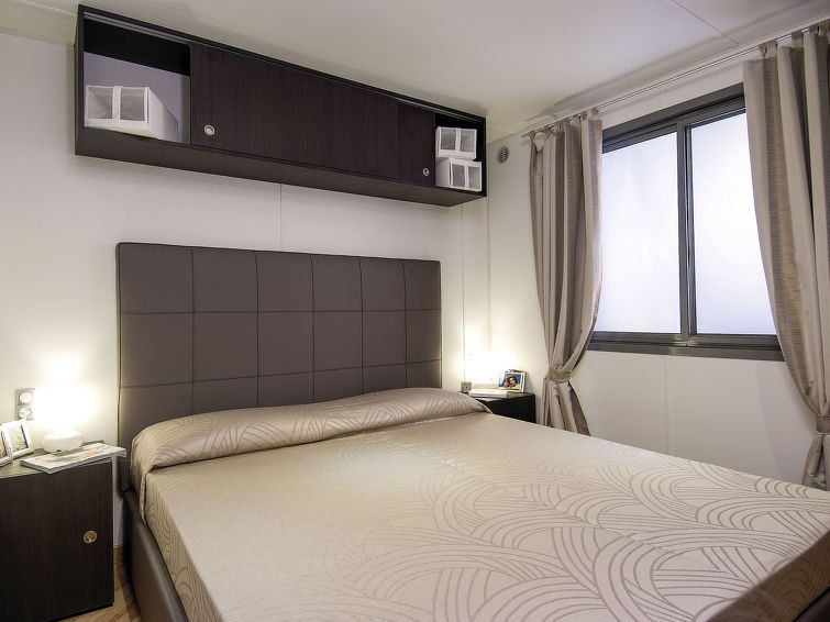 "Deluxe", 3-room mobile home 45 m2, on the upper ground floor. Modern and tasteful furnishings: living/sleeping room with 1 sleeping facility (80 cm), dining table, TV and air conditioning. Exit to the terrace. 1 room with 1 french bed (170 cm). 1 room with 2 beds (70 cm, length 180 cm), 1 x 1 bunk beds (70 cm, length 180 cm).