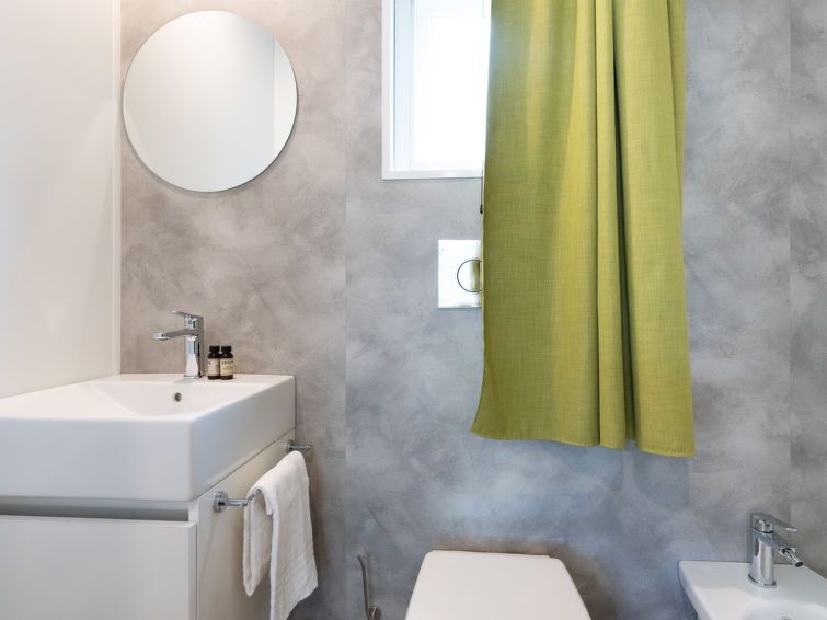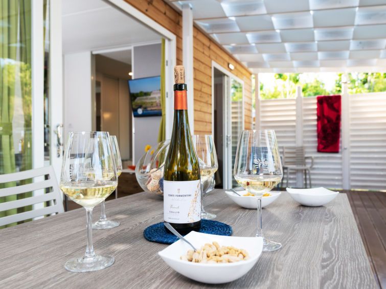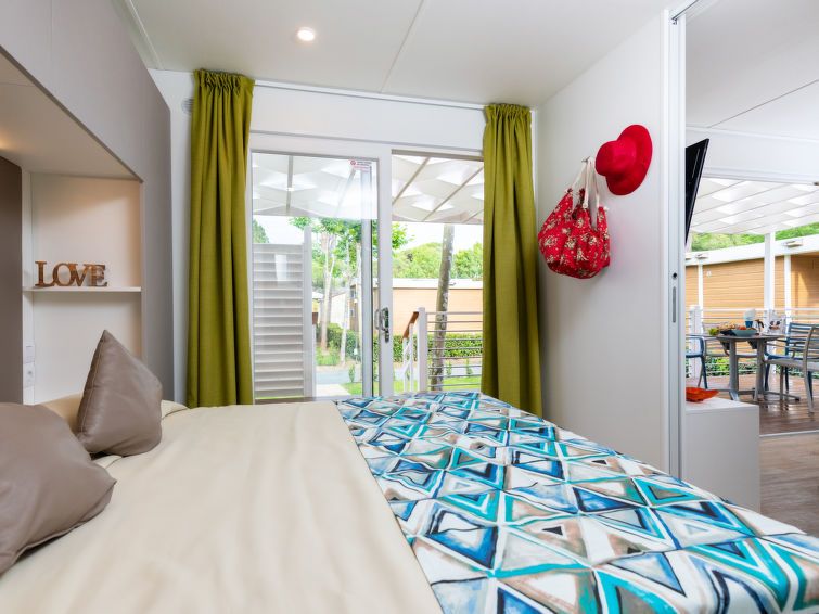 "Fashion", 3-room mobile home 38 m2, on the ground floor. Comfortable and modern furnishings: living/dining room with kitchen corner and TV. Exit to the garden, to the veranda. 1 double bedroom with shower/bidet/WC. 1 room with 2 beds. Shower/WC. Air-conditioning. Terrace, garden.