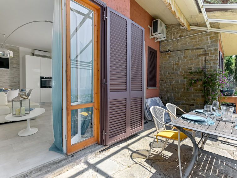 4-room semi-detached house 90 m2, on the ground floor. Modern and cosy furnishings: living/dining room with panoramic window with dining table. Exit to the terrace. 1 double bedroom with shower/bidet/WC. 1 double bedroom. 1 room with 2 beds (80 cm). Open kitchen (oven, dishwasher, 4 gas rings, electric coffee machine).