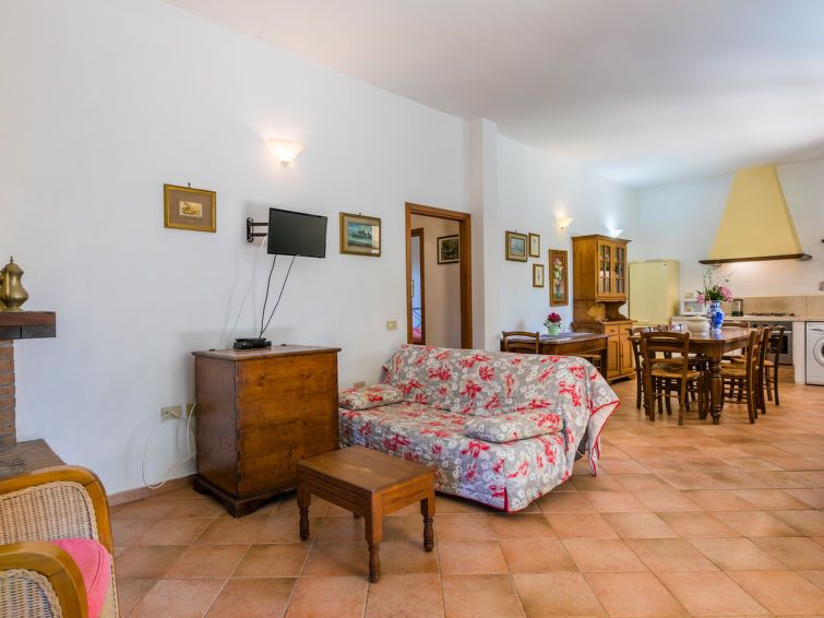 5-room house 120 m2, on the ground floor. Spacious, simple and practical furnishings: large living/dining room with TV. Exit to the terrace. 2 double bedrooms. 1 room with 2 beds and 1 x 2 bunk beds. Exit to the terrace. Open kitchen (oven, dishwasher, Gas stove, 4 gas rings, toaster, kettle, microwave, electric coffee machine) with dining table.