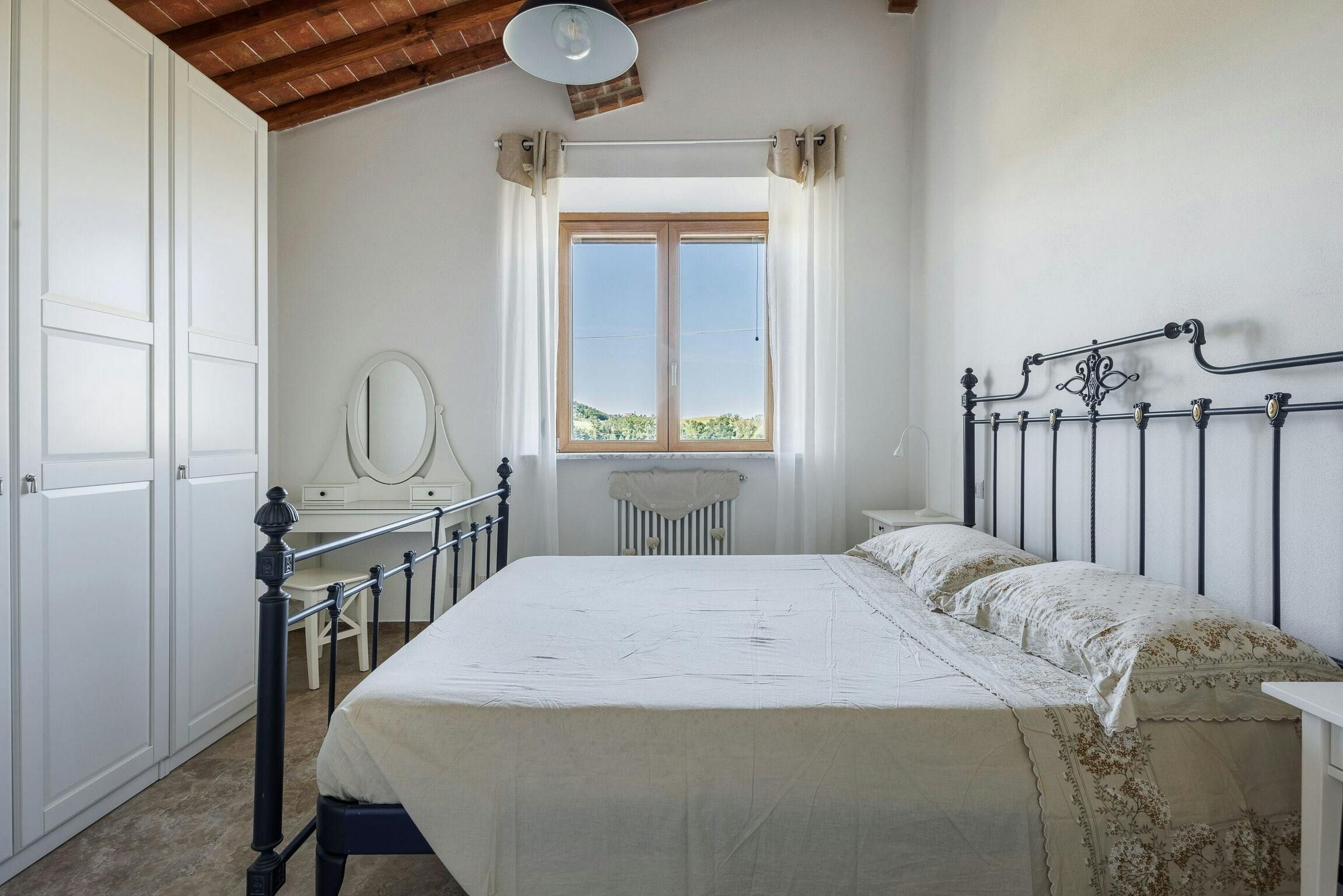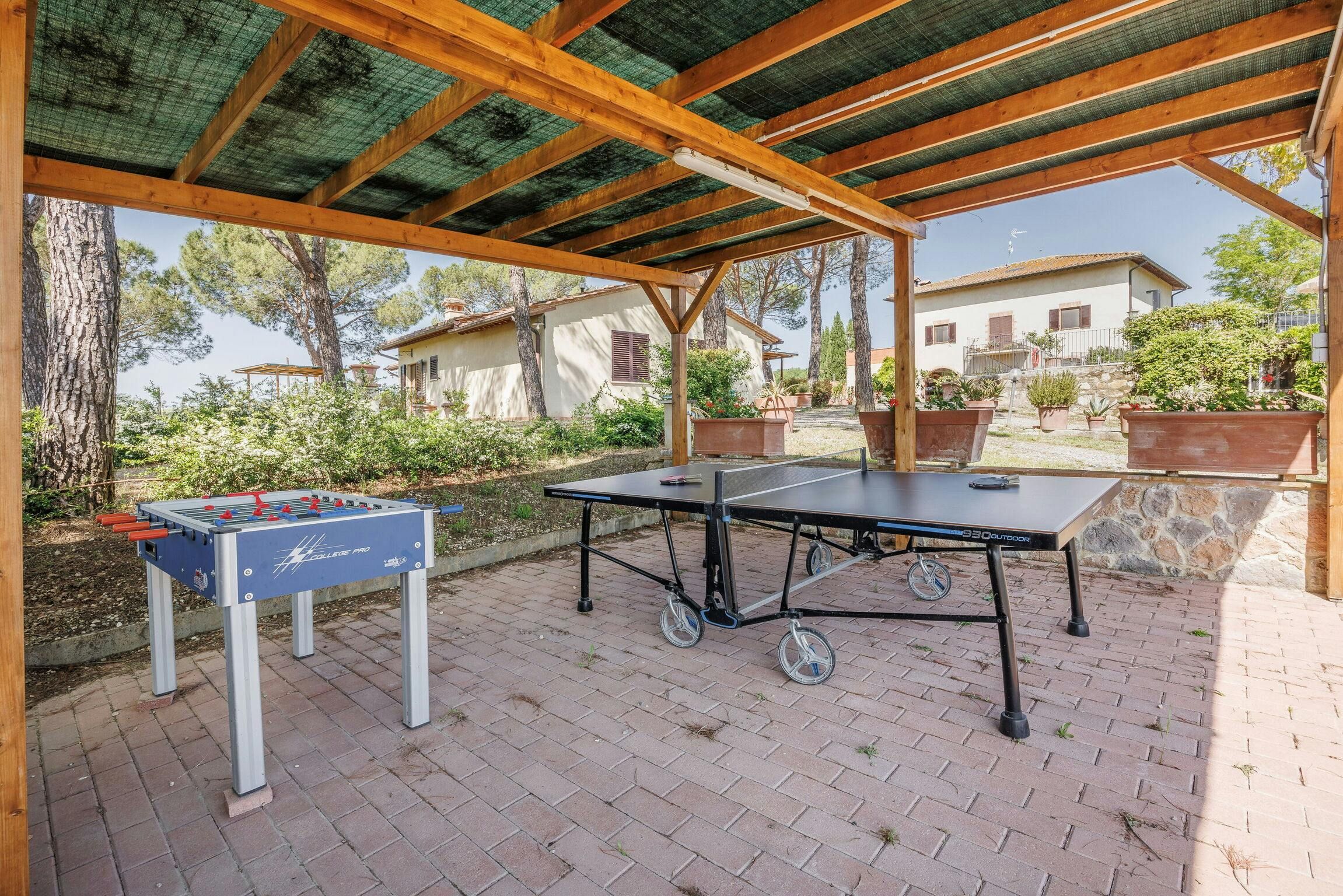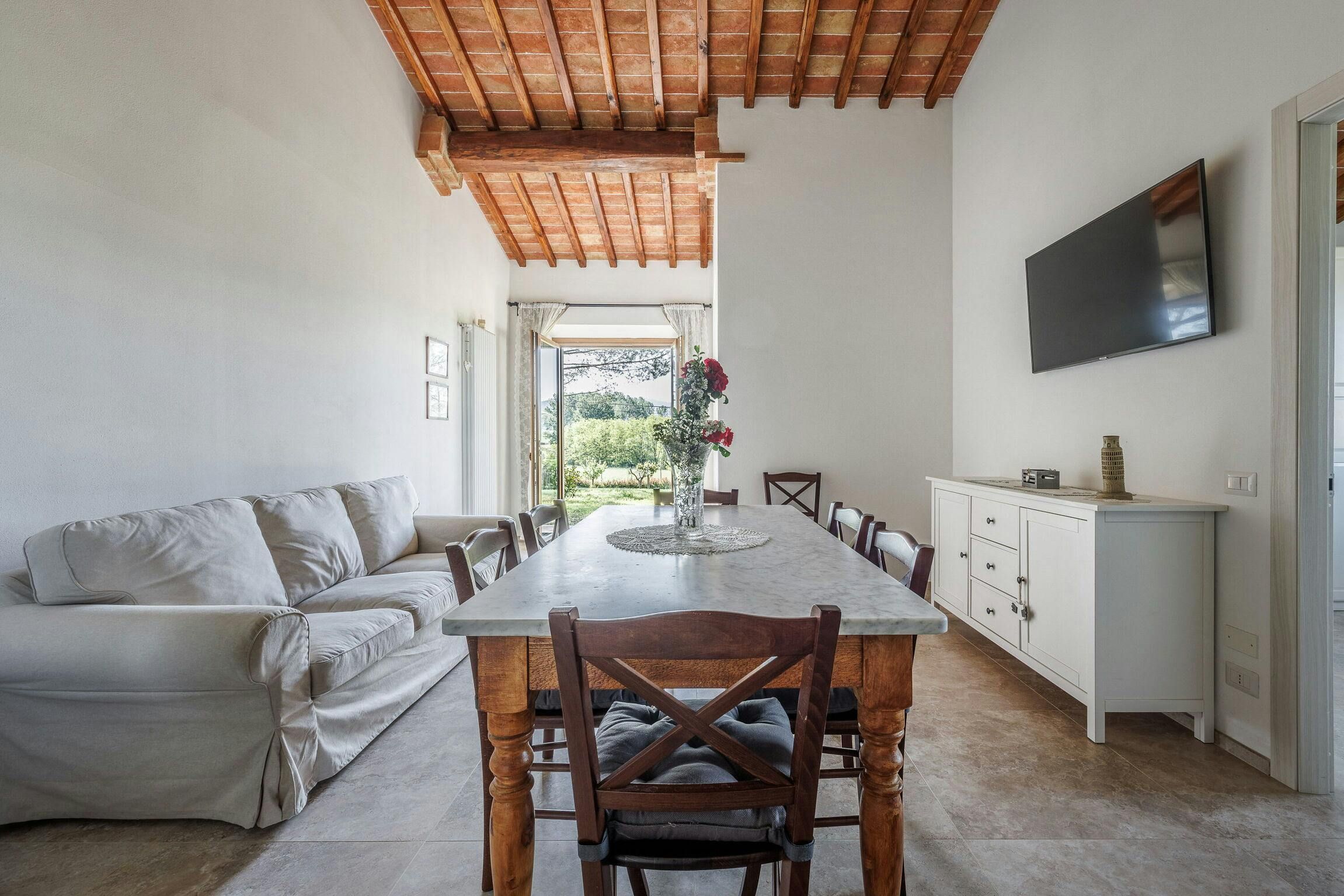 Swimming pool, sunny garden, and scenic views of the Tuscan countryside – what more could you ask for? There are two separate apartments in this villa, each with a living room and kitchen, so it is an ideal choice for two families travelling together or a group looking for separate yet social spaces. The interiors feature vaulted wooden ceilings, while the garden has a barbecue, ping pong table, and a terrace where you can make the most of the sunshine. A small fitness room is equipped for workouts. Location-wise, this is a great spot for day trips. Volterra, Siena, and even Florence are all easily reached by car.