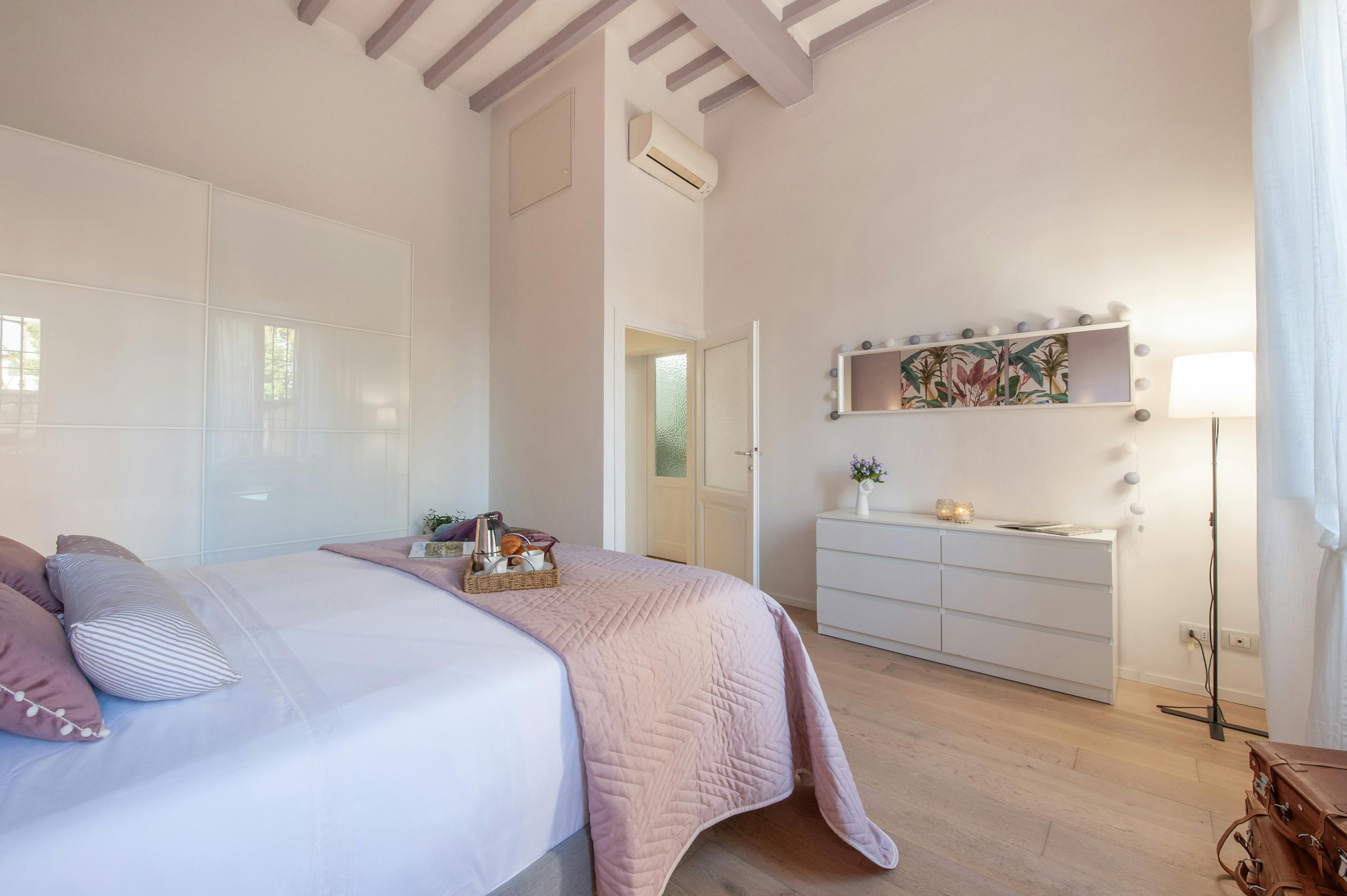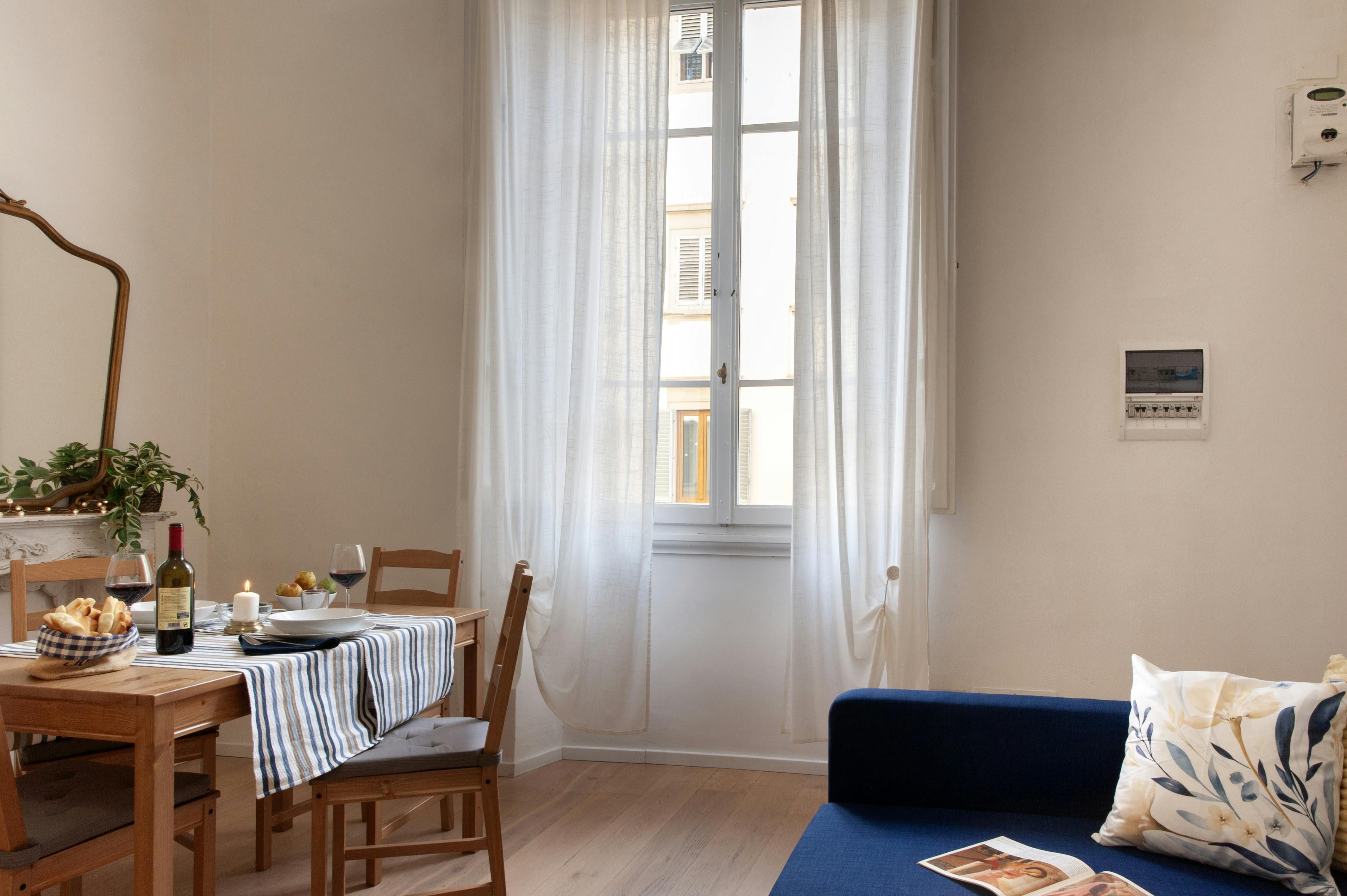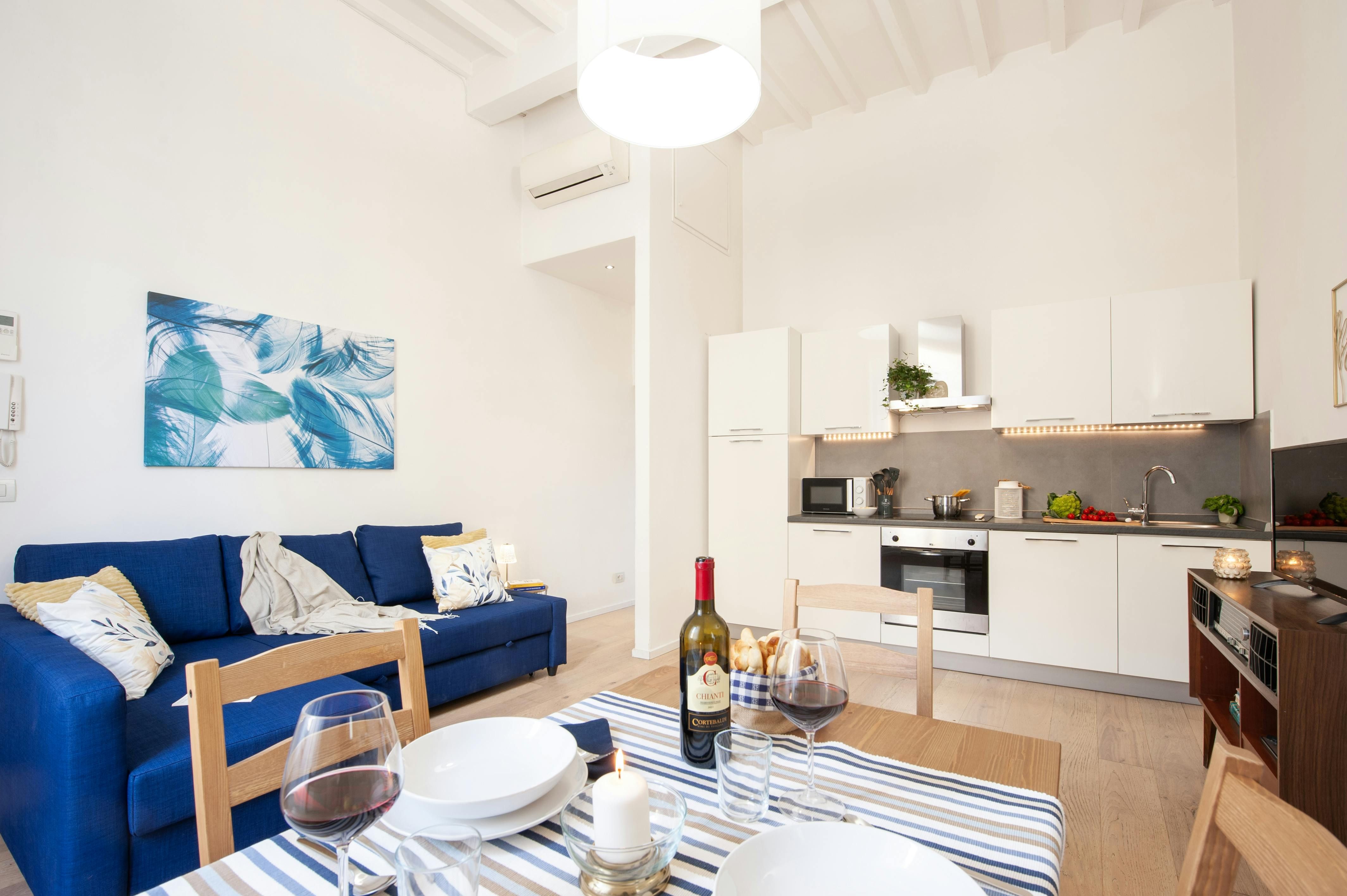 In the heart of the San Frediano district, a lively neighbourhood where the old Florentine traditions are still alive with their traditional shops and handicrafts, this apartment is ready to welcome you to the cradle of the Renaissance. Located on the first floor, this one-bedroom apartment is bright and bold, with plenty of light and vibrant colours injecting personality into the interior. Its location is similarly dramatic – it’s just a few steps from the Arno River, and close to the Palazzo Pitti too, where the famous Medici family lived in luxury centuries ago.