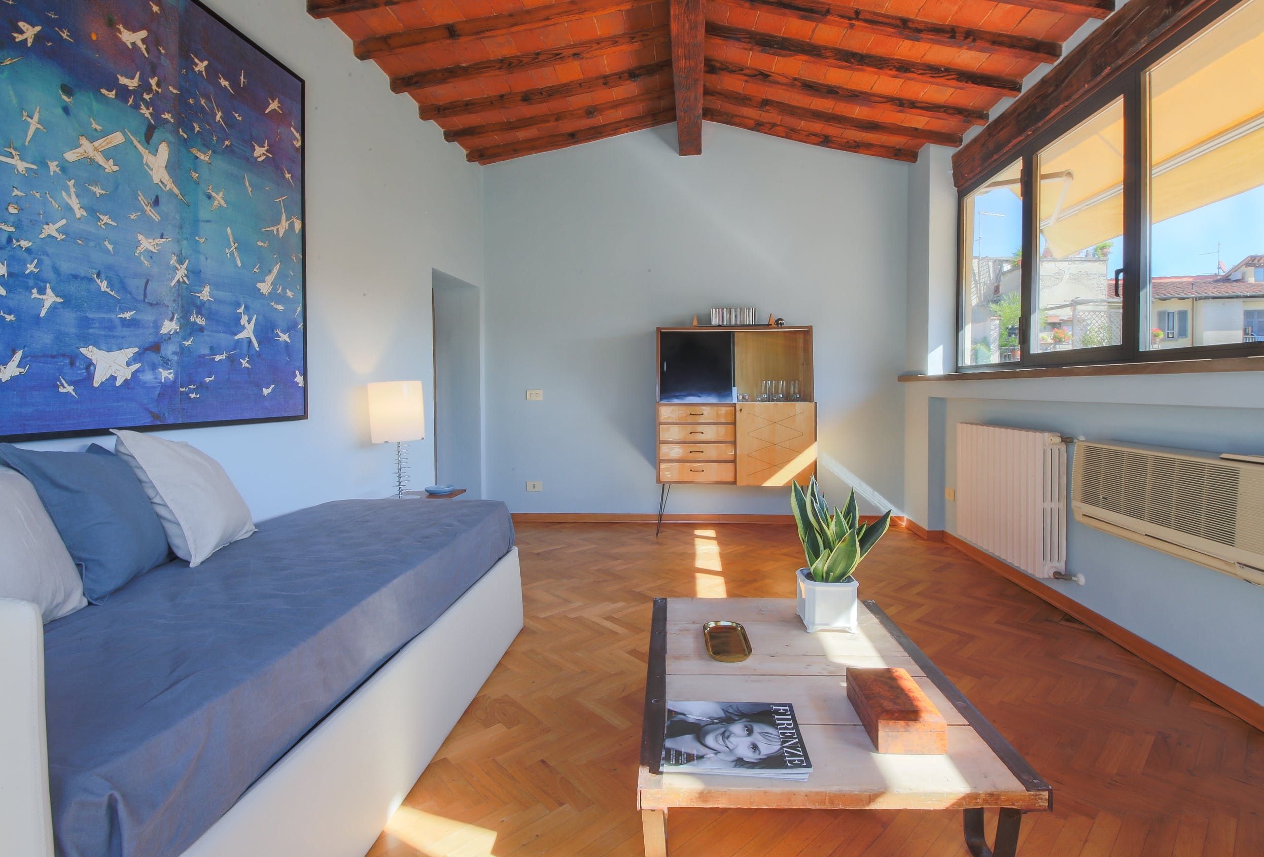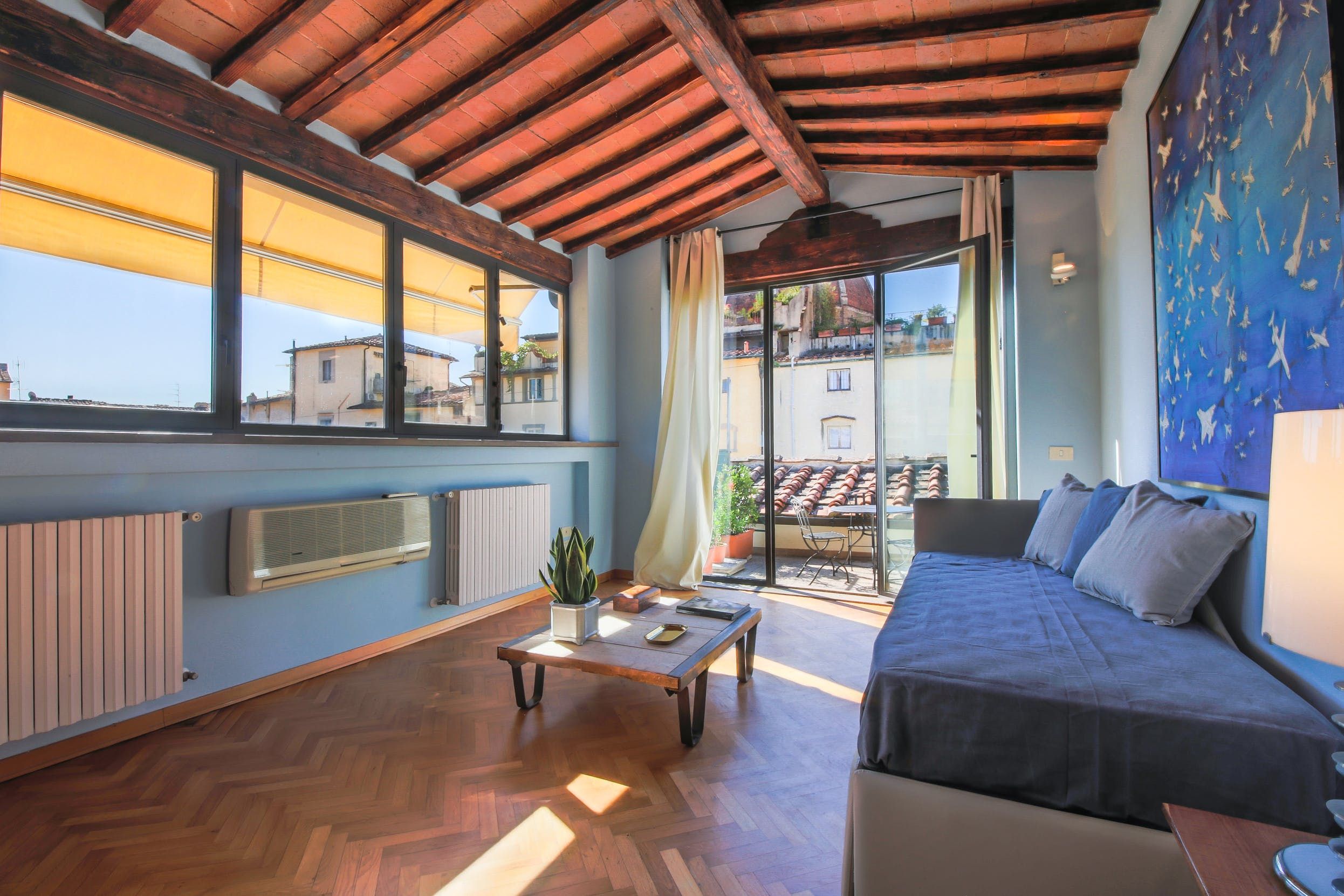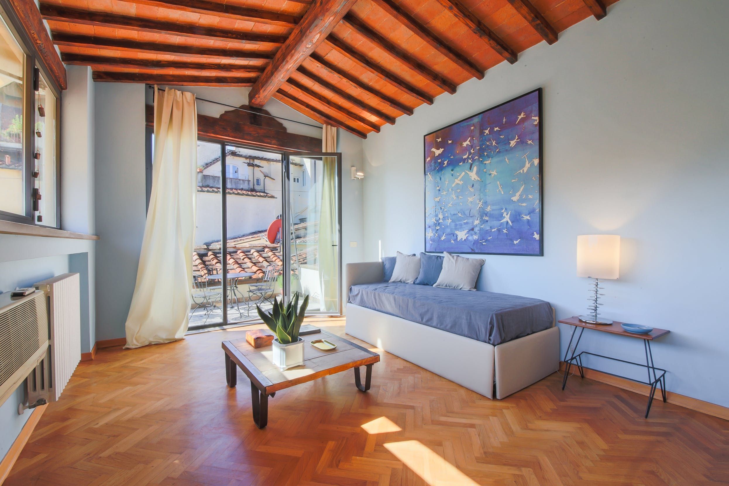 Admire the stunning views of the Duomo and Florentine rooftops from this home's gorgeous, sunny roof terrace – it's the ideal spot for an aperitivo. Later on, relax on the large sofa in the living room or whip up a papardelle al cinghiale in the modern kitchen if you don't fancy eating out. This home is perfect for a group of friends, a family or work colleagues looking to be within easy walking distance of many of Florence's treasures.
