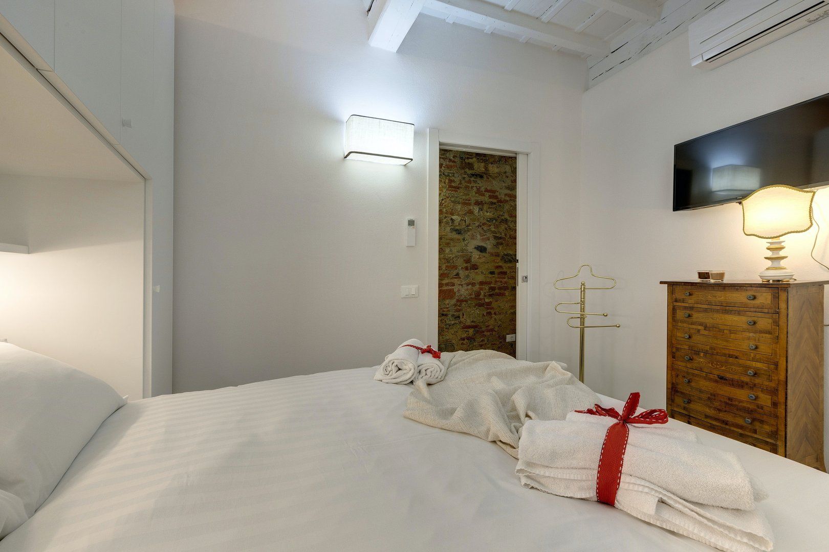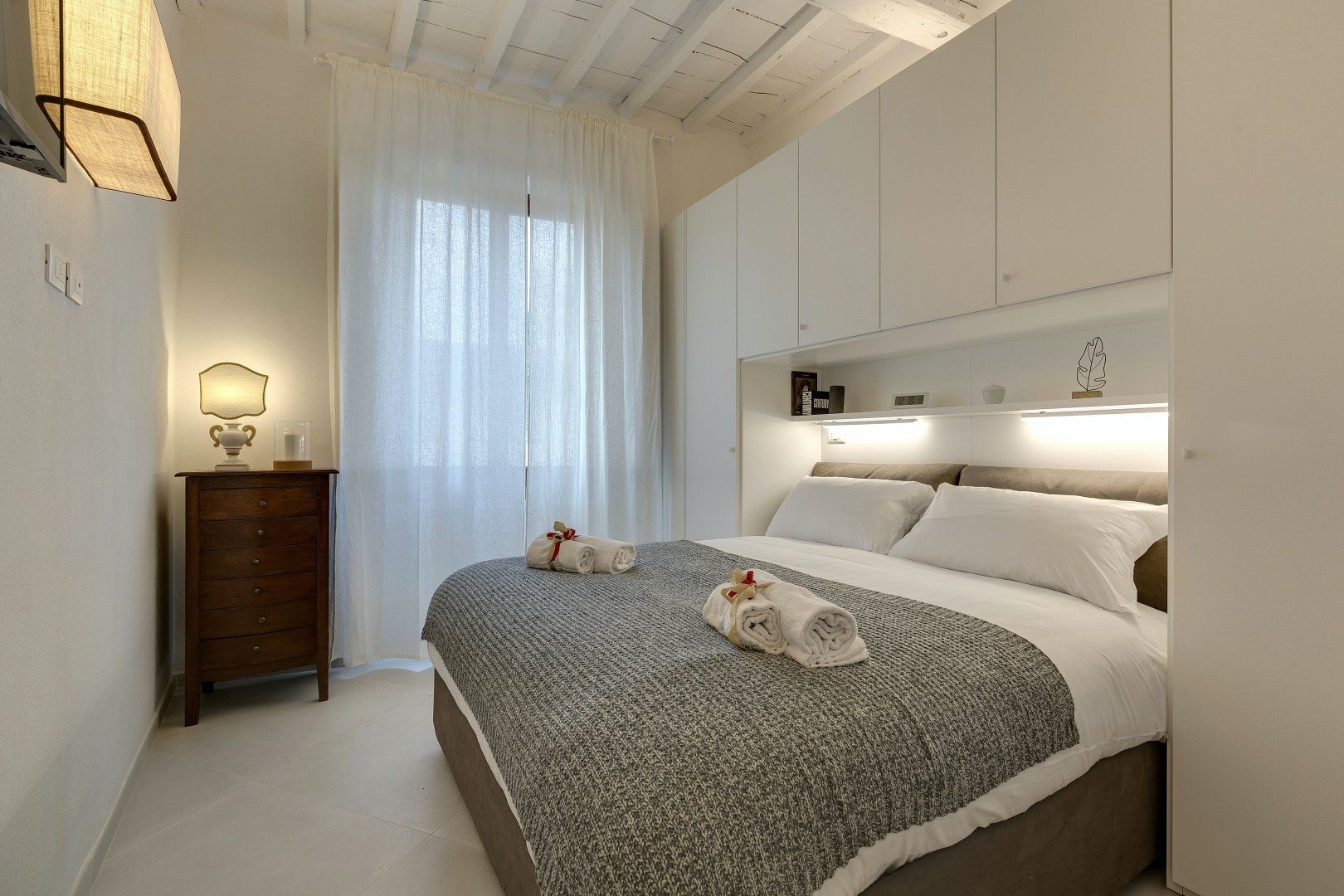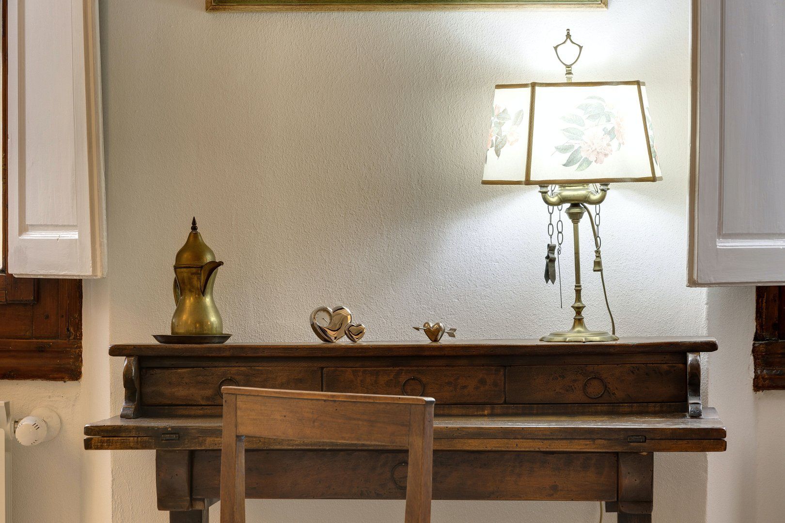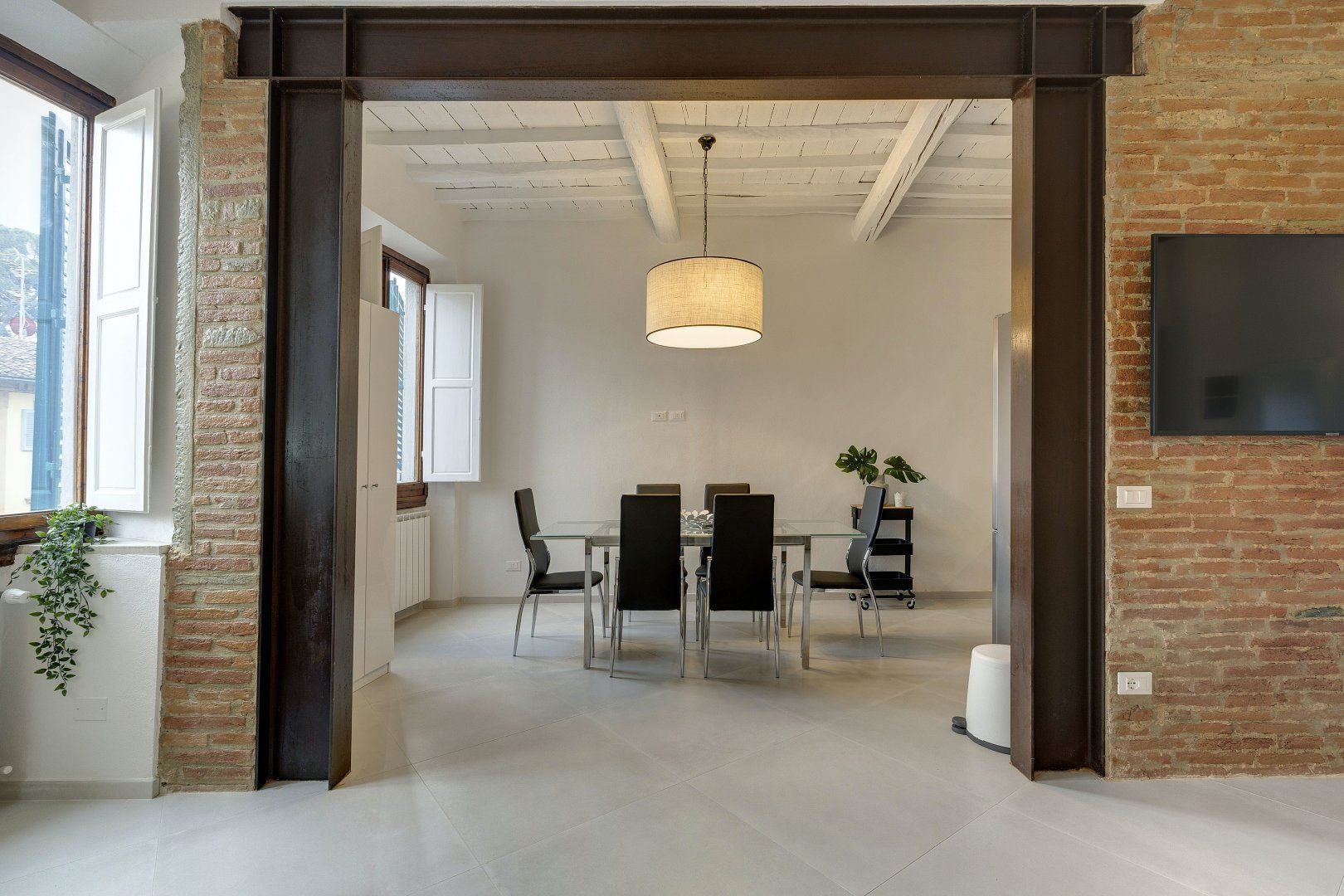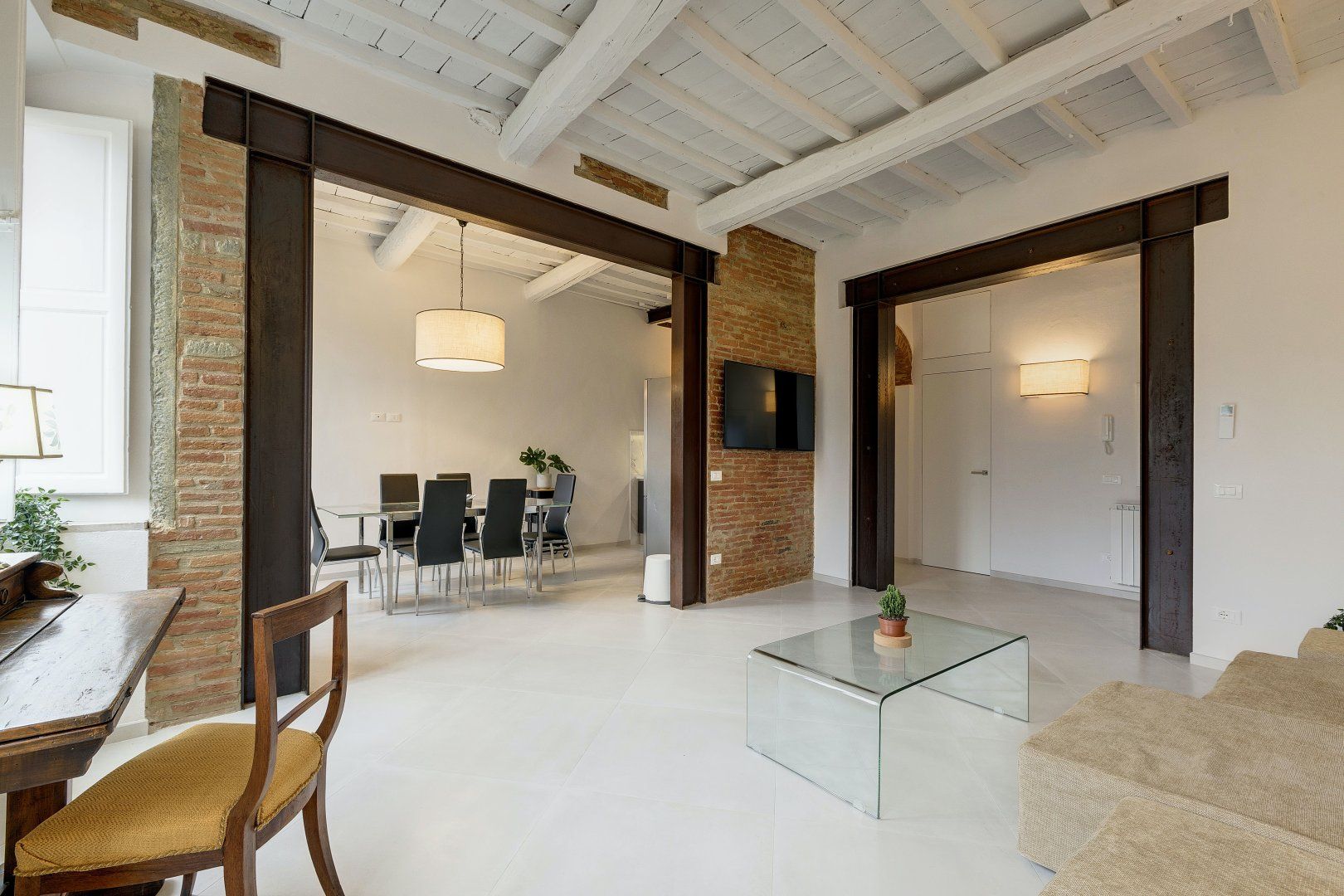 Step inside, and you'll find a bright and airy space that invites you to get comfortable. There are traditional details, like the ceiling beams and exposed wood doorframes, but the owner has added plenty of modern touches too. If you need to catch up on work, there's a gorgeous antique desk where you can use your laptop. And, budding chefs can practice their favourite Italian dishes in the smart kitchen, before serving their culinary creations at the glass dining table.