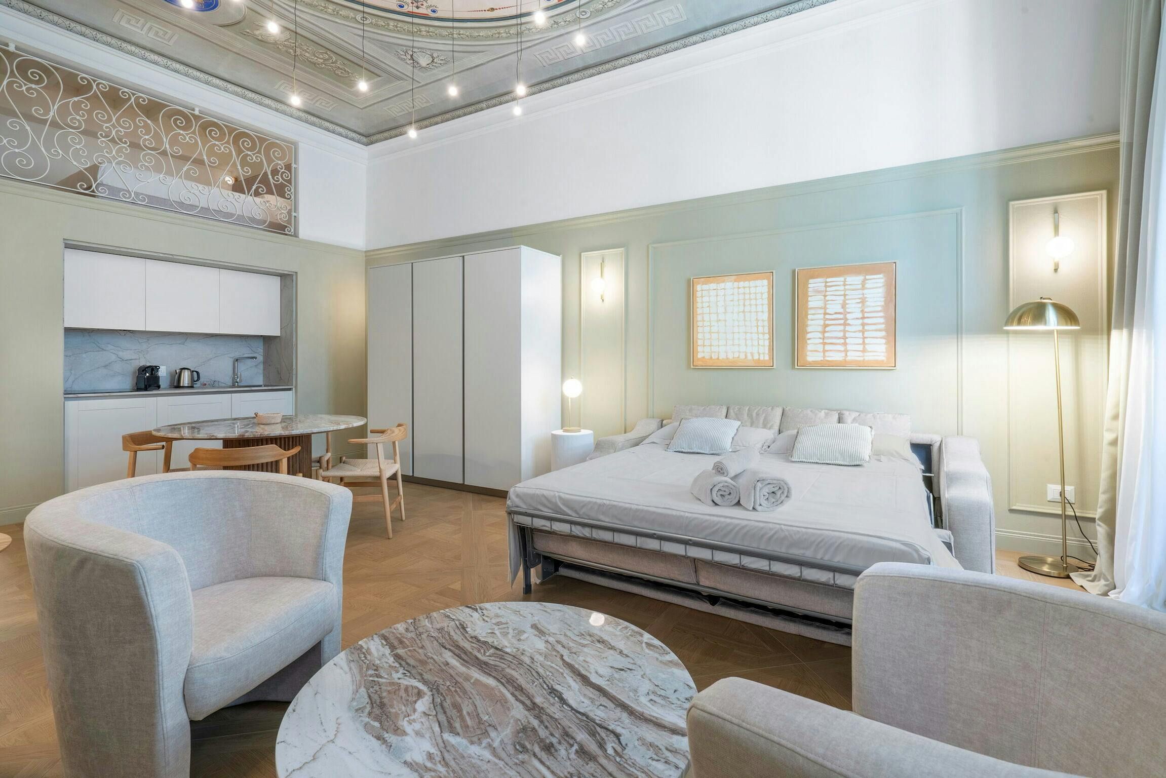 There aren’t many apartments in Florence that can boast a two-minute walk to the Duomo – and this home is one of the lucky few. Its tall windows look out to the bustling street below, and the high ceilings with their intricate mouldings serve as another reminder that you’re in the cradle of the Renaissance. It is indeed an historic building, so although it does have a lift, you’ll need to climb a few steps to reach it. It’s a small price to pay, though – walk outside you’ll be right in the heart of Florence, immersed immediately in the very best the city has to offer.