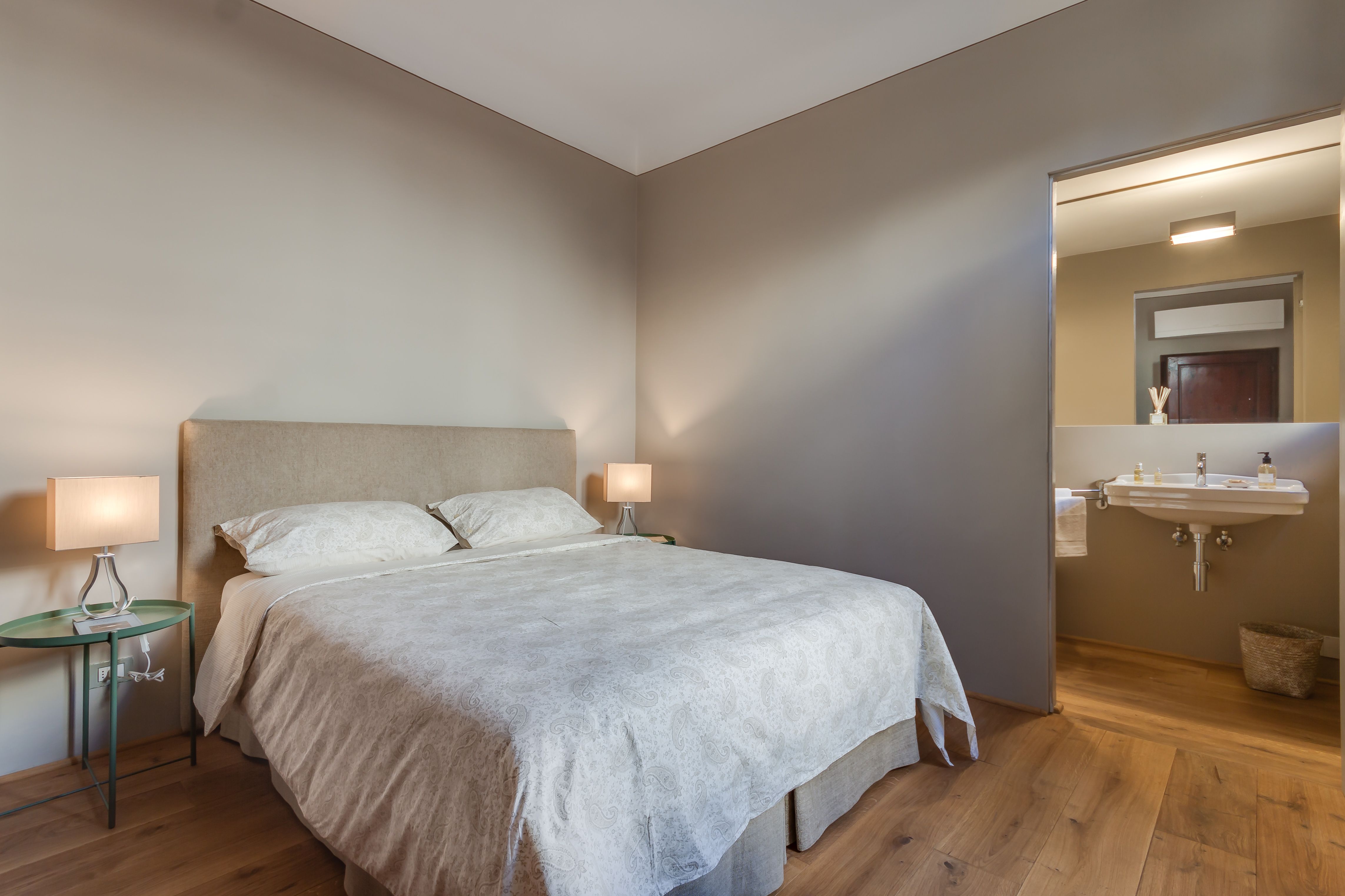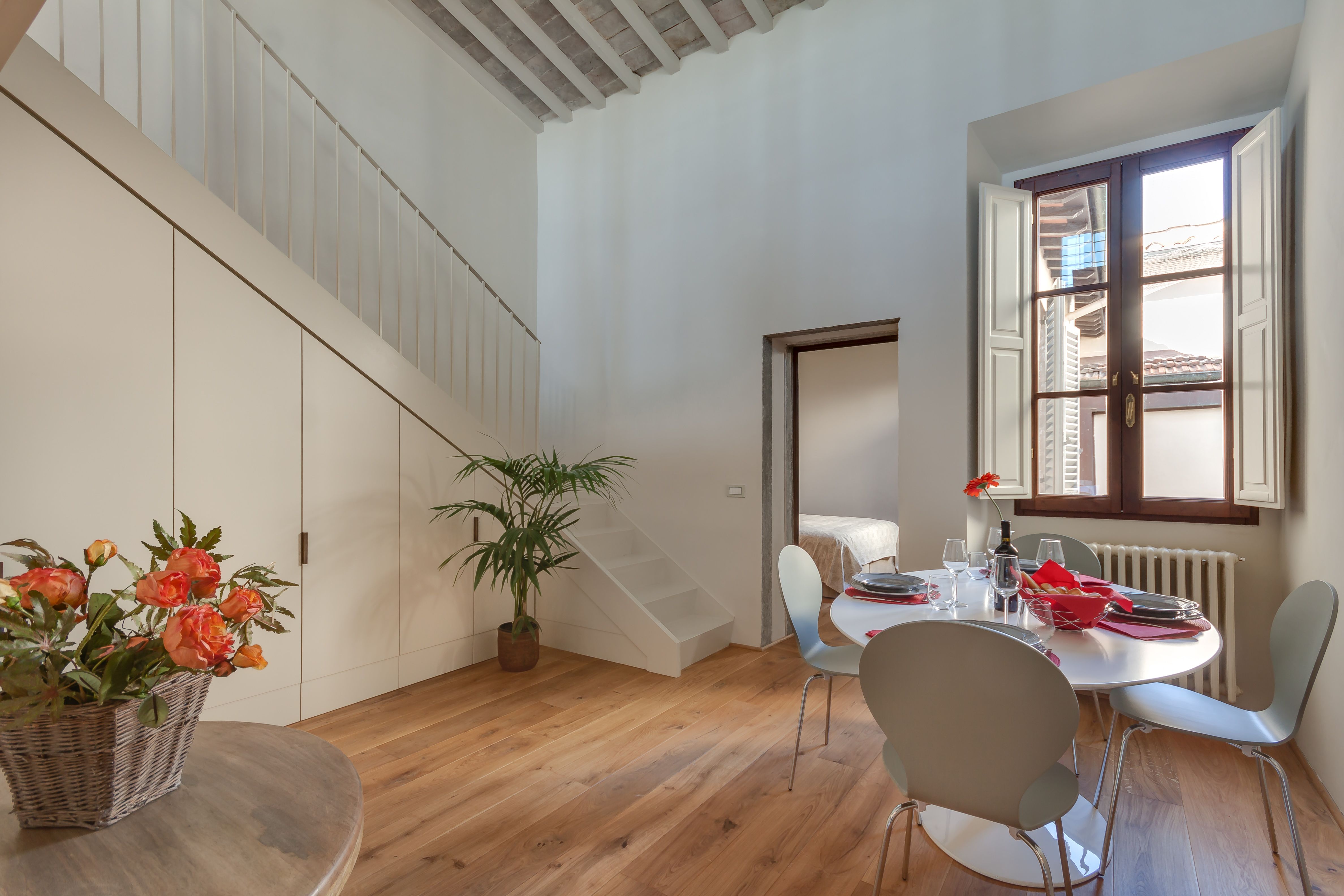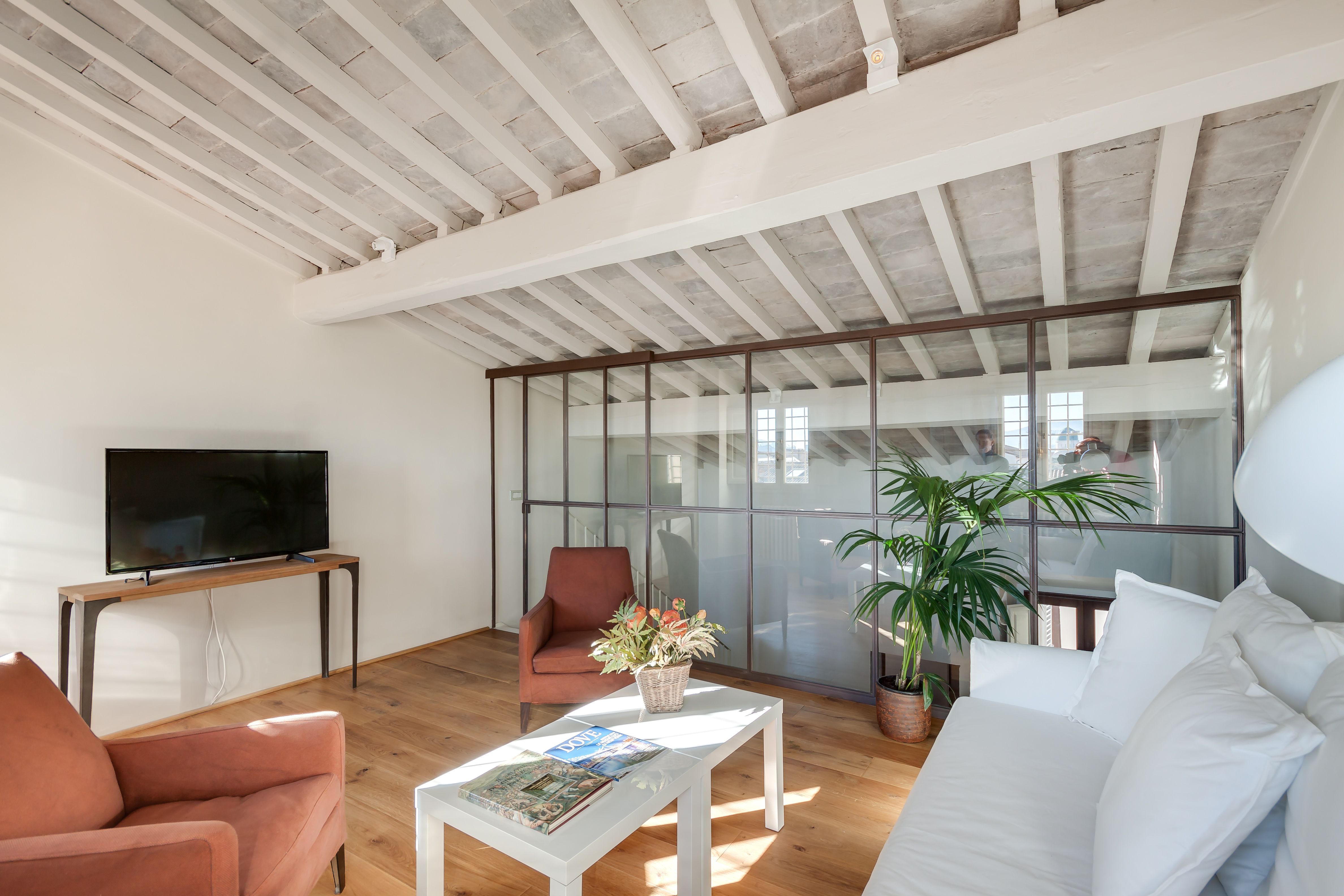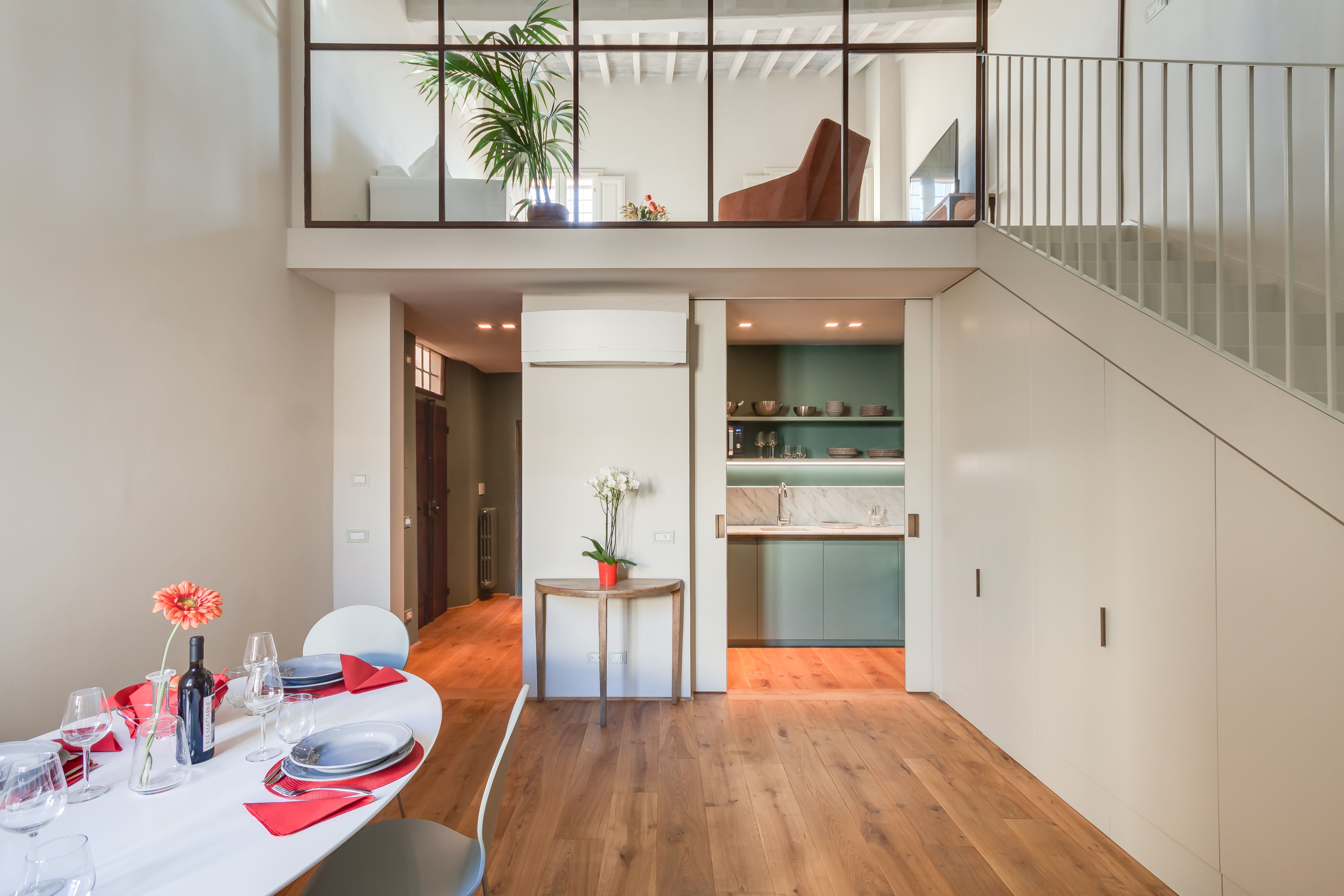 This stylishly renovated apartment blends timeless grandeur with modern comfort. Set in a historic building in Piazza Santissima Annunziata, it boasts frescoed ceilings for a truly immersive Florentine experience. The kitchen is well-equipped, and the panoramic views of the city from the top floor are unforgettable. You’re just minutes from the Duomo, the Accademia Gallery, and Florence’s most iconic landmarks. At full capacity, two guests will sleep on the sofa bed in the upper-level living room. And while there are steps to climb, and the vibrant square below may bring some city noise, it’s all part of the experience. This is a stunning stay in the very heart of Florence.