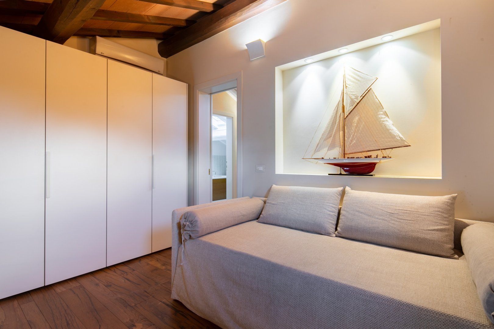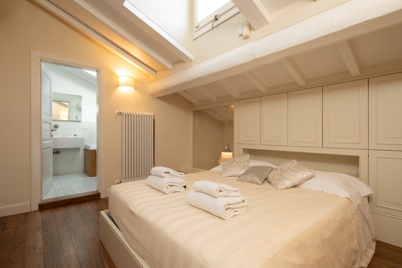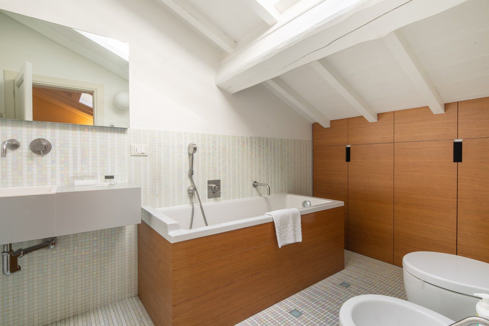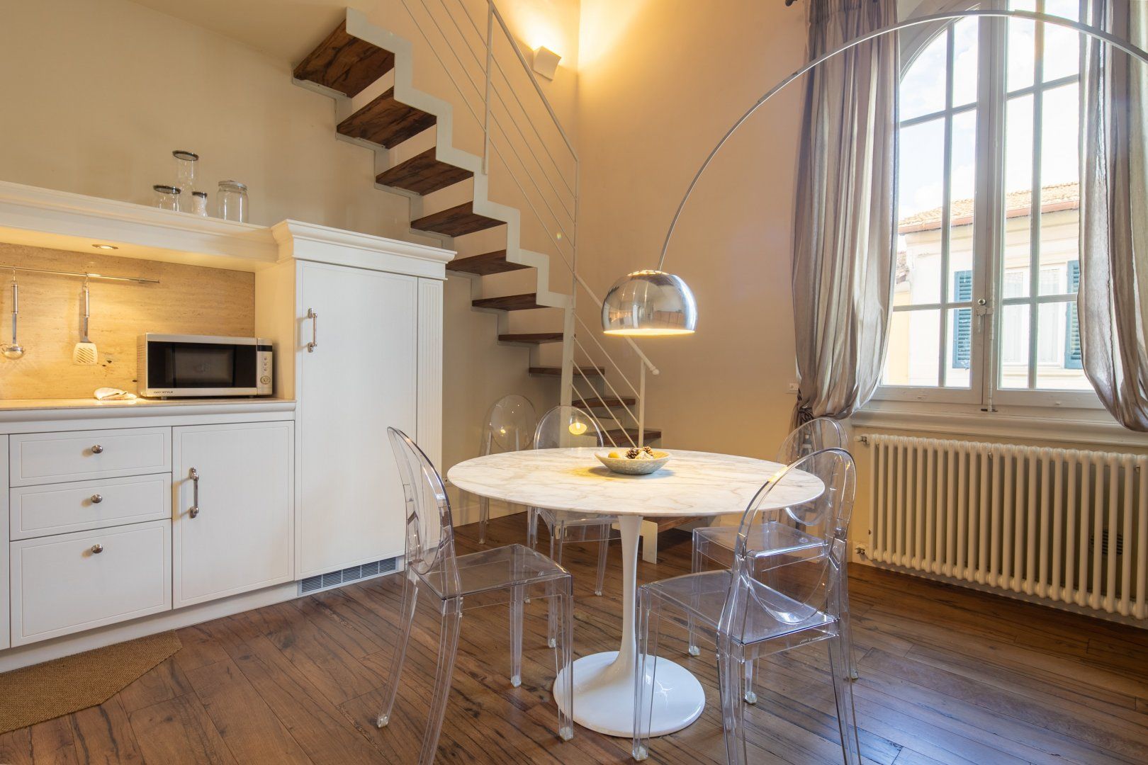 In a quiet neighbourhood that Galileo once called home, we think this split-level apartment is out of this world. Warm and inviting, the built-in bookcases and cosy fireplace make for a peaceful spot to rest your legs after a day out and about in Florence. The French doors in the living room show off the tree-lined street, while upstairs, the views overlook the city's medieval walls. While the living room feels rustic and cosy, the kitchen is fully modernised and comes with everything you need to whip up a feast. For a relaxing evening in, we recommend snuggling on the sofa with a glass of wine and an engrossing read, though it will be hard to resist a twilight stroll around the city. Across the river, the famous Duomo is a thirty-five-minute walk, though we think you'll prefer the views from Piazzale Michelangelo, which is just a ten-minute bus ride.
