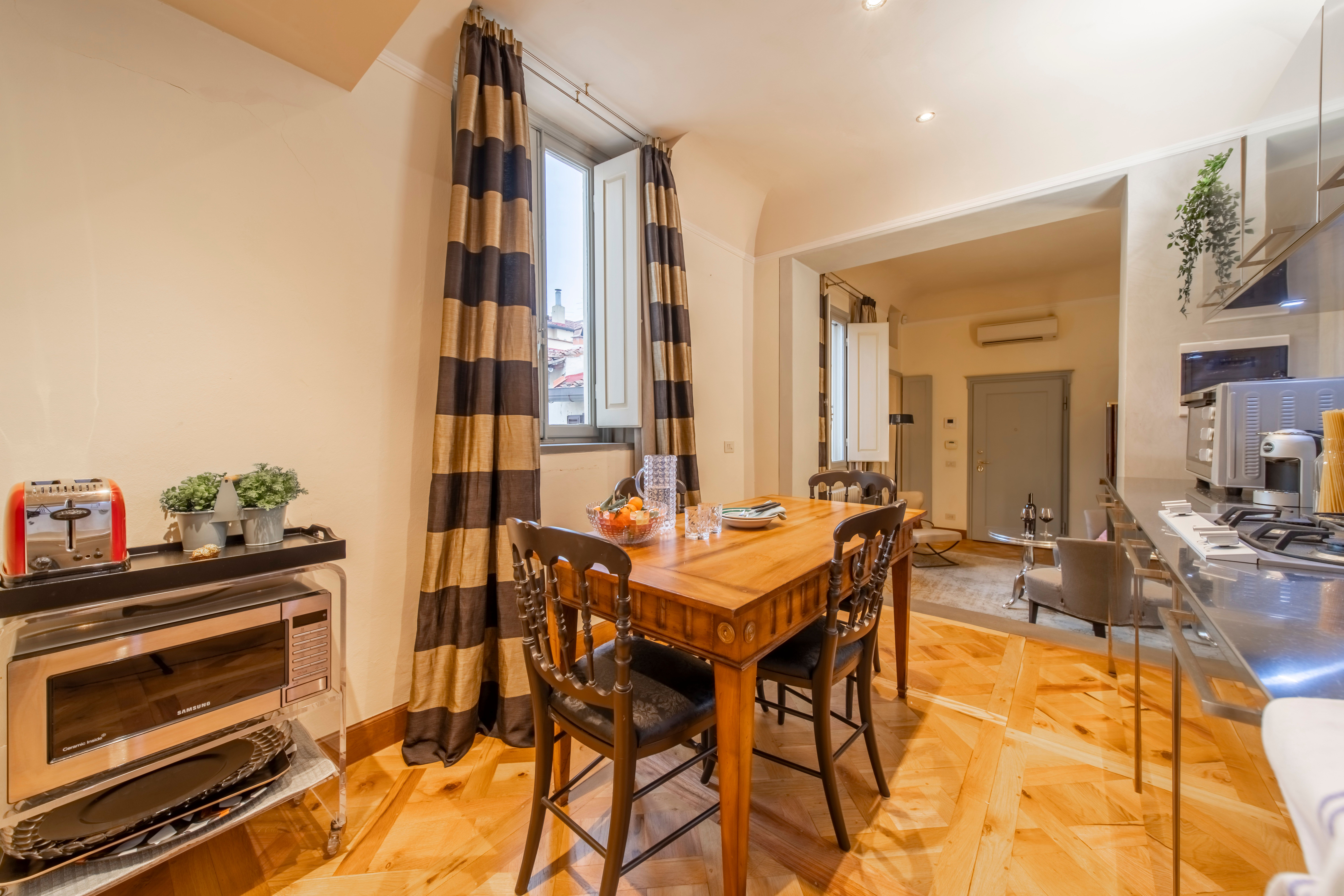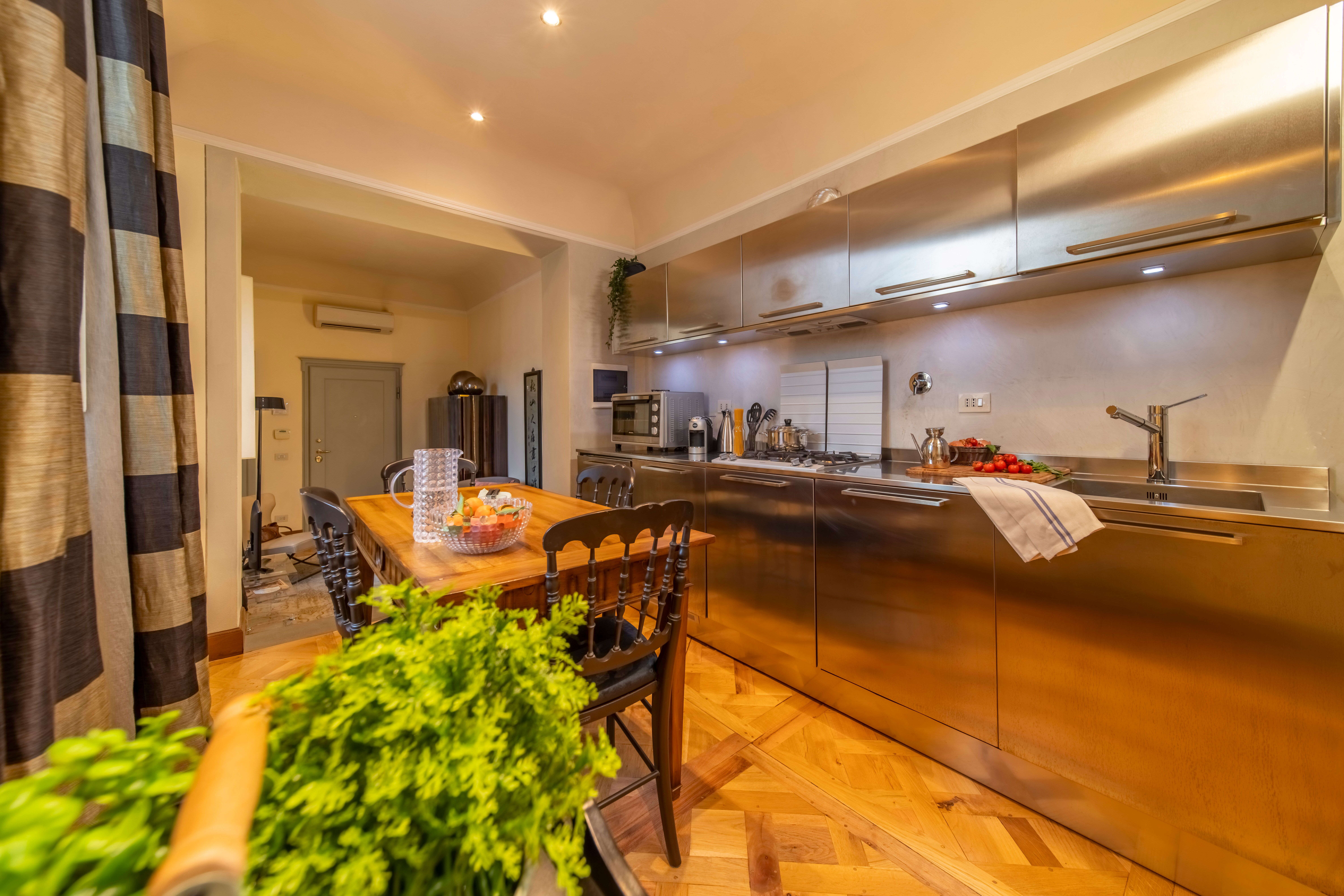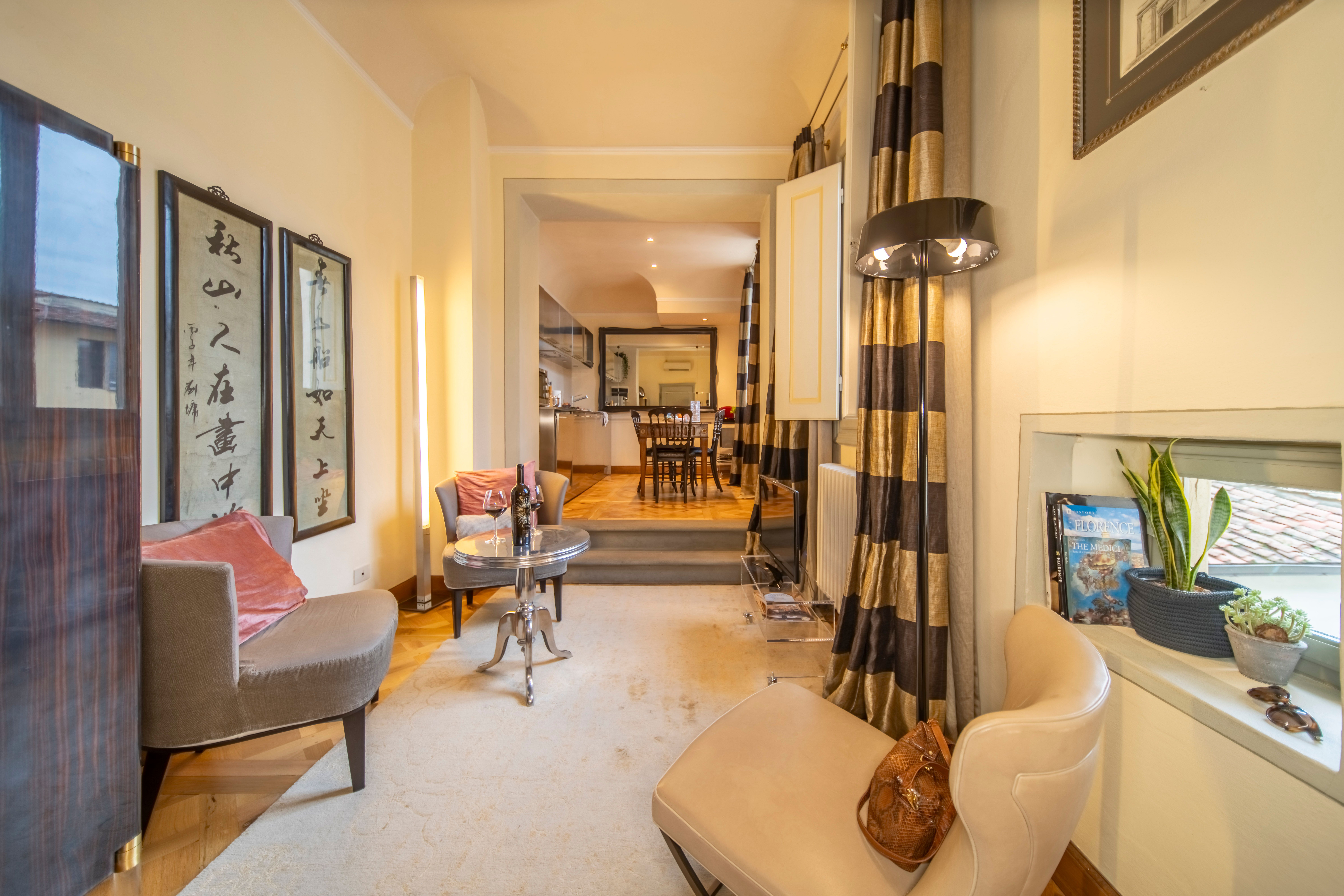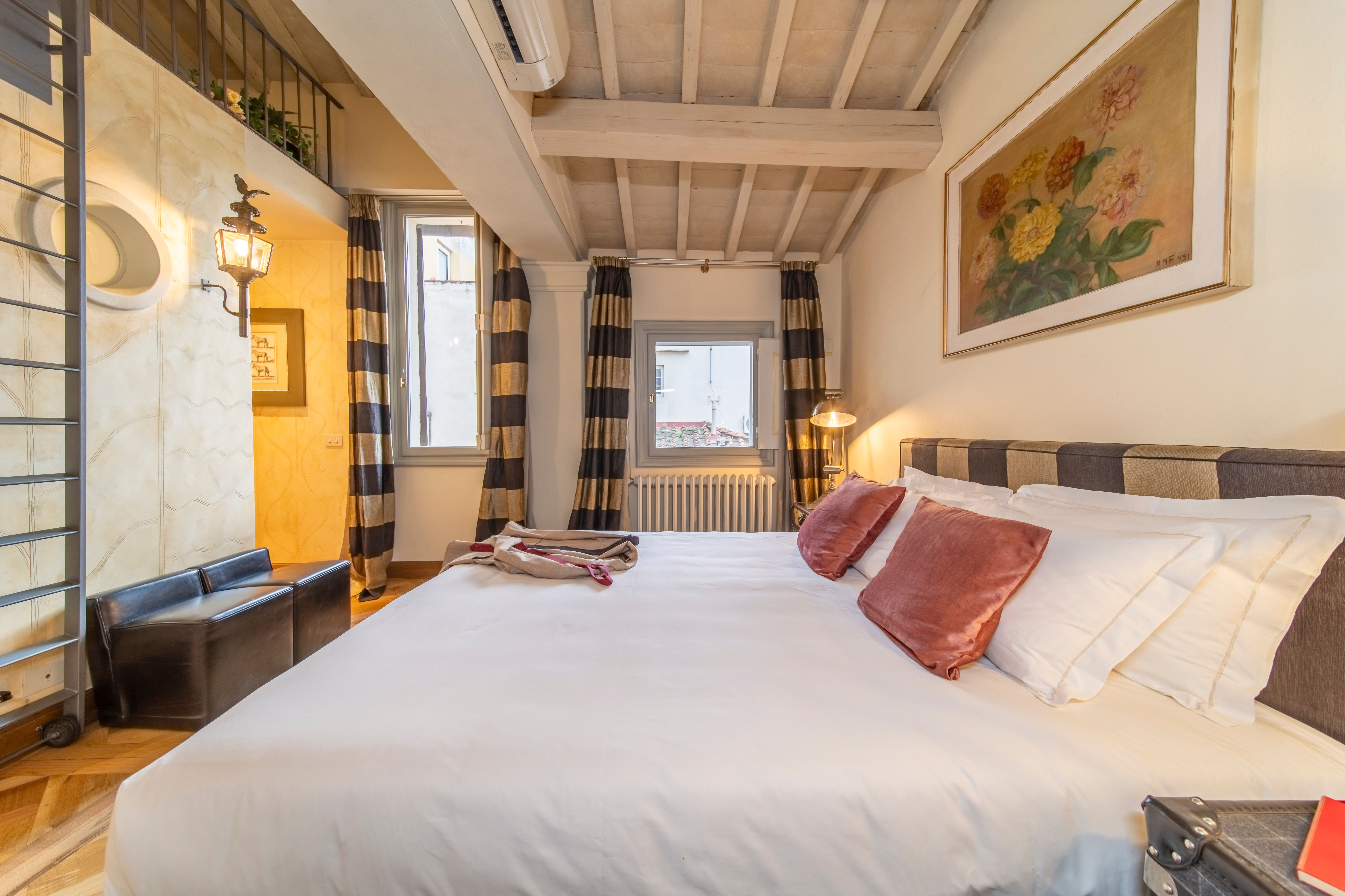 One of Florence’s iconic landmarks, Florence Cathedral, is a few metres from this apartment. A short stroll will also take you to the Uffizi Gallery, Piazza della Signoria, Palazzo Vecchio and Via Tornabuoni with its designer boutiques. There are plenty of eateries on your doorstep, so you may not want to cook at home, but if you do there’s a small kitchenette here. We should also mention that while there’s no formal living room here, there’s an area with seating. The absolute highlight for us though, other than the location, is the glimpses of the Campanile di Giotto from this apartment.