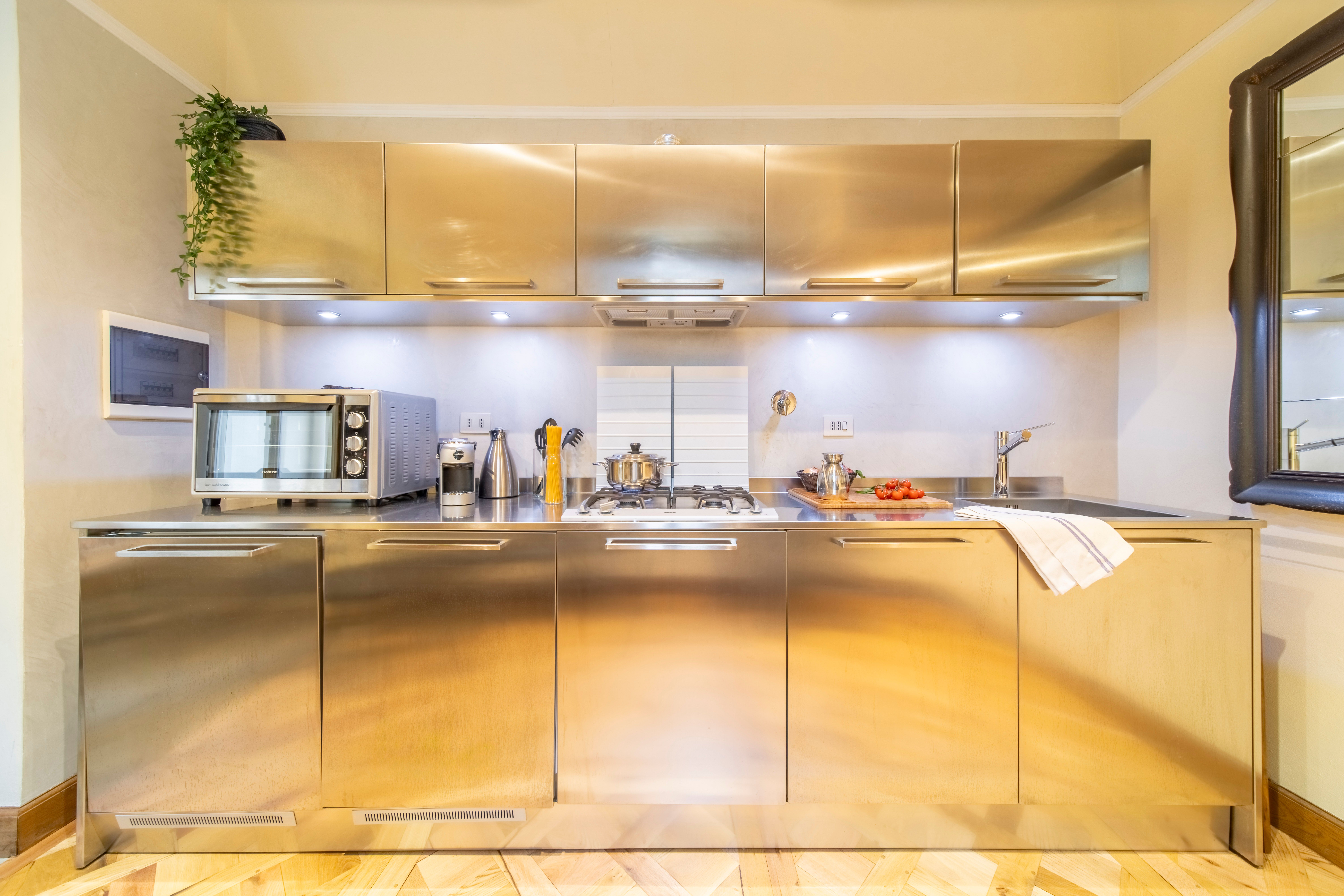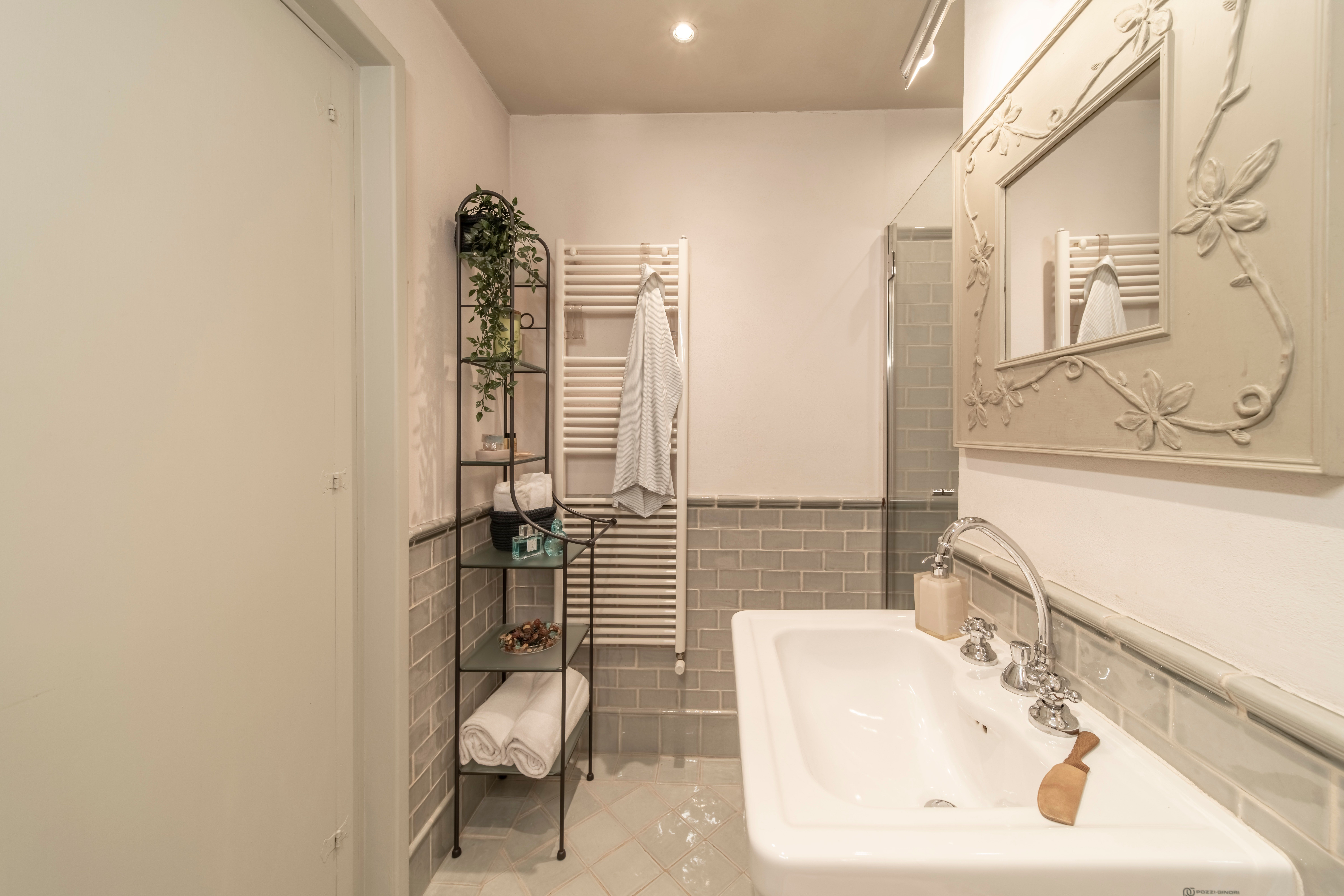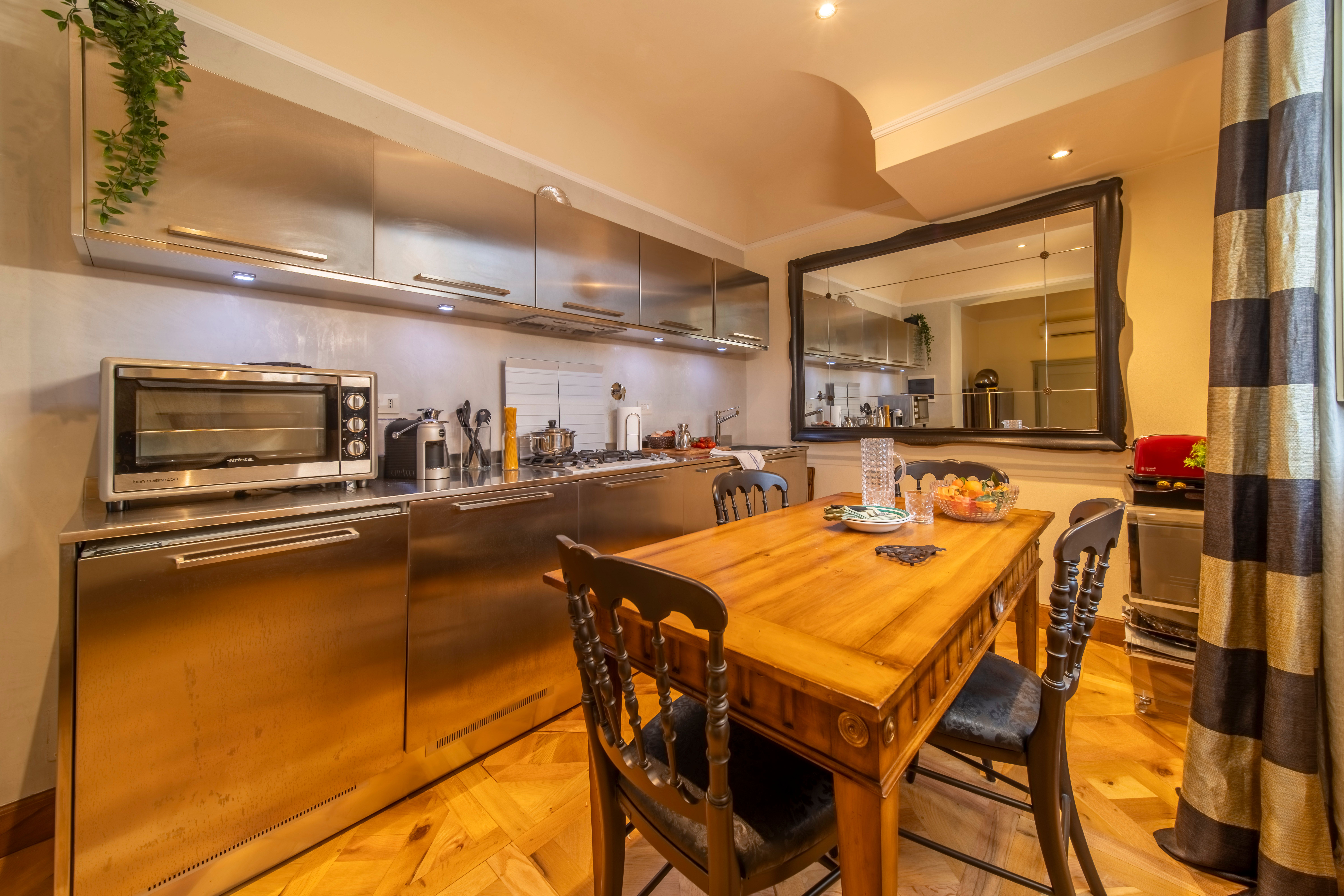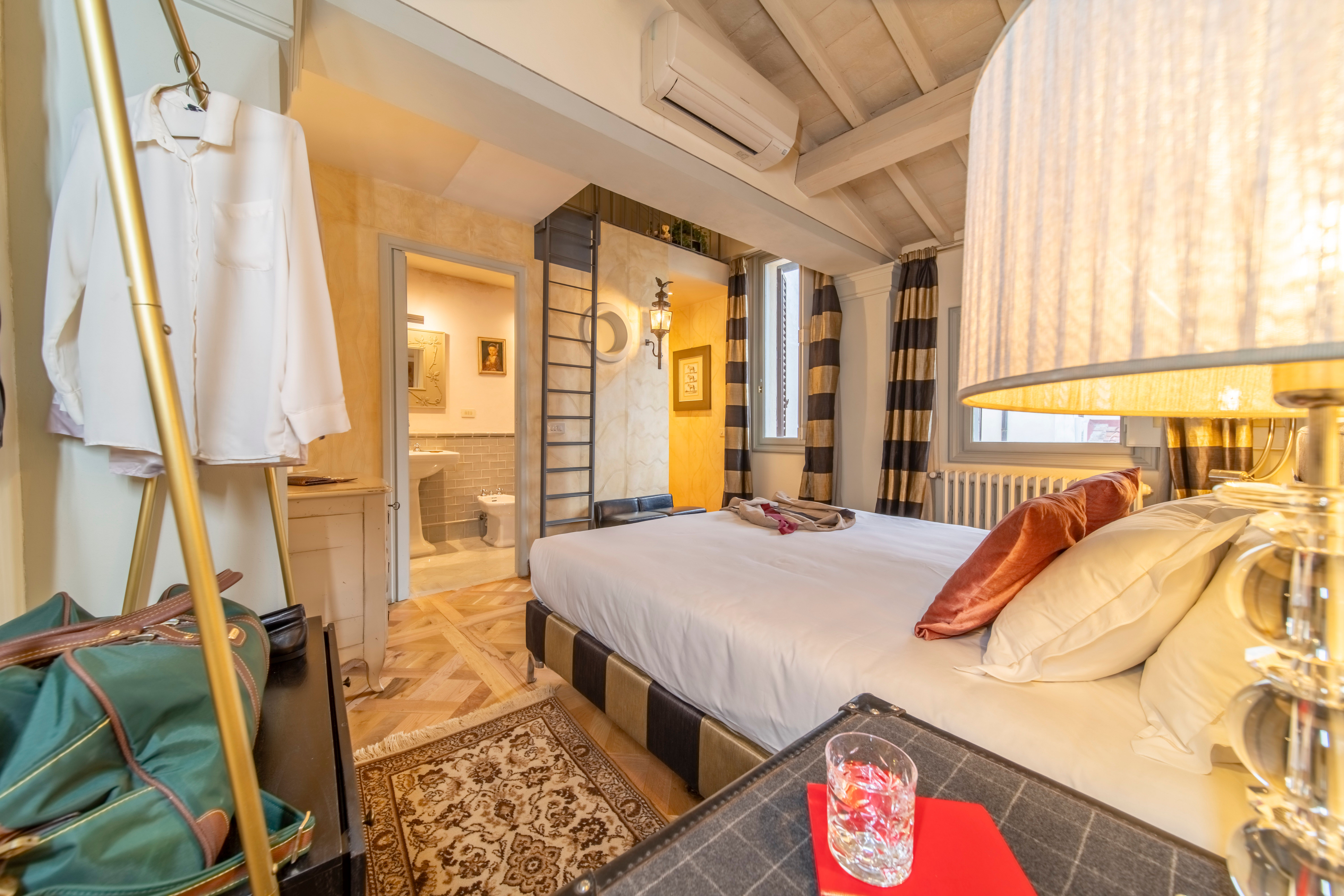 One of Florence’s iconic landmarks, Florence Cathedral, is a few metres from this apartment. A short stroll will also take you to the Uffizi Gallery, Piazza della Signoria, Palazzo Vecchio and Via Tornabuoni with its designer boutiques. There are plenty of eateries on your doorstep, so you may not want to cook at home, but if you do there’s a small kitchenette here. We should also mention that while there’s no formal living room here, there’s an area with seating. The absolute highlight for us though, other than the location, is the glimpses of the Campanile di Giotto from this apartment.