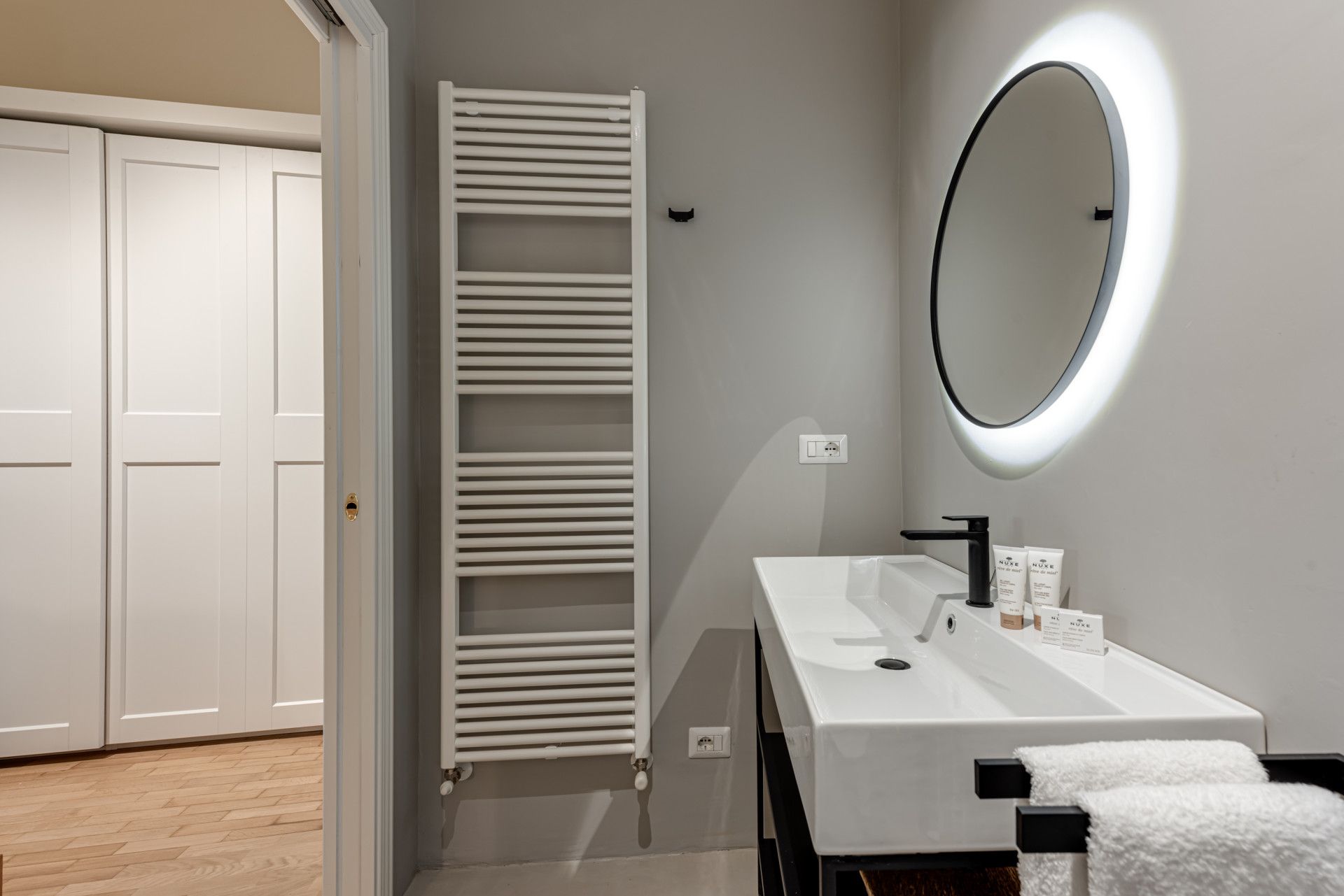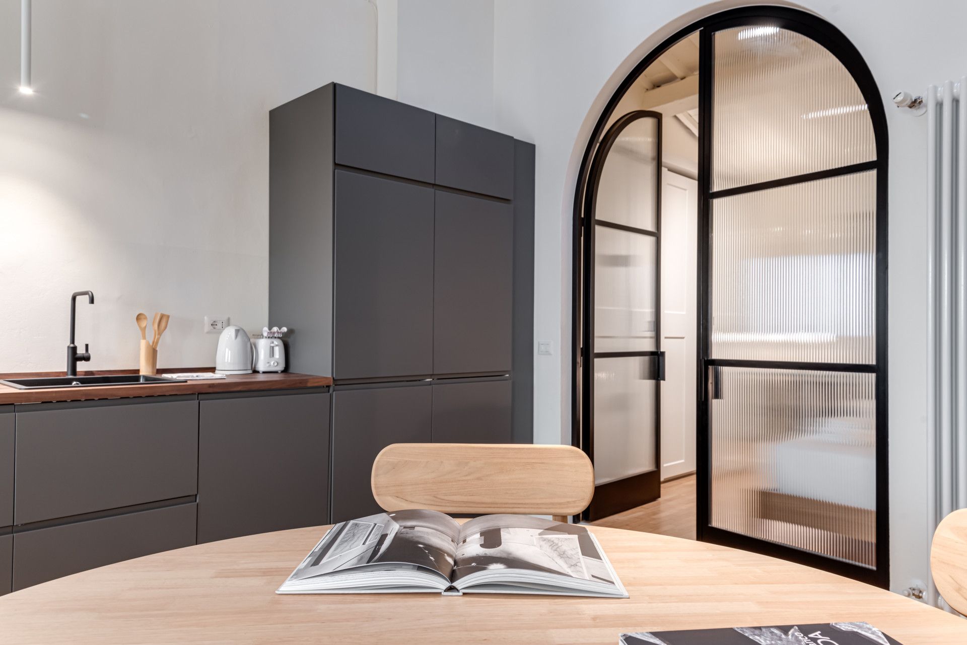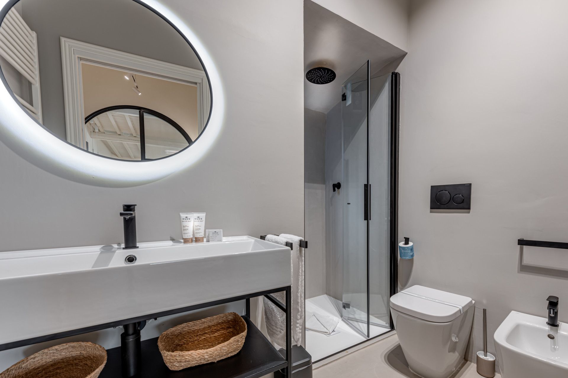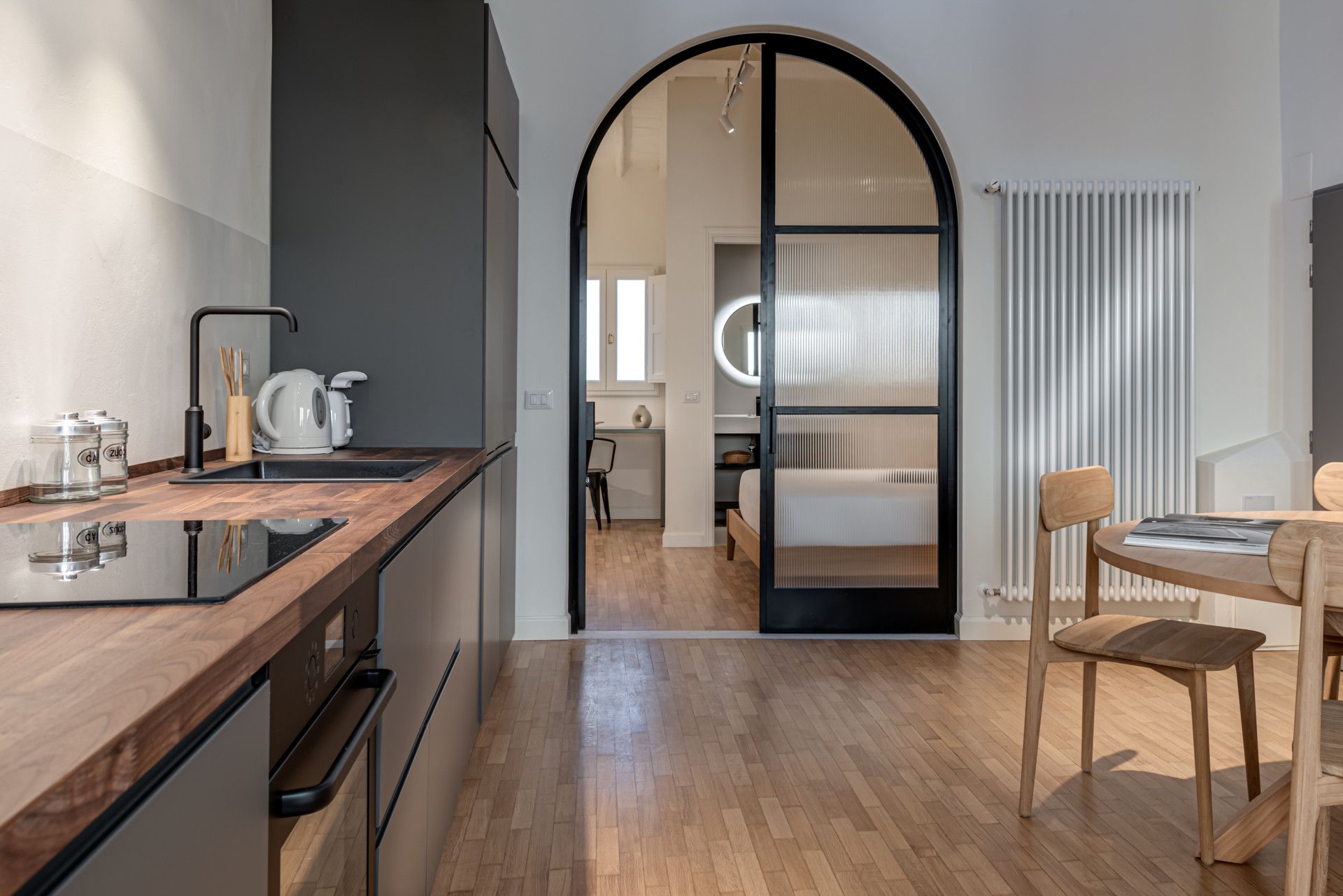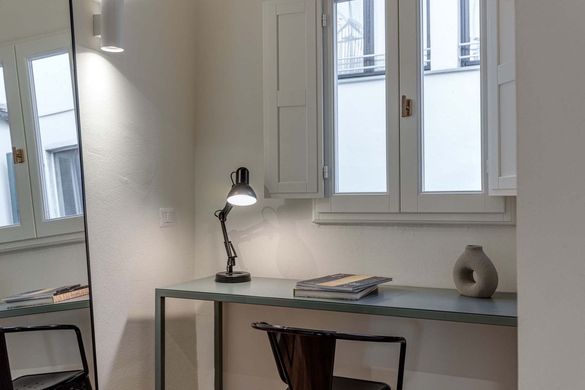 Set on one of the oldest streets in Florence’s historic centre, this apartment is perfect for exploring the city. Step outside and you’re moments from the bustling Piazza Goldoni and just a two-minute walk from the famous Ponte alla Carraia. Inside, you’ll spot traces of the building’s history, from high-beamed ceilings to arched doorways, but everything feels fresh and modern. The bedroom overlooks a quiet internal courtyard and has a small desk if you need to work during your stay.