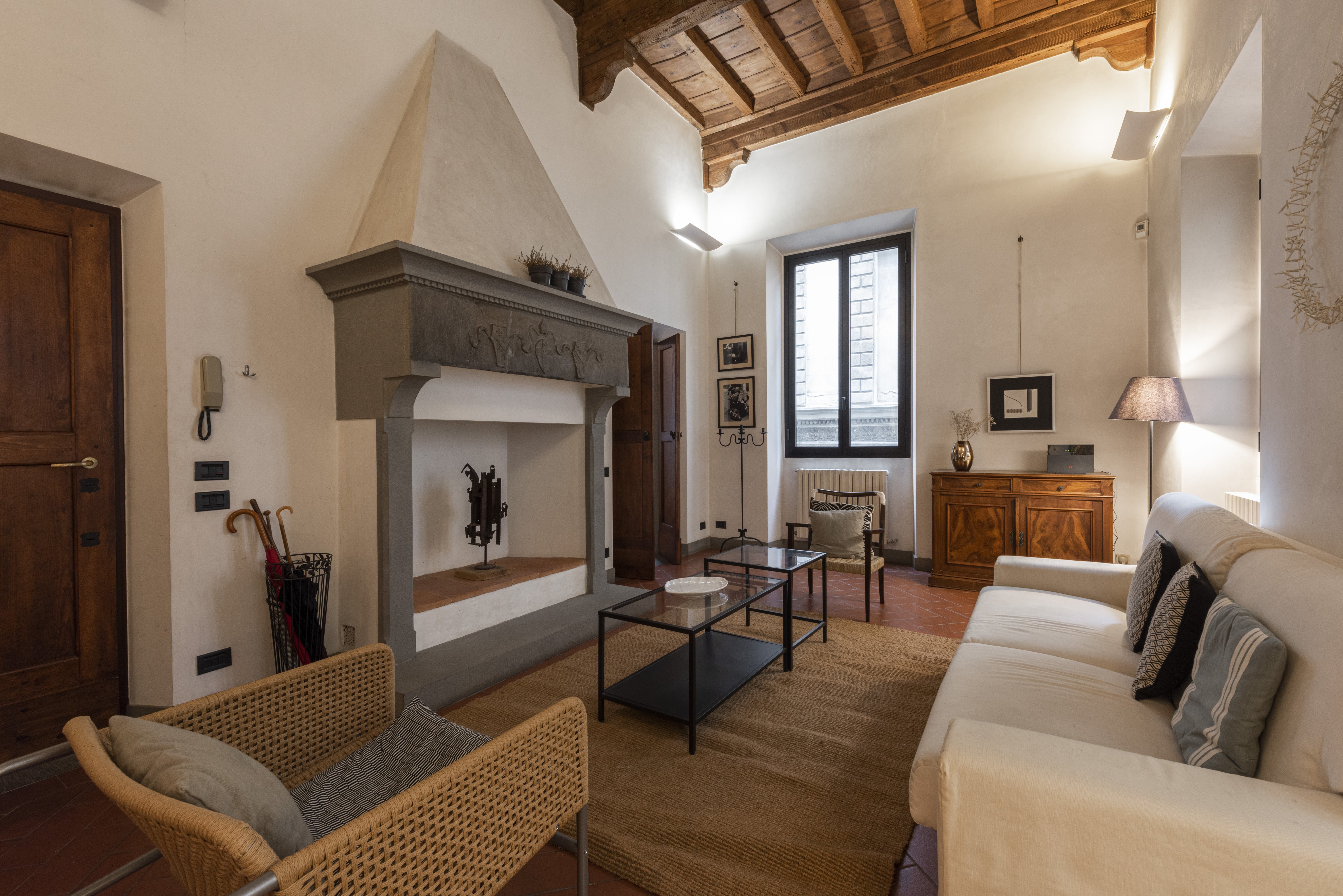 There’s a definite air of Old World elegance here, with the large living area boasting tall beamed ceilings and a decorative hearth that recalls the building’s rich history. Terracotta tiled floors add to the traditional Italian charm, and the contemporary decor fits seamlessly with its surroundings, creating the perfect balance of rustic and modern.
