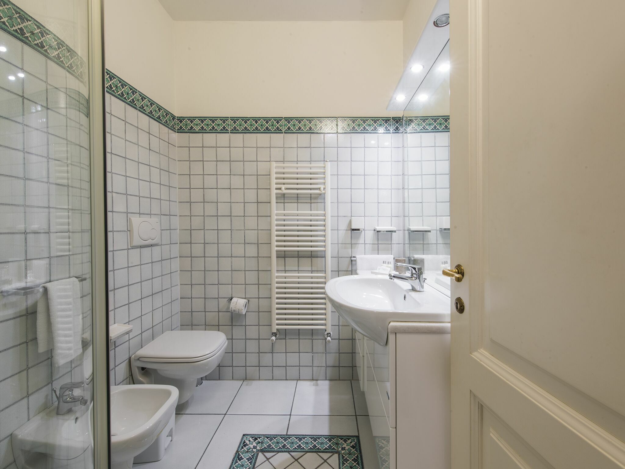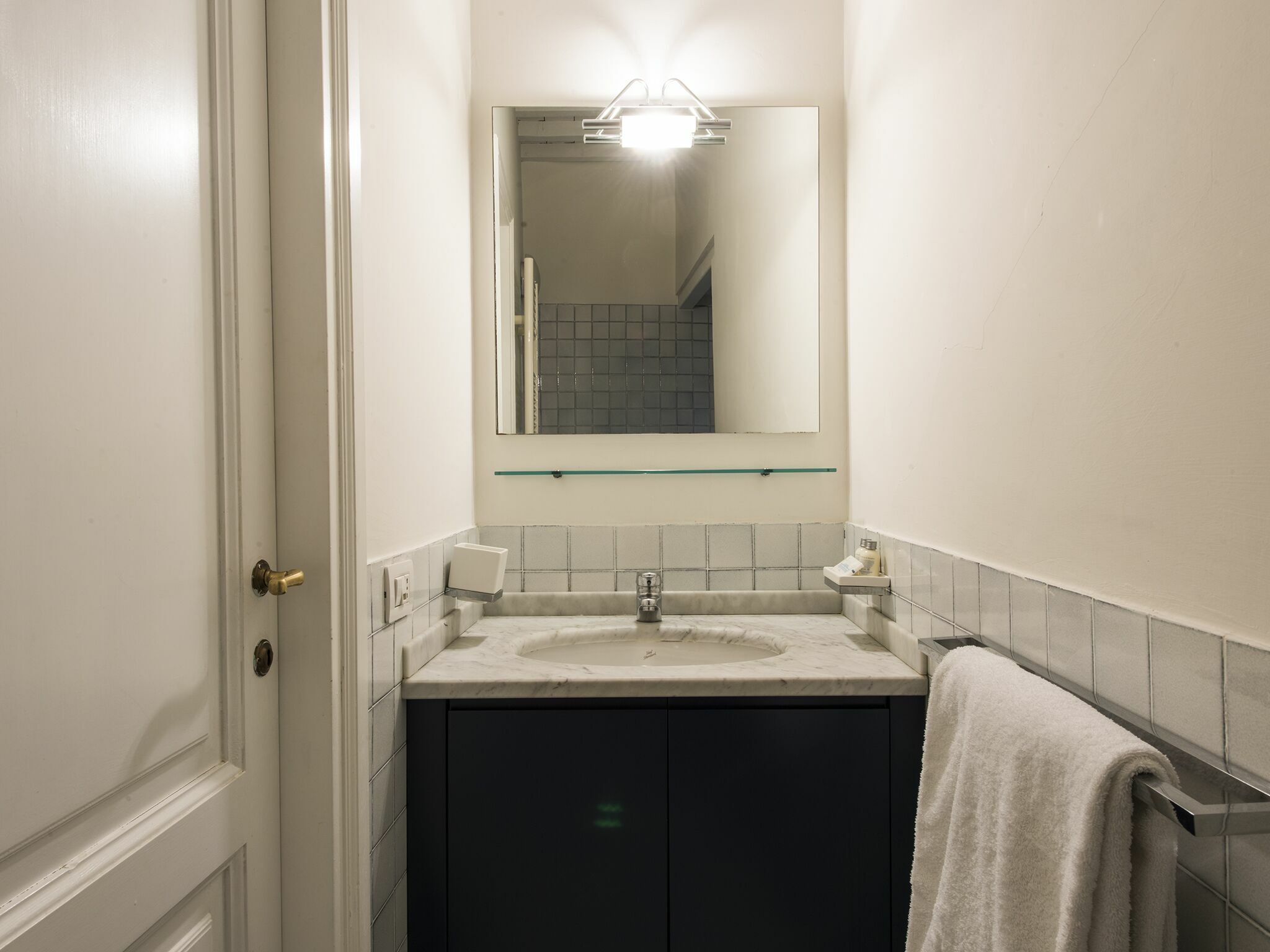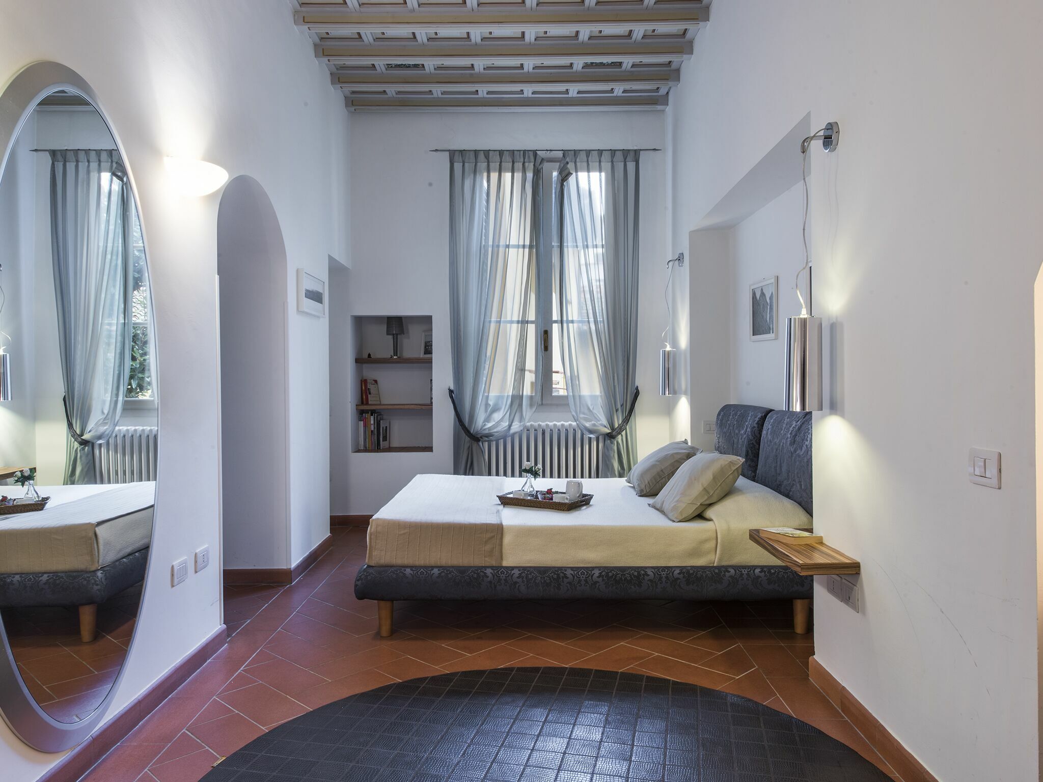 Follow these elegant tiles through to your bedroom, where the French window's curtains are just sheer enough to allow a sneak peek of the historic surrounding blocks. Is it time for a glass of prosecco yet?