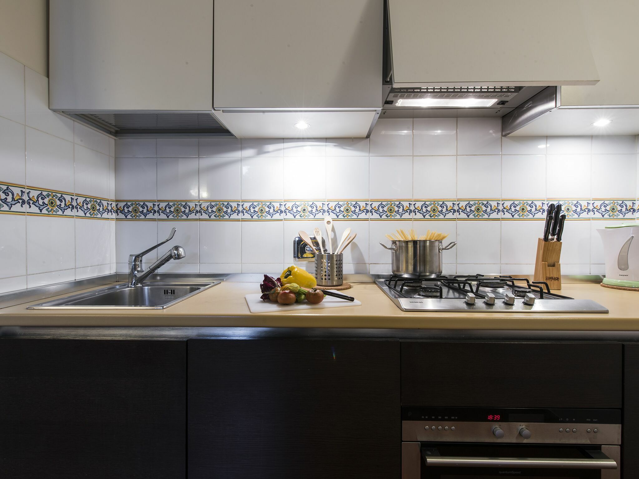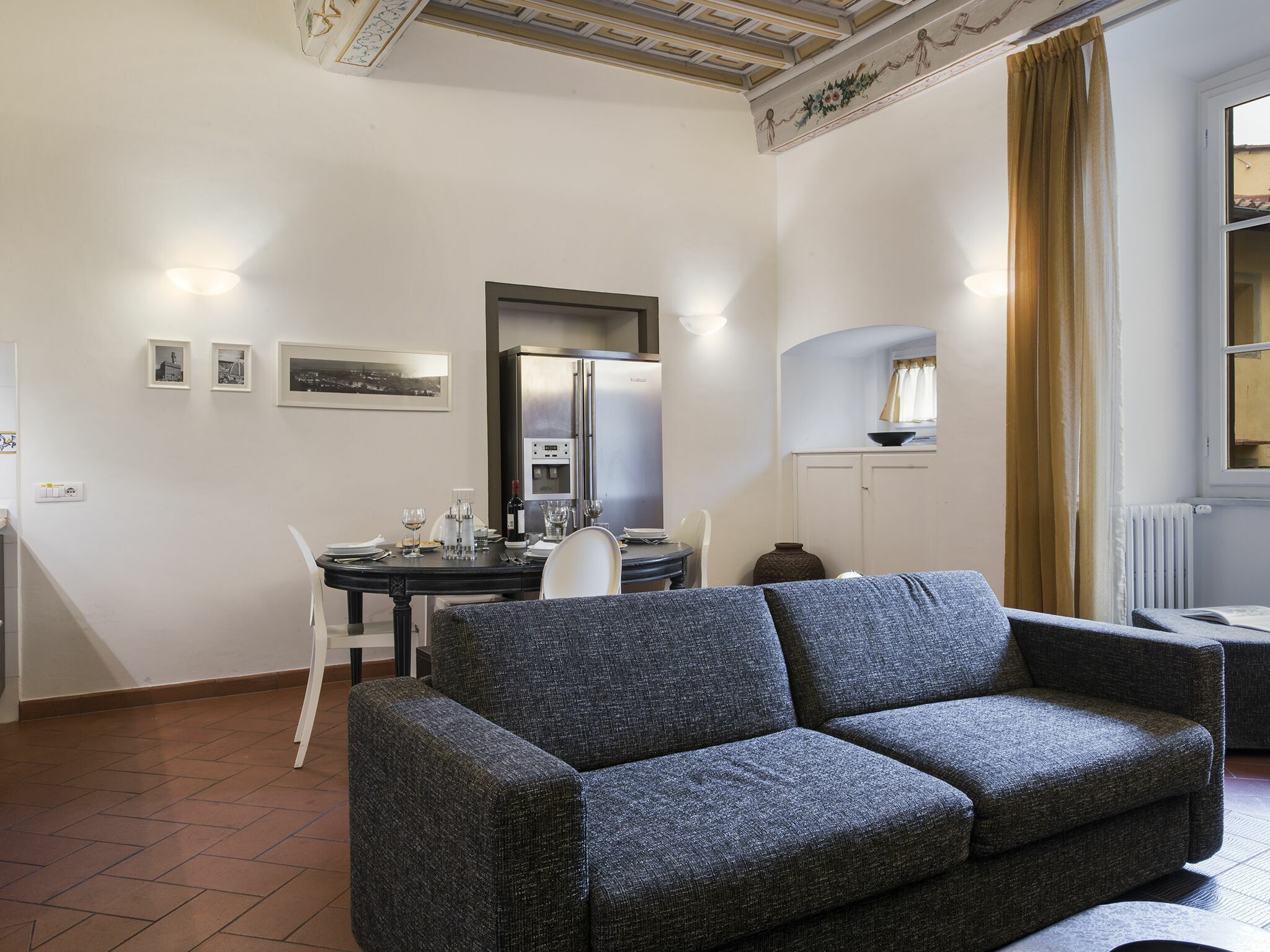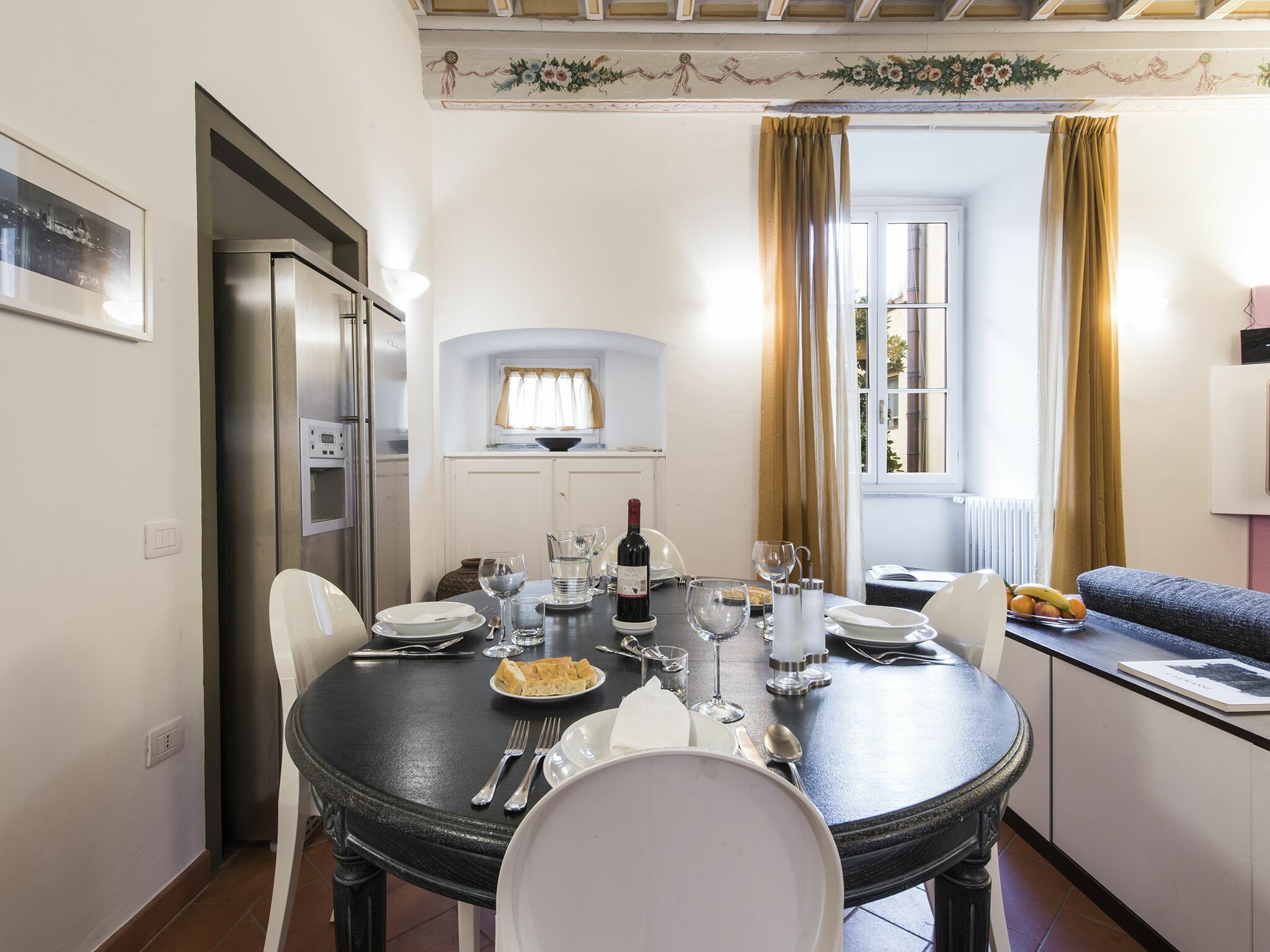 We love the floral motifs painted on the wooden beams and frames, which match beautifully with kitchen wall tiles, and even a frosted mirror. This delicate floral theme shines through in contrast to black, modern, understated ornaments. Then fabulous terracotta floors take us away from the present day and back into a rustic Florentine era.