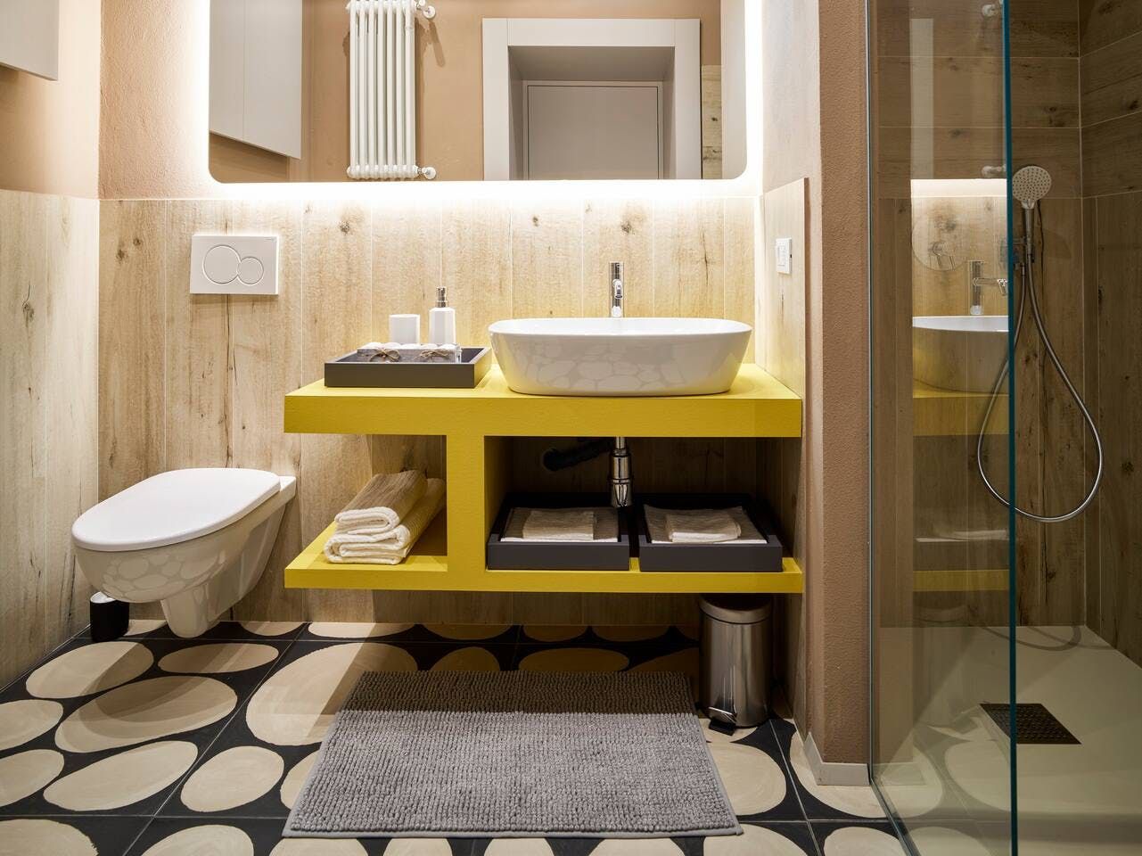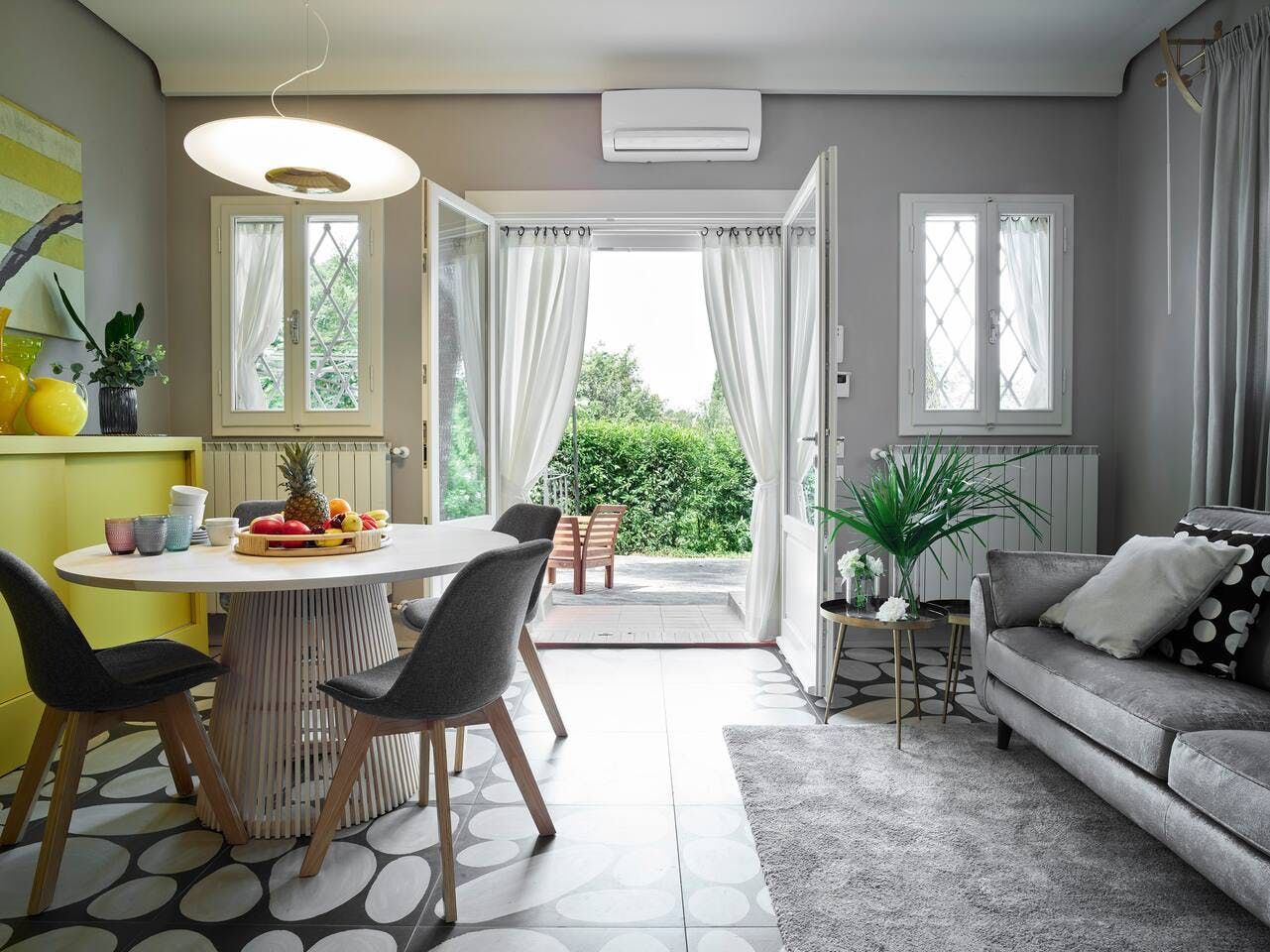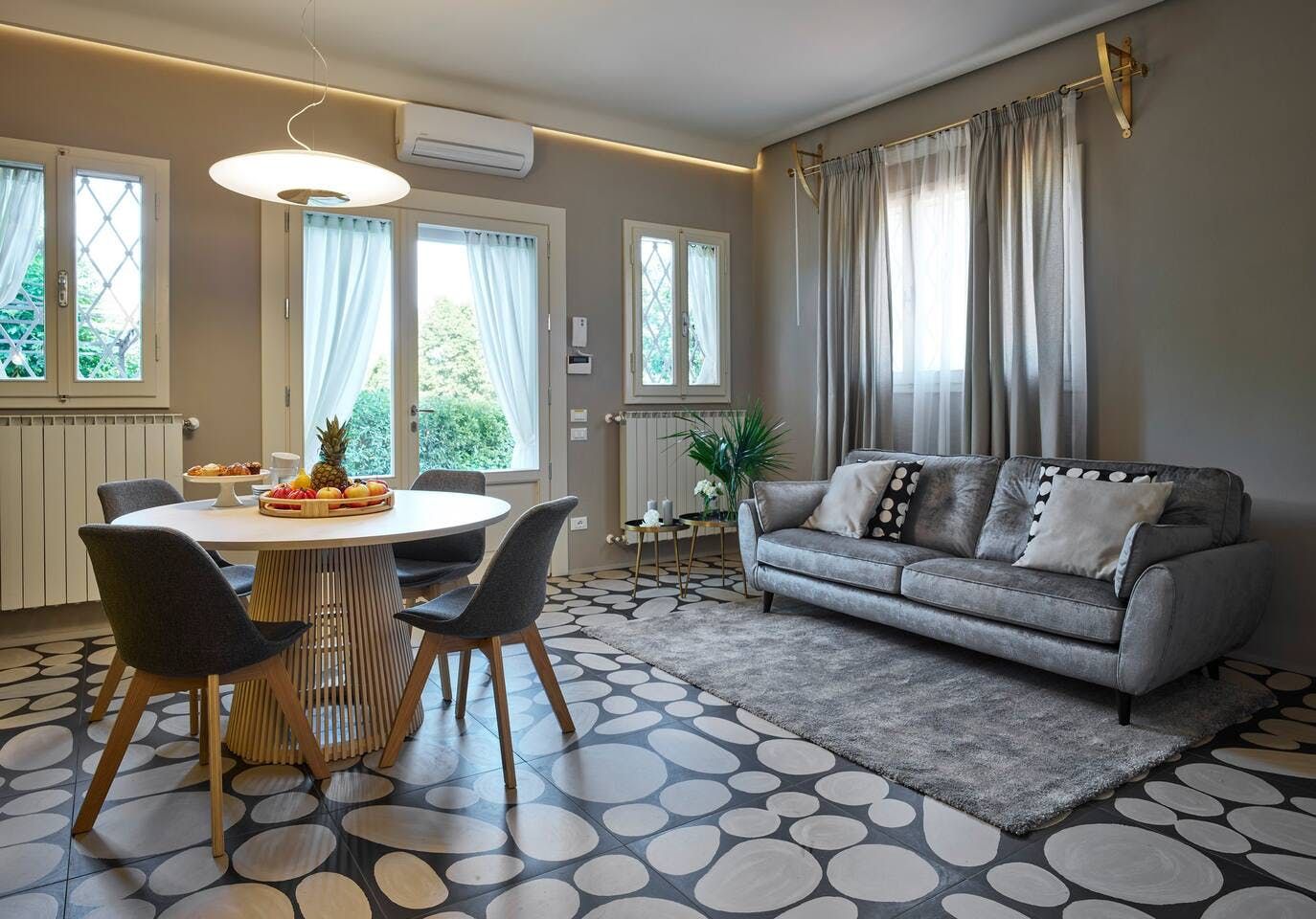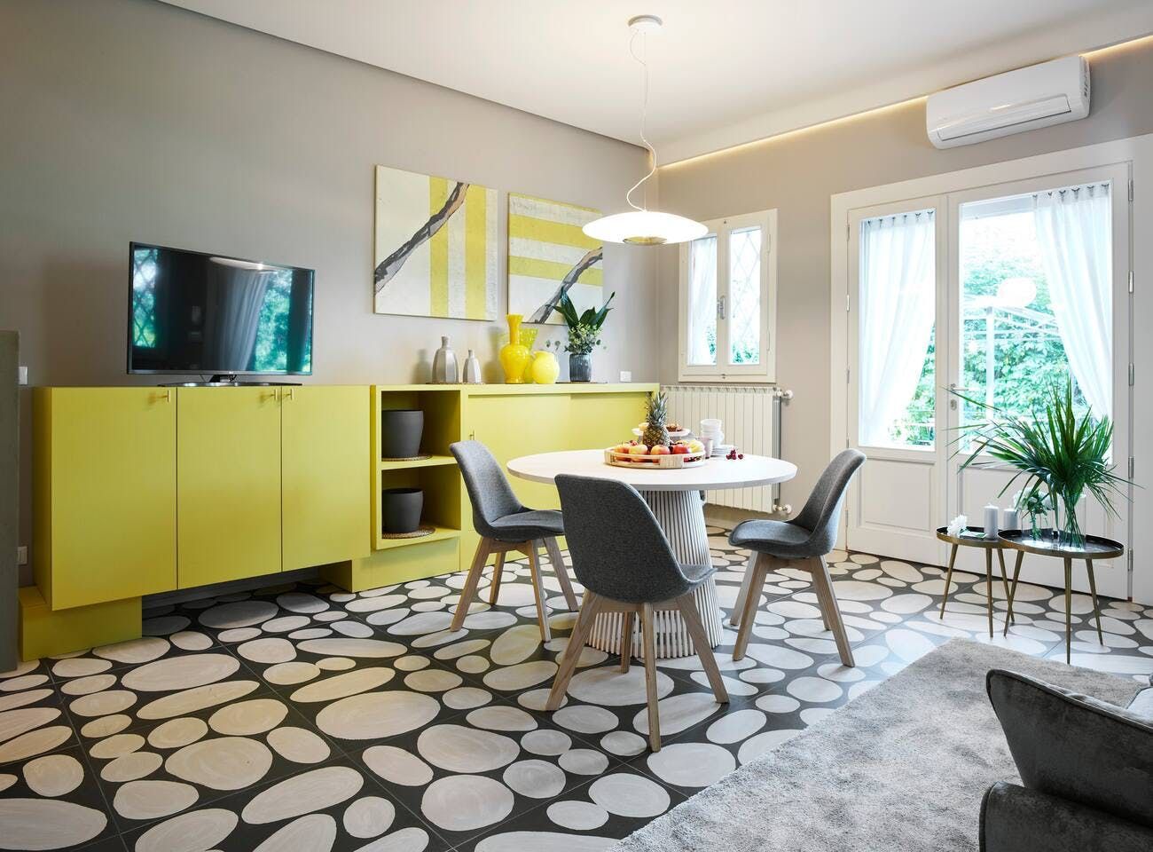 In contrast to this home's traditional façade with its pretty shutters – the inside draws inspiration from the 70s with its sunny yellows and retro furniture. We love the funky monochrome floors here. Outside, in the stylish, private garden, you'll find sun loungers, as well as a hot tub – perfect for watching the sunset with a glass of Prosecco, then enjoy dinner under the lights of the gazebo. This home has a fantastic location in one of Florence's most sought-after residential areas. Piazzale Michelangelo, a sixteen-minute stroll away, is situated on a hill on the south bank of the Arno River – it has stunning vistas of the city and a bronze replica of Michelangelo's David. Accademia Gallery, which displays the actual statue, as well as Botticelli's Madonna and Child, is a twenty-minute saunter, while the Ponte Vecchio and Palazzo Pitti are both under a thirty-minute walk.