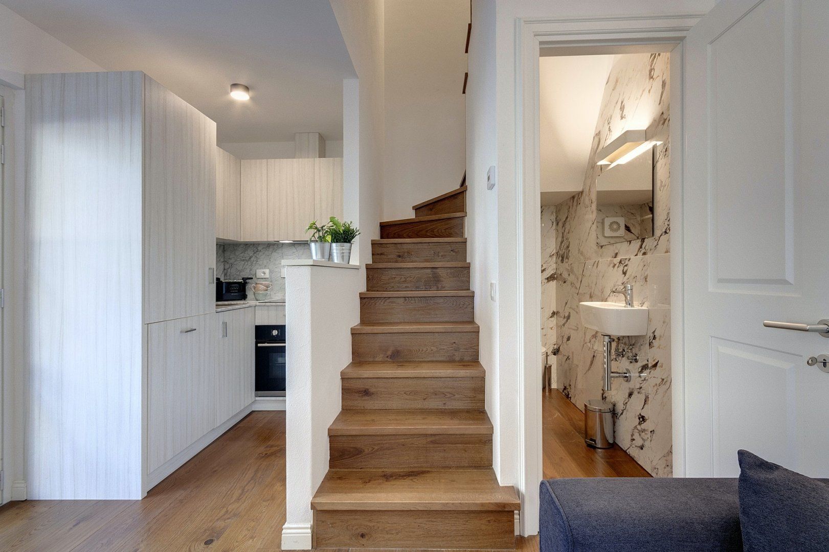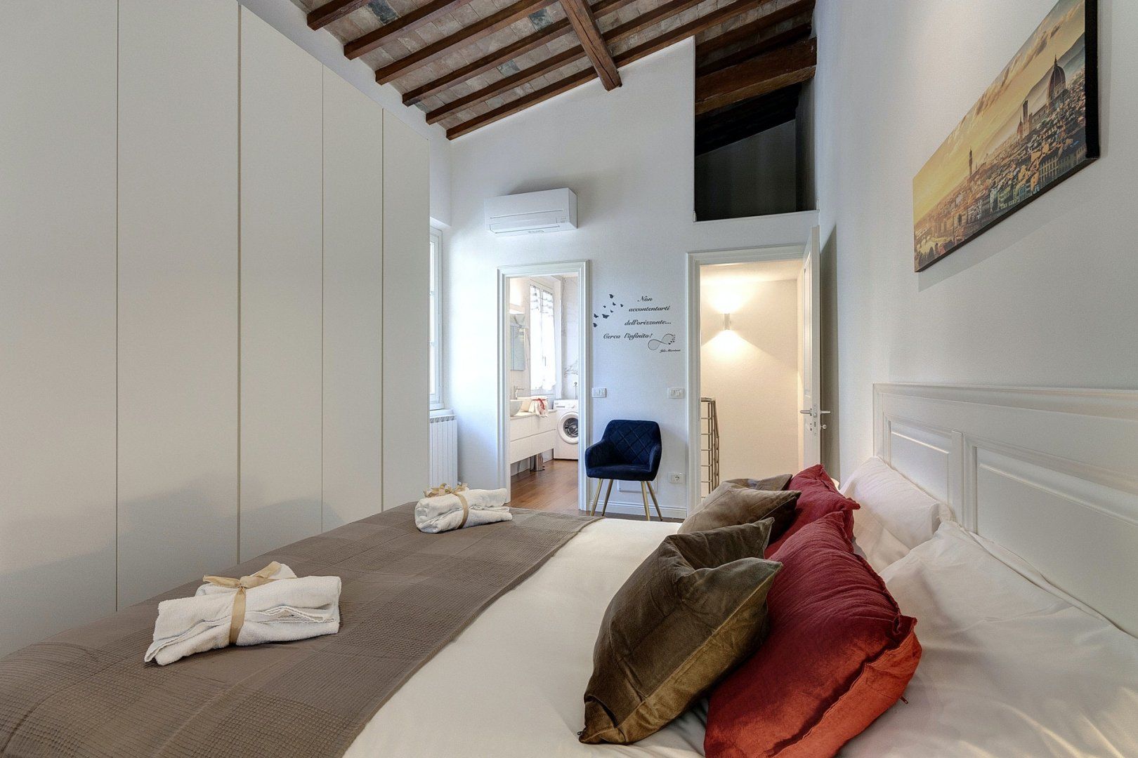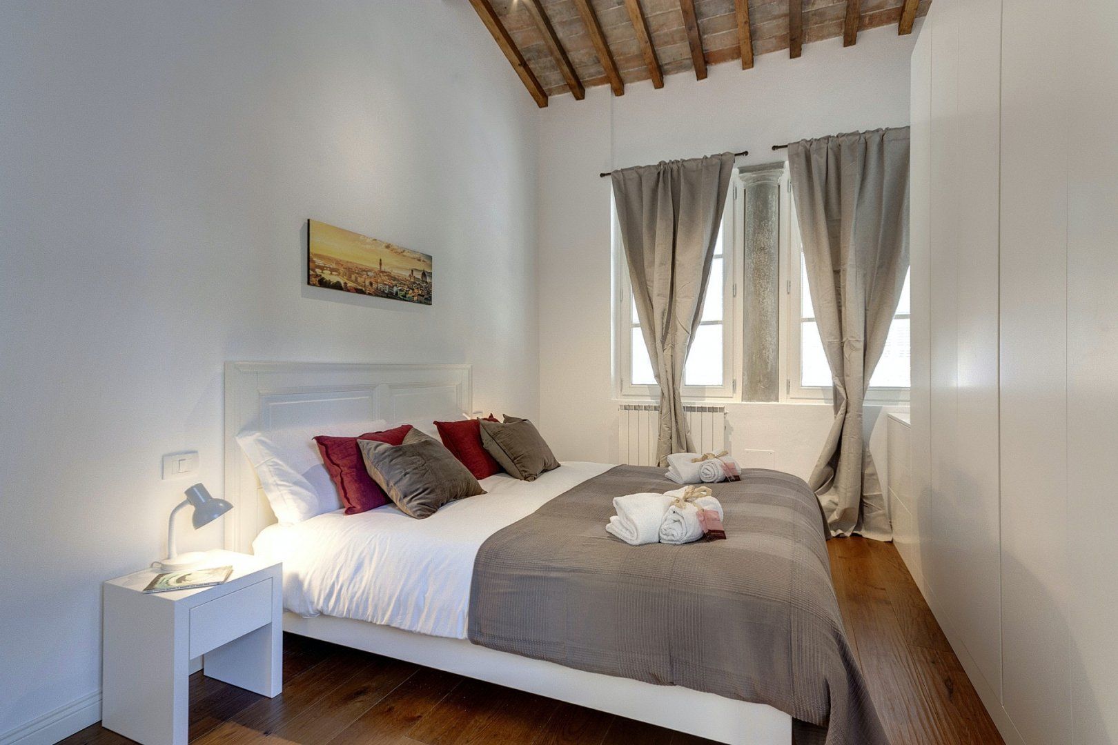 Upstairs, the bedroom is cosy and comfortable. The original ceiling beams have been retained through renovations, which adds warmth and a touch of history – fitting for Florence, a city with such a rich past.