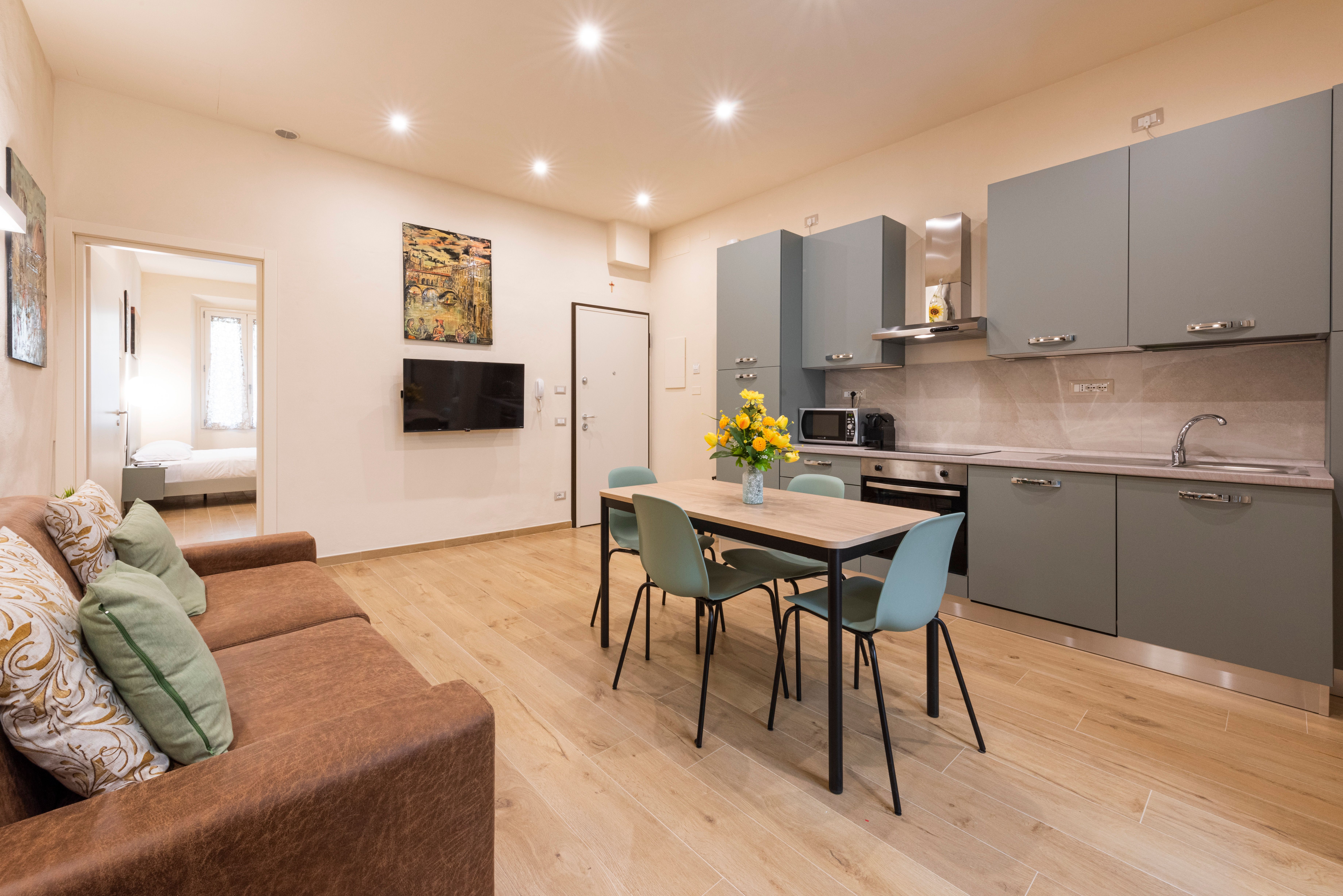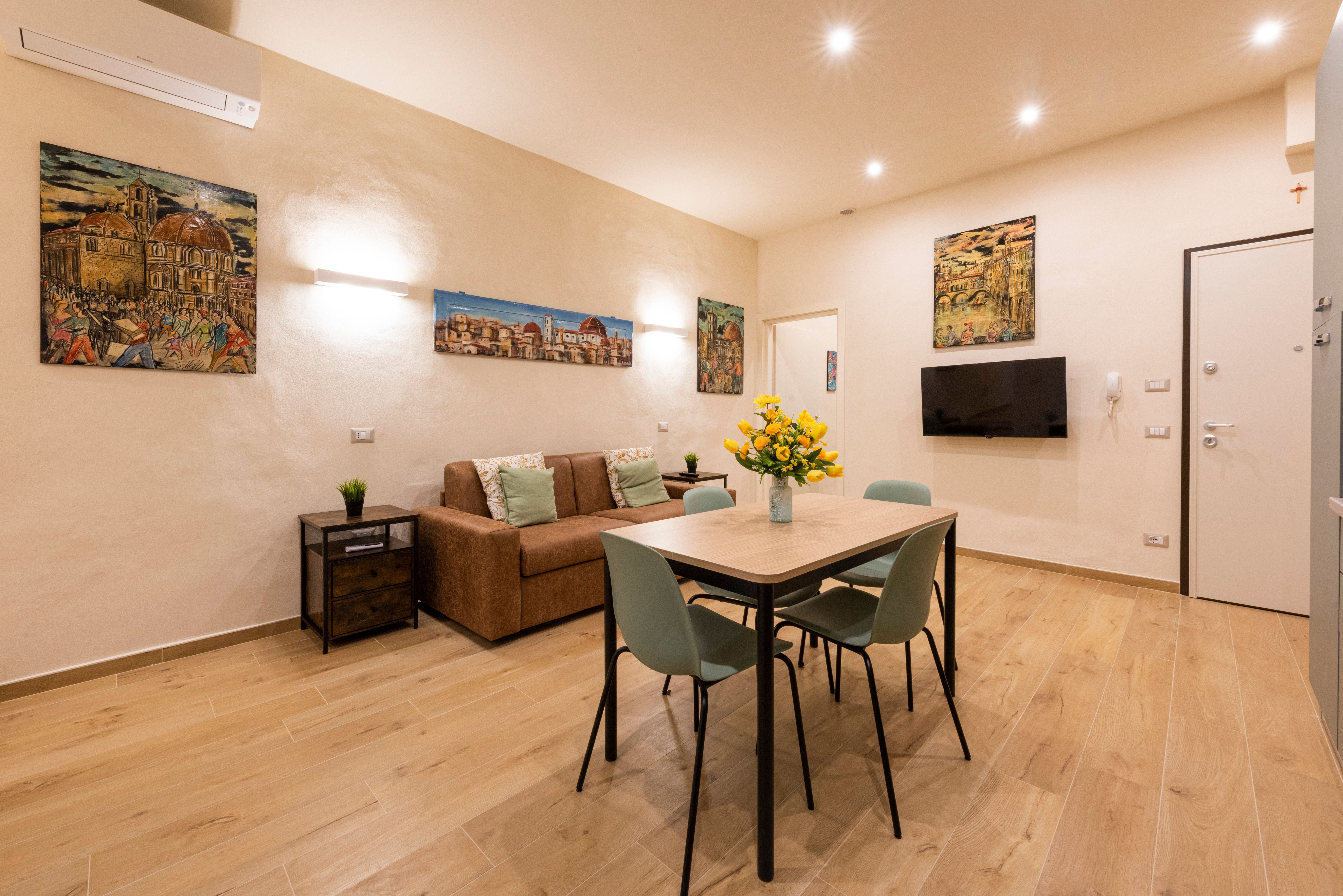 Central and attractive, this apartment is a wonderful choice of home-from-home in Florence. Style-wise, it’s simple and fuss-free, a calm and relaxing space to return to after busy days in the city. With six guests staying here, two will sleep on a sofa bed in the living and dining space – so for more space for socialising, we’d stick to a maximum guest count of four. The apartment looks out over Mercato Centrale, a fabulous meeting spot with restaurants, local eateries, and fruit and veg sellers. You’ll also be a short walk from the Duomo and only 600 metres from Santa Maria Novella station.