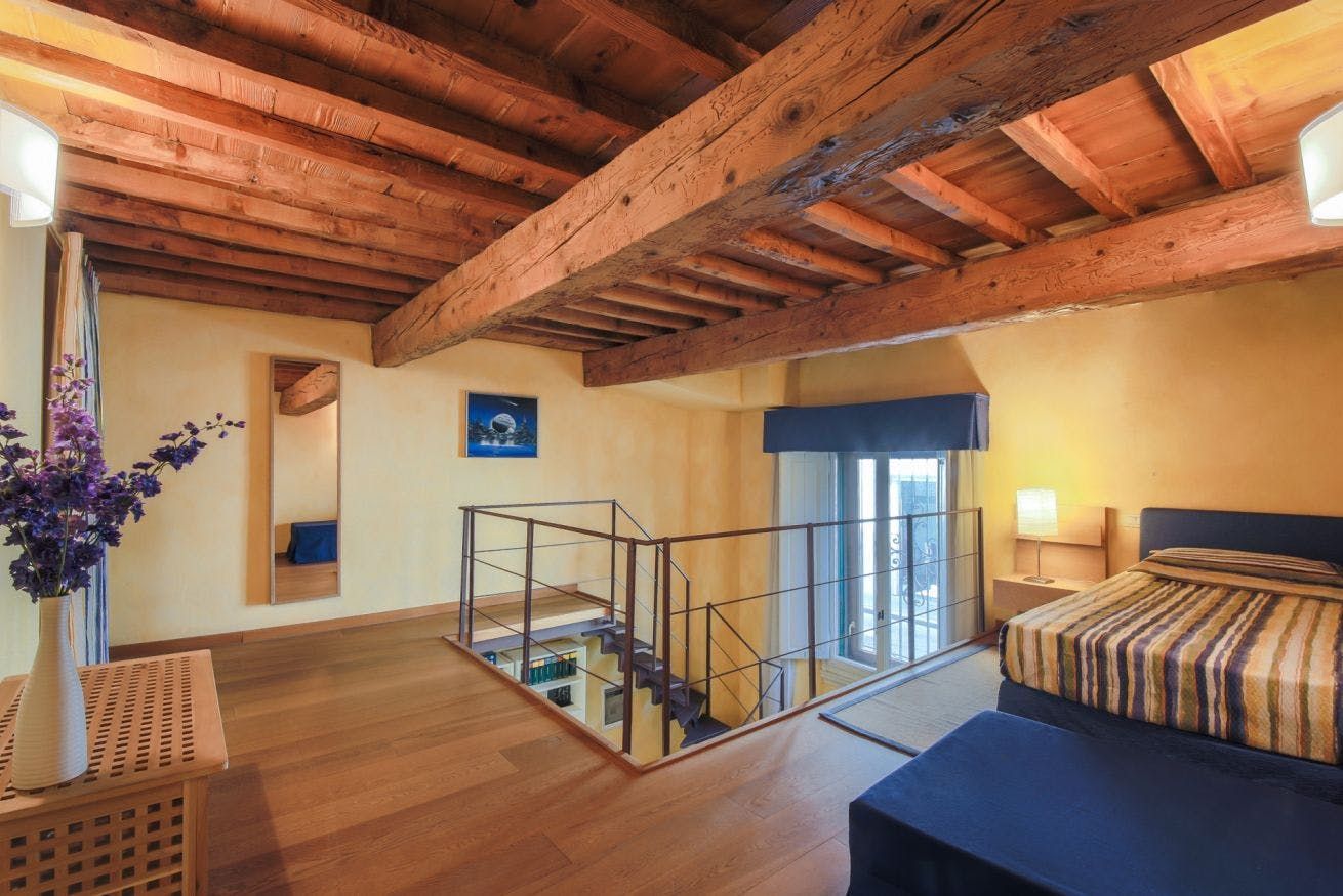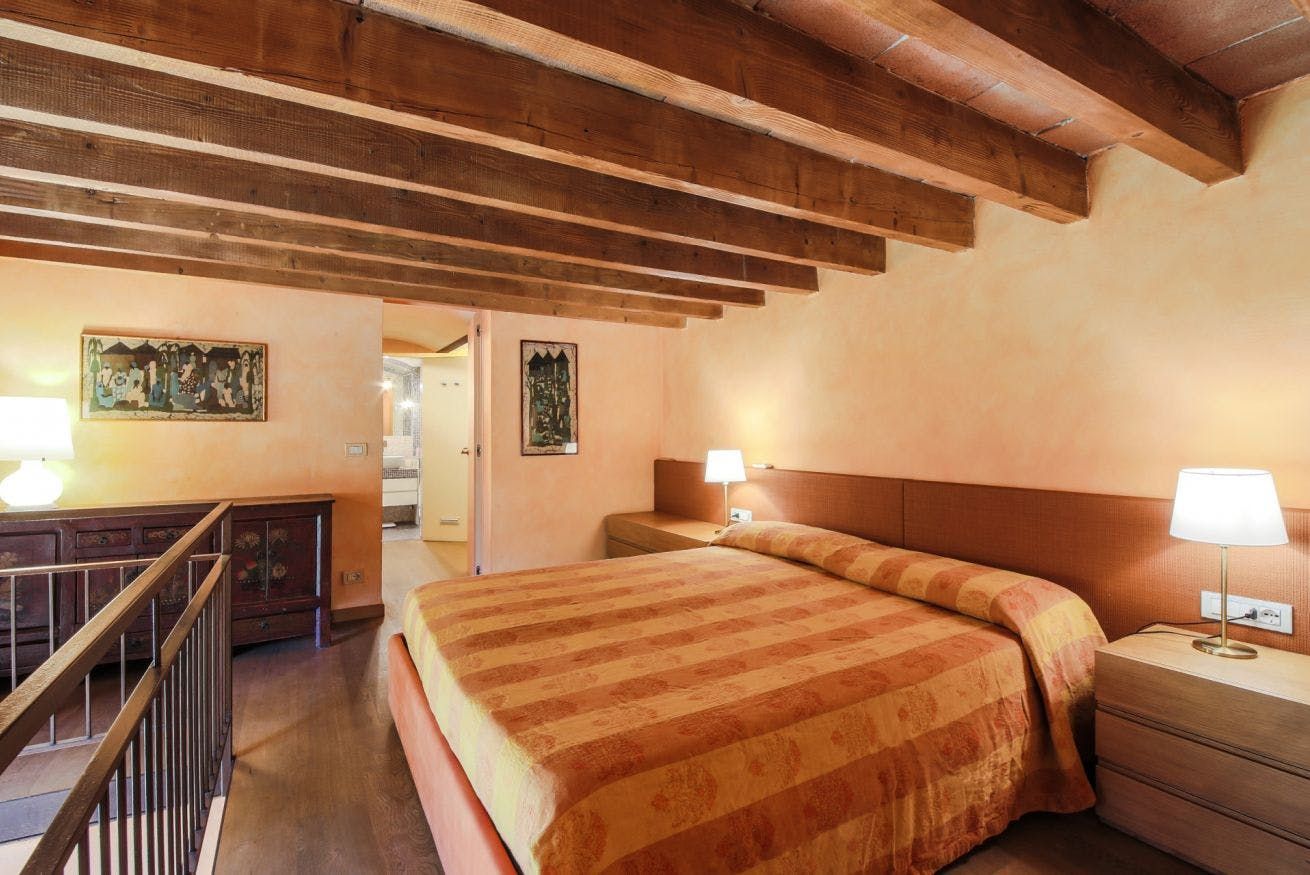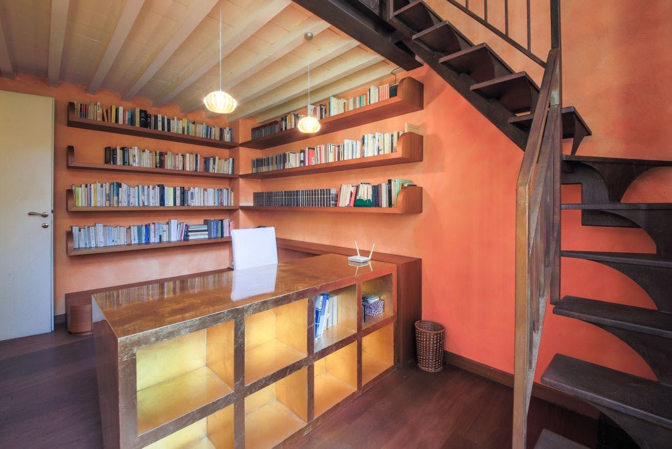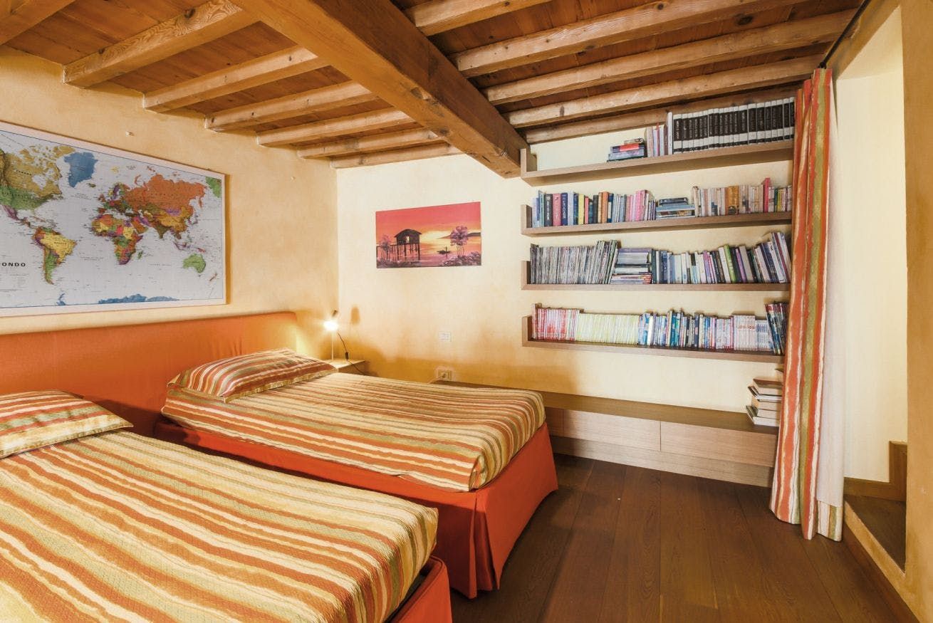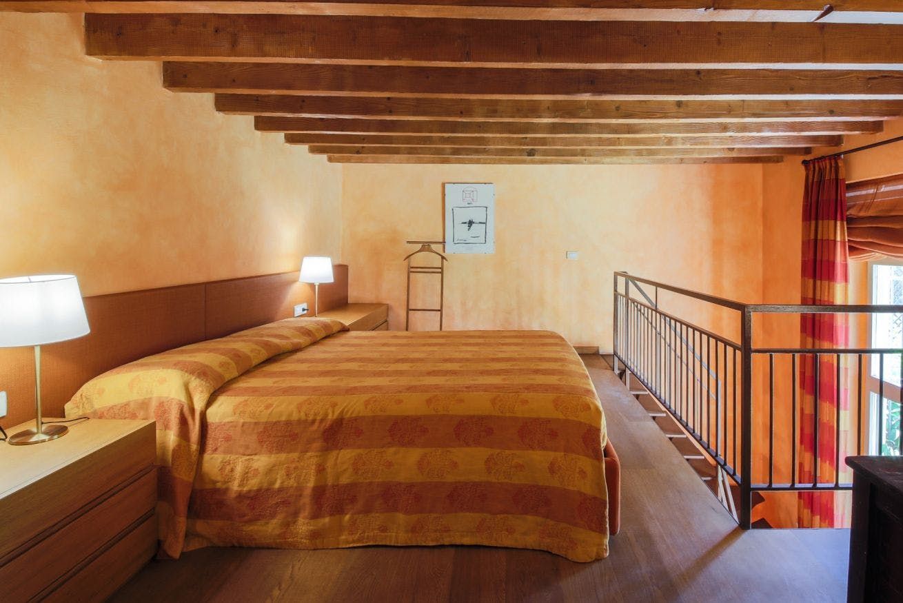 The home itself is typically Tuscan in style and you'll be able to spot several period features, including capitellos on the top of columns, wooden ceiling beams and a rather ornately designed door. There's a real air of palatial glamour to the tall living room, particularly with the marble fireplace and upright piano. In the other spaces, the architect has cleverly made use of the plentiful headroom by adding a mezzanine, which houses many of the beds.