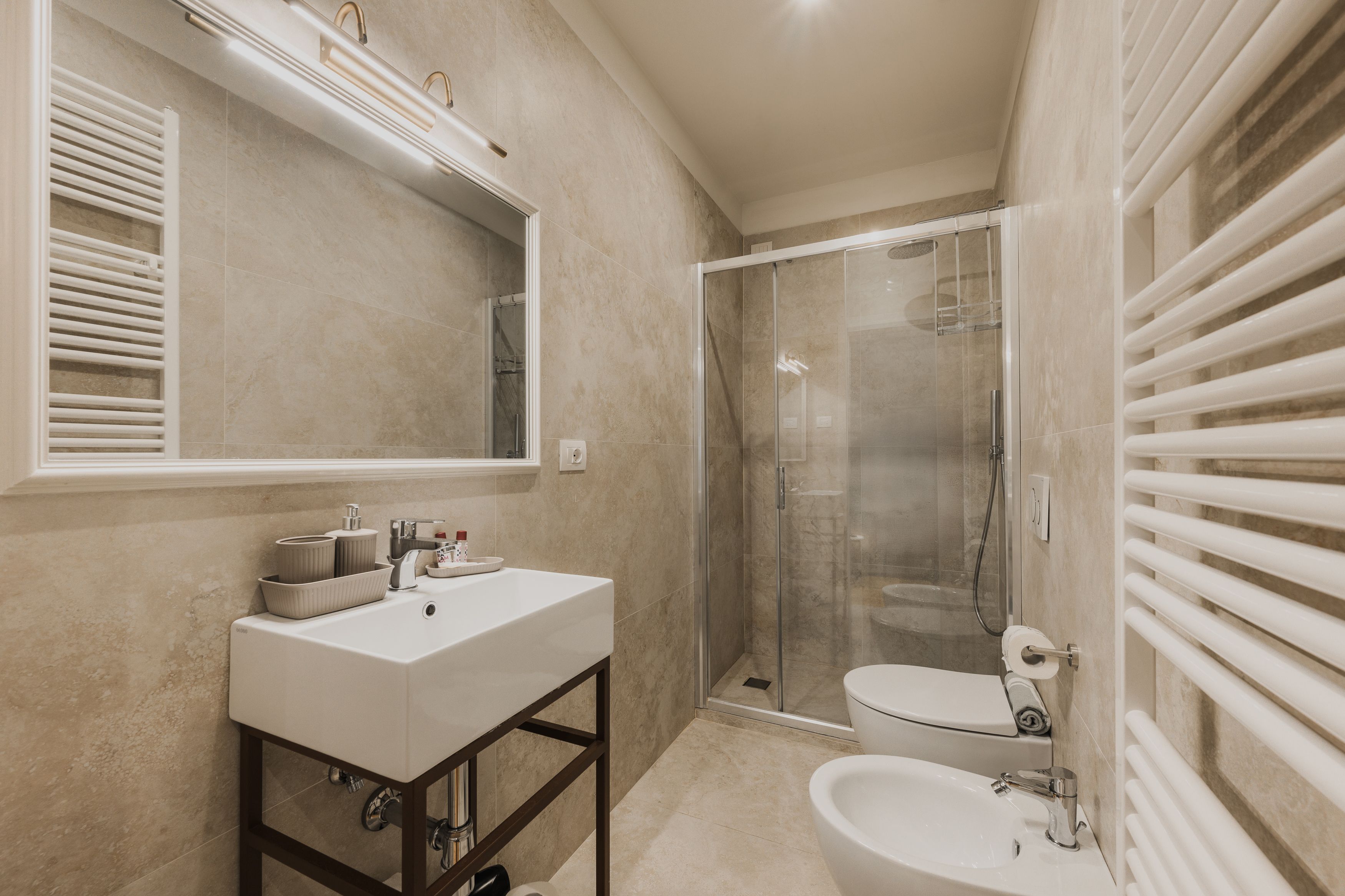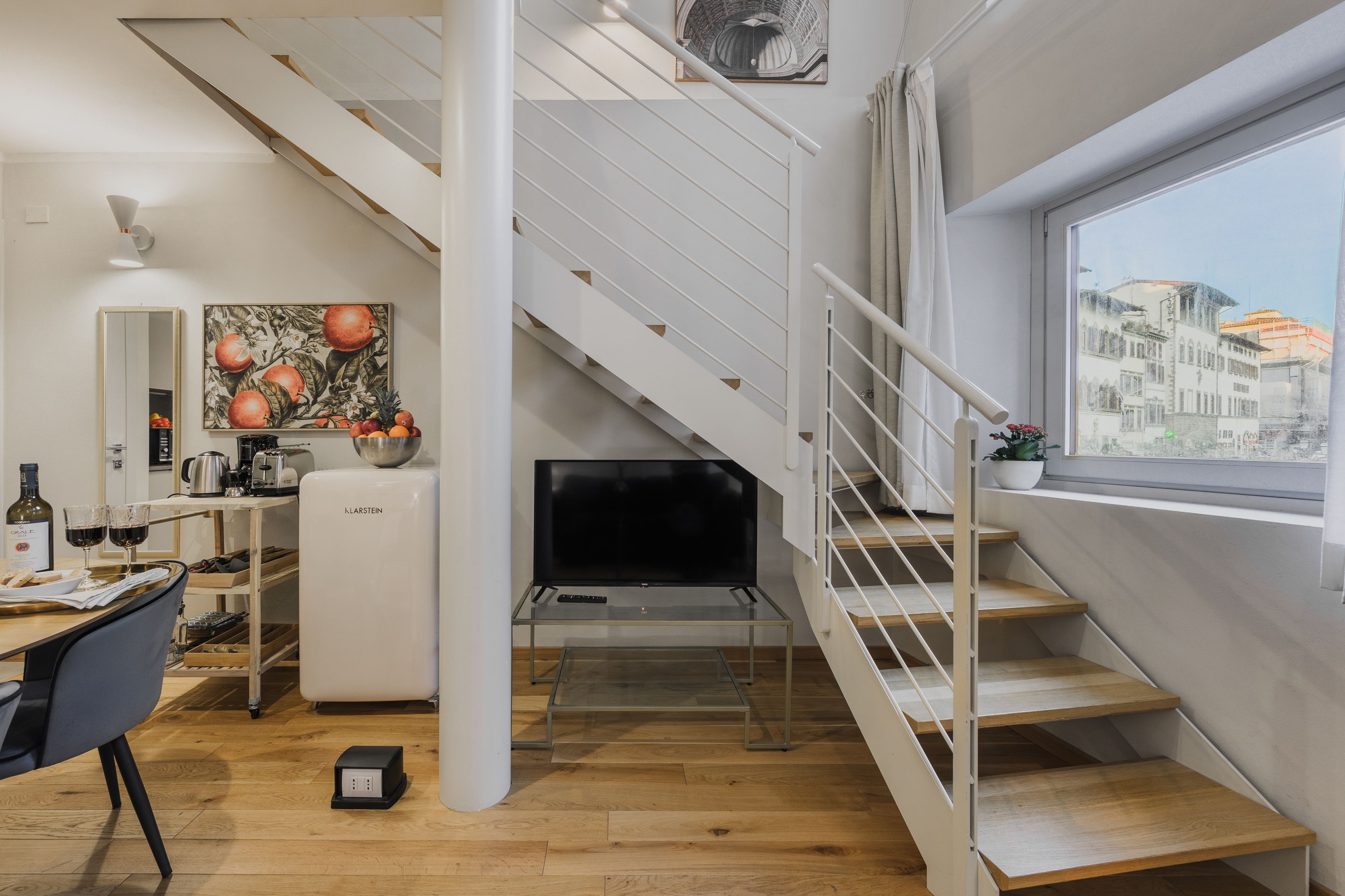 An excellent choice for a couple or single traveller, the bedroom is perched on a mezzanine level with a smart, glass partition allowing you to make the most of those views of Basilica di San Lorenzo seen right through your window. Best savoured from bed with a freshly brewed coffee, we say.