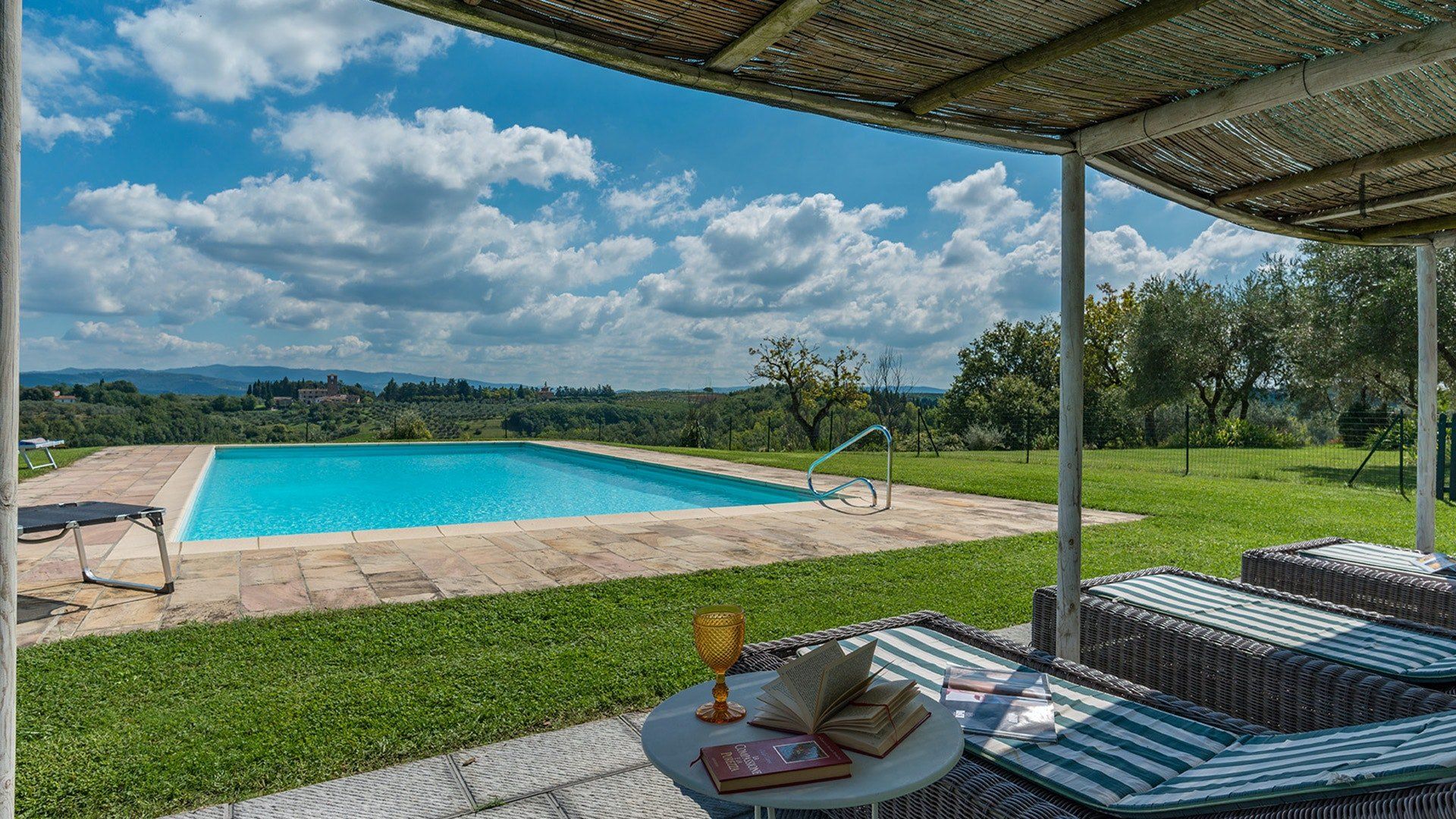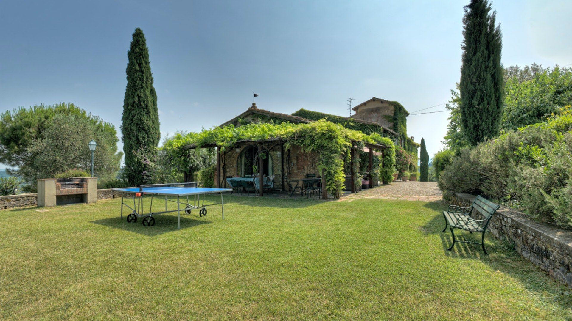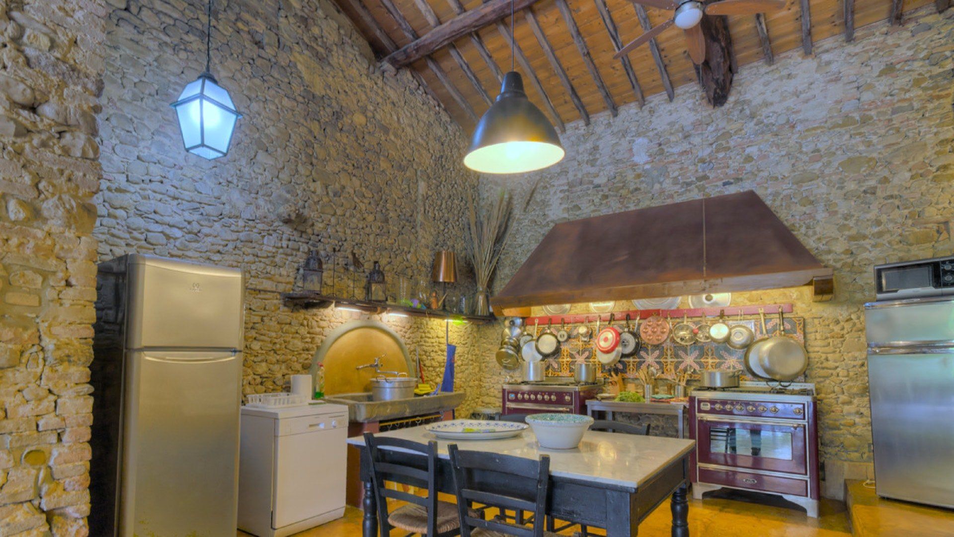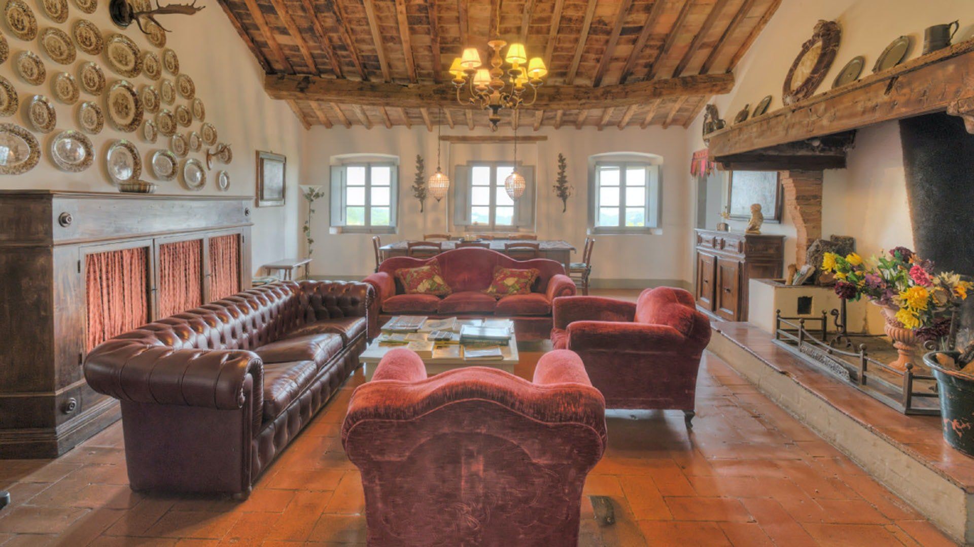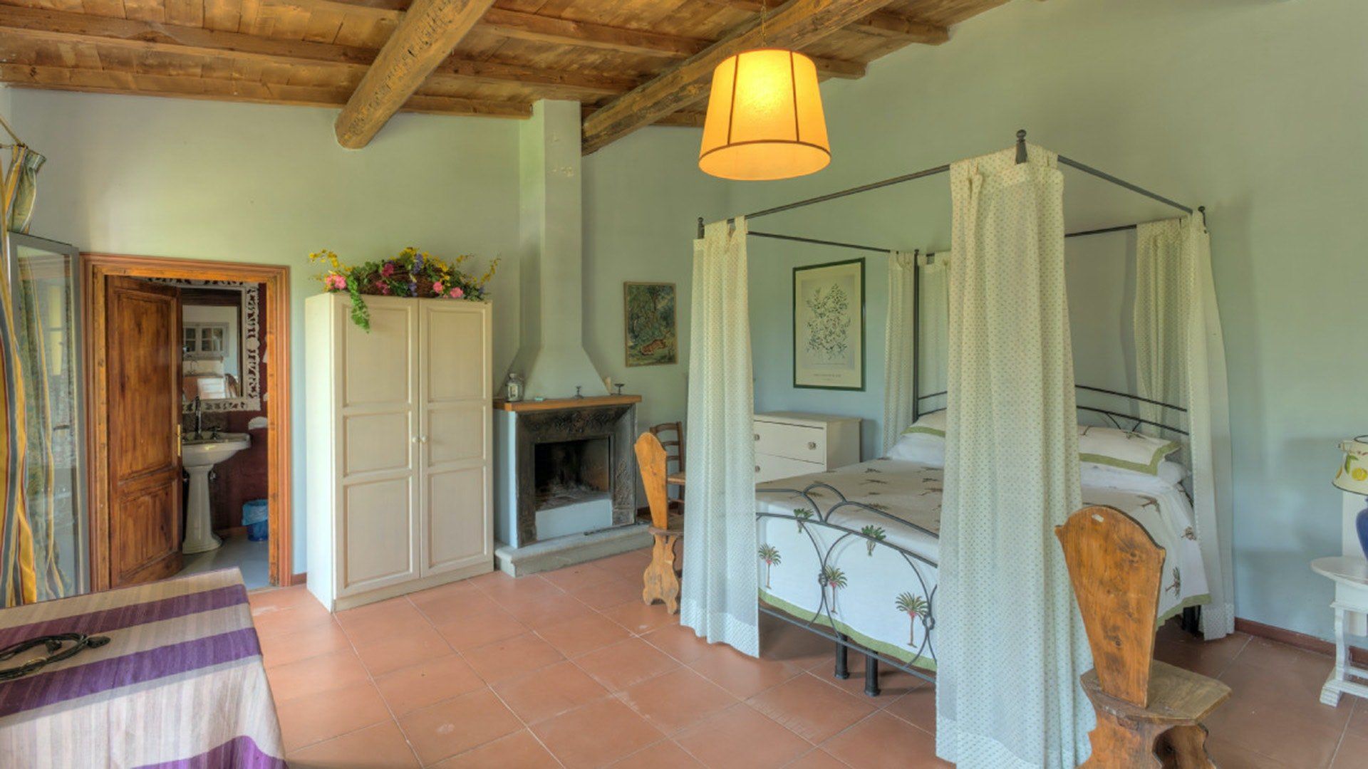 This traditional Italian farmhouse has been carefully restored to create a beautiful villa. Set on the edge of the small village of Tavarnelle in the hills surrounding Florence, there’s definitely a touch of old school romance to this home. Wisteria winds its way around the pergolas, and the honeyed stonework of the farmhouse is draped in vines from its terracotta roof tiles down to the sun-drenched terraces surrounding it. Inside, the spaces are on a grand scale, with vaulted ceilings in the kitchen and lounge area that makes you feel like you’re residing in a medieval castle. There’s a long table for feasting, a huge stone archway and fireplace, and heavy velvet drapes strung across the outside doors. Four-poster beds, cavernous bathrooms and a Turkish bath only add to the effect. This is a character-packed home, ideal for a big group of family and friends to come and spend time together. With its large grounds, swimming pool, sun terraces and ample indoor areas, there’s more than enough space for everyone to socialise together or spread out and do their own thing as desired.