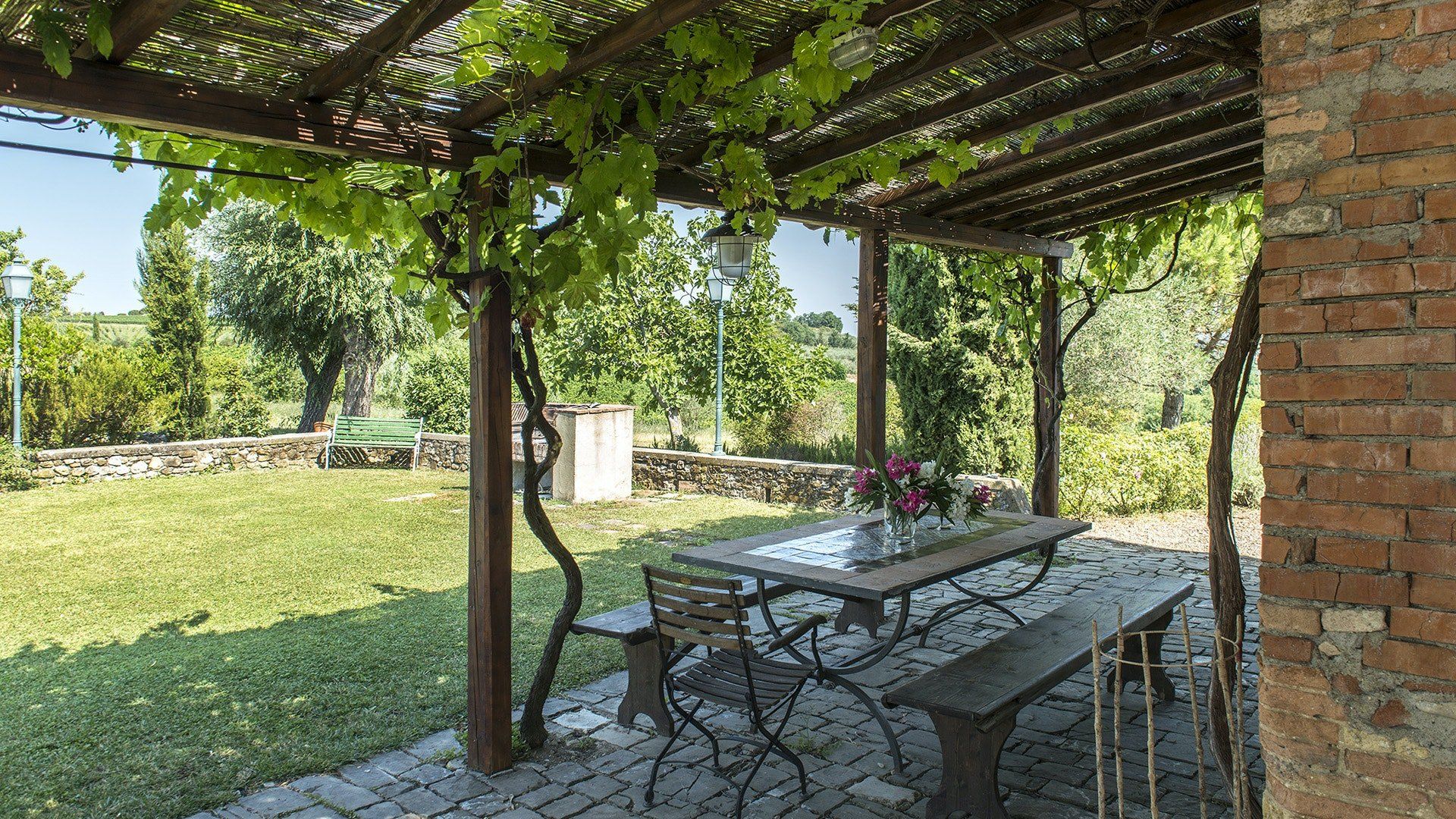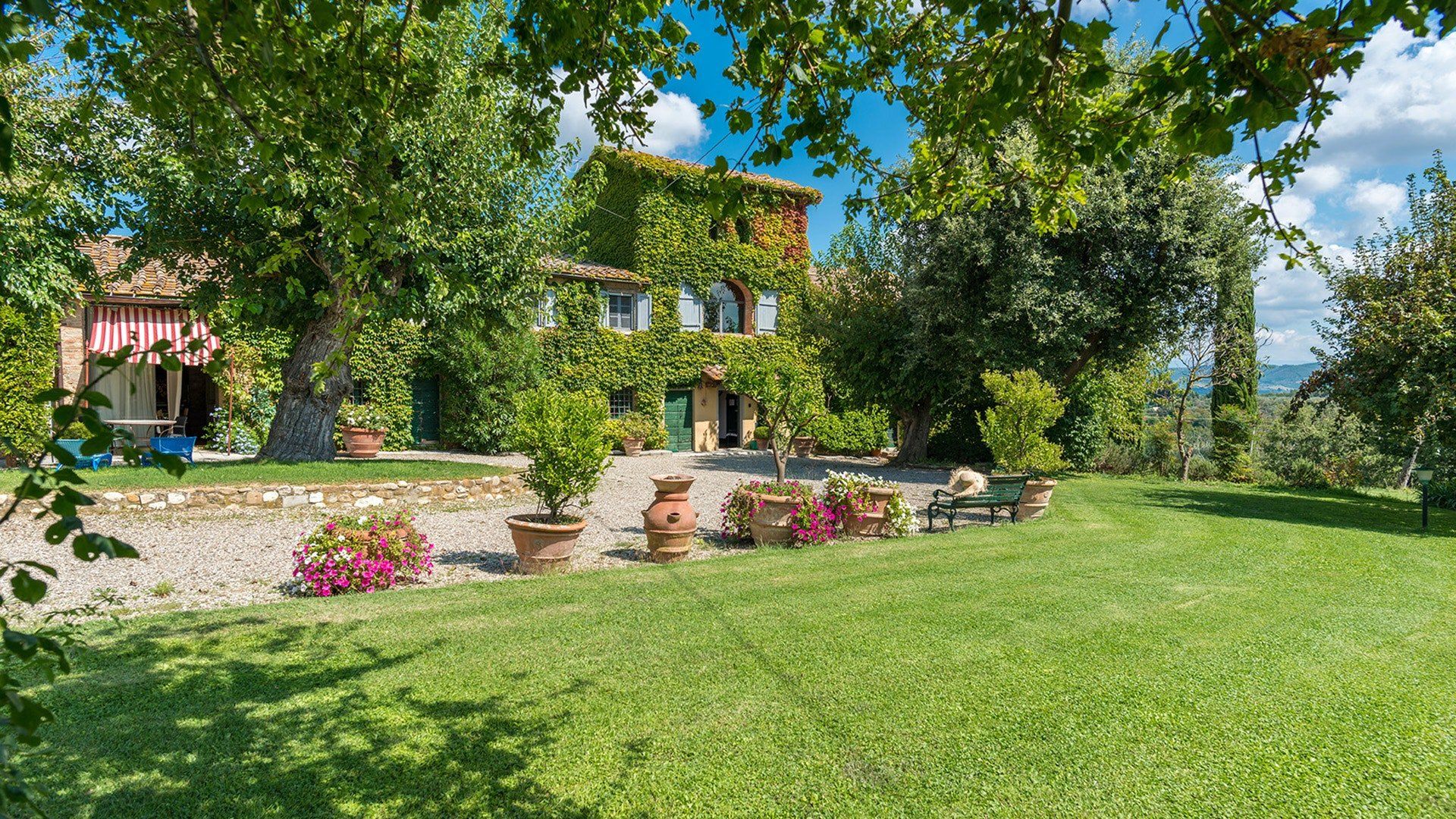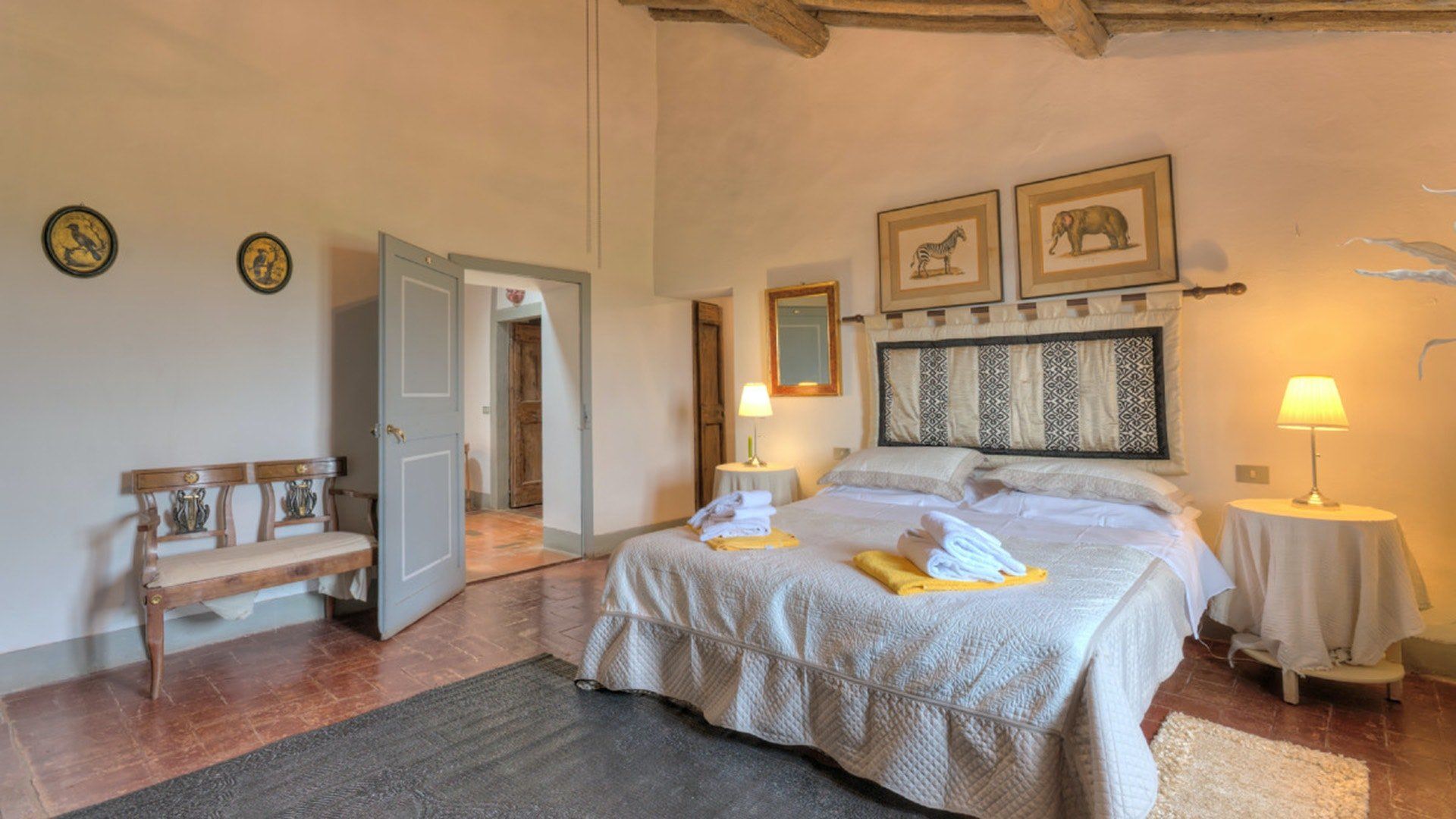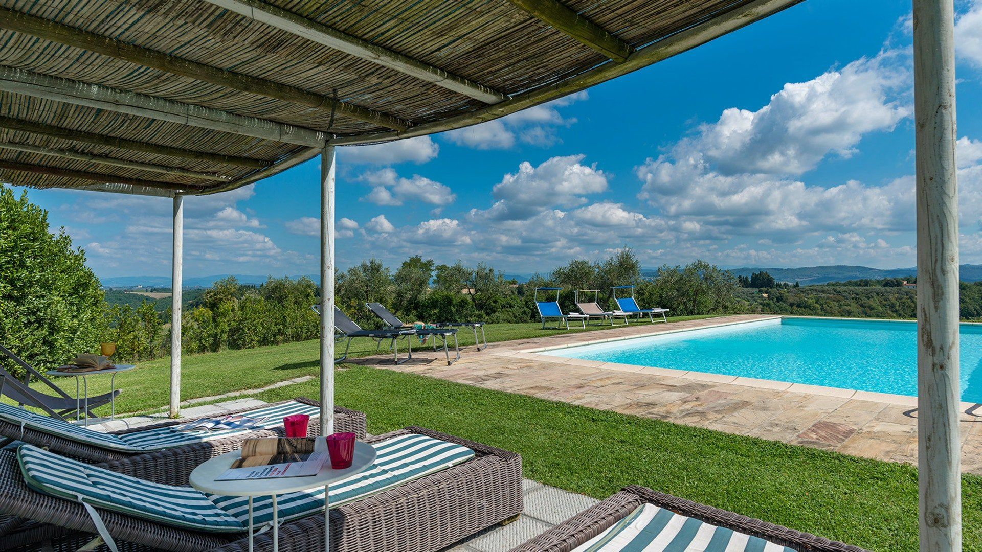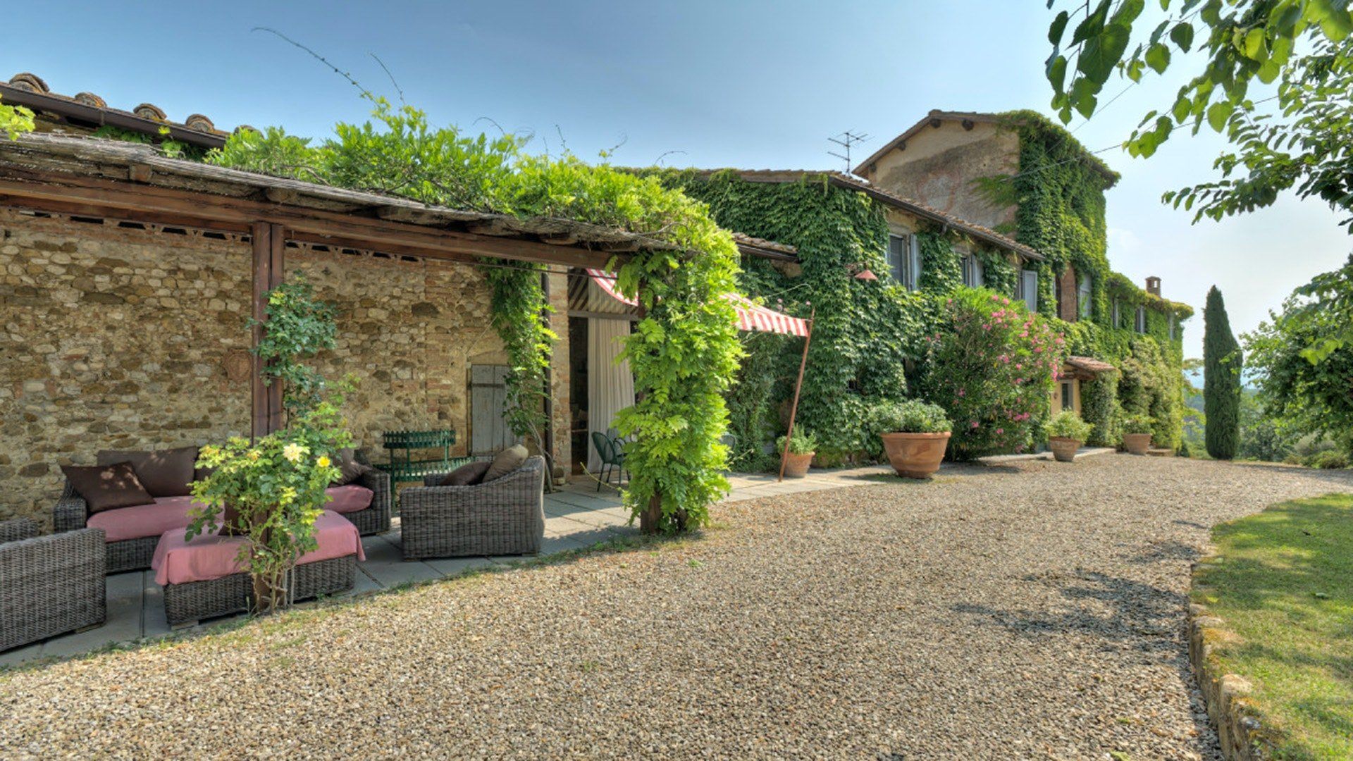 This traditional Italian farmhouse has been carefully restored to create a beautiful villa. Set on the edge of the small village of Tavarnelle in the hills surrounding Florence, there’s definitely a touch of old school romance to this home. Wisteria winds its way around the pergolas, and the honeyed stonework of the farmhouse is draped in vines from its terracotta roof tiles down to the sun-drenched terraces surrounding it. Inside, the spaces are on a grand scale, with vaulted ceilings in the kitchen and lounge area that makes you feel like you’re residing in a medieval castle. There’s a long table for feasting, a huge stone archway and fireplace, and heavy velvet drapes strung across the outside doors. Four-poster beds, cavernous bathrooms and a Turkish bath only add to the effect. This is a character-packed home, ideal for a big group of family and friends to come and spend time together. With its large grounds, swimming pool, sun terraces and ample indoor areas, there’s more than enough space for everyone to socialise together or spread out and do their own thing as desired.