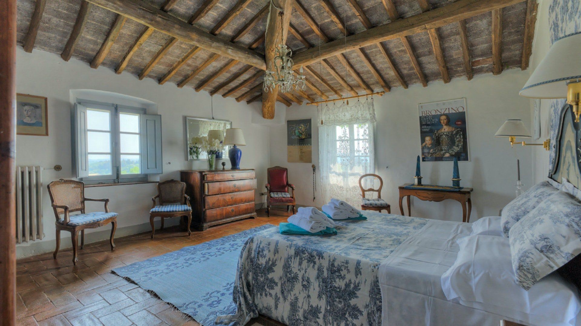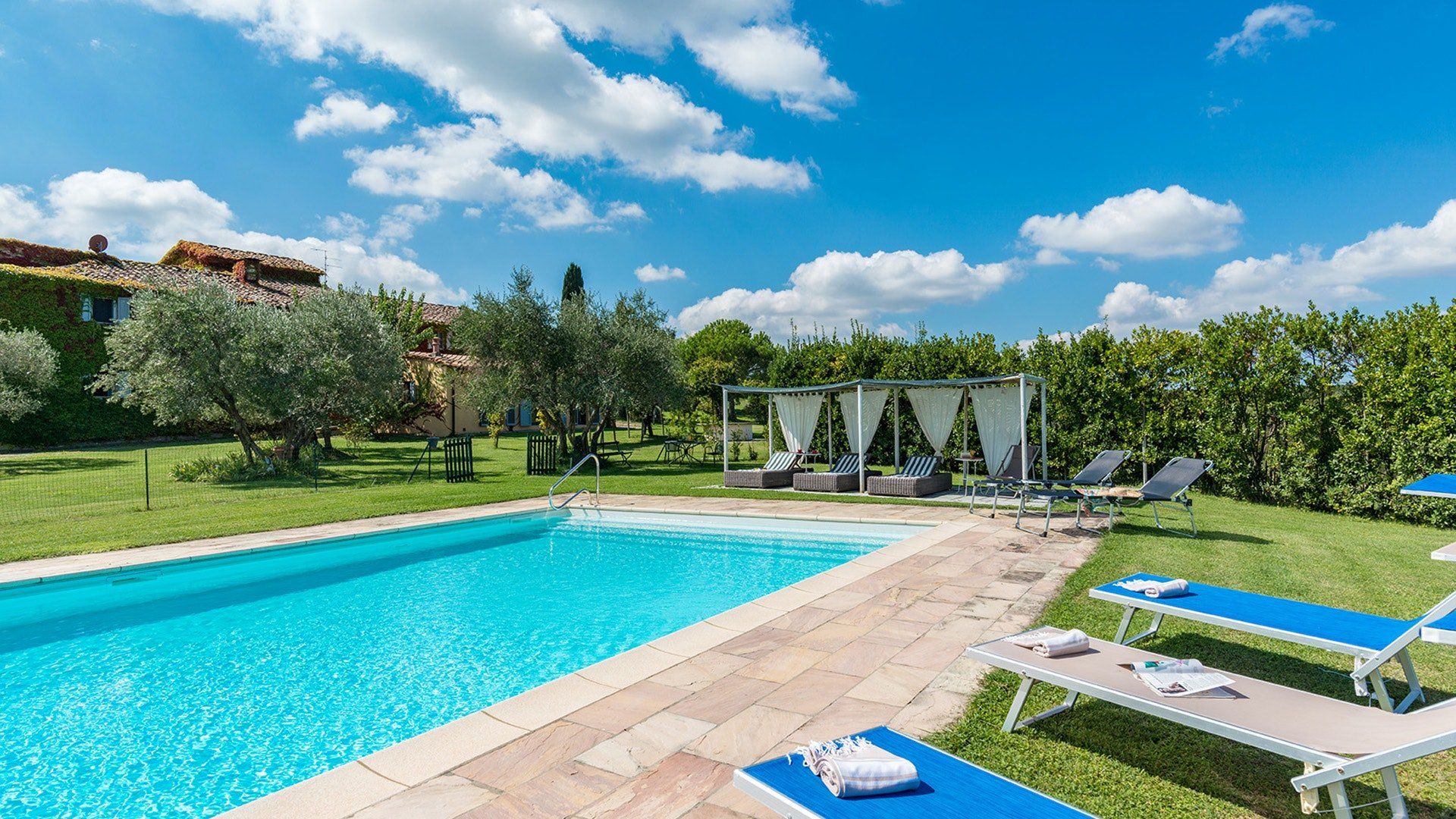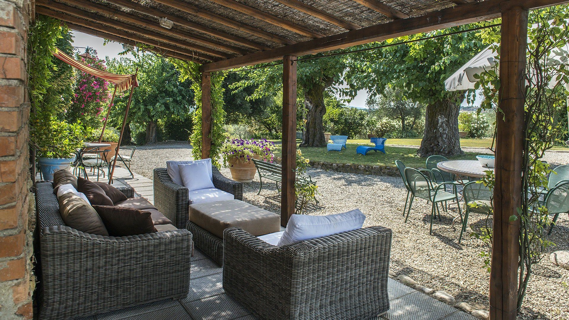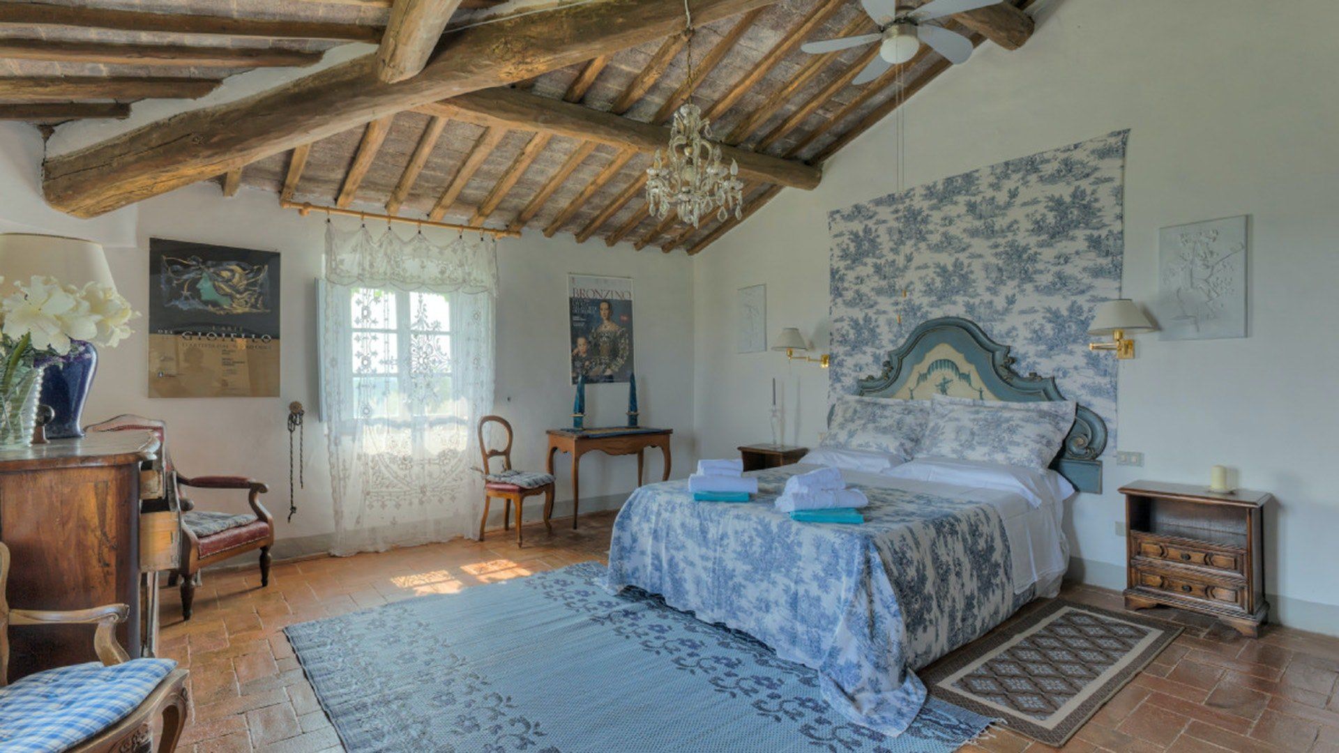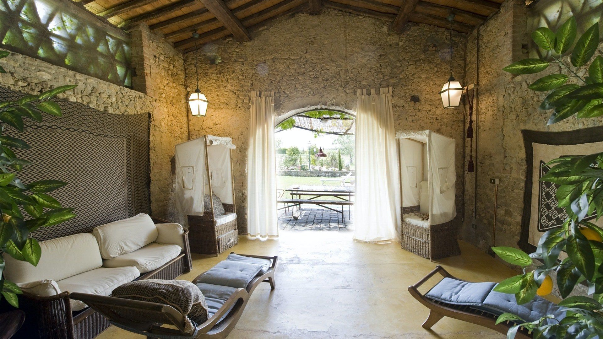 This traditional Italian farmhouse has been carefully restored to create a beautiful villa. Set on the edge of the small village of Tavarnelle in the hills surrounding Florence, there’s definitely a touch of old school romance to this home. Wisteria winds its way around the pergolas, and the honeyed stonework of the farmhouse is draped in vines from its terracotta roof tiles down to the sun-drenched terraces surrounding it. Inside, the spaces are on a grand scale, with vaulted ceilings in the kitchen and lounge area that makes you feel like you’re residing in a medieval castle. There’s a long table for feasting, a huge stone archway and fireplace, and heavy velvet drapes strung across the outside doors. Four-poster beds, cavernous bathrooms and a Turkish bath only add to the effect. This is a character-packed home, ideal for a big group of family and friends to come and spend time together. With its large grounds, swimming pool, sun terraces and ample indoor areas, there’s more than enough space for everyone to socialise together or spread out and do their own thing as desired.