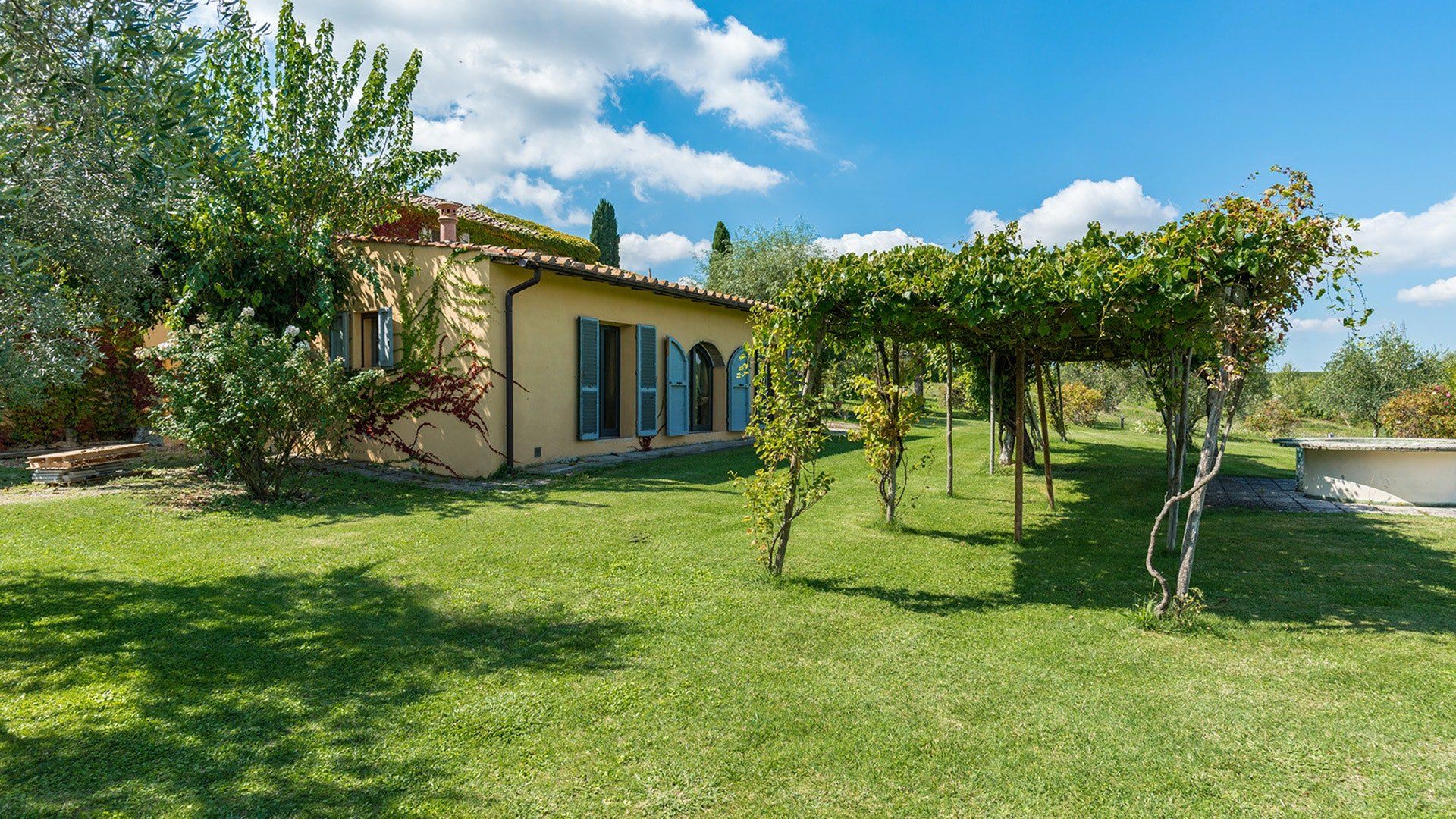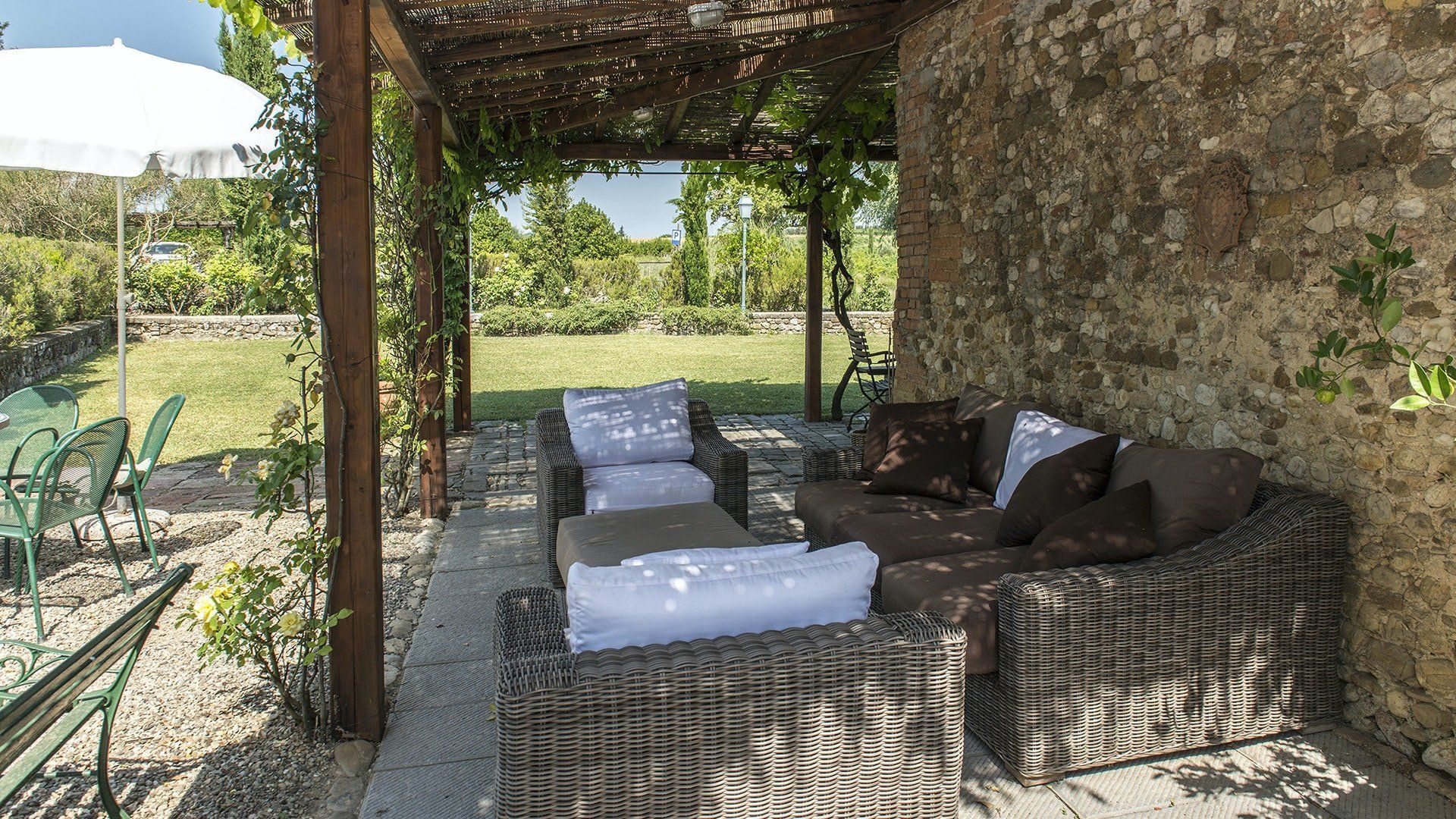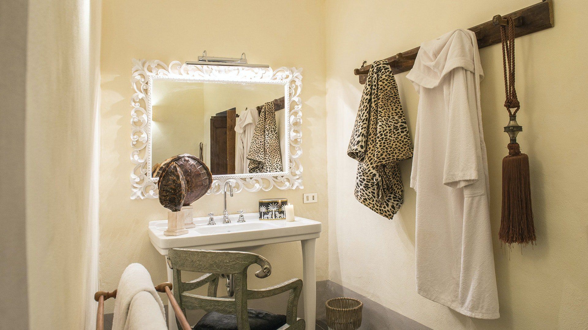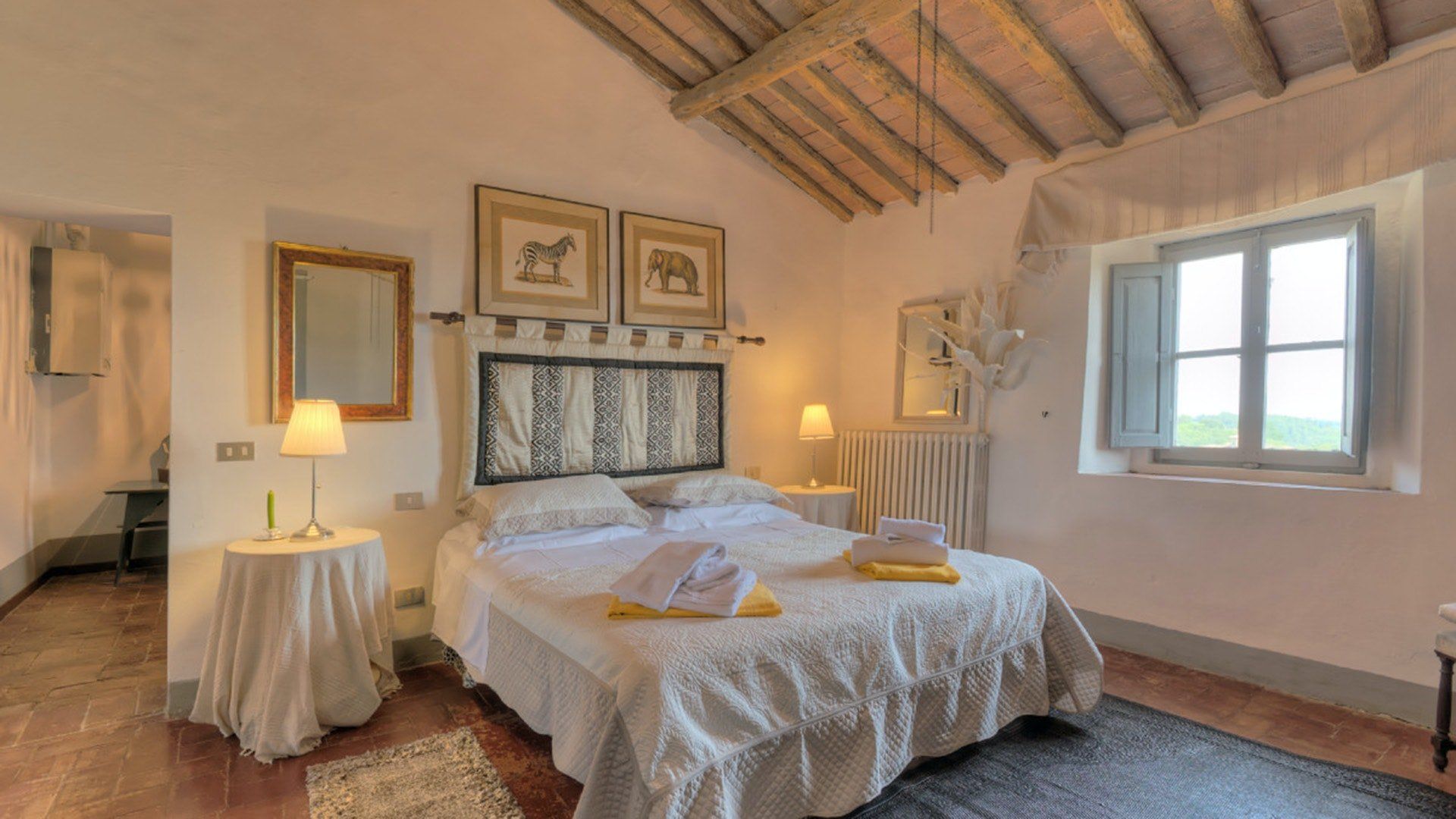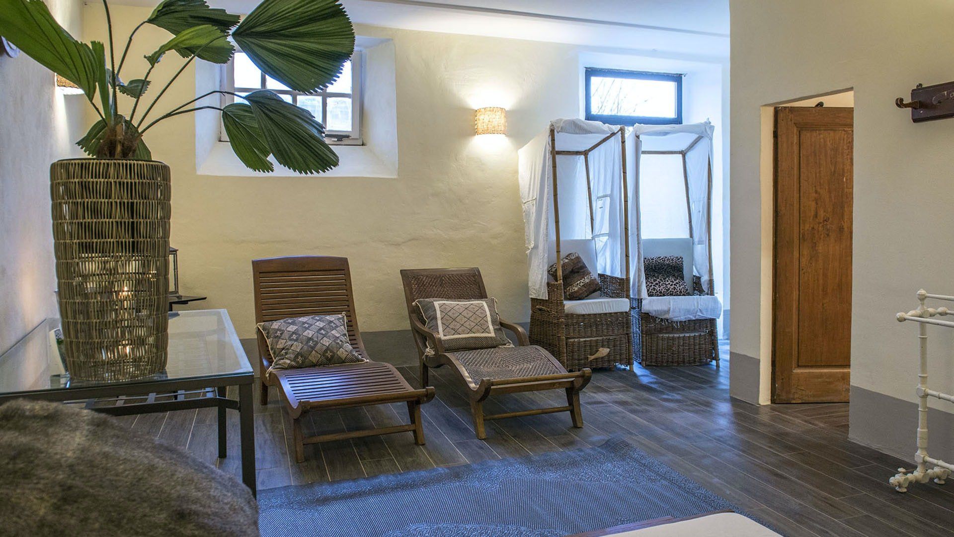 This traditional Italian farmhouse has been carefully restored to create a beautiful villa. Set on the edge of the small village of Tavarnelle in the hills surrounding Florence, there’s definitely a touch of old school romance to this home. Wisteria winds its way around the pergolas, and the honeyed stonework of the farmhouse is draped in vines from its terracotta roof tiles down to the sun-drenched terraces surrounding it. Inside, the spaces are on a grand scale, with vaulted ceilings in the kitchen and lounge area that makes you feel like you’re residing in a medieval castle. There’s a long table for feasting, a huge stone archway and fireplace, and heavy velvet drapes strung across the outside doors. Four-poster beds, cavernous bathrooms and a Turkish bath only add to the effect. This is a character-packed home, ideal for a big group of family and friends to come and spend time together. With its large grounds, swimming pool, sun terraces and ample indoor areas, there’s more than enough space for everyone to socialise together or spread out and do their own thing as desired.