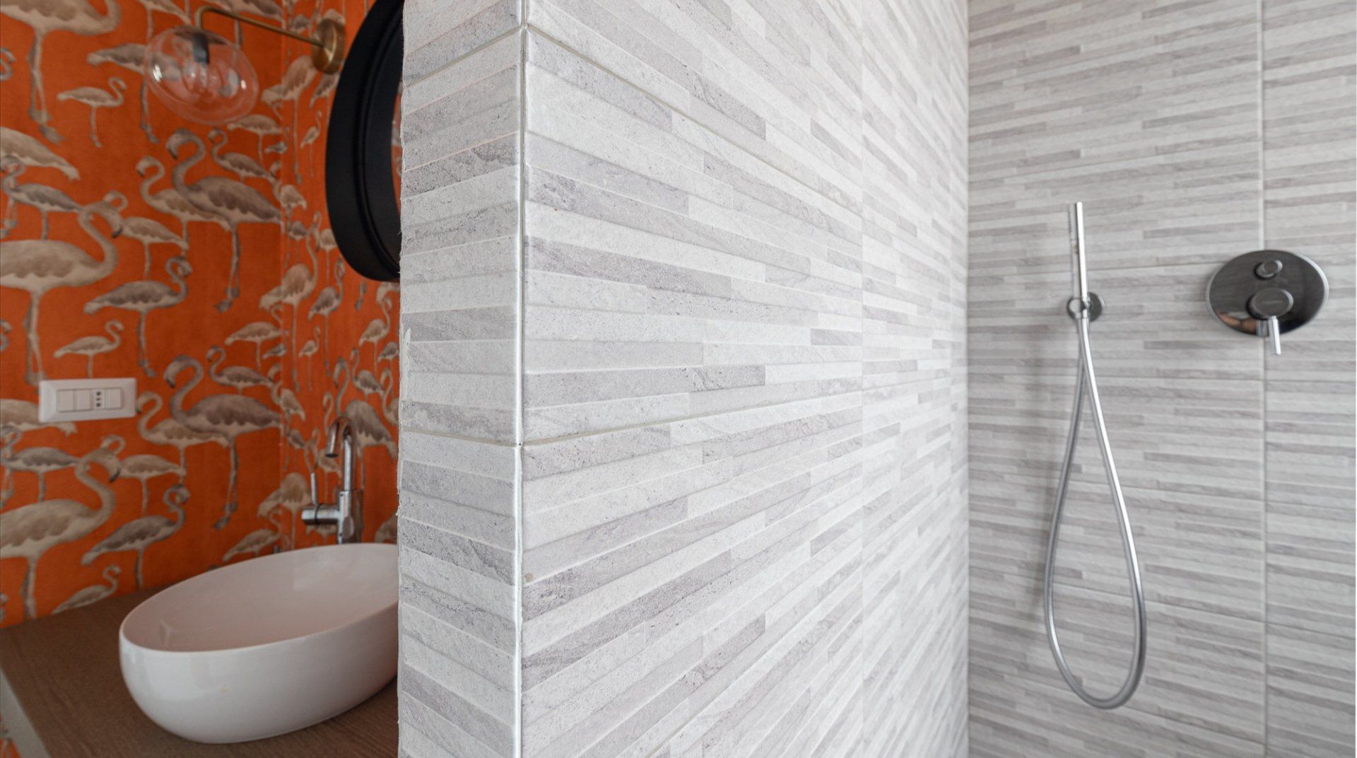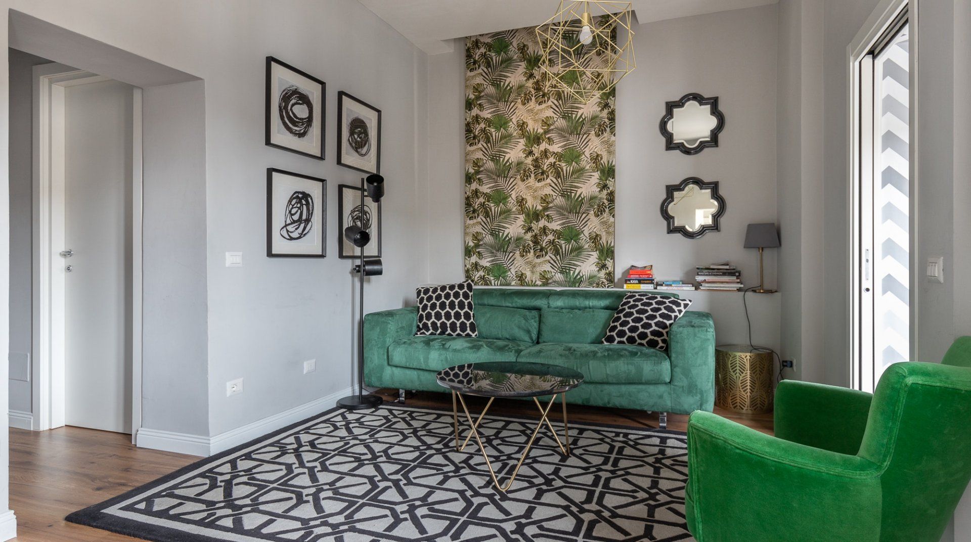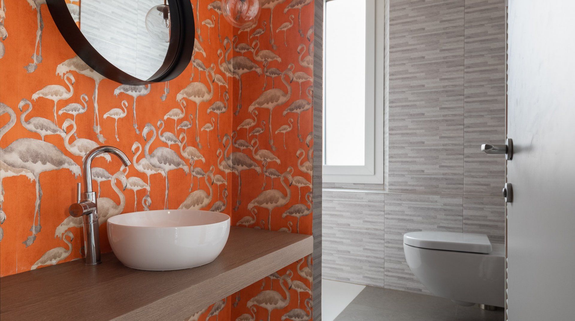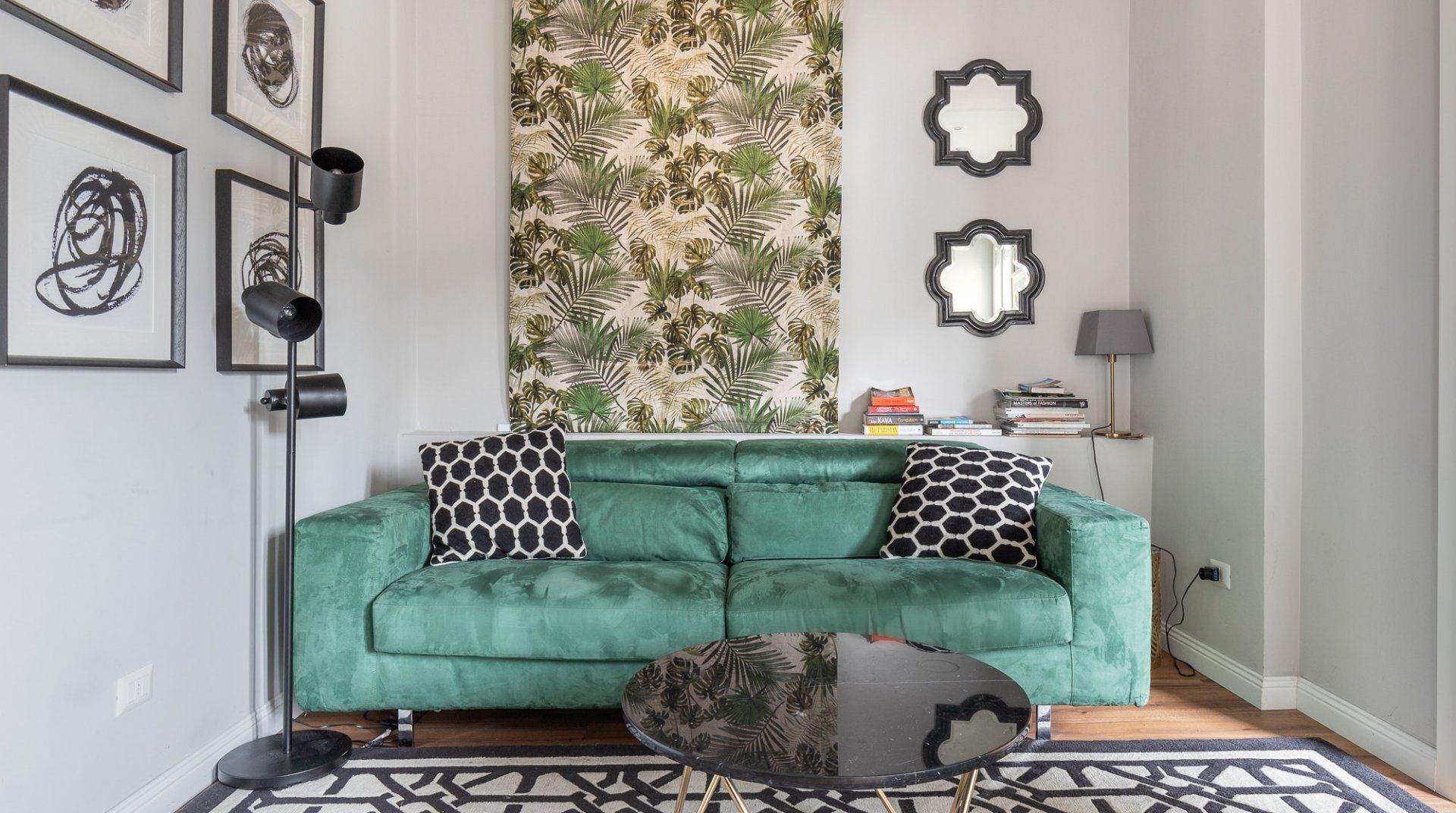 We love the bright green velvet sofa, glossy black coffee table, and jungle-print wall hanging in the lounge. They might not be the traditional Italian features you’d expect, which is exactly what makes this home so unique. For a similar surprise, head into one of the bathrooms. With vibrant orange wallpaper featuring a flamingo print all over, these wonderfully unexpected and joyful interiors can certainly make up for its former residents.