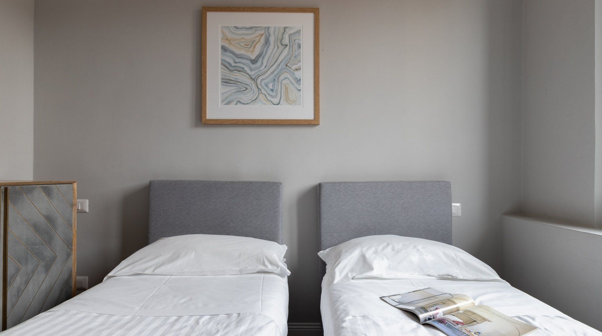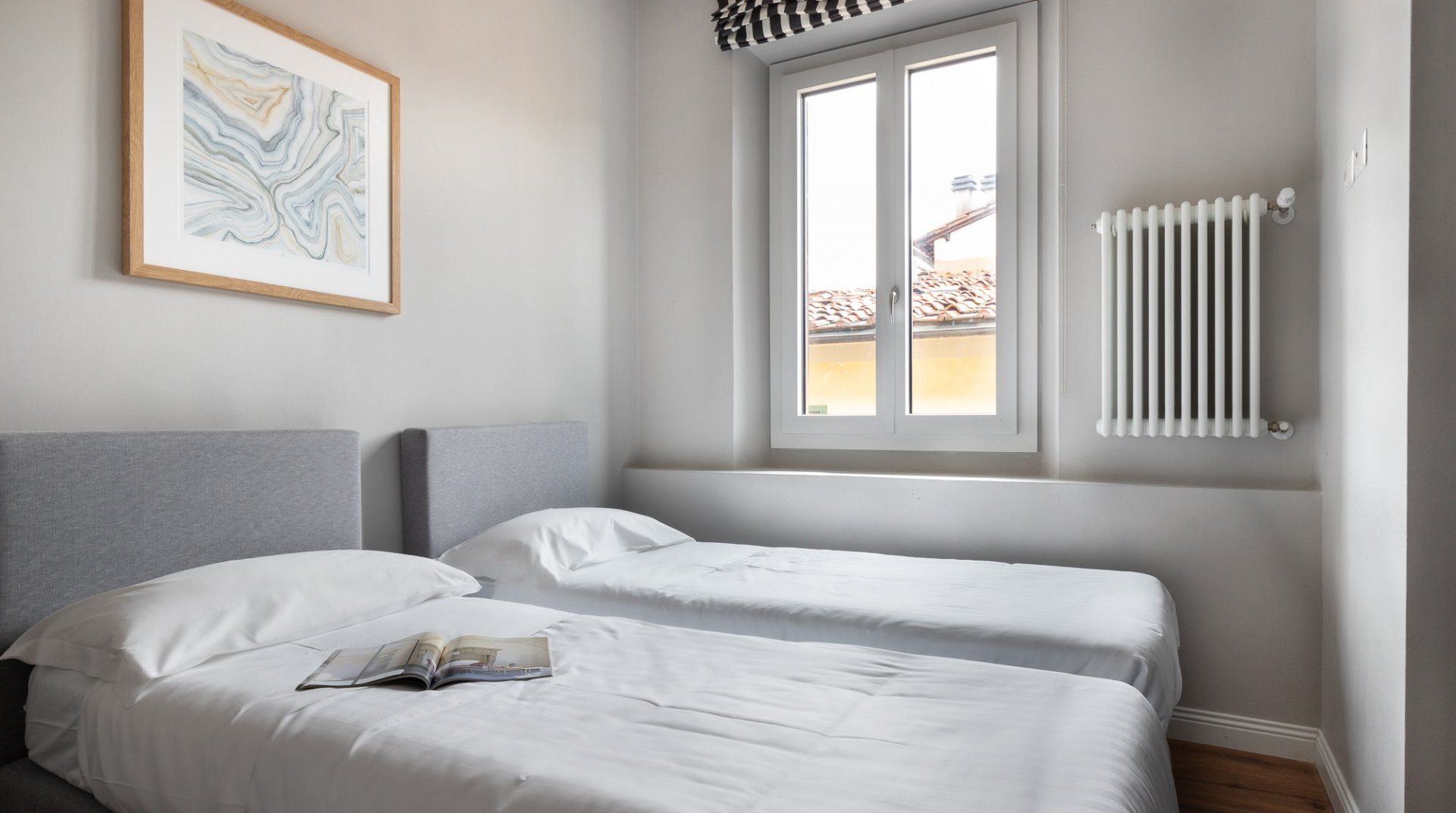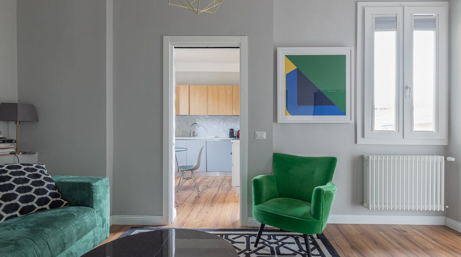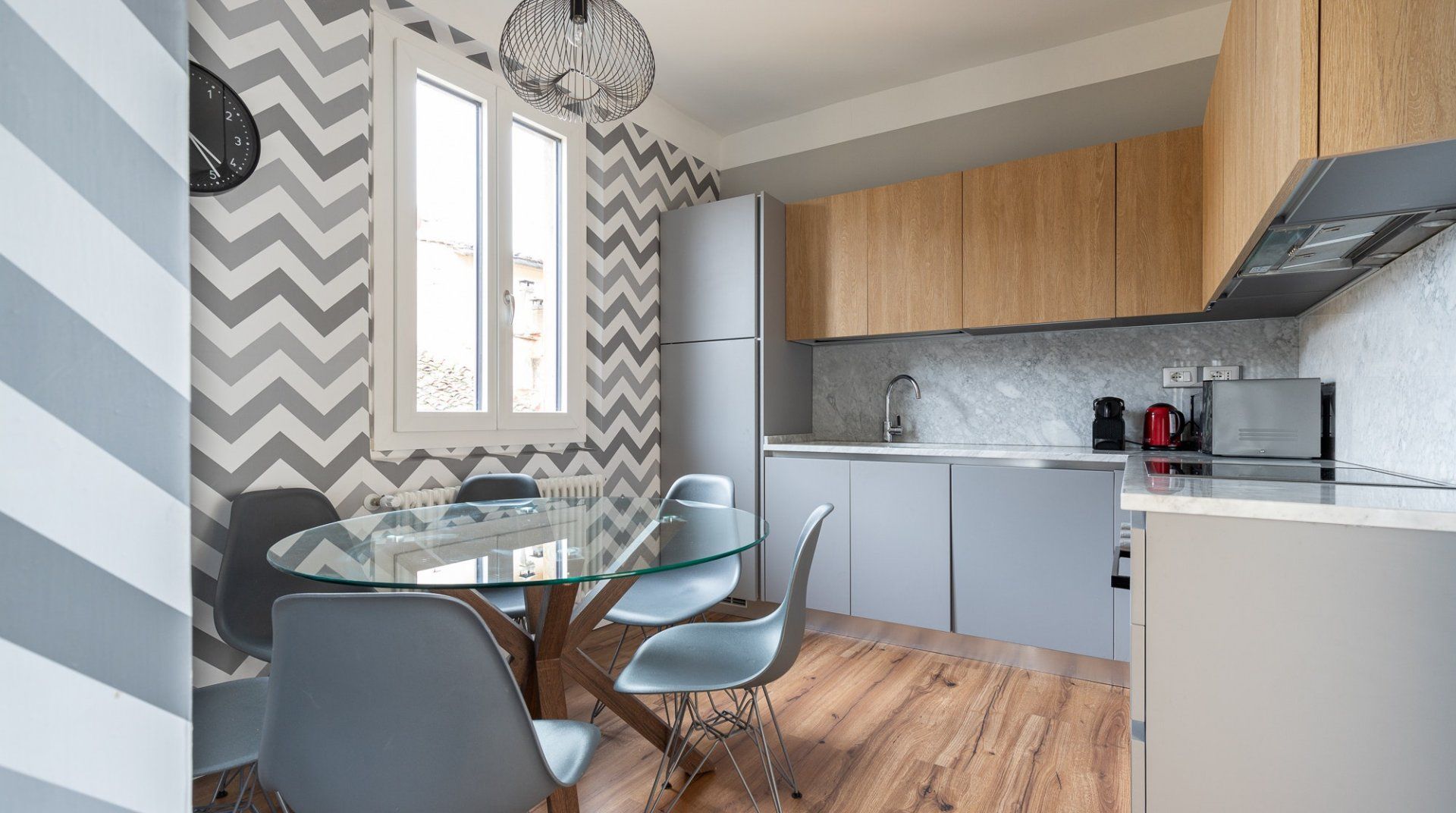 As you arrive at its imposing entrance, it has a gothic look with dark stone facade and a grand front door painted black. Any ideas what it used to be? For centuries, this building was the official residence of the city’s executioners, known as Casa del Boia. However, this modern apartment is now a far cry from its past, offering a fresh and modern vibe in the heart of this ancient city.