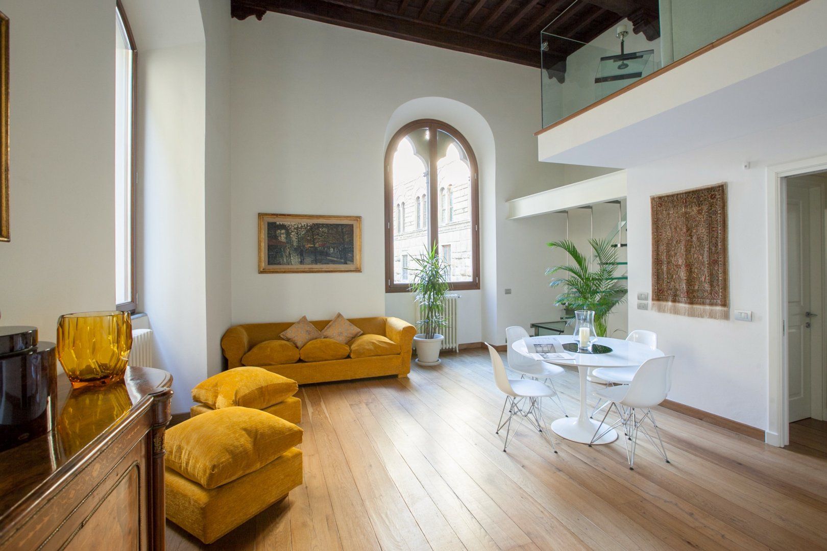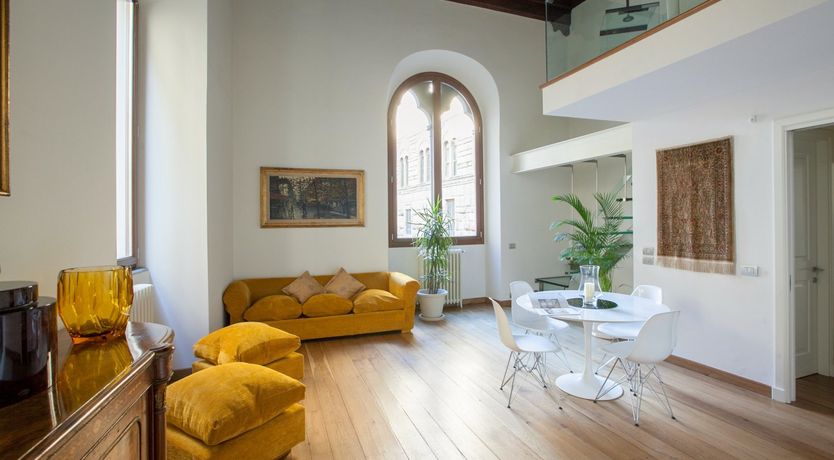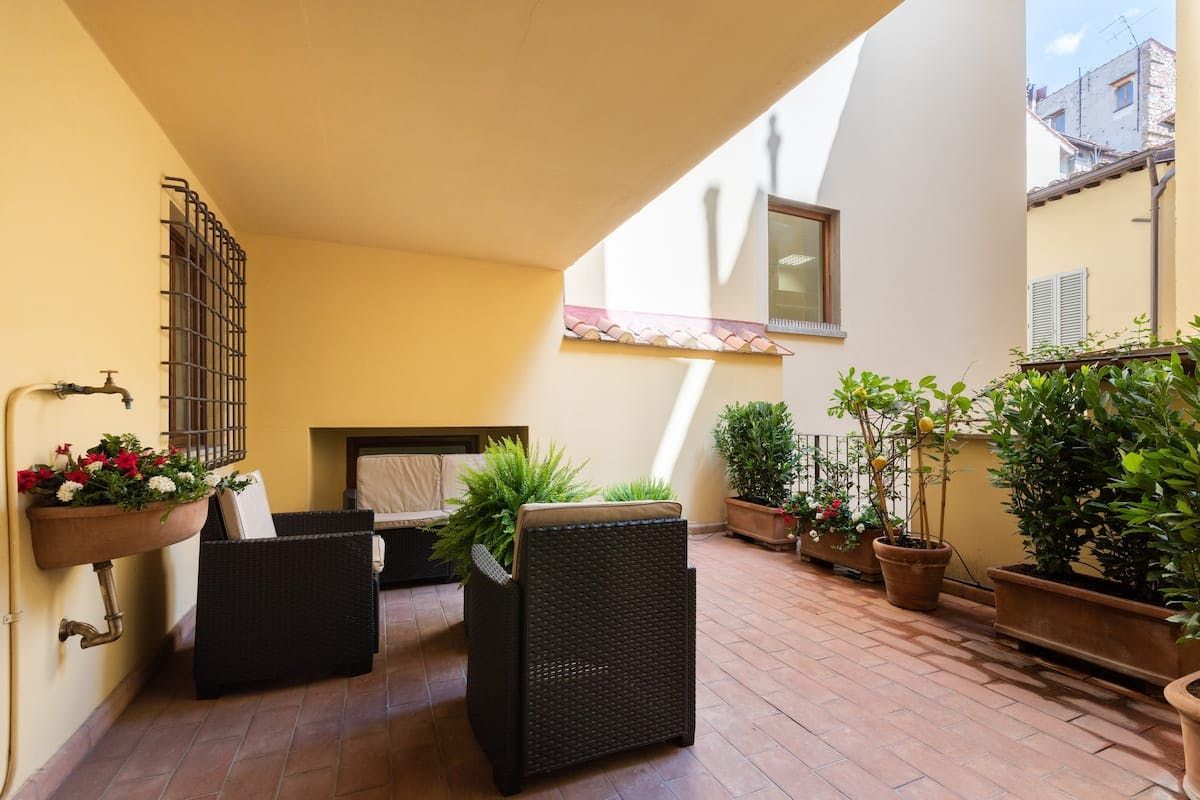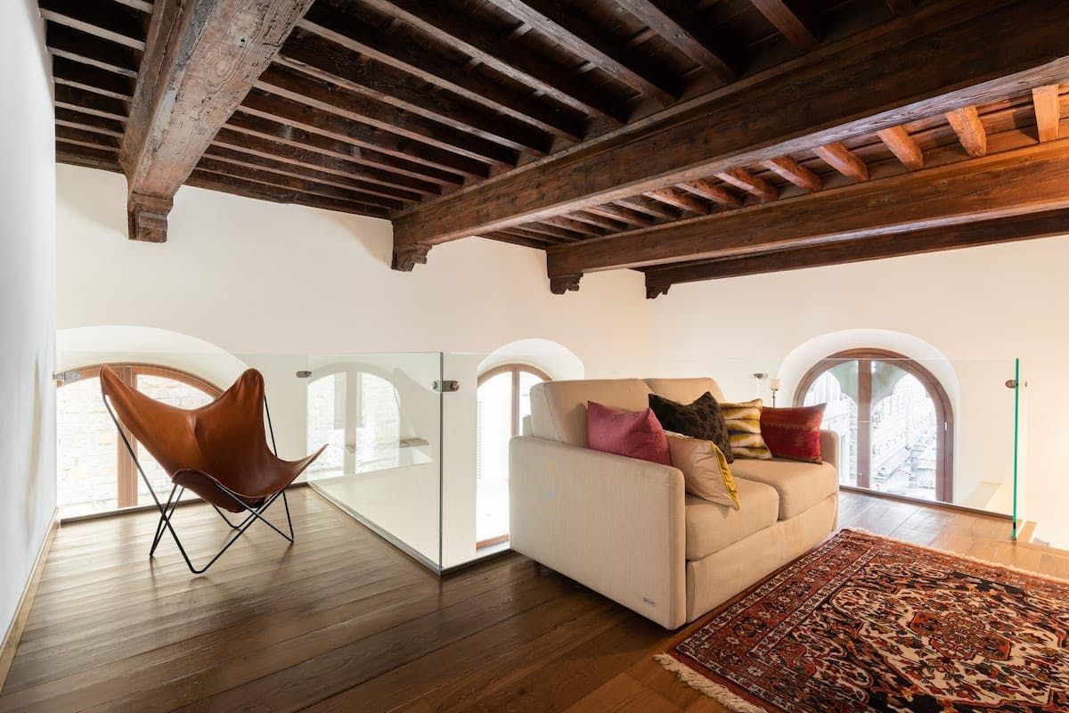 With a striking contrast between the modern, minimalist aesthetic of the flat, and the seventeenth-century palazzo that houses it, this apartment is sure to impress as soon as you pass the threshold. In the living area, antique furnishings and a mustard velvet couch are illuminated by enormous arched windows. We particularly loved the double-height ceilings with original beams, adding a touch of grandeur to the space. There’s a mezzanine level for quiet downtimes and a private sunshine yellow patio for laidback breakfasts and glasses of Chianti at dusk. Step outside your building and take the minute’s walk to the Palazzo Strozzi, home to international contemporary exhibitions. If Renaissance masterpieces are more your thing, Botticelli’s Birth of Venus and Verrocchio and Leonardo’s Baptism of Christ hang proudly in the Uffizi Gallery, a five-minute walk away.