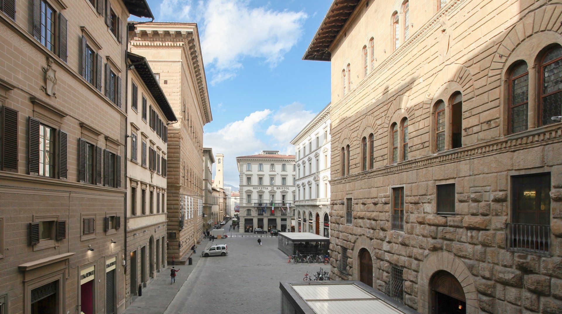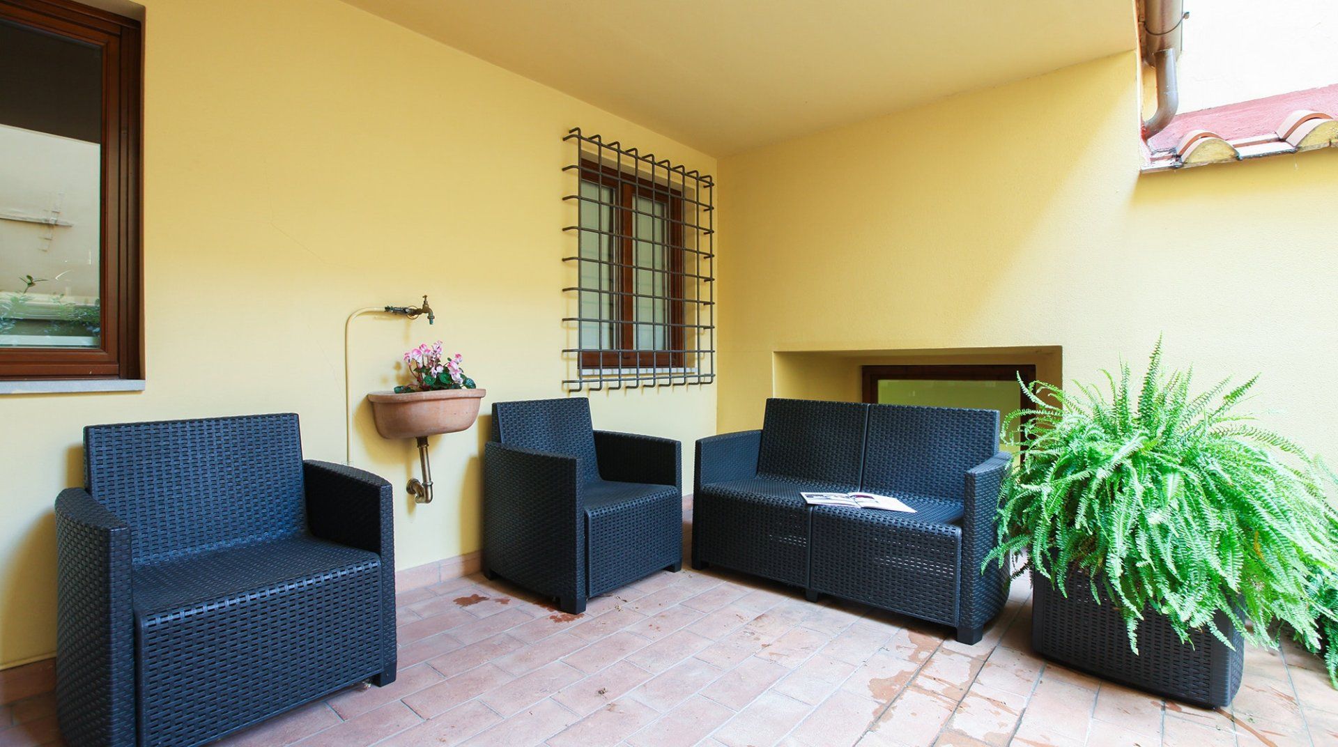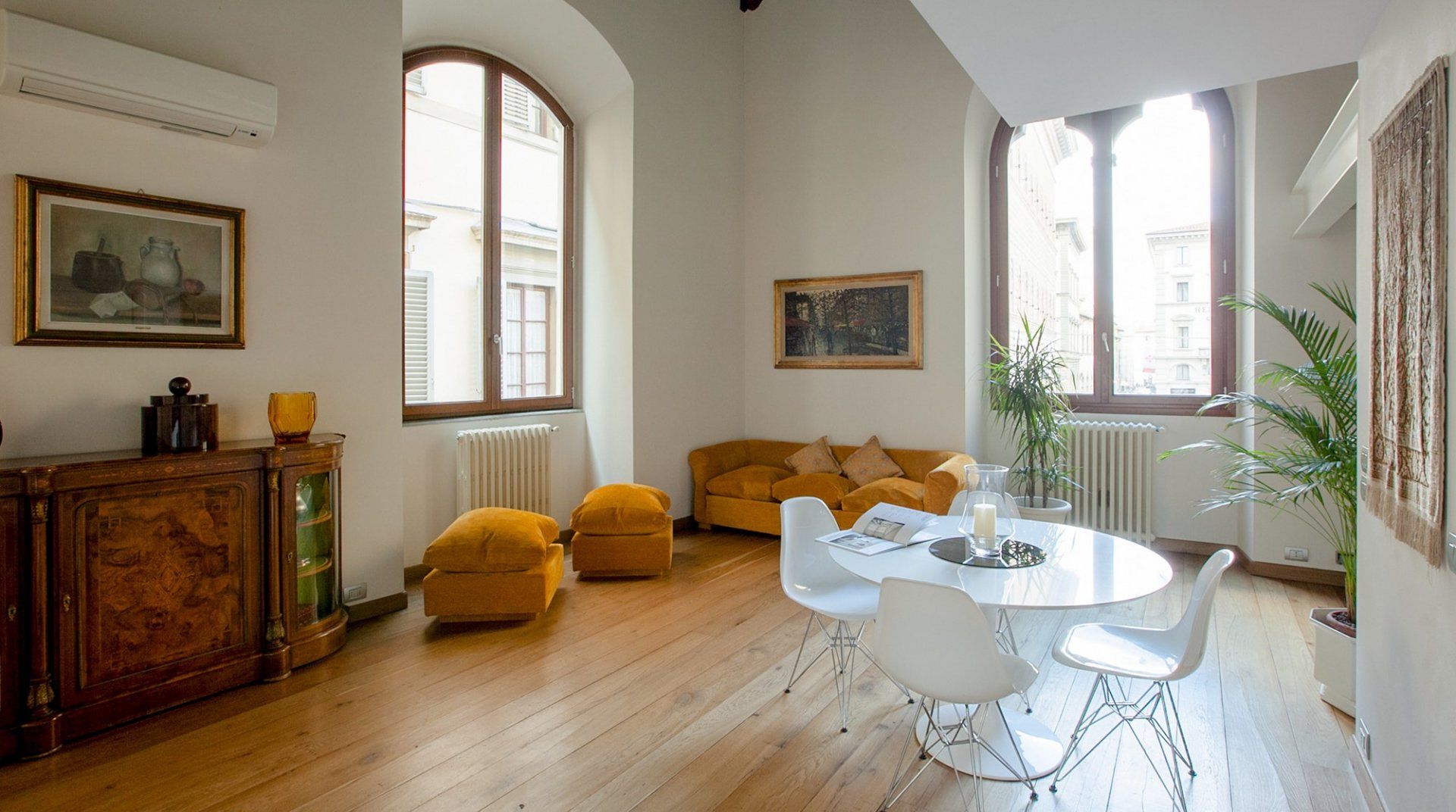 With a striking contrast between the modern, minimalist aesthetic of the flat, and the seventeenth-century palazzo that houses it, this apartment is sure to impress as soon as you pass the threshold. In the living area, antique furnishings and a mustard velvet couch are illuminated by enormous arched windows. We particularly loved the double-height ceilings with original beams, adding a touch of grandeur to the space. There’s a mezzanine level for quiet downtimes and a private sunshine yellow patio for laidback breakfasts and glasses of Chianti at dusk. Step outside your building and take the minute’s walk to the Palazzo Strozzi, home to international contemporary exhibitions. If Renaissance masterpieces are more your thing, Botticelli’s Birth of Venus and Verrocchio and Leonardo’s Baptism of Christ hang proudly in the Uffizi Gallery, a five-minute walk away.