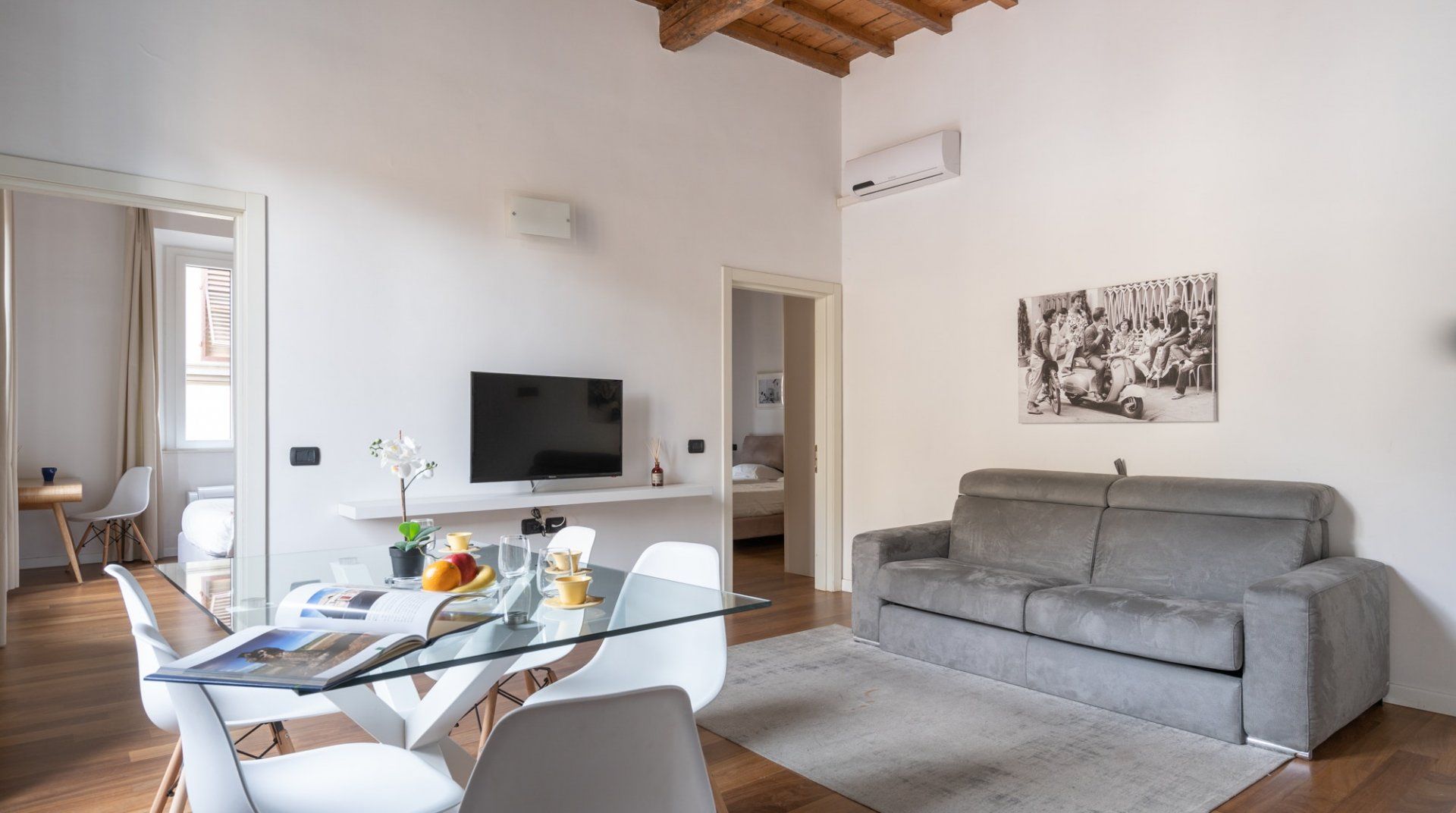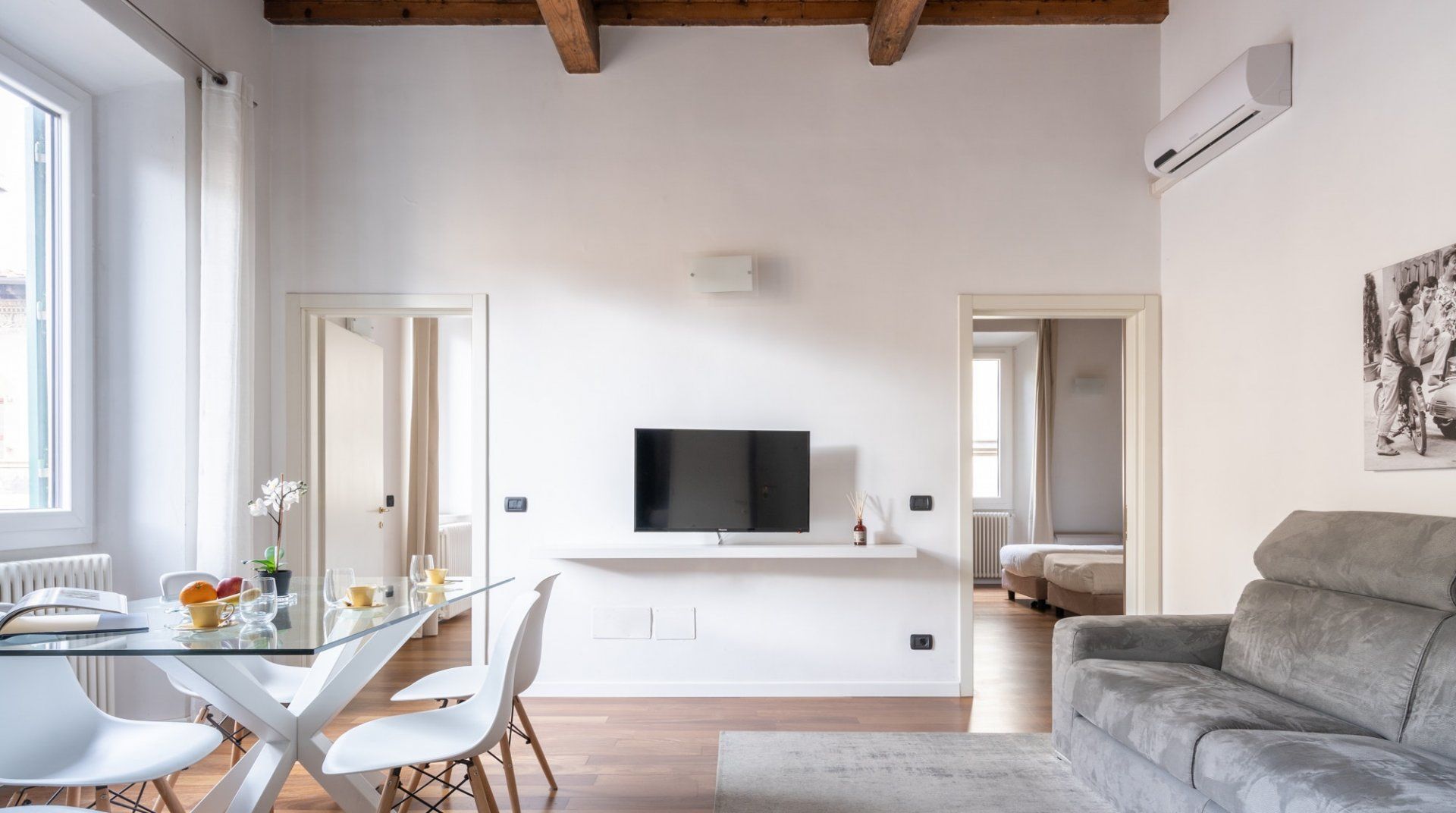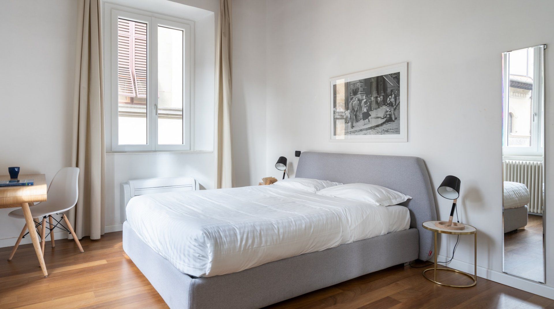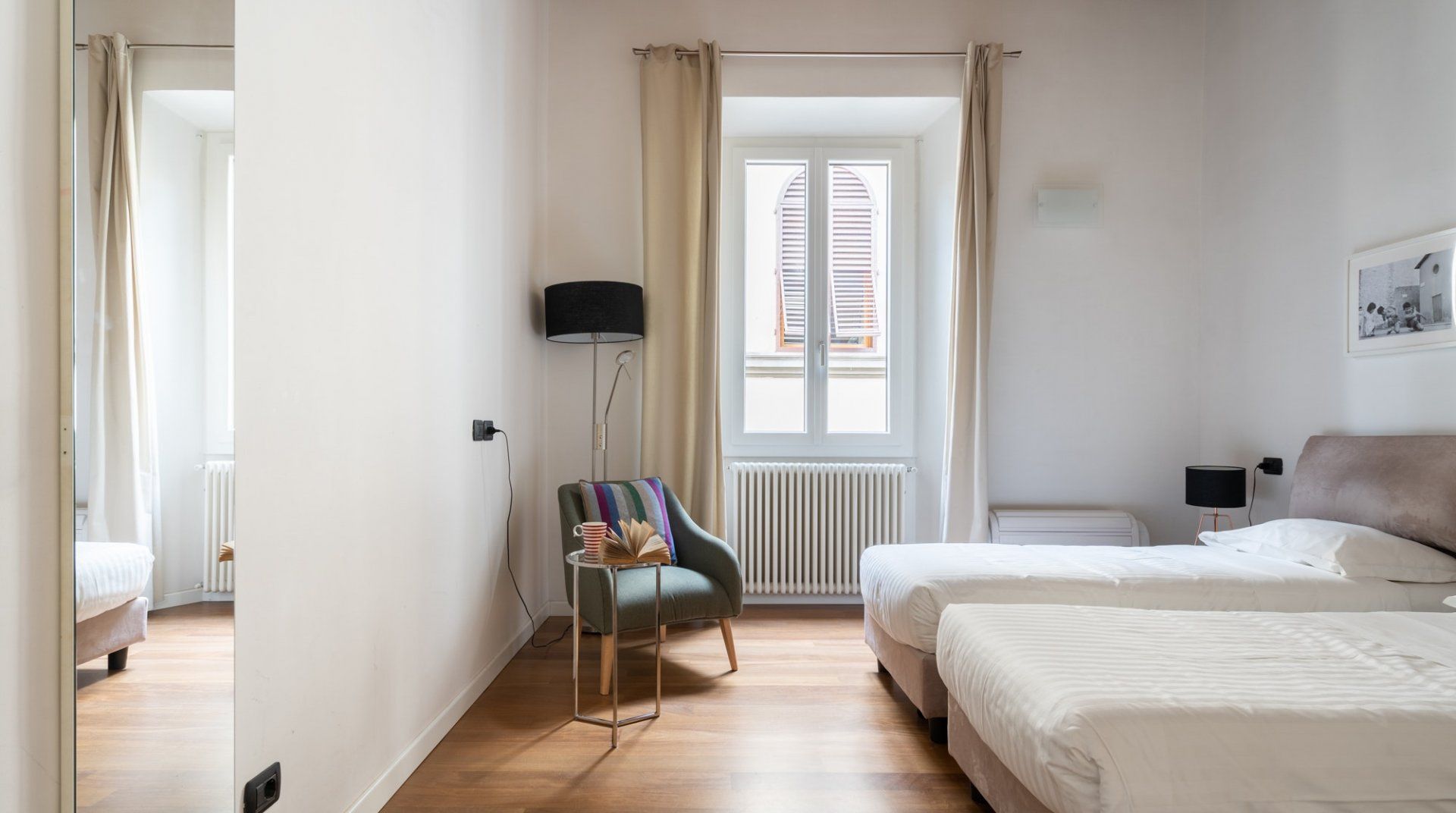 Pietra Rest has been designed with simplicity in mind – the large windows, hardwood floors, and muted decor make for a calming and visually appealing space. With one double bedroom and one twin bedroom, the setup is ideal for a family. There’s a sofa bed in the communal area, but since there’s only one bathroom, we don’t think having more than four guests would be optimal. The apartment is located in one of the most historic and vibrant neighbourhoods in Florence, with lively cafes, restaurants, and bars and a lot of the main monuments close by.