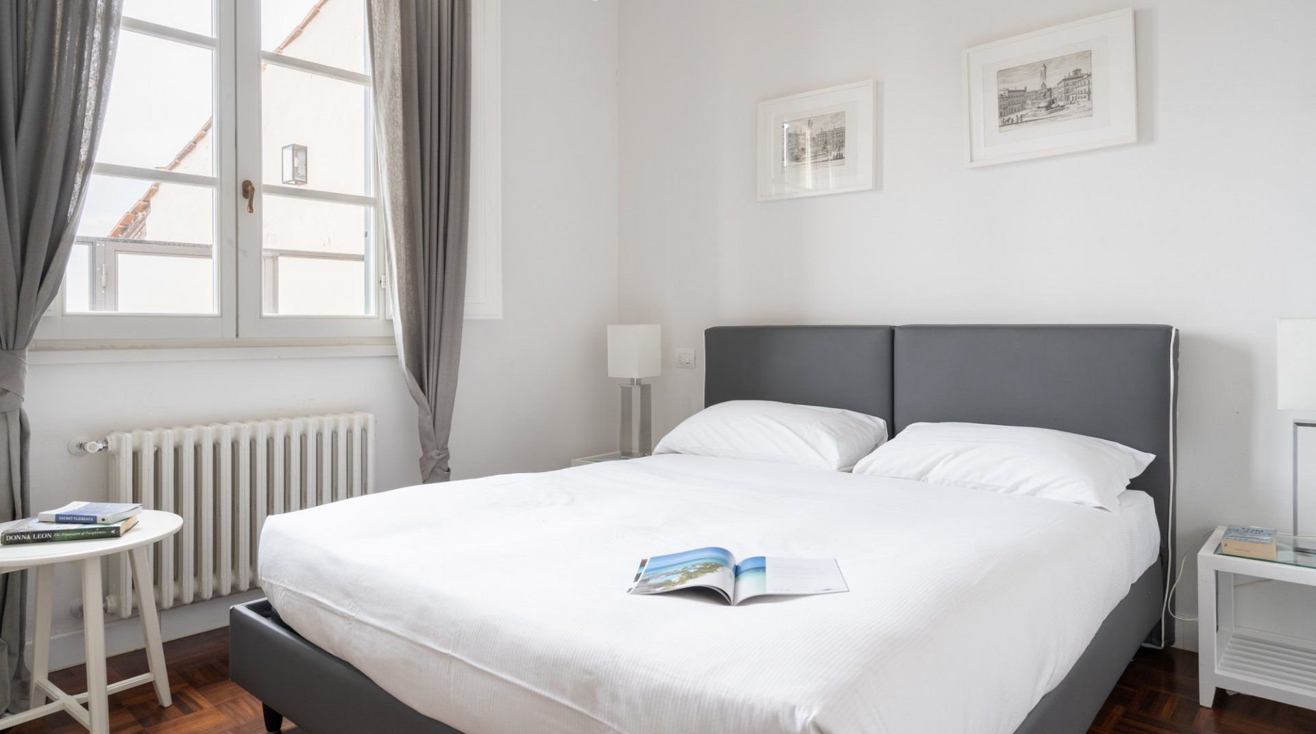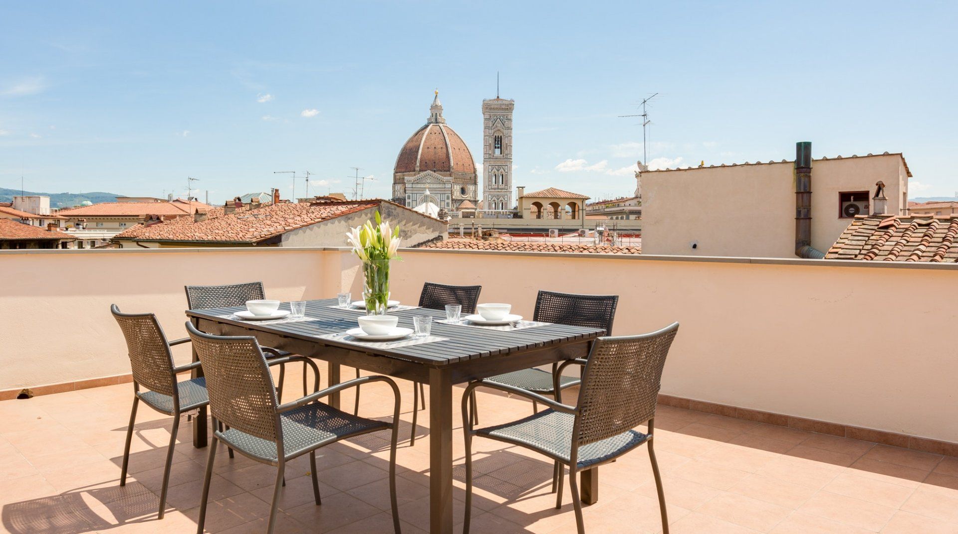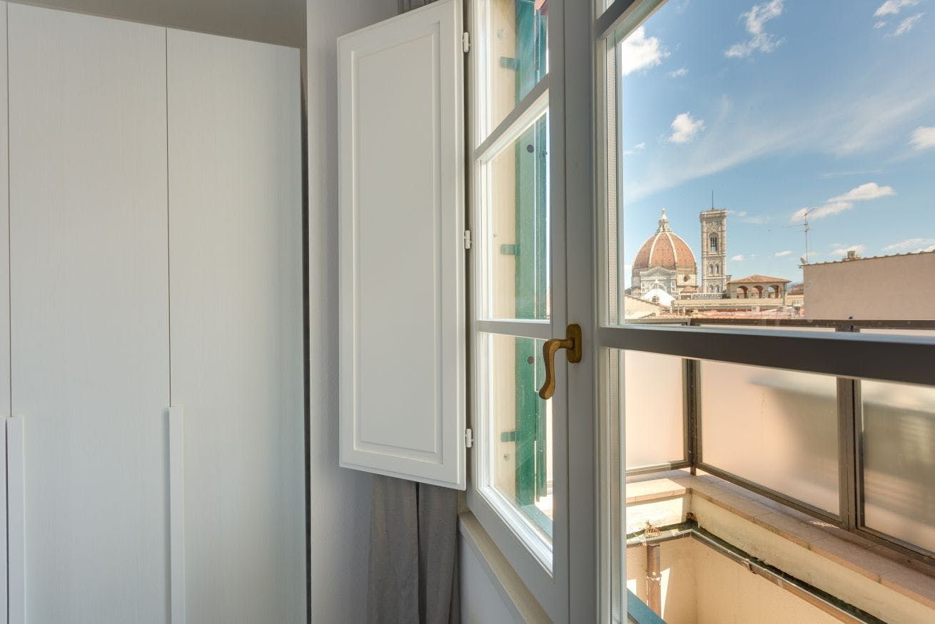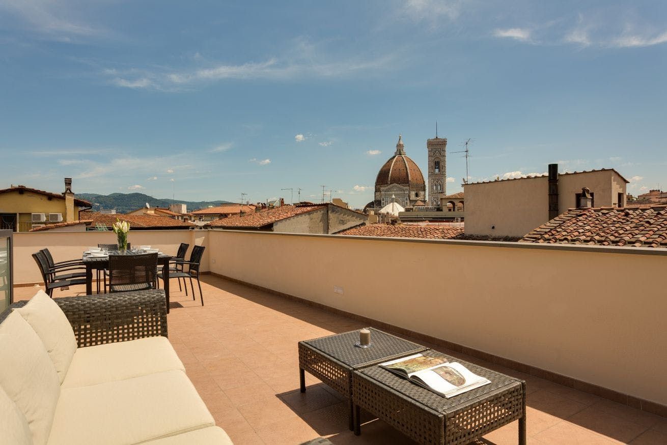 We adore this chic home's stunning terrace with its wonderful view of the Duomo di Firenze (Florence Cathedral) and many of the city's famous sights. It's a huge space, nestled in among the rooftops and drenched in sun. As the sun goes down, it's the perfect place to eat some local produce and sample some Tuscan wine. We also really love the living room style – its simplicity defined, with pale colours and a clear influence from Scandinavian design. Located in the heart of Florence's luxury shopping district, Via dè Tornabuoni is just a three-minute stroll away. This neighbourhood is also known for its array of Florentine restaurants, cafes and bakeries. If you want to visit the Duomo, it's a four-minute wander, while the medieval Ponte Vecchio is an eight-minute saunter. For art lovers, the Uffizi Gallery is just over ten minutes on foot. Whatever you decide to do – make sure you bring comfy shoes – there's so much to see nearby.