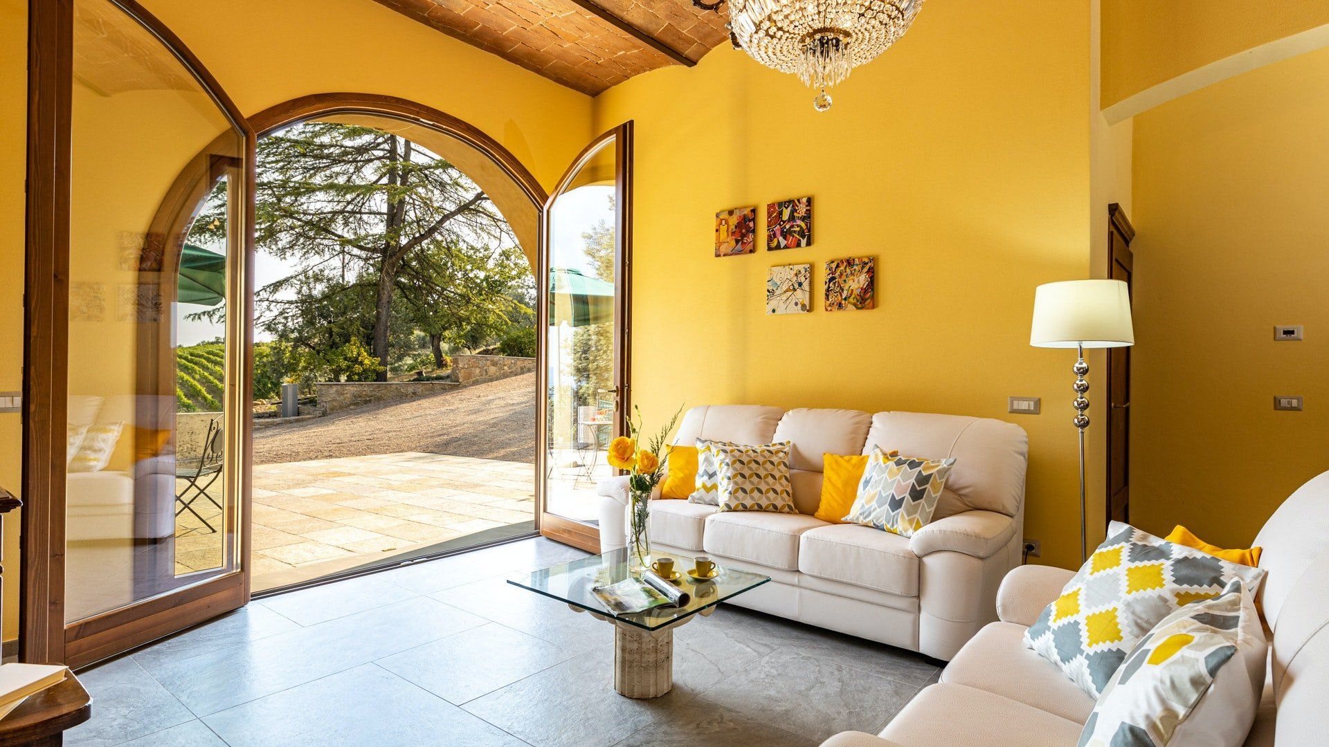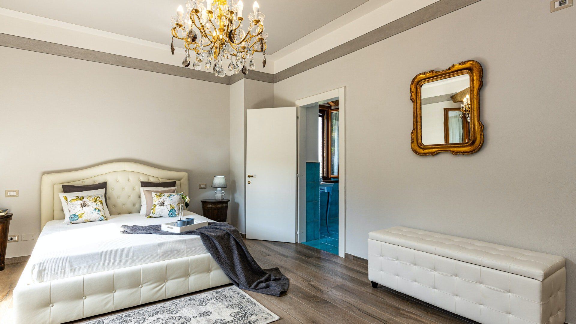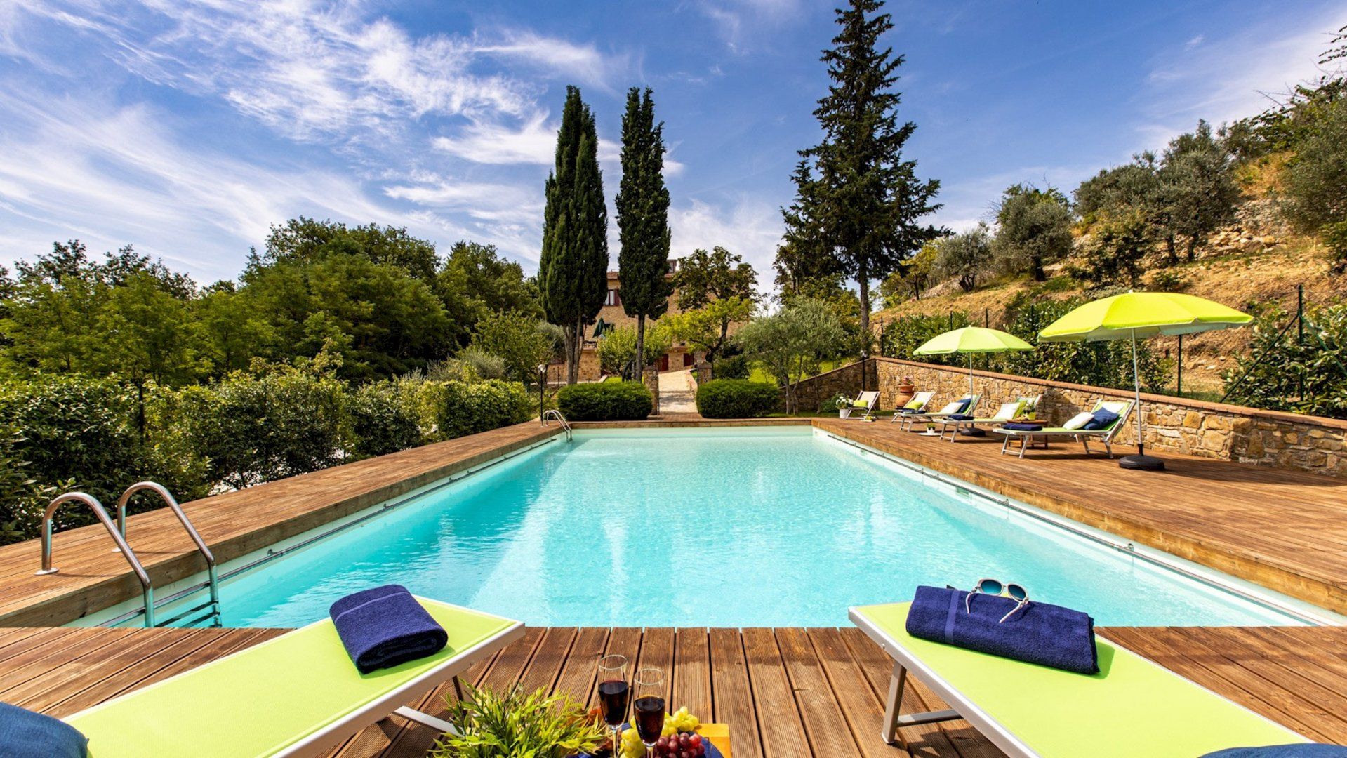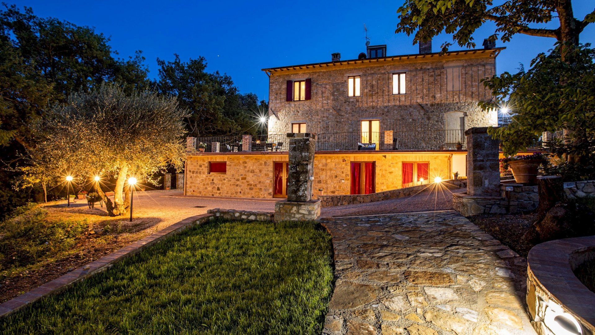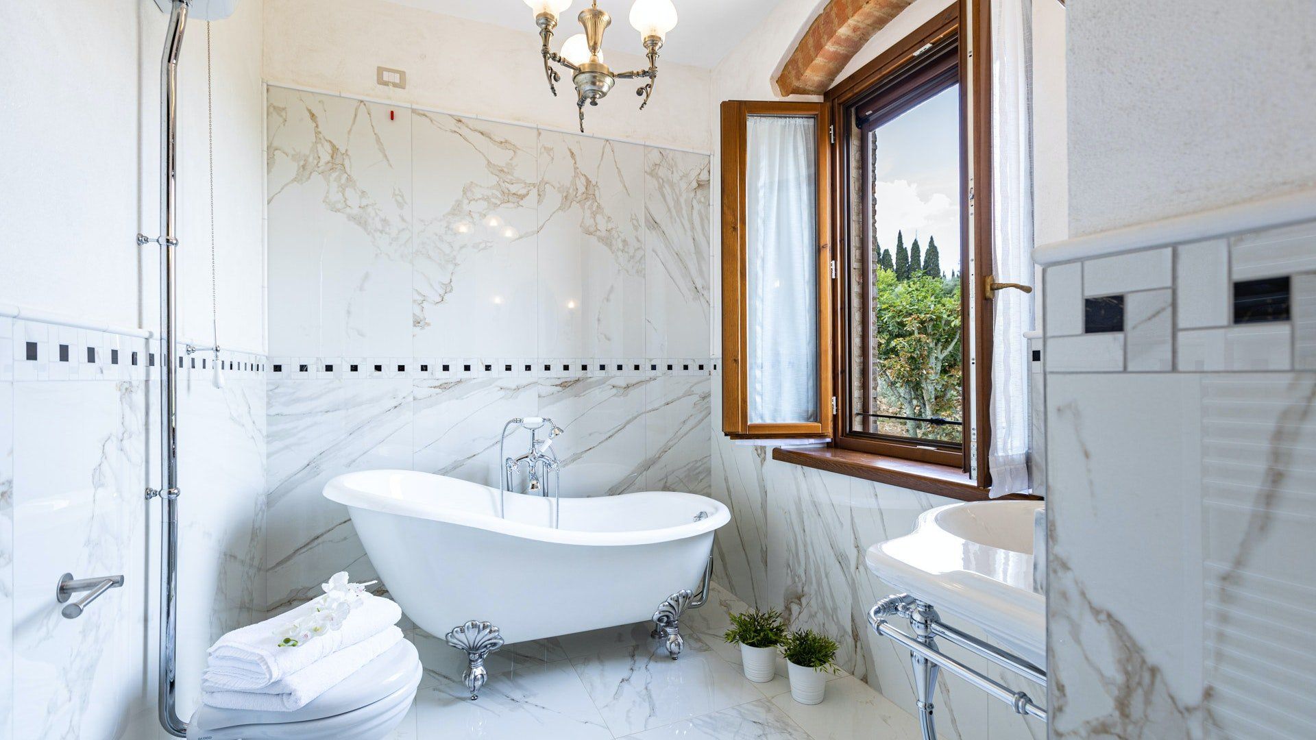 Surrounded by 10 hectares of land, featuring olive groves, lush woods and picturesque vineyards, this home is the perfect introduction to the Tuscan countryside. From the terrace, you can take in the view of the region’s rolling hills, with the hilltown of Poggibonsi rising up in the distance. As you wander through the gardens, breathe in the scent of the lavender, sage and rosemary plants. It’s easy to relax here, whether you’re going for a leisurely swim in the pool, taking some time out in the whirlpool tub or relaxing with a sundowner on the outdoor sofas. Typically Tuscan on the outside, with red-shuttered windows and a terracotta roof, this villa adds a dash of opulence to the occasion inside. From the bright living room with its arched French windows framing the view, to sparkling candelabra above the long, dark-wood dining table. Bedrooms and bathrooms have traditional touches – hand painted wardrobes, vibrat vintage tiling, and twinkling chandeliers. Exploring further afield is a breeze, with the famous city of Siena half an hour away, and Florence just a 45-minute drive.
