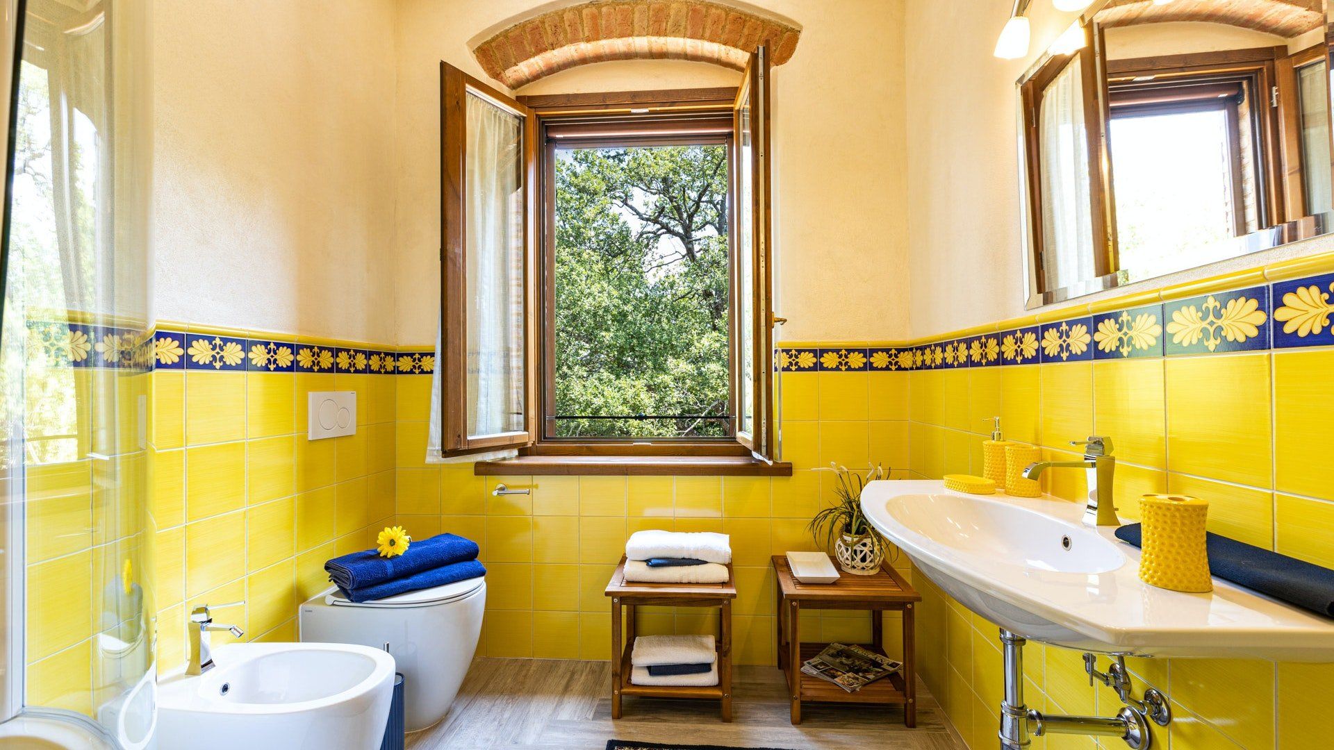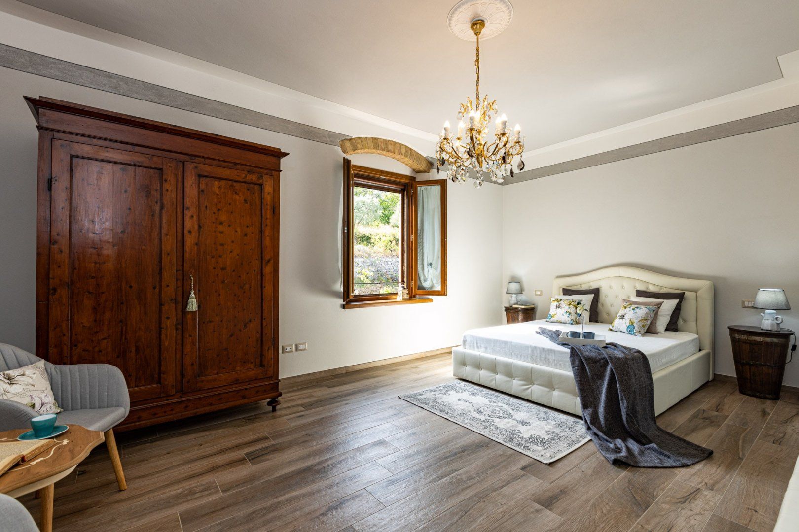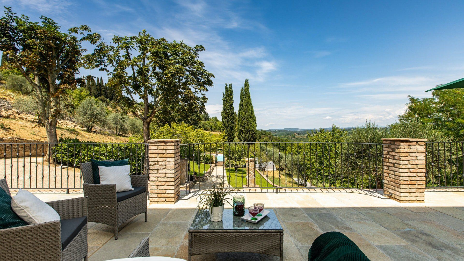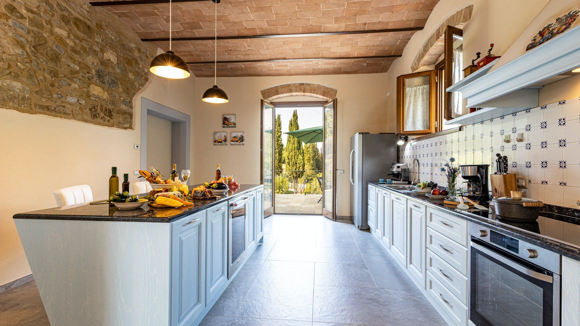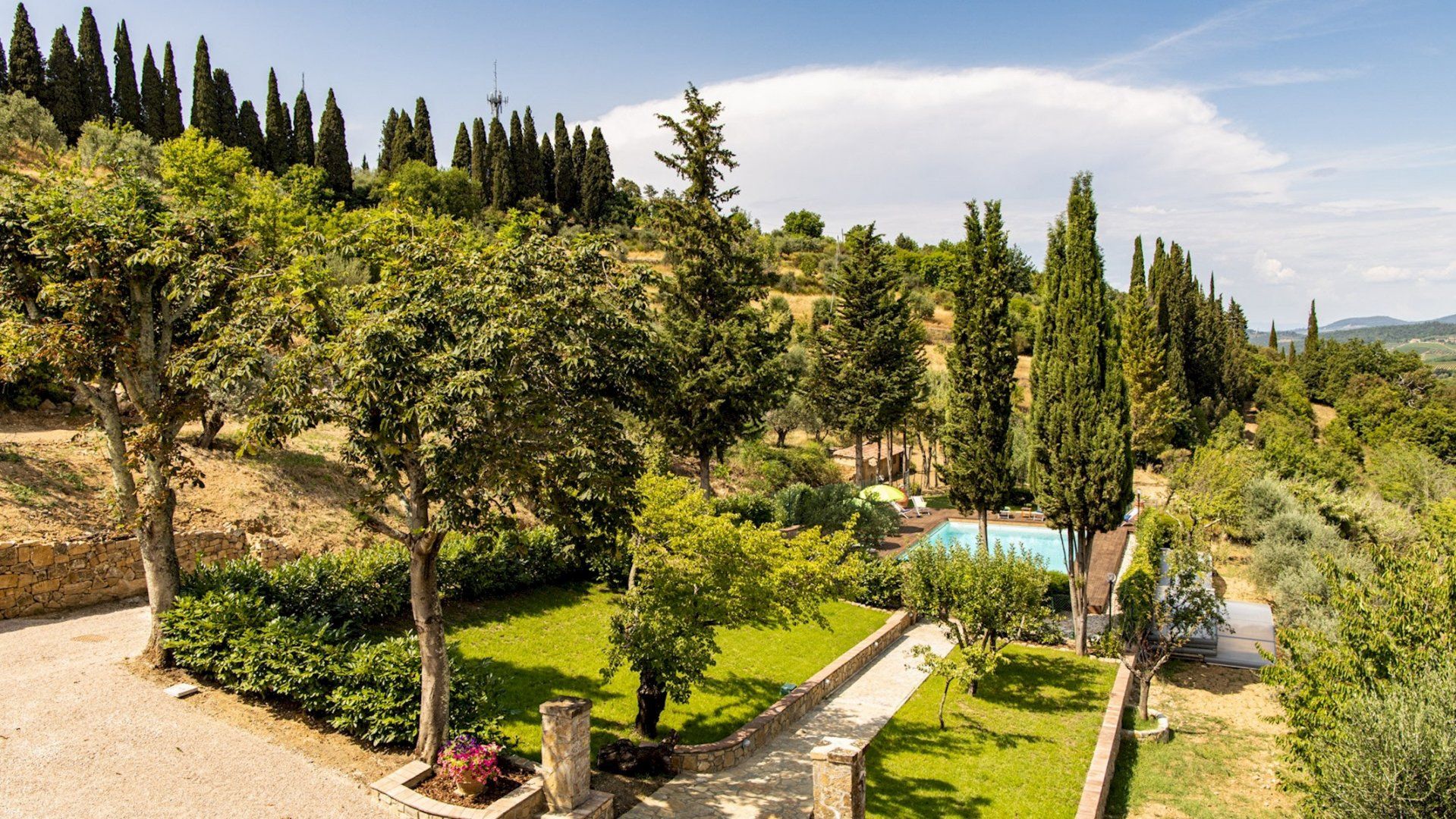 Surrounded by 10 hectares of land, featuring olive groves, lush woods and picturesque vineyards, this home is the perfect introduction to the Tuscan countryside. From the terrace, you can take in the view of the region’s rolling hills, with the hilltown of Poggibonsi rising up in the distance. As you wander through the gardens, breathe in the scent of the lavender, sage and rosemary plants. It’s easy to relax here, whether you’re going for a leisurely swim in the pool, taking some time out in the whirlpool tub or relaxing with a sundowner on the outdoor sofas. Typically Tuscan on the outside, with red-shuttered windows and a terracotta roof, this villa adds a dash of opulence to the occasion inside. From the bright living room with its arched French windows framing the view, to sparkling candelabra above the long, dark-wood dining table. Bedrooms and bathrooms have traditional touches – hand painted wardrobes, vibrat vintage tiling, and twinkling chandeliers. Exploring further afield is a breeze, with the famous city of Siena half an hour away, and Florence just a 45-minute drive.