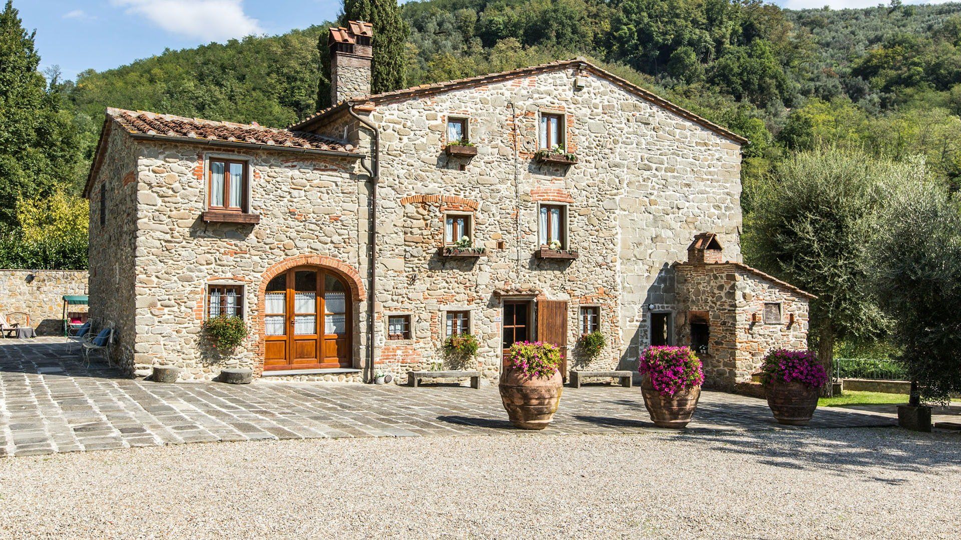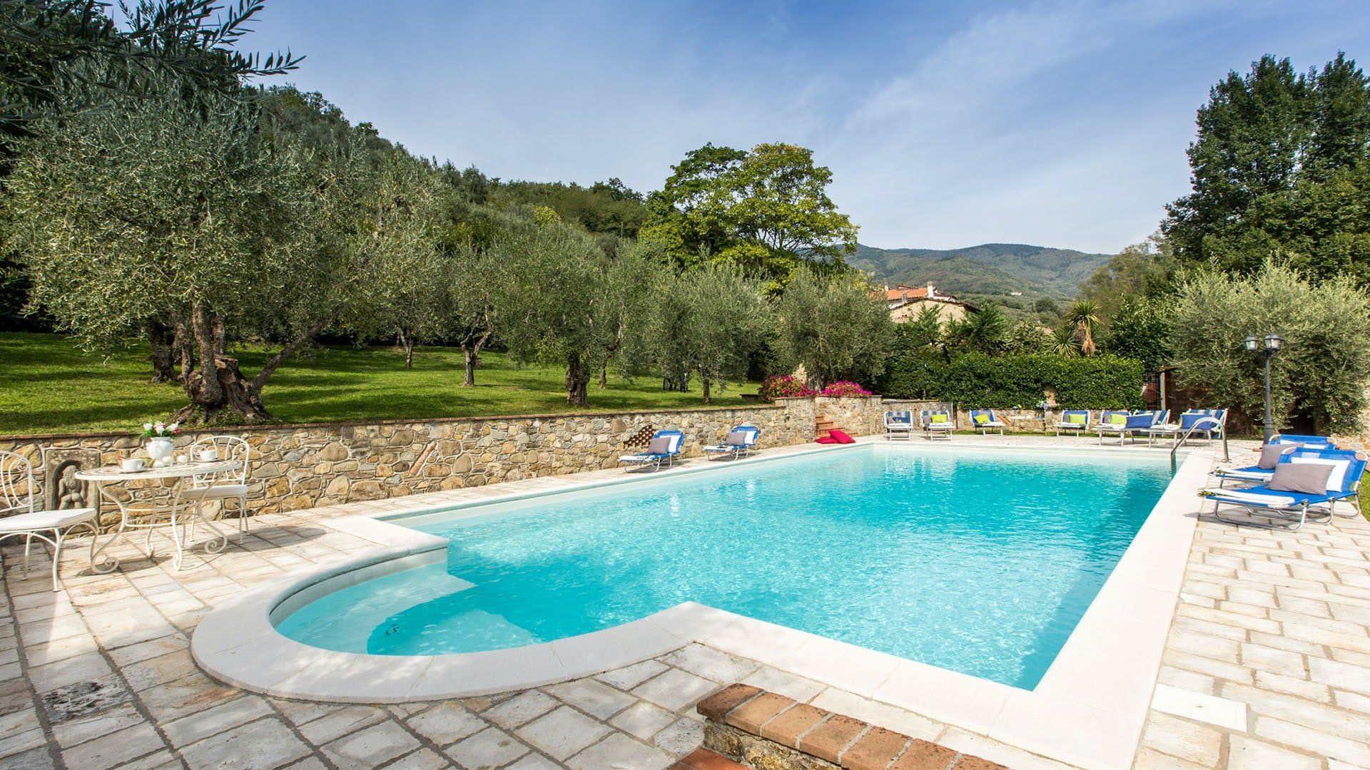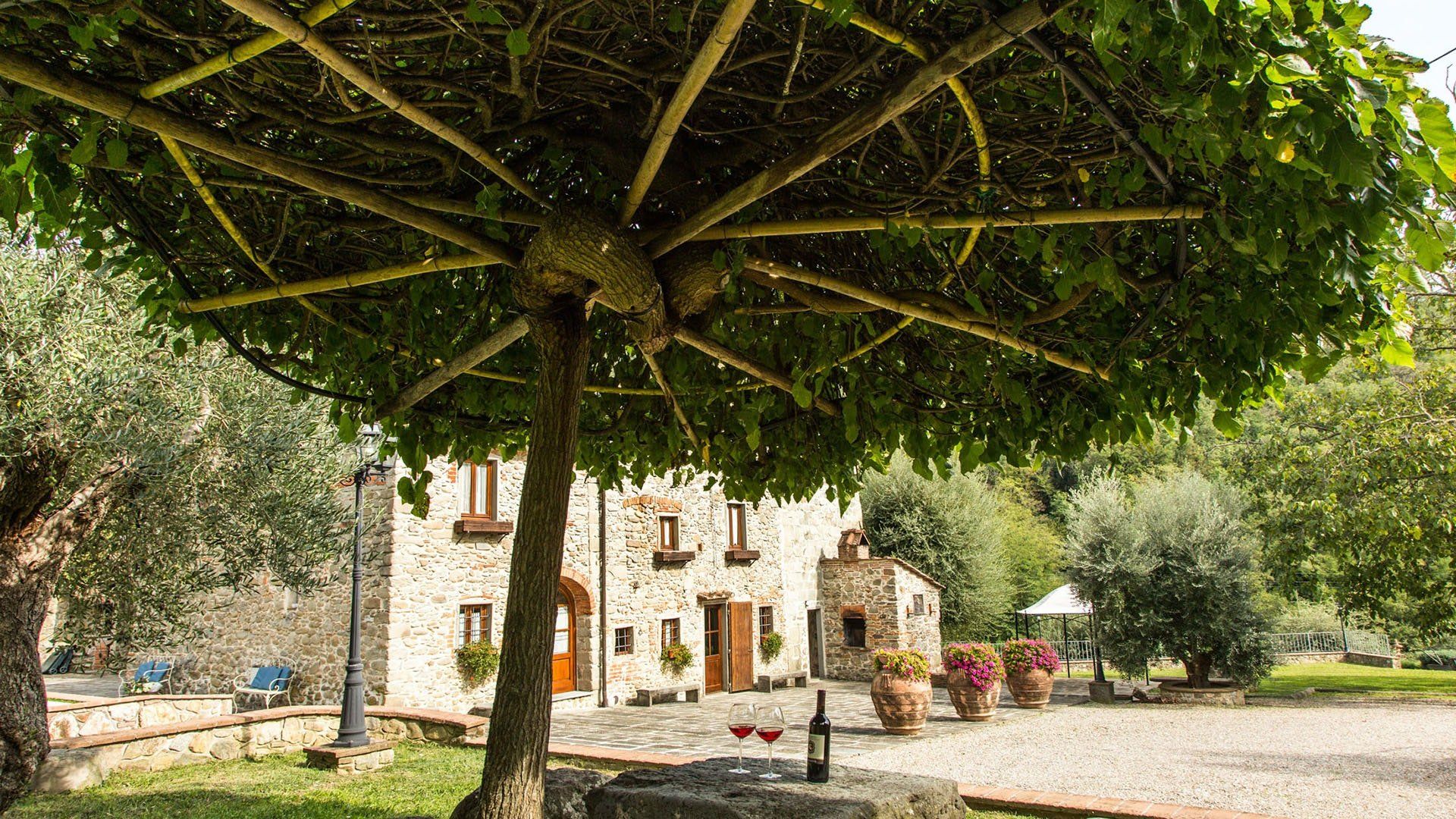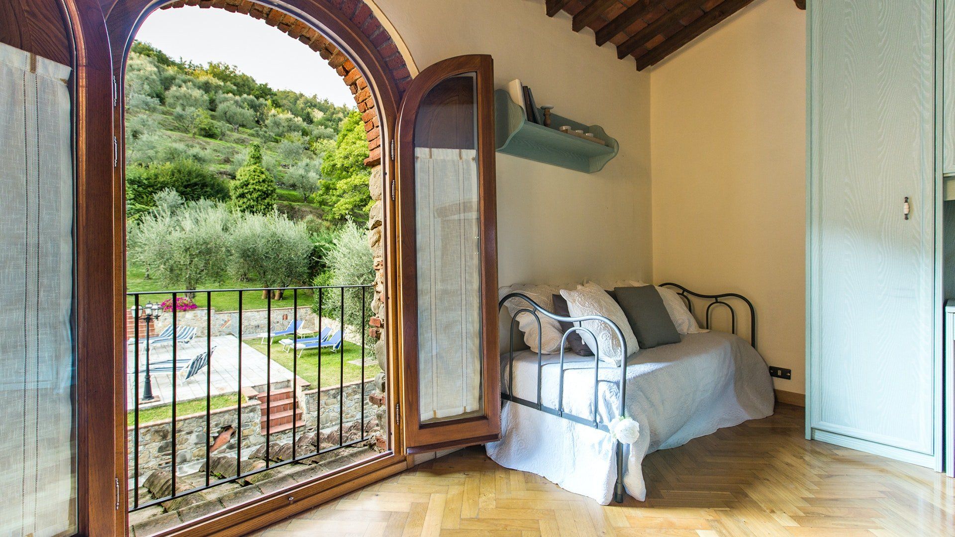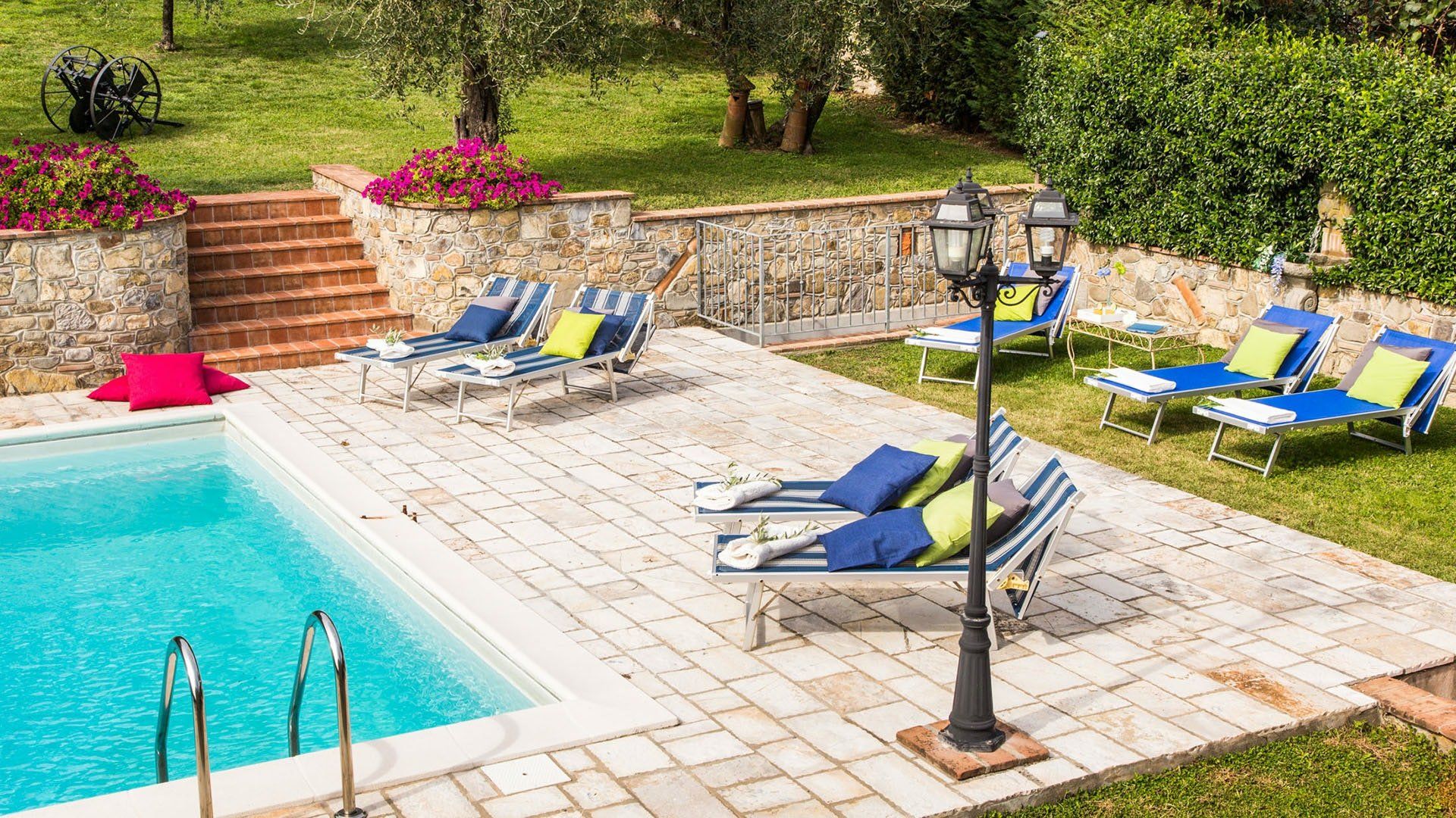 Surrounded by holm oaks, cypresses and chestnut trees, this home near Pistoia is a peaceful retreat set within the stunning Tuscan countryside. It’s a sociable place to stay – whether you’re lazing by the pool, tucking into alfresco meals on the covered terrace, or sipping a bold chianti under the gazebo at sunset. Head into town to pick up some fresh local produce to cook on the stone barbecue, or make pizzas in the bell tower’s wood-fired oven. Inside, you’ll find wooden beams, exposed brick walls, stone staircases and typically Tuscan decor, so it’ll feel like another world when you step into the basement, with its Jacuzzi room painted with palm trees and a brilliant yellow sky.