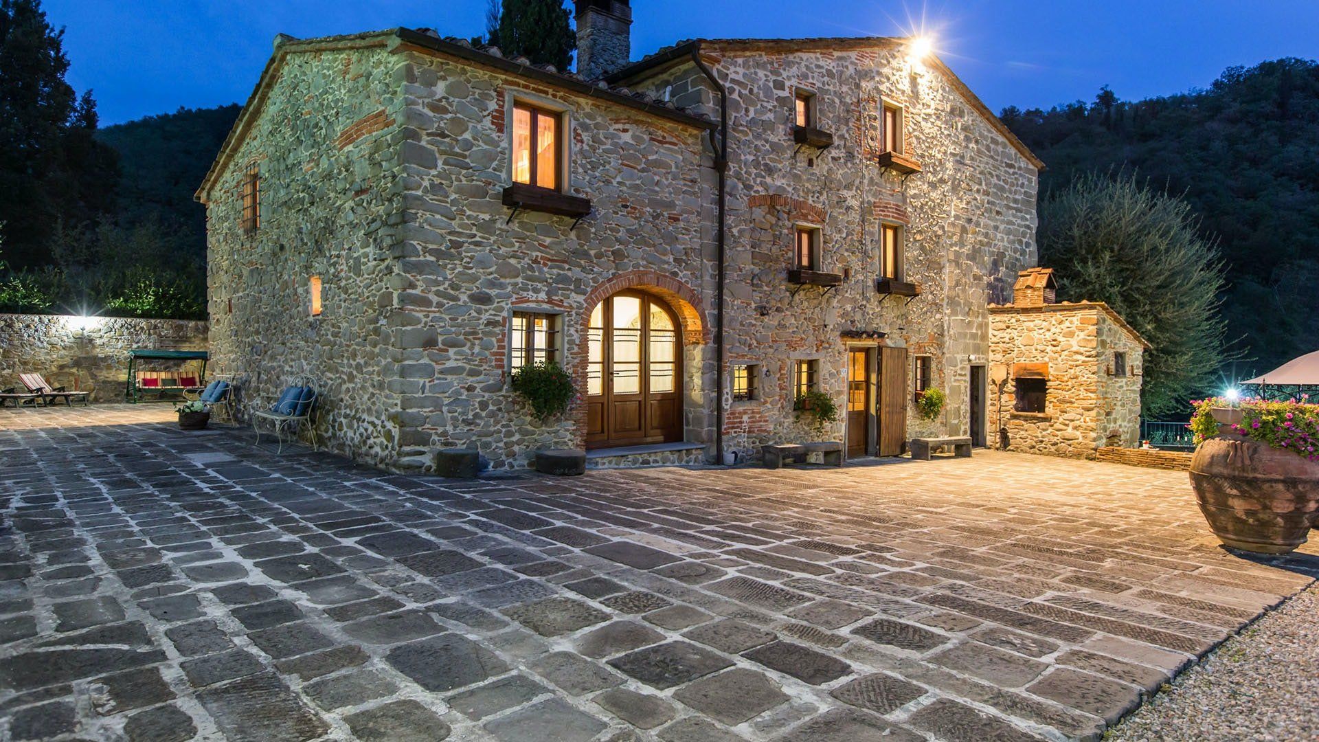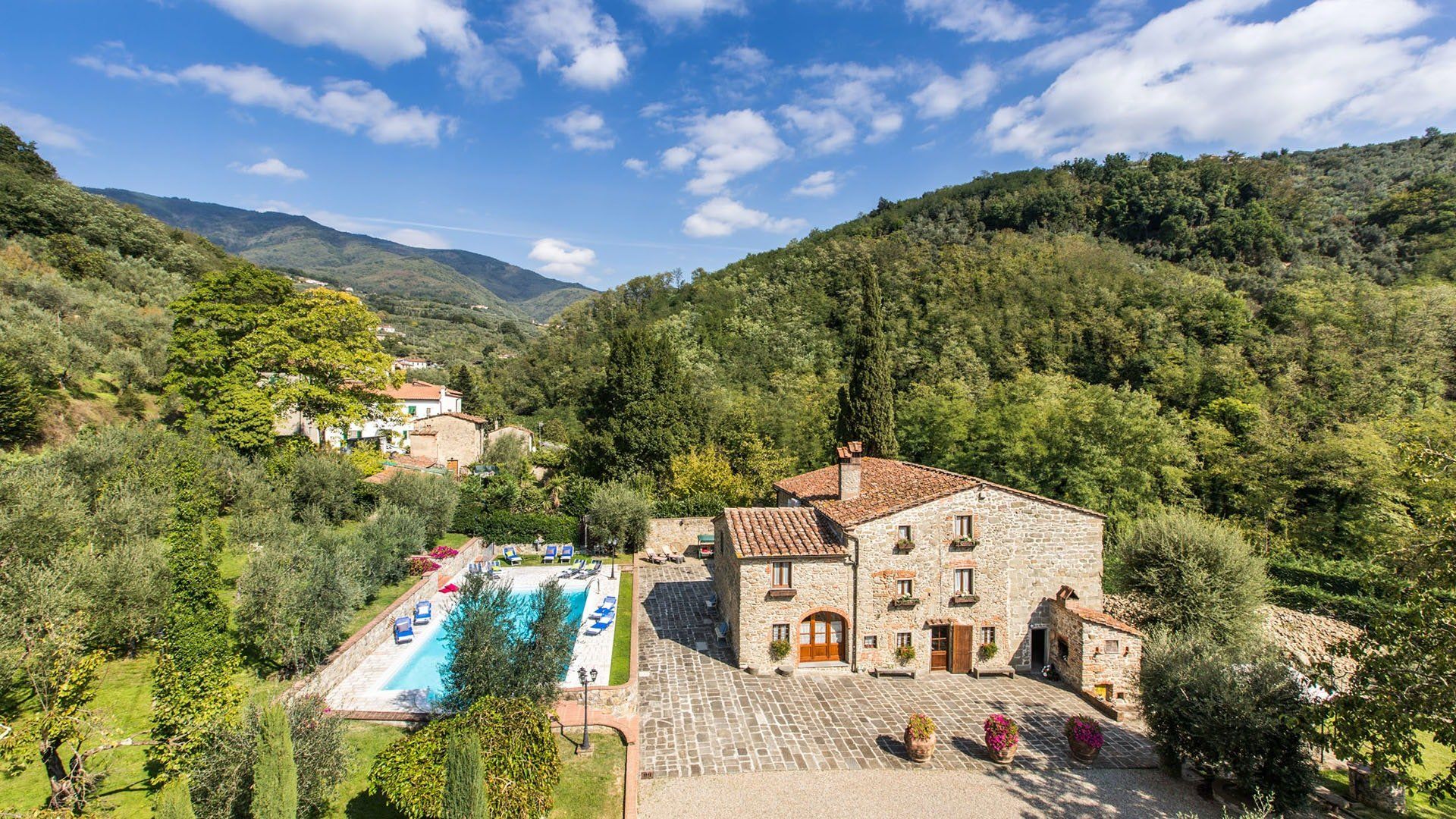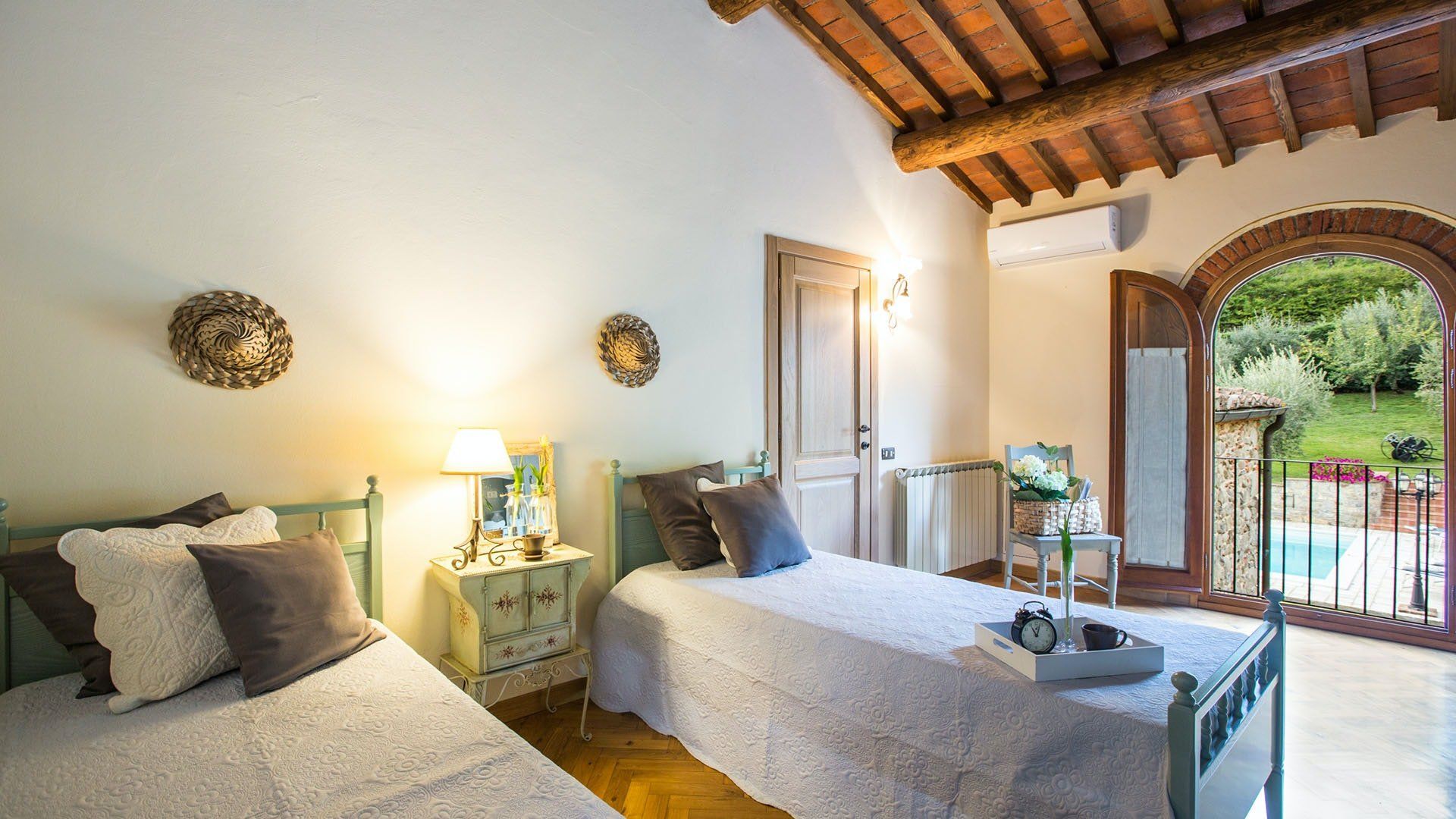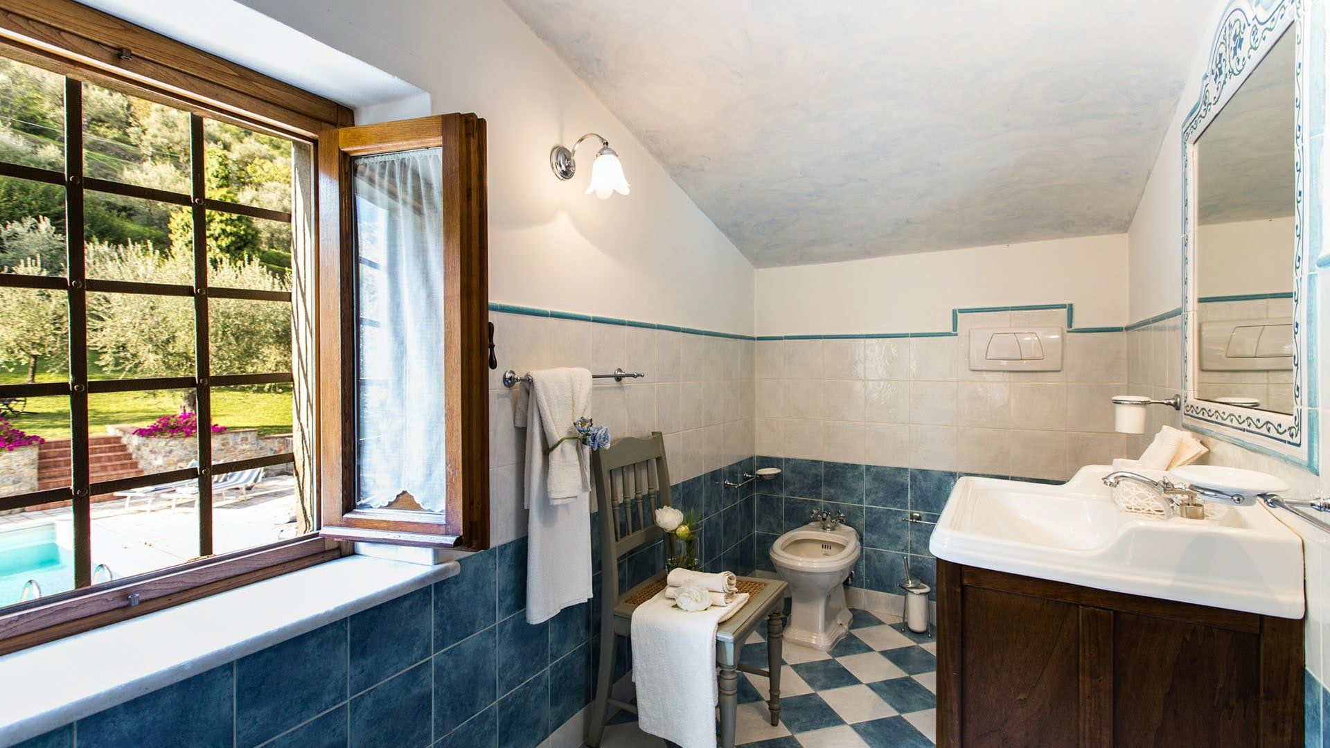 Surrounded by holm oaks, cypresses and chestnut trees, this home near Pistoia is a peaceful retreat set within the stunning Tuscan countryside. It’s a sociable place to stay – whether you’re lazing by the pool, tucking into alfresco meals on the covered terrace, or sipping a bold chianti under the gazebo at sunset. Head into town to pick up some fresh local produce to cook on the stone barbecue, or make pizzas in the bell tower’s wood-fired oven. Inside, you’ll find wooden beams, exposed brick walls, stone staircases and typically Tuscan decor, so it’ll feel like another world when you step into the basement, with its Jacuzzi room painted with palm trees and a brilliant yellow sky.