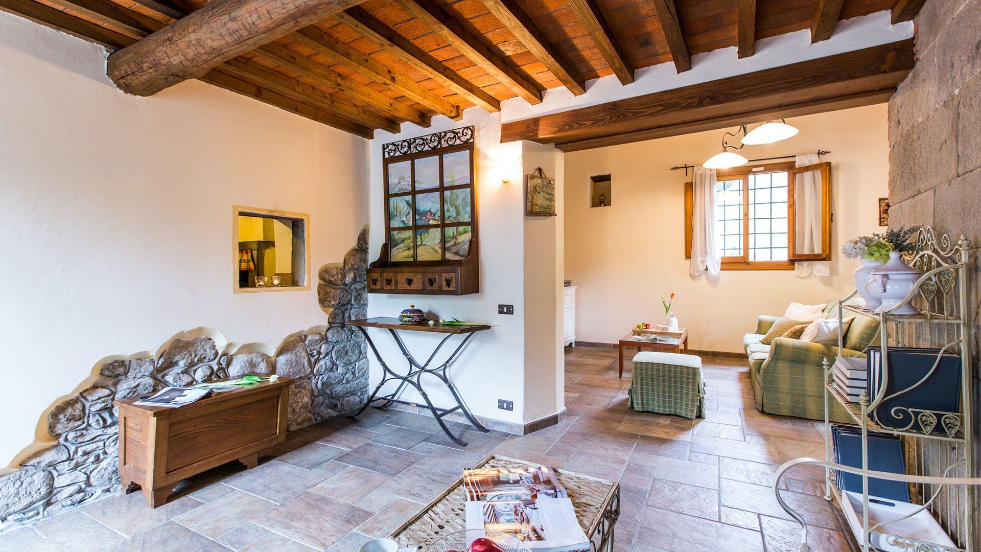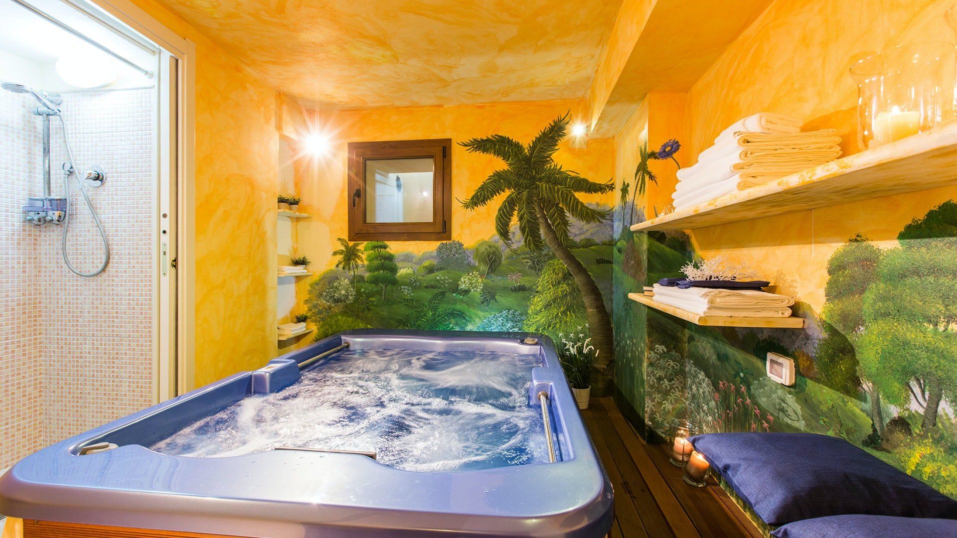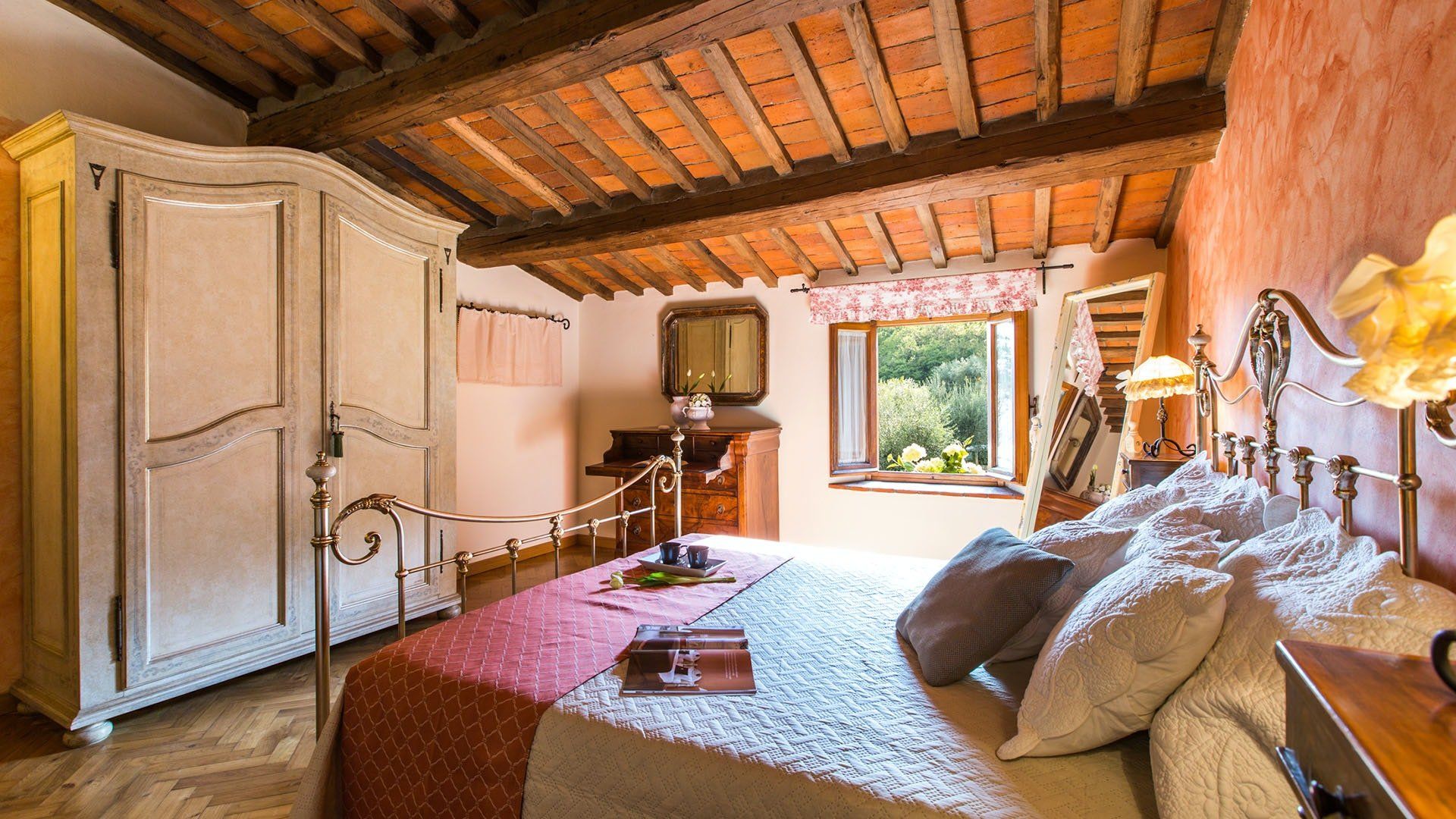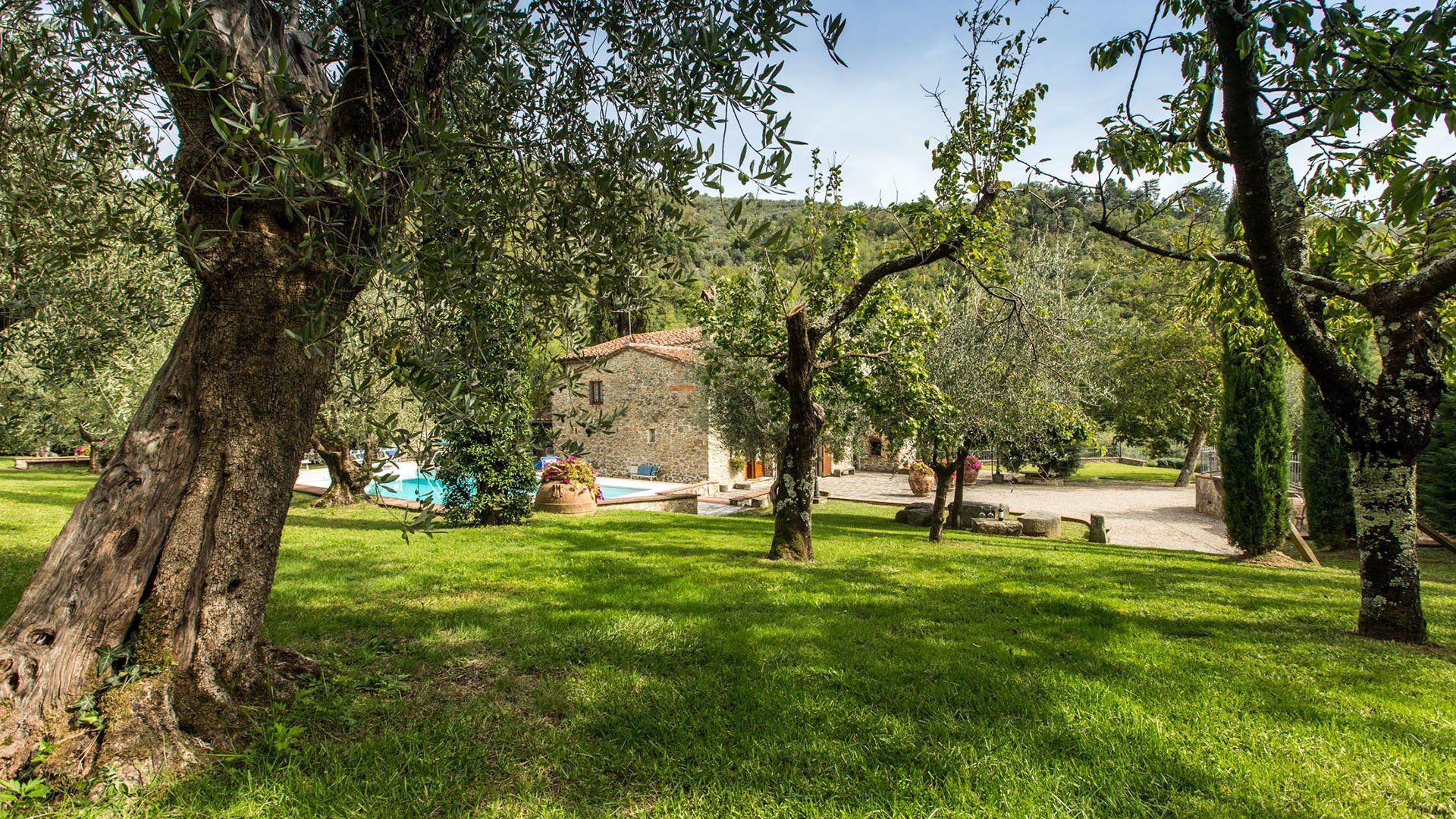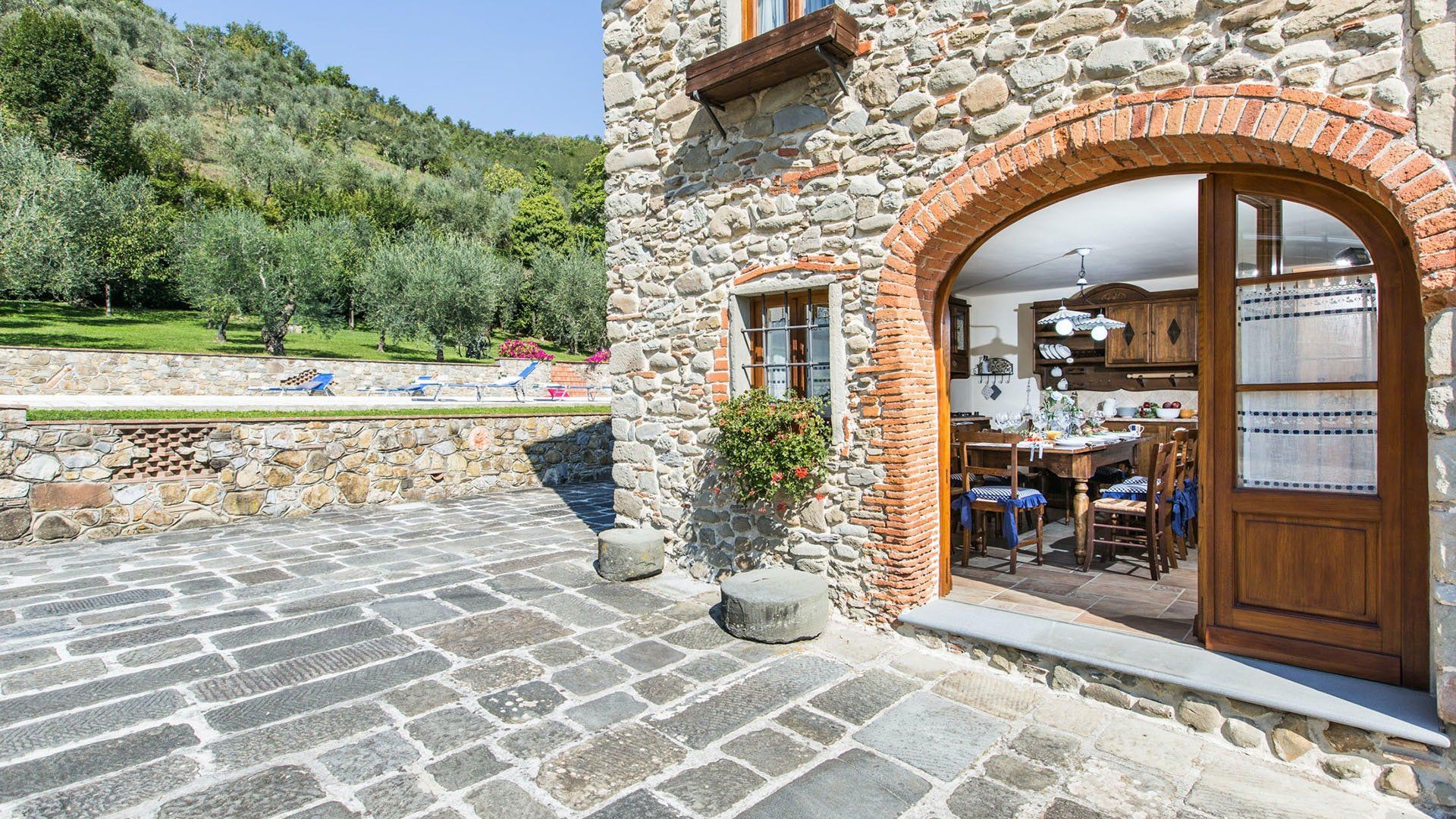 Surrounded by holm oaks, cypresses and chestnut trees, this home near Pistoia is a peaceful retreat set within the stunning Tuscan countryside. It’s a sociable place to stay – whether you’re lazing by the pool, tucking into alfresco meals on the covered terrace, or sipping a bold chianti under the gazebo at sunset. Head into town to pick up some fresh local produce to cook on the stone barbecue, or make pizzas in the bell tower’s wood-fired oven. Inside, you’ll find wooden beams, exposed brick walls, stone staircases and typically Tuscan decor, so it’ll feel like another world when you step into the basement, with its Jacuzzi room painted with palm trees and a brilliant yellow sky.