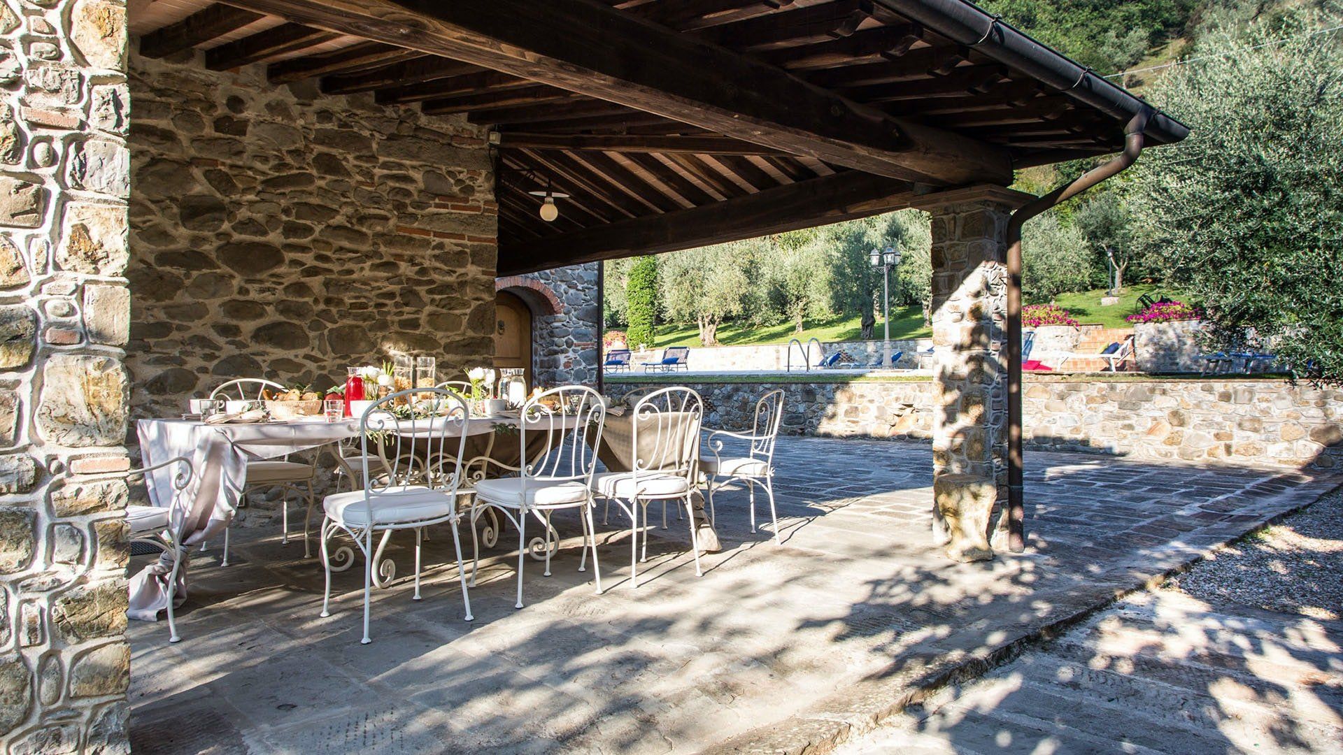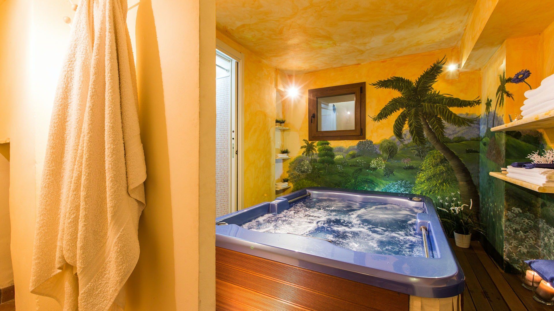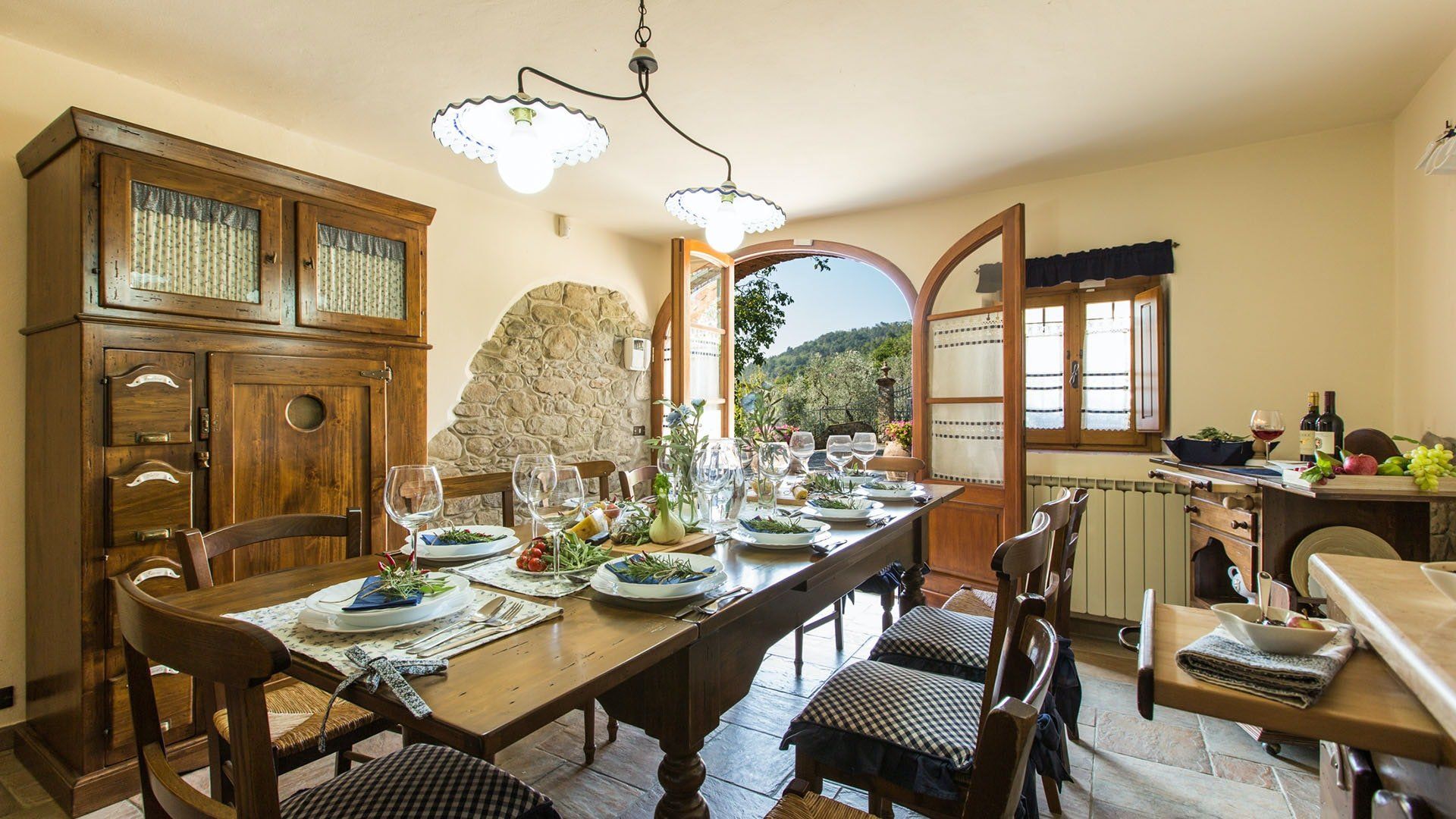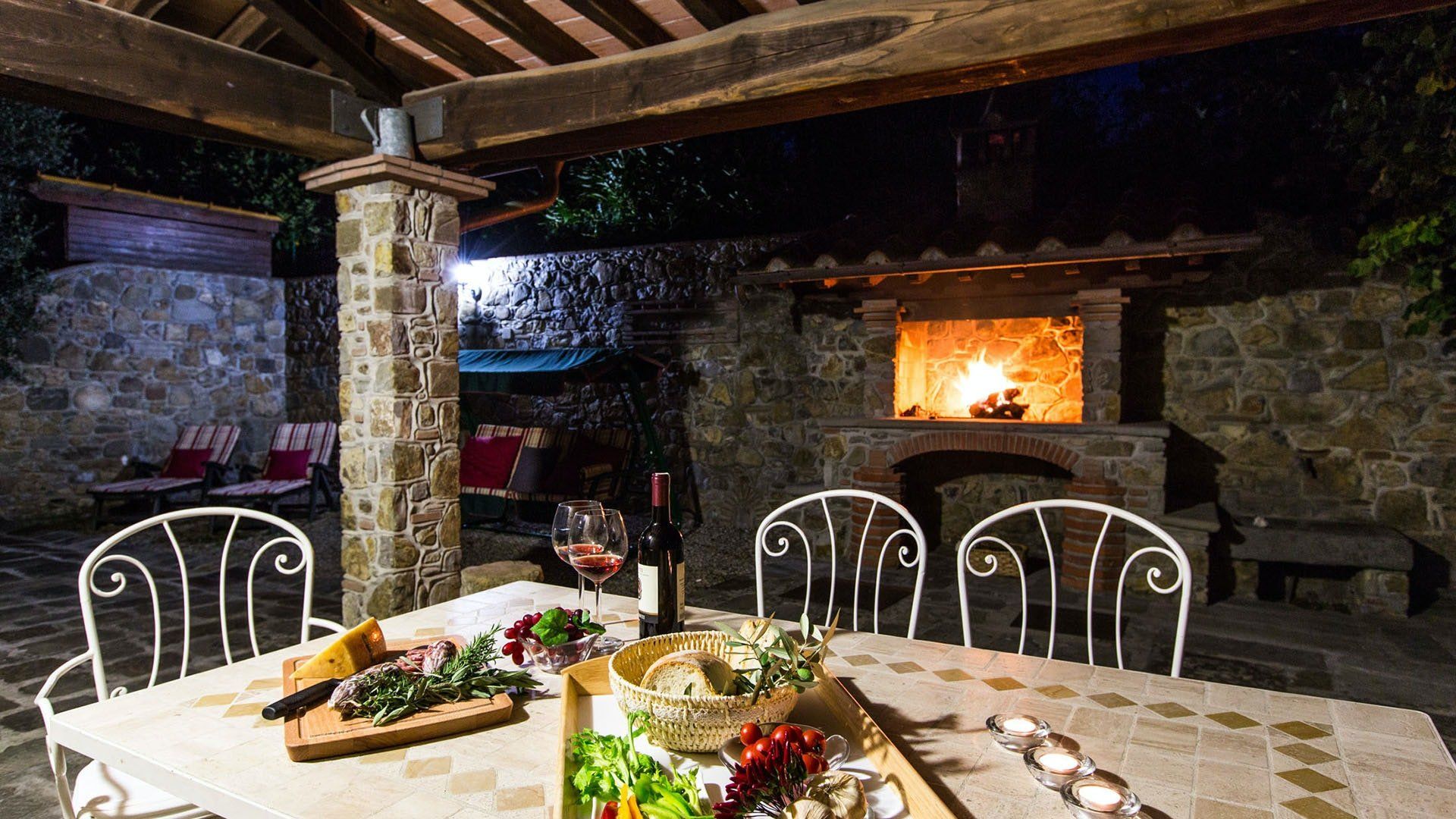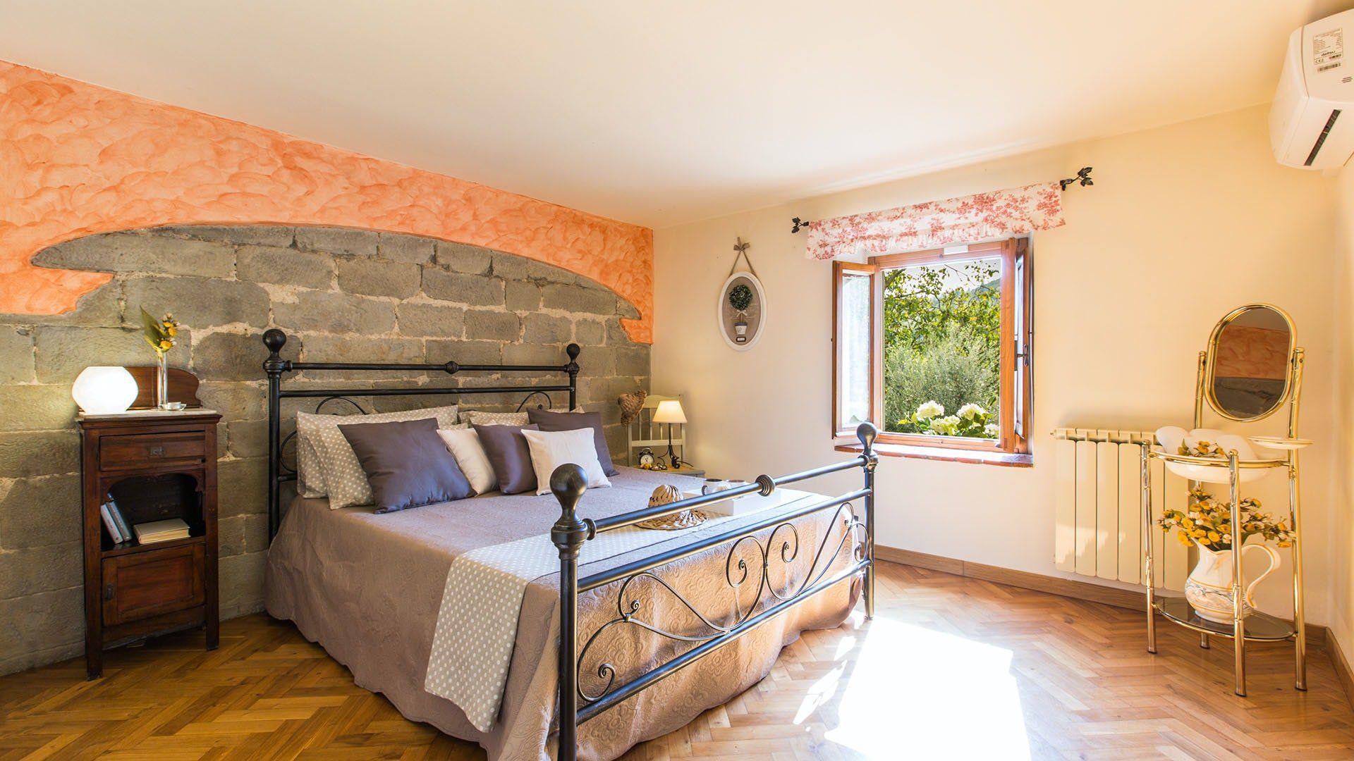 Surrounded by holm oaks, cypresses and chestnut trees, this home near Pistoia is a peaceful retreat set within the stunning Tuscan countryside. It’s a sociable place to stay – whether you’re lazing by the pool, tucking into alfresco meals on the covered terrace, or sipping a bold chianti under the gazebo at sunset. Head into town to pick up some fresh local produce to cook on the stone barbecue, or make pizzas in the bell tower’s wood-fired oven. Inside, you’ll find wooden beams, exposed brick walls, stone staircases and typically Tuscan decor, so it’ll feel like another world when you step into the basement, with its Jacuzzi room painted with palm trees and a brilliant yellow sky.