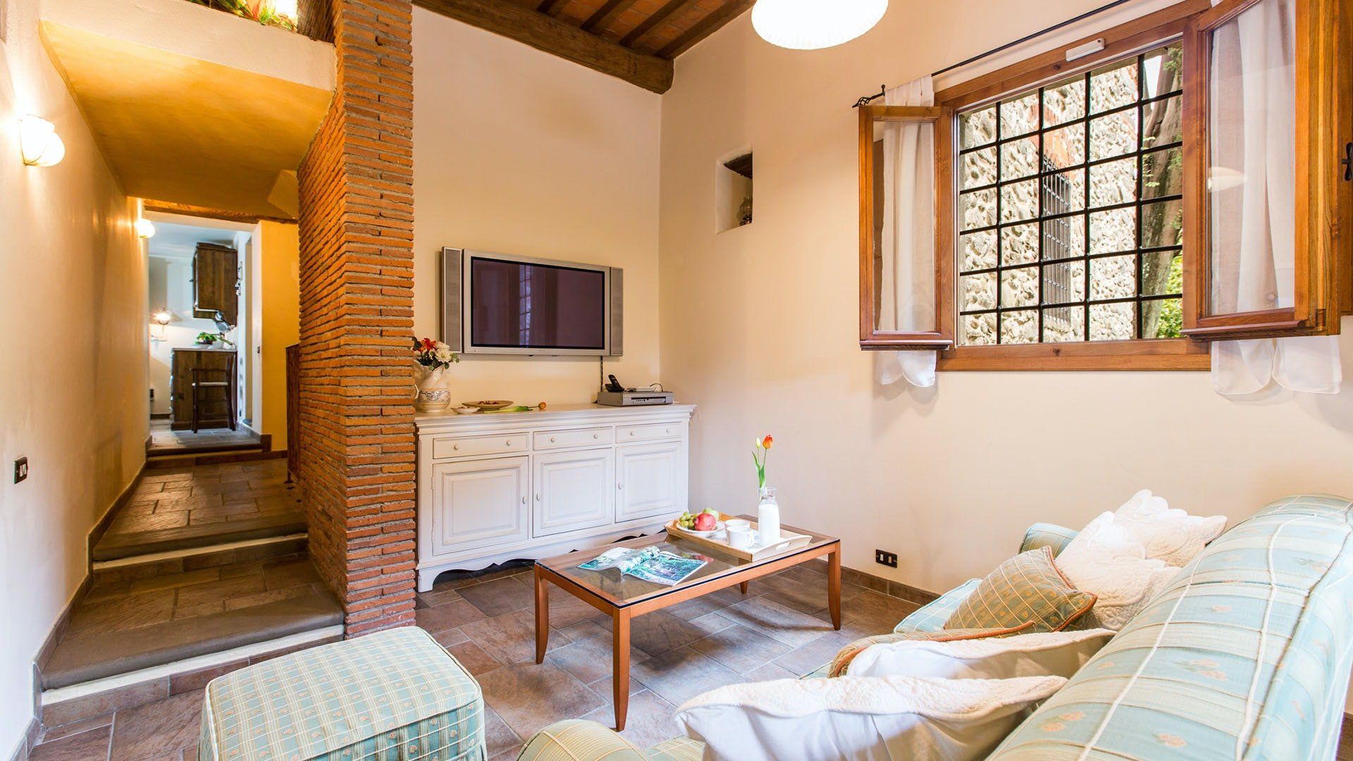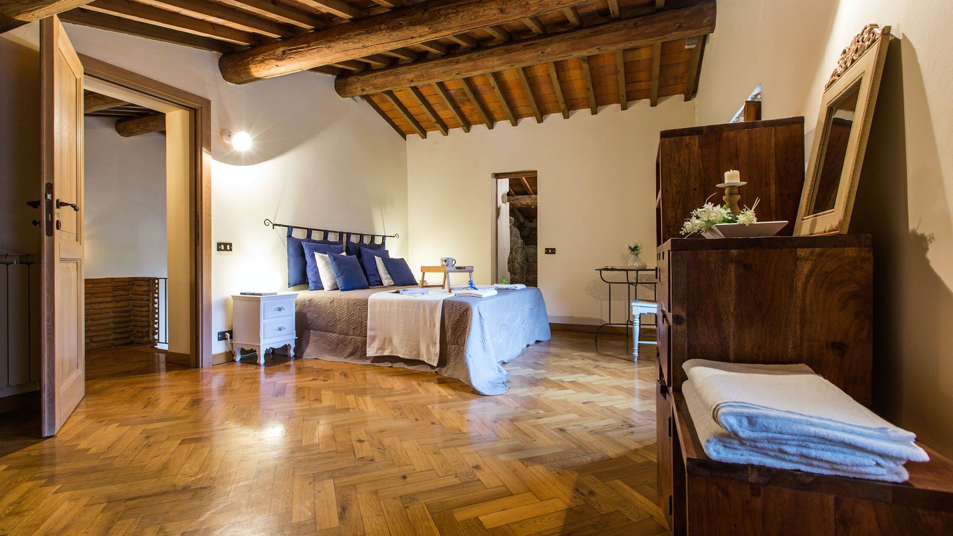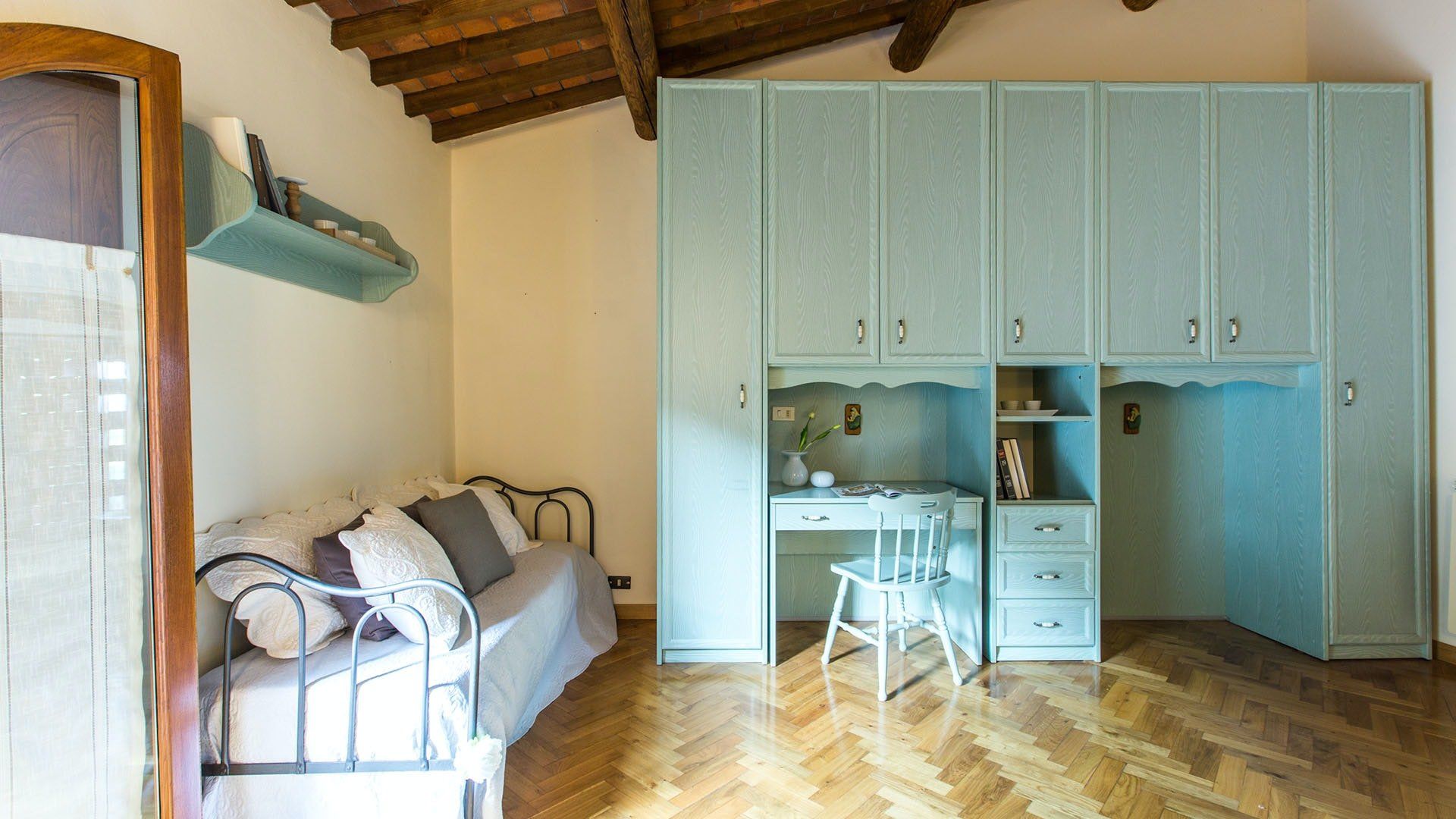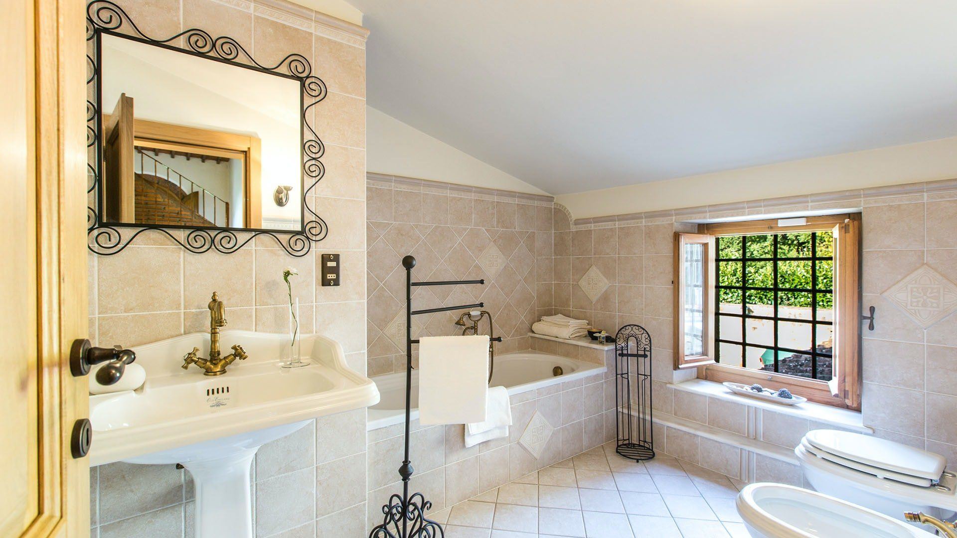 Surrounded by holm oaks, cypresses and chestnut trees, this home near Pistoia is a peaceful retreat set within the stunning Tuscan countryside. It’s a sociable place to stay – whether you’re lazing by the pool, tucking into alfresco meals on the covered terrace, or sipping a bold chianti under the gazebo at sunset. Head into town to pick up some fresh local produce to cook on the stone barbecue, or make pizzas in the bell tower’s wood-fired oven. Inside, you’ll find wooden beams, exposed brick walls, stone staircases and typically Tuscan decor, so it’ll feel like another world when you step into the basement, with its Jacuzzi room painted with palm trees and a brilliant yellow sky.